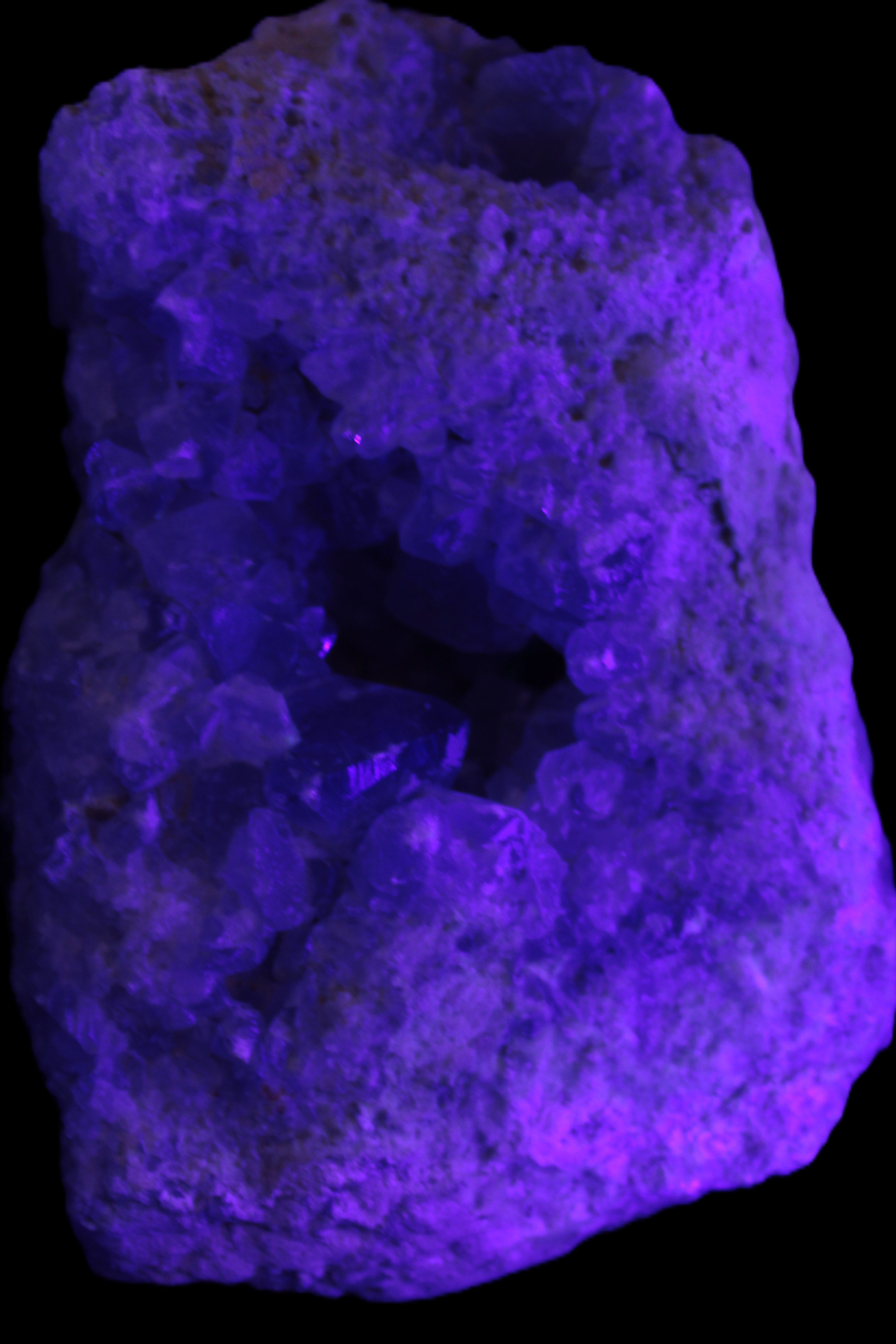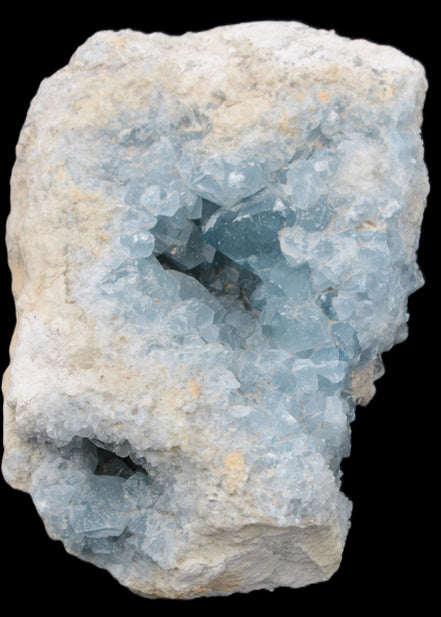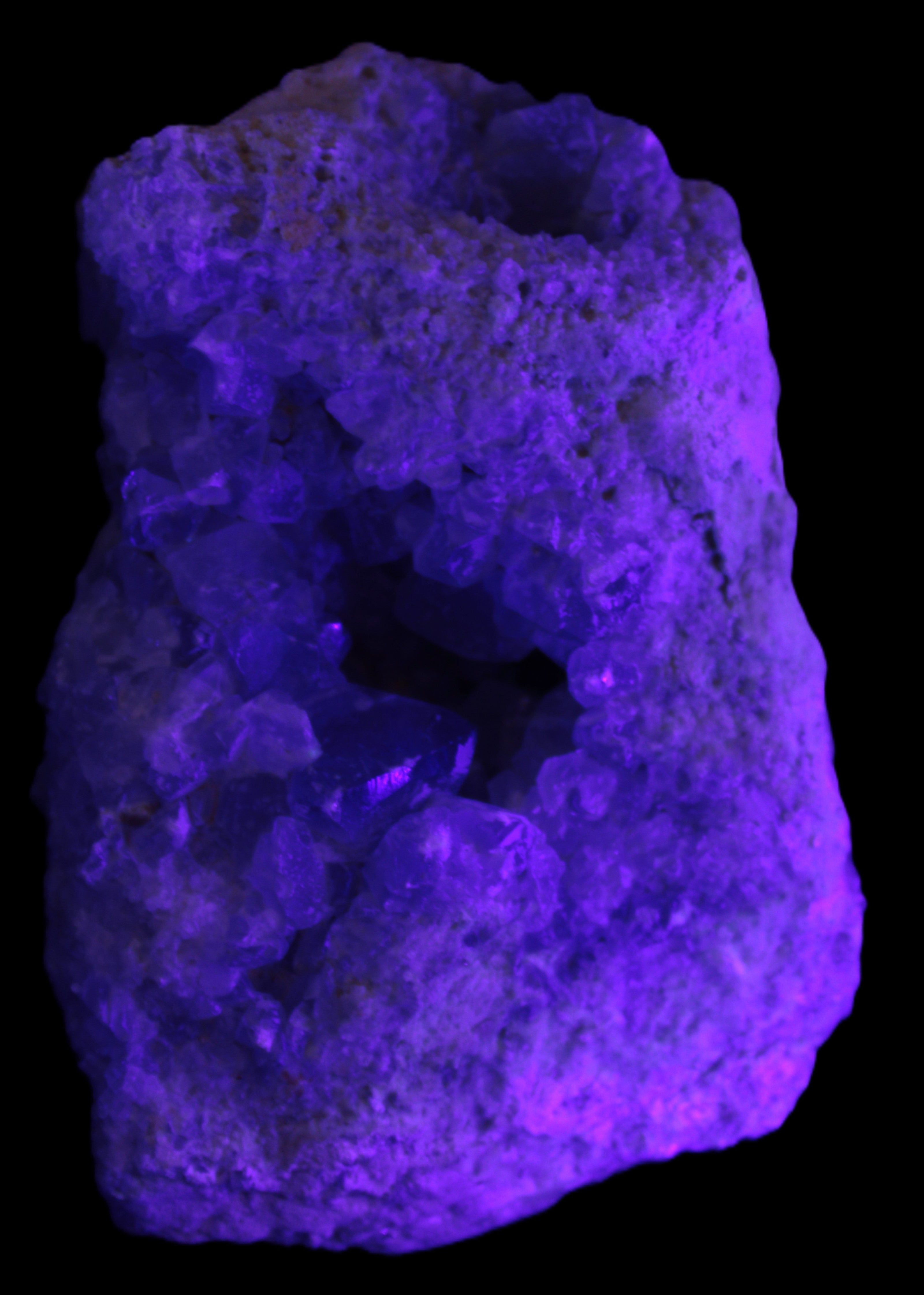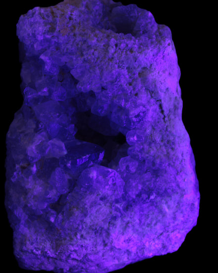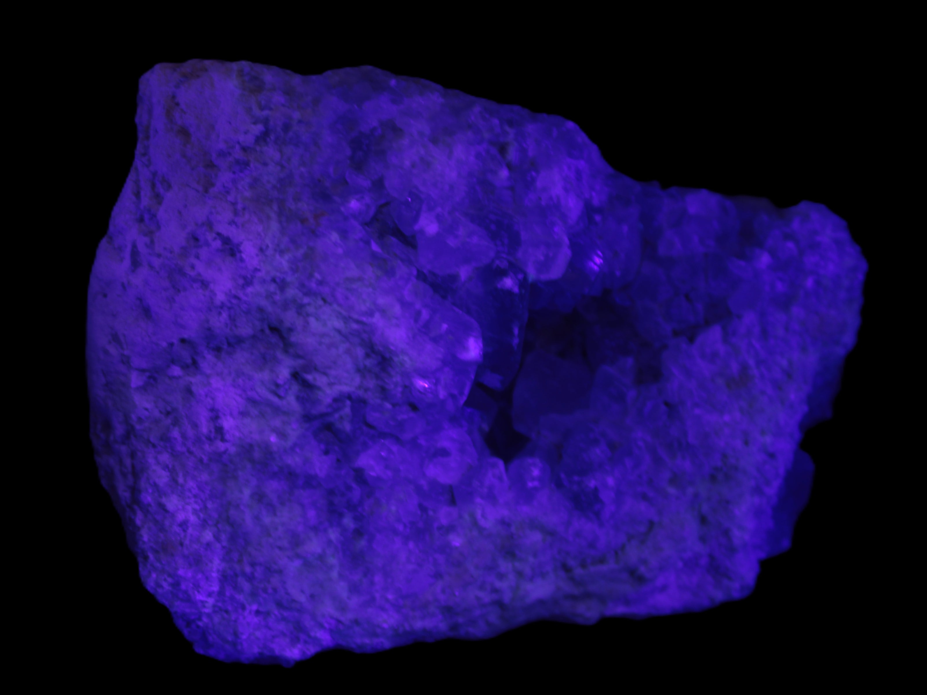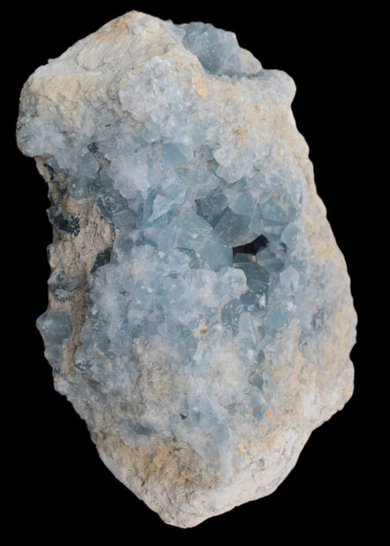 This Celestite geode cluster 3840g is a huge example of this wonderful crystal.  It has two openings into the inner cave of this geode. The surrounding matrix is UV reactive and goes yellow. The Celestite reacts too.