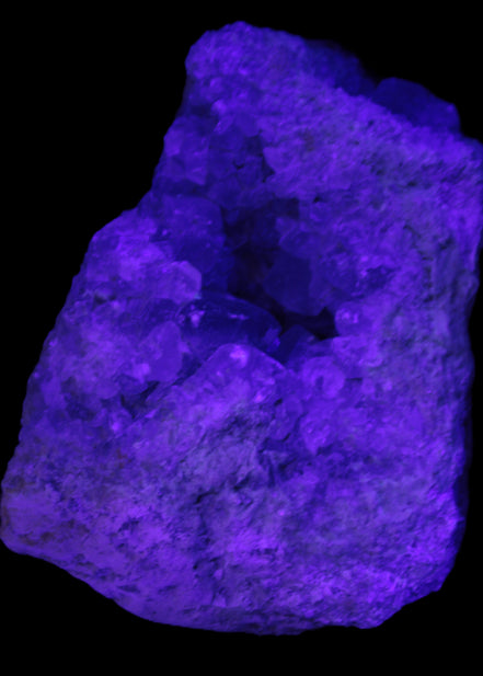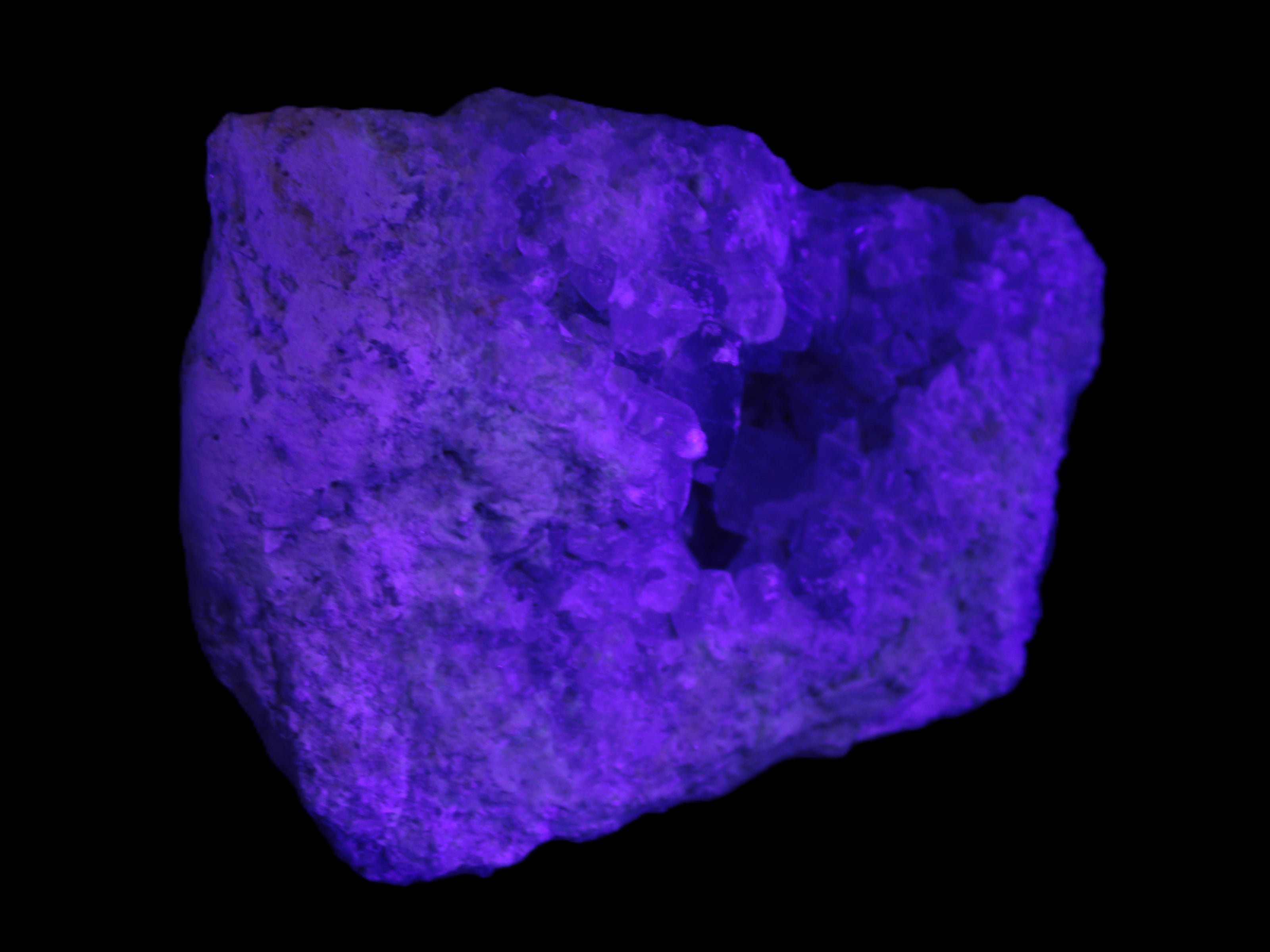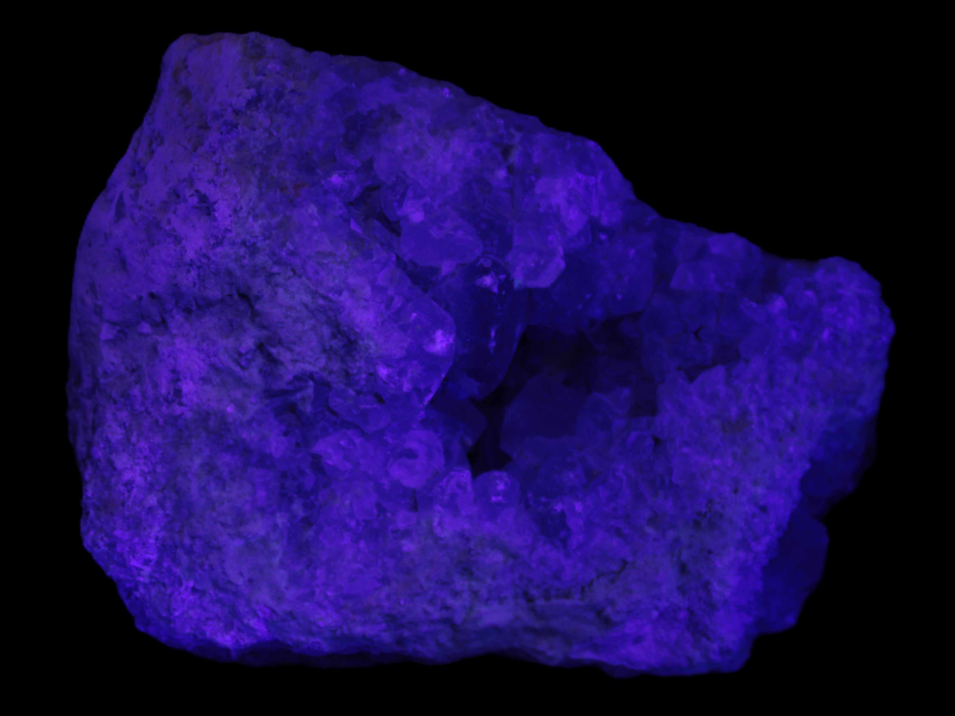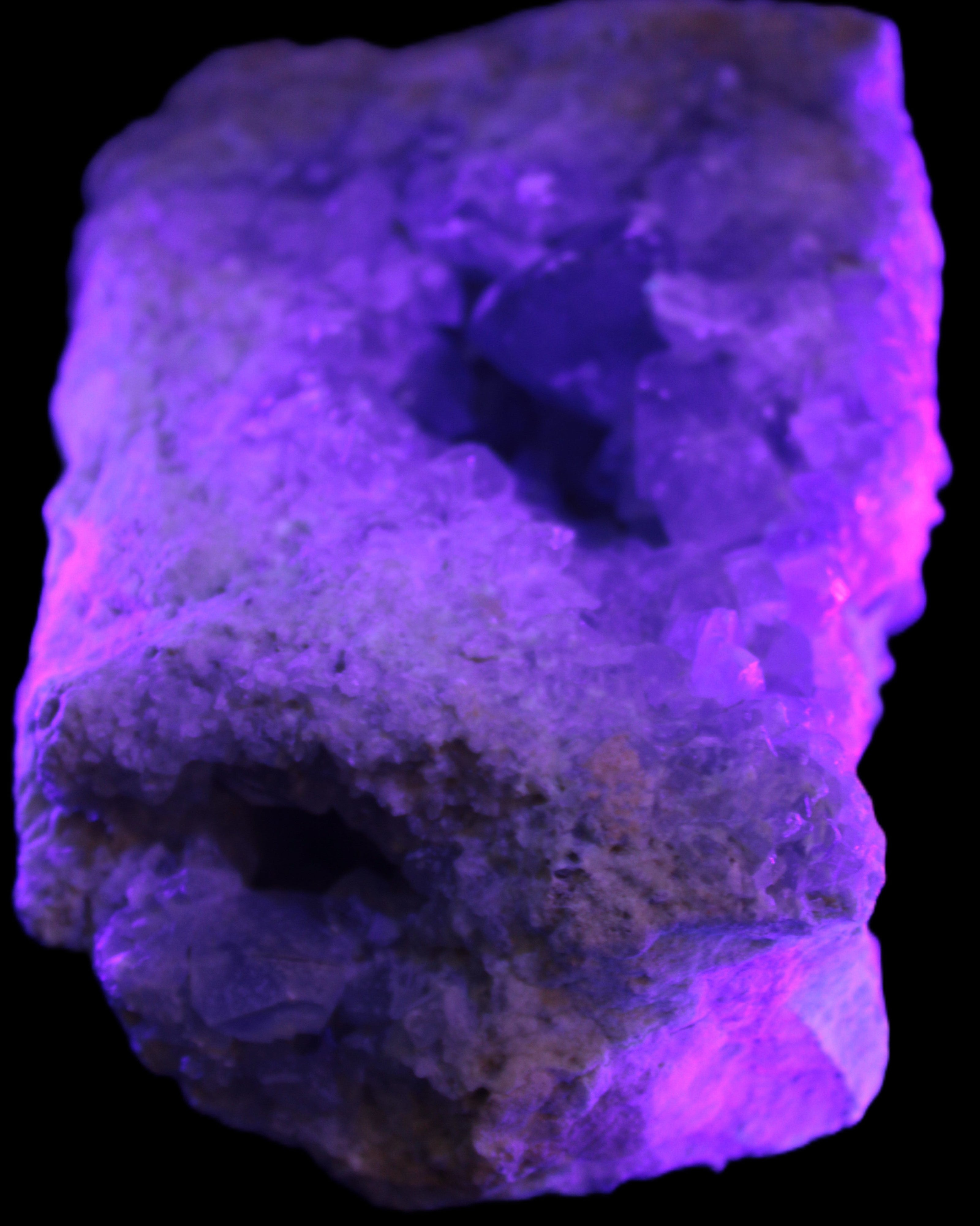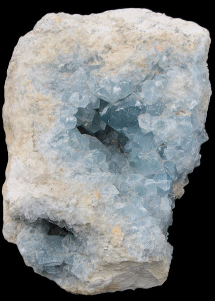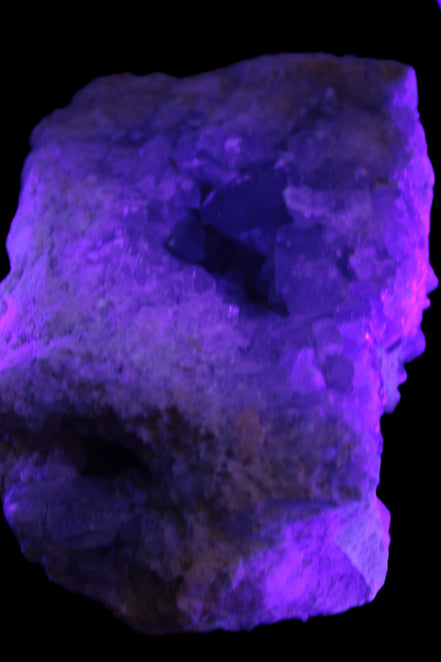 This Celestite geode cluster 3840g is a huge example of this wonderful crystal.  It has two openings into the inner cave of this geode. The surrounding matrix is UV reactive and goes yellow. The Celestite reacts too.