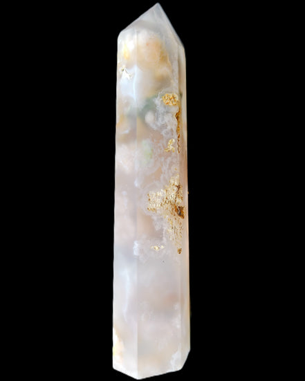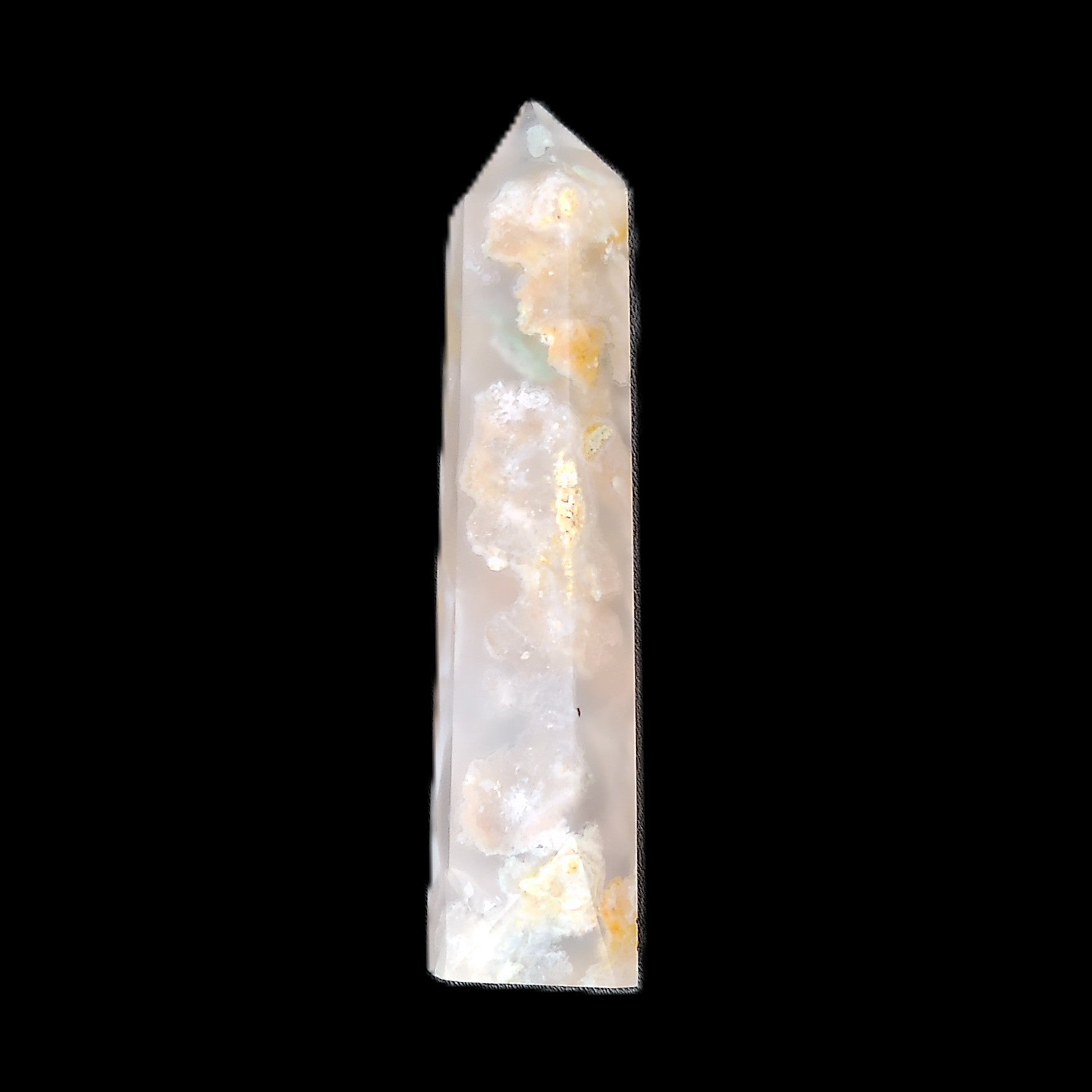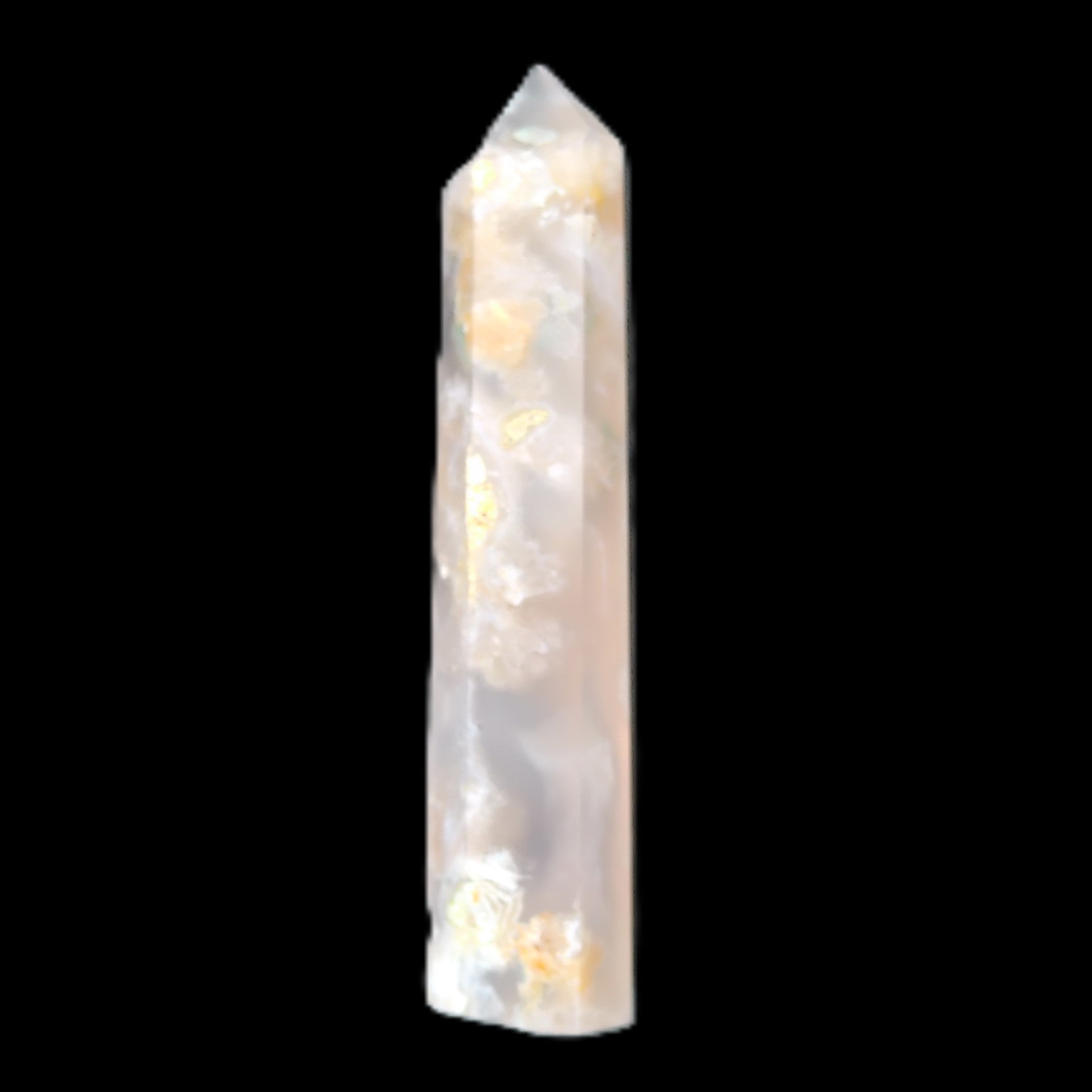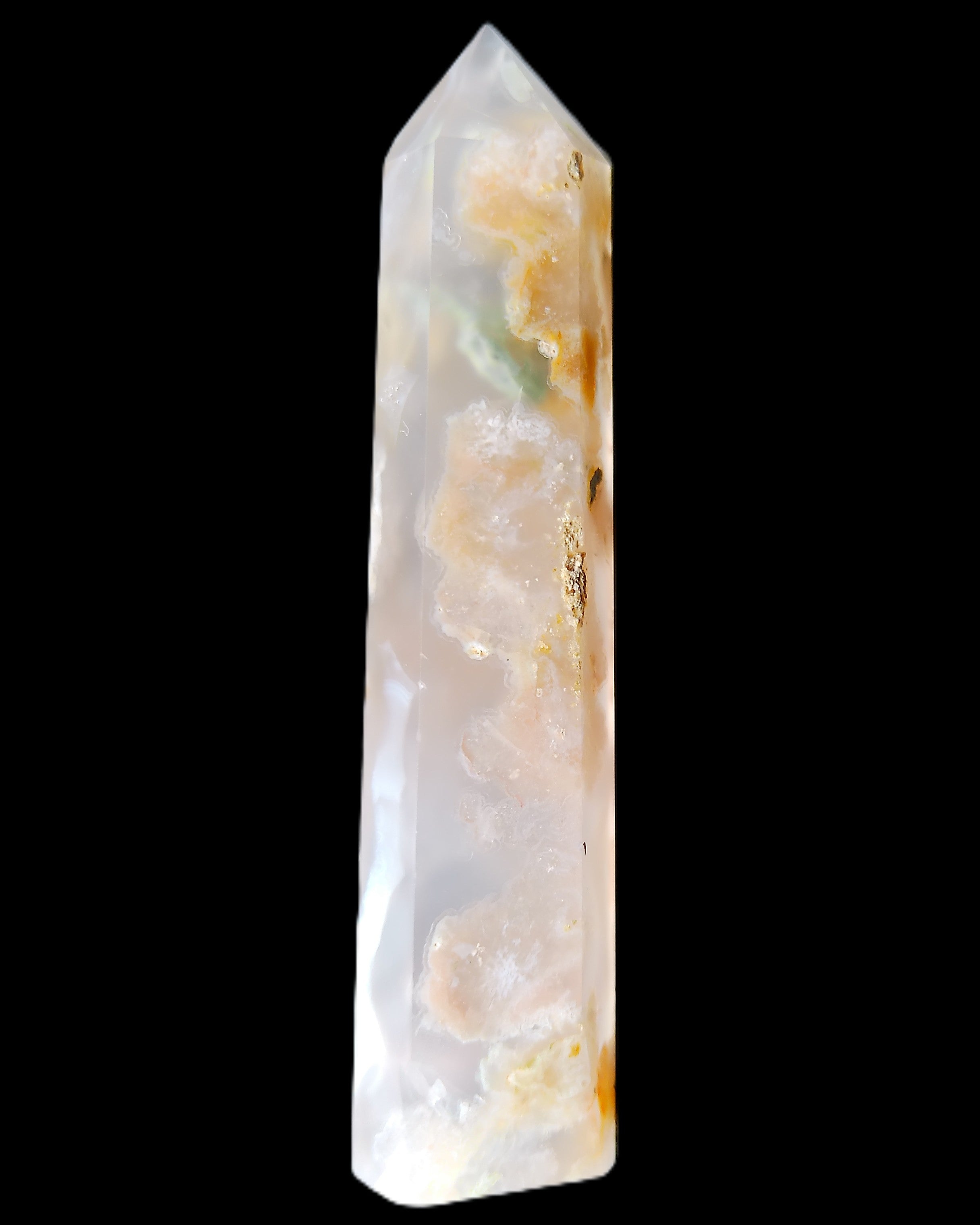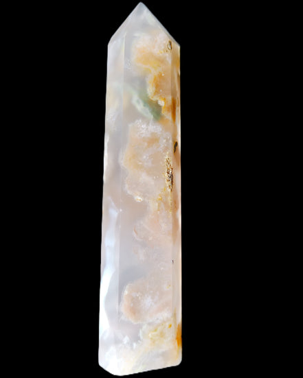 This Cherry Blossom Agate wand 82mm weighs 36g. Cherry Blossom Agate is also known as Flower Agate. It is recent find from Madagascar. Cherry Blossom Agate is a pink form of Agate with opaque white Chalcedony inclusions that look like blossom flowers.