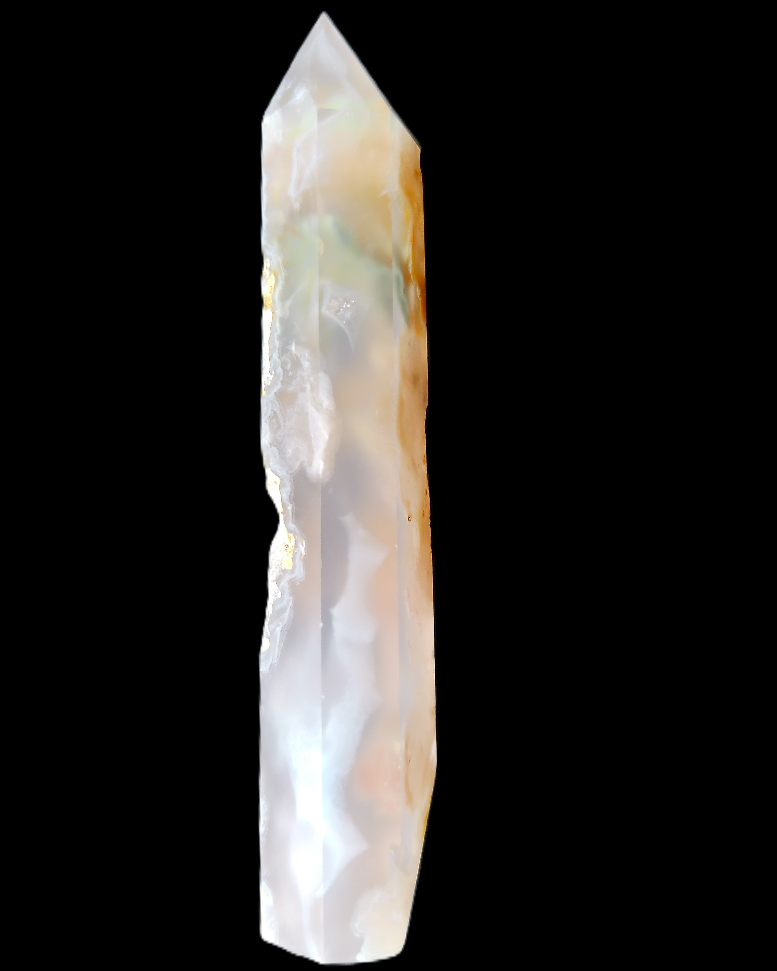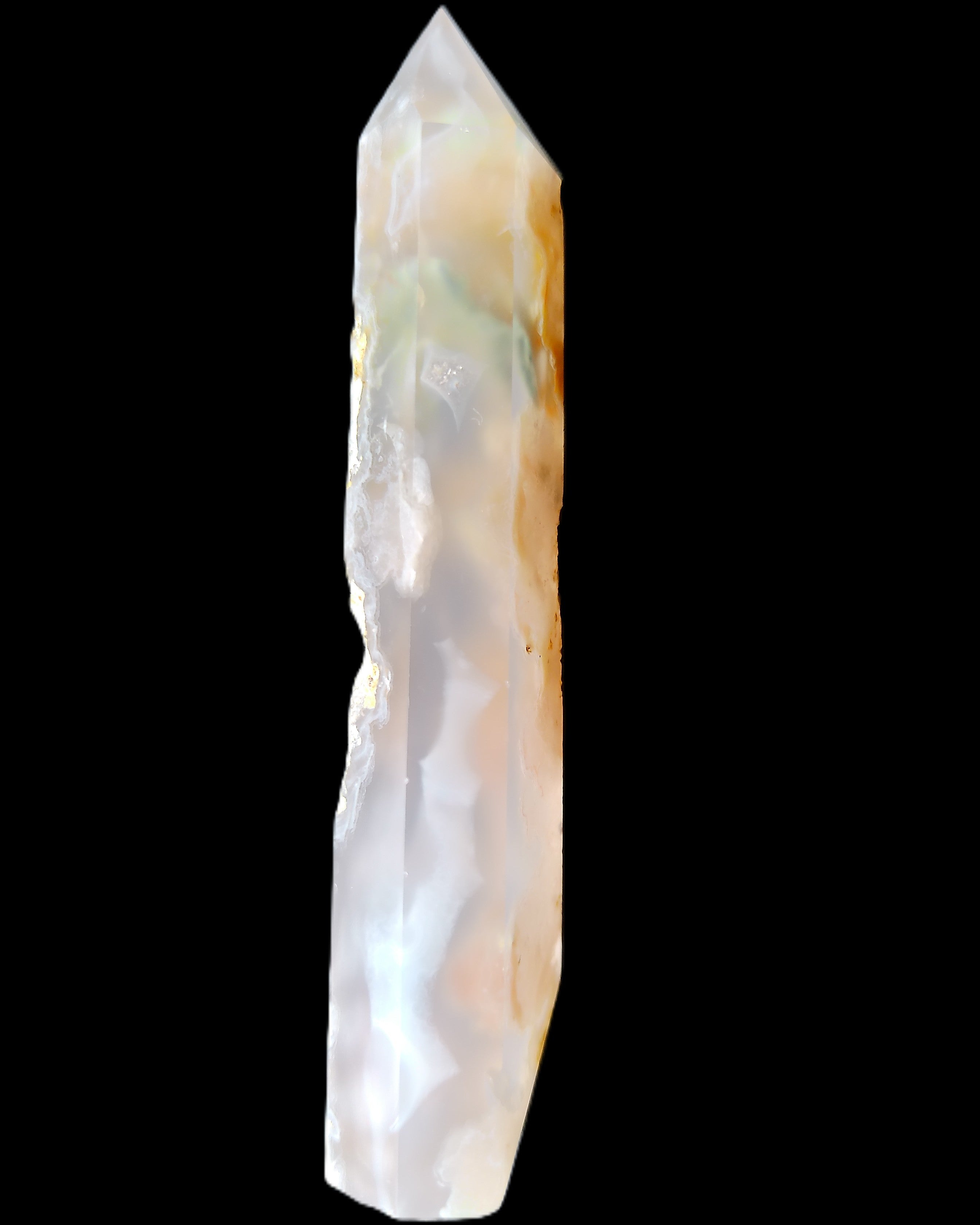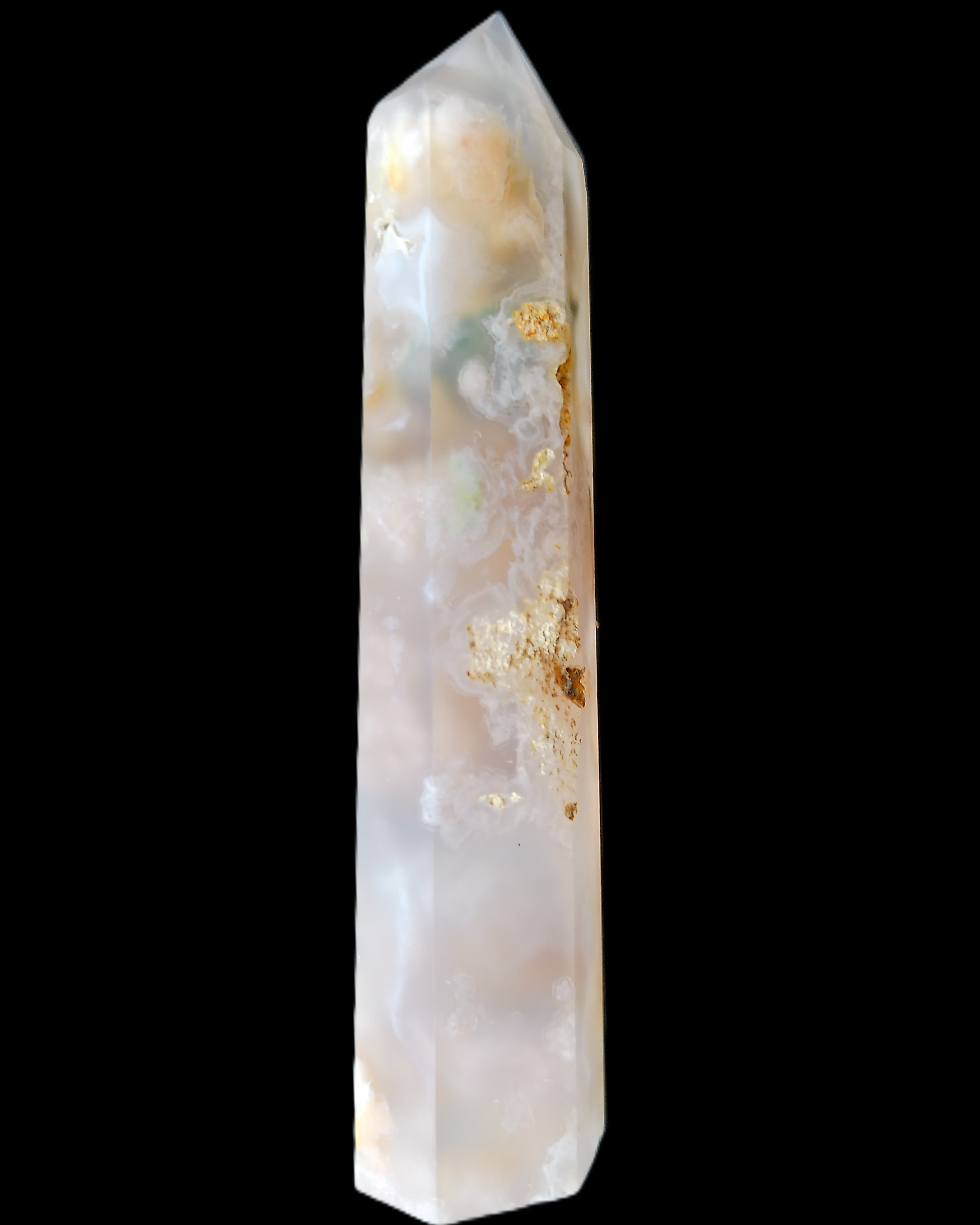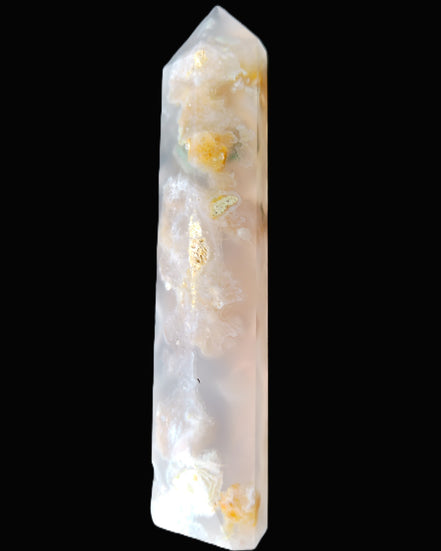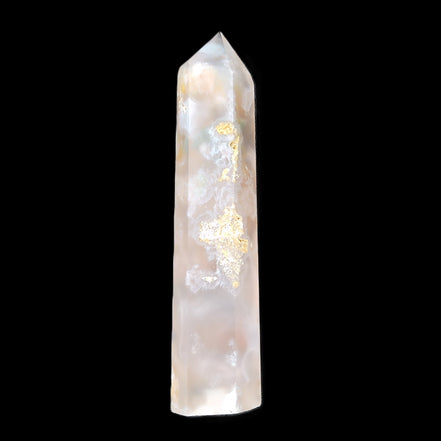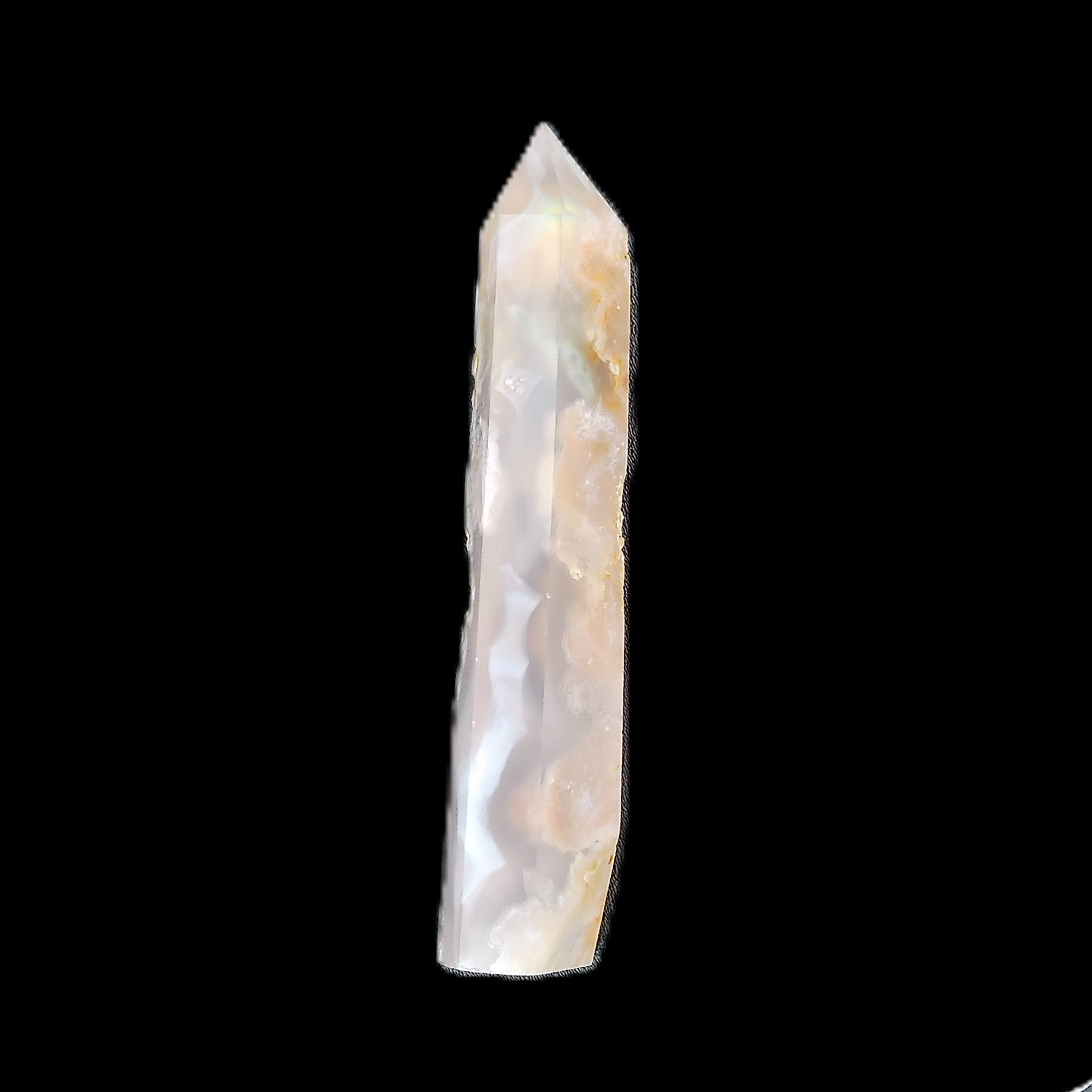 This Cherry Blossom Agate wand 82mm weighs 36g. Cherry Blossom Agate is also known as Flower Agate. It is recent find from Madagascar. Cherry Blossom Agate is a pink form of Agate with opaque white Chalcedony inclusions that look like blossom flowers.