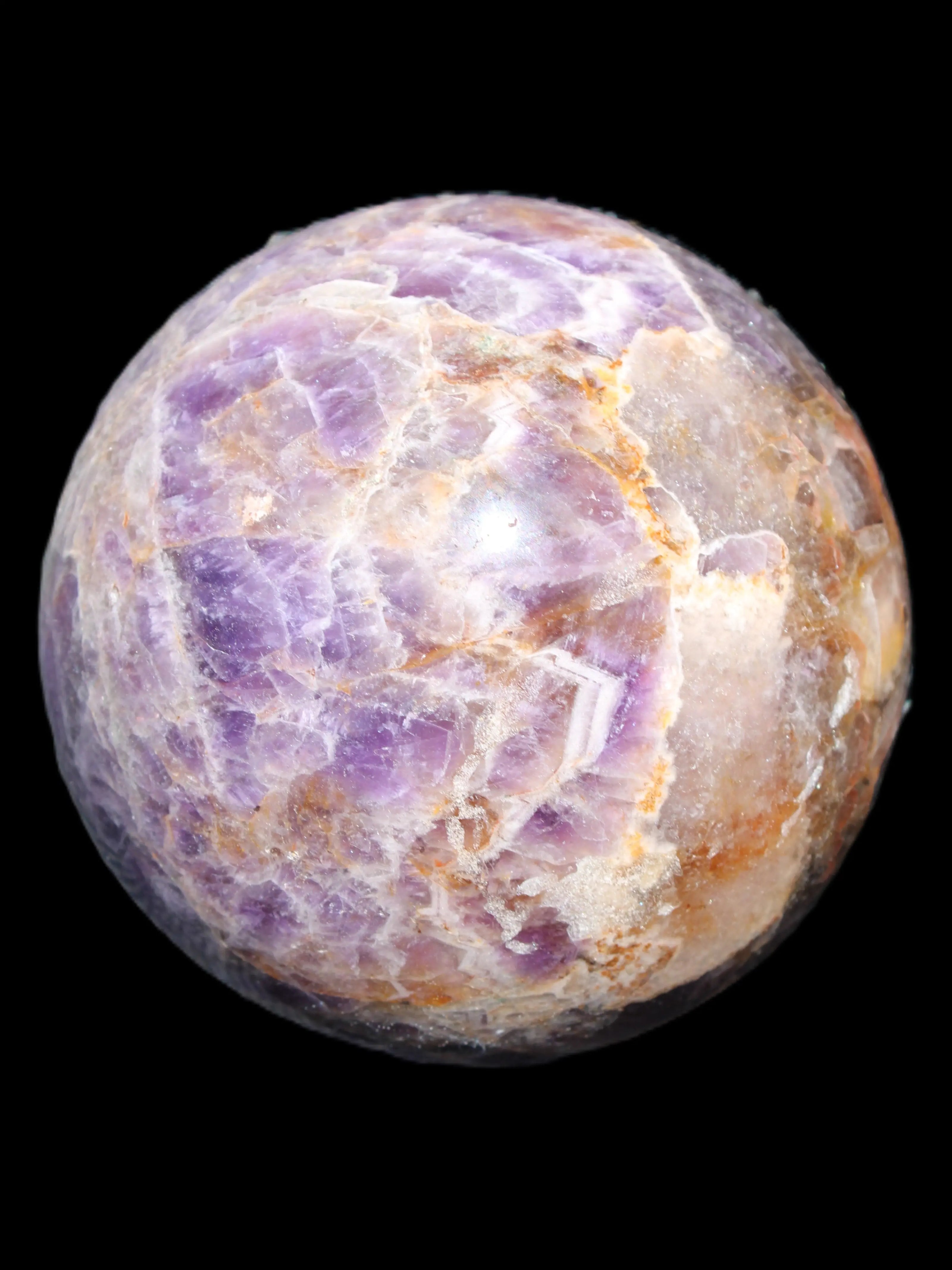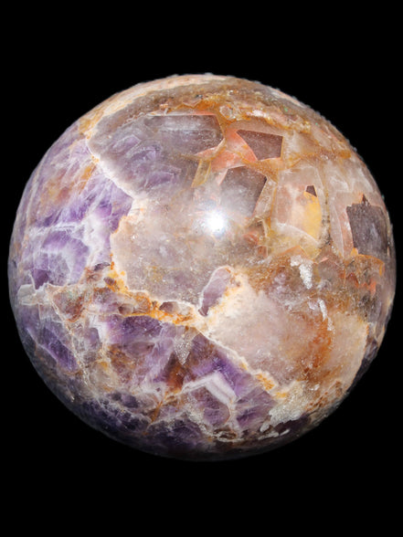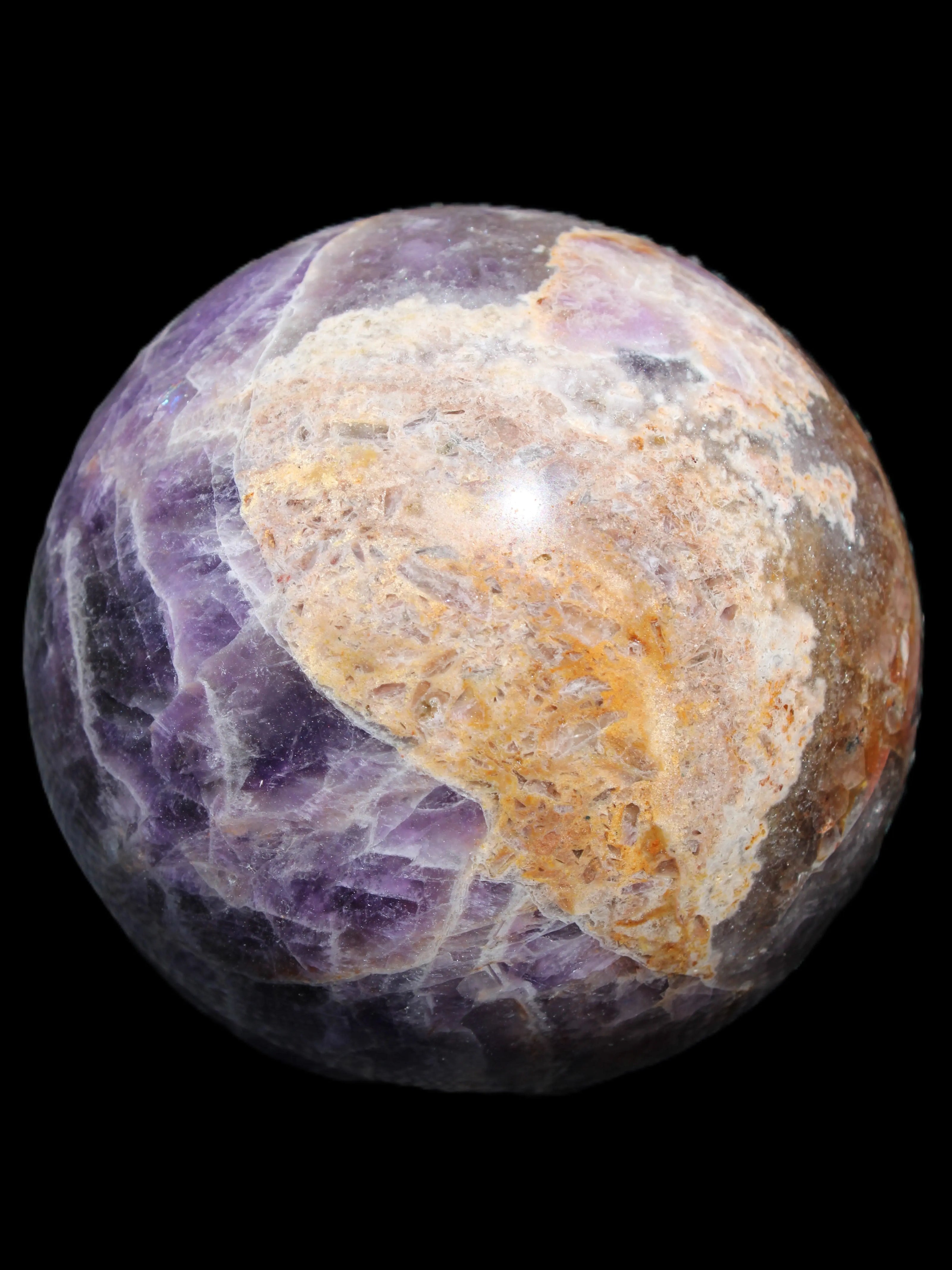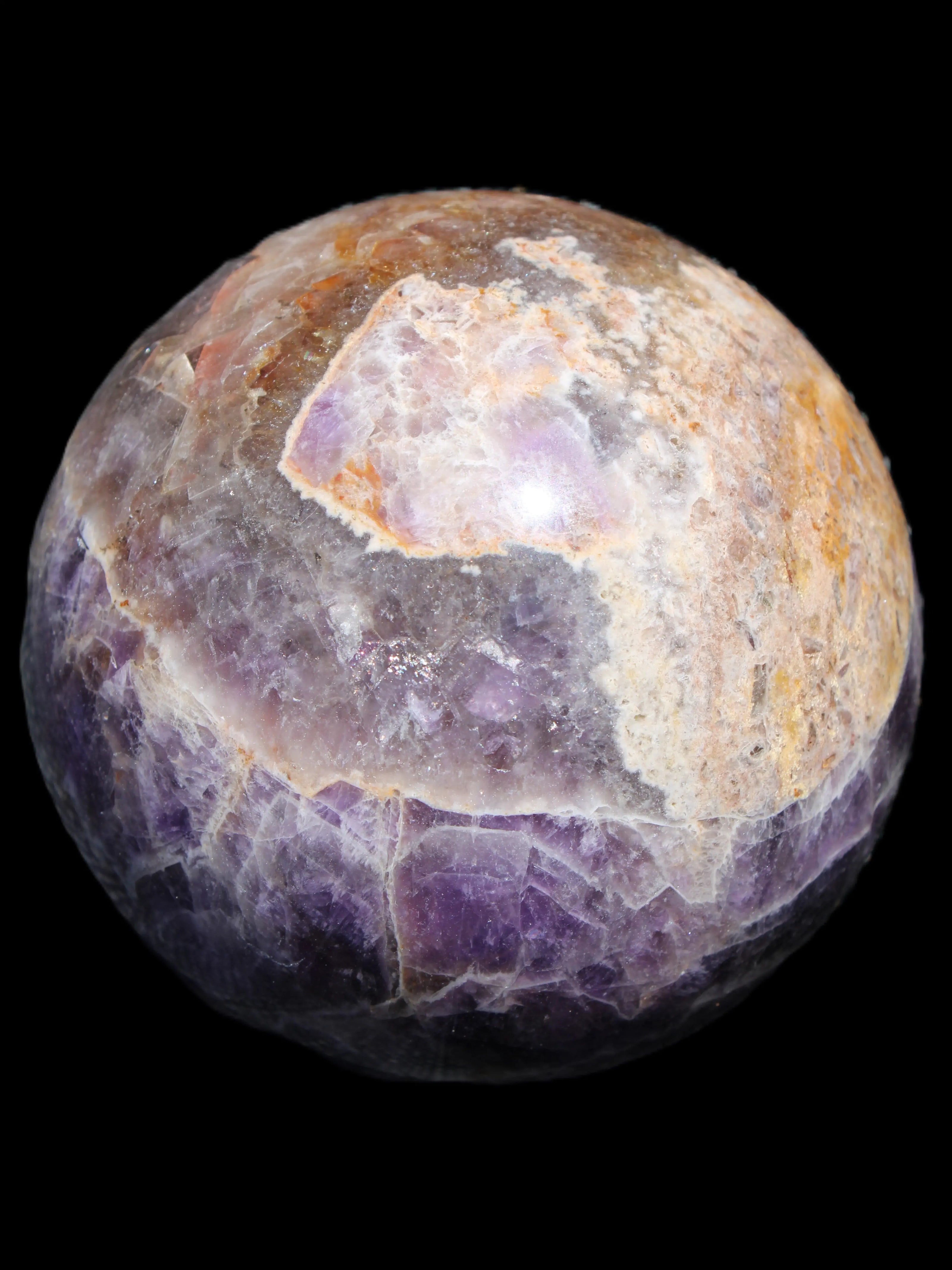 The crystal of this sphere is also called Fantasy Amethyst for its wild patterns and colourings, including orange tinges. This feature adds a stronger connection with the Sacral Chakra. This connection gives added force to your imaginings and creative urges as you uncover your hidden meanings.