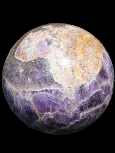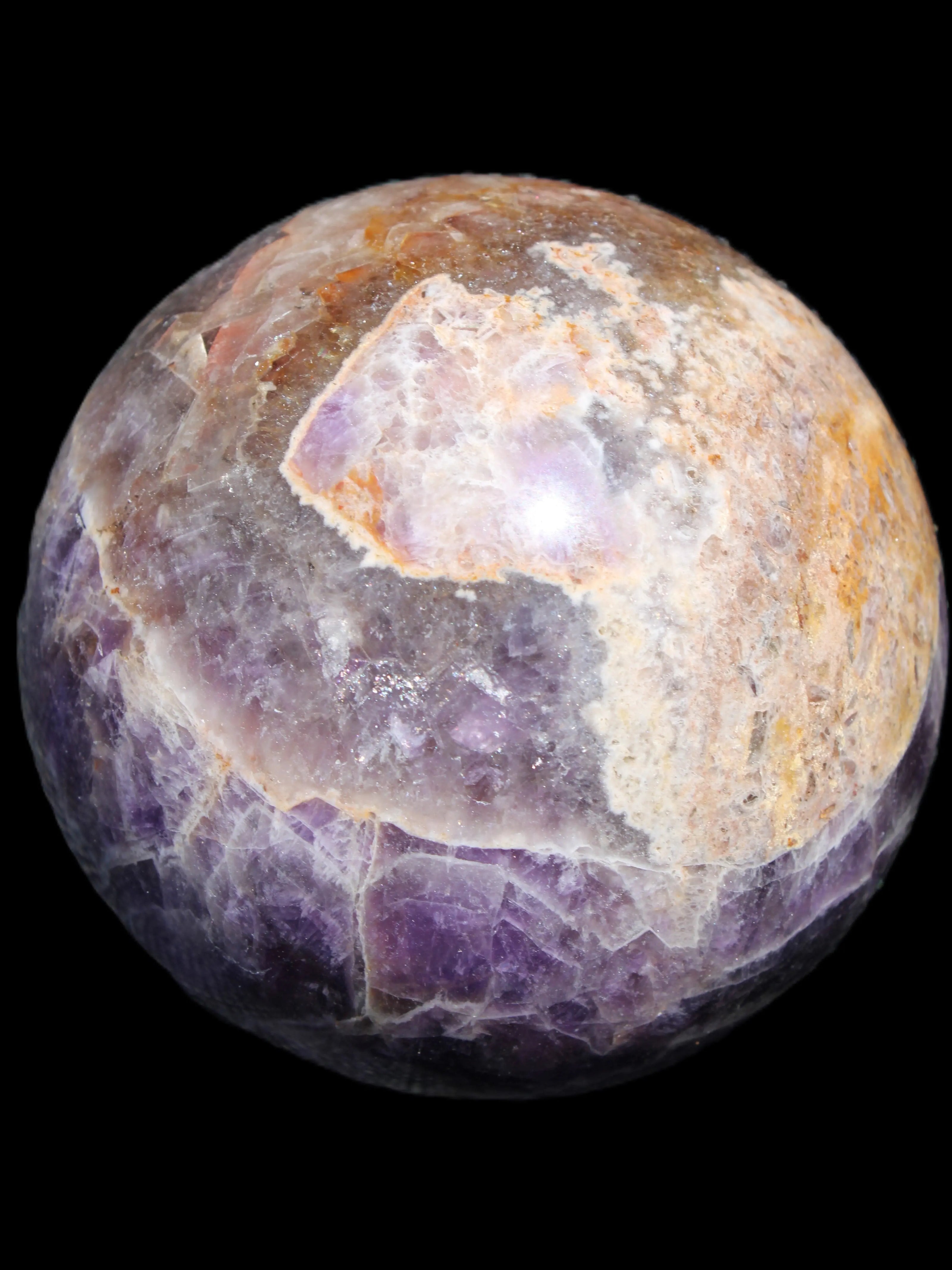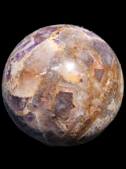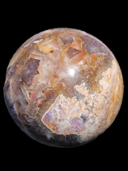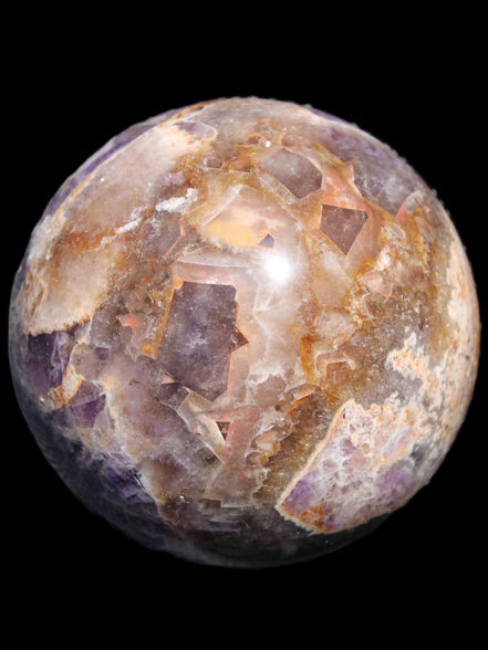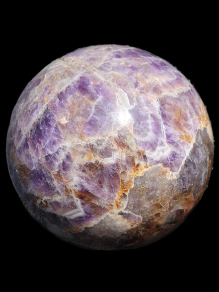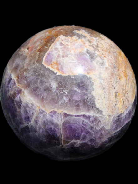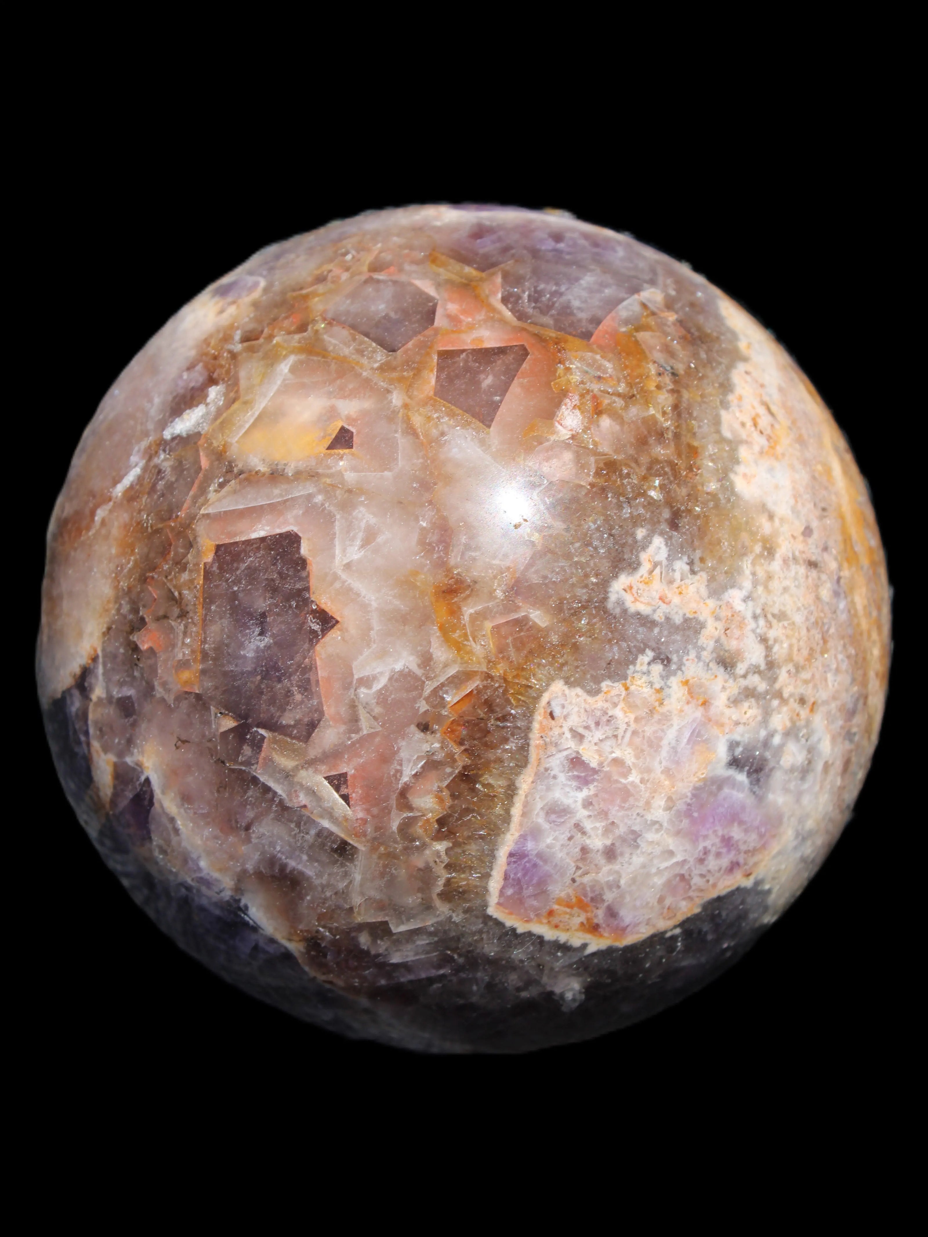 The crystal of this sphere is also called Fantasy Amethyst for its wild patterns and colourings, including orange tinges. This feature adds a stronger connection with the Sacral Chakra. This connection gives added force to your imaginings and creative urges as you uncover your hidden meanings.