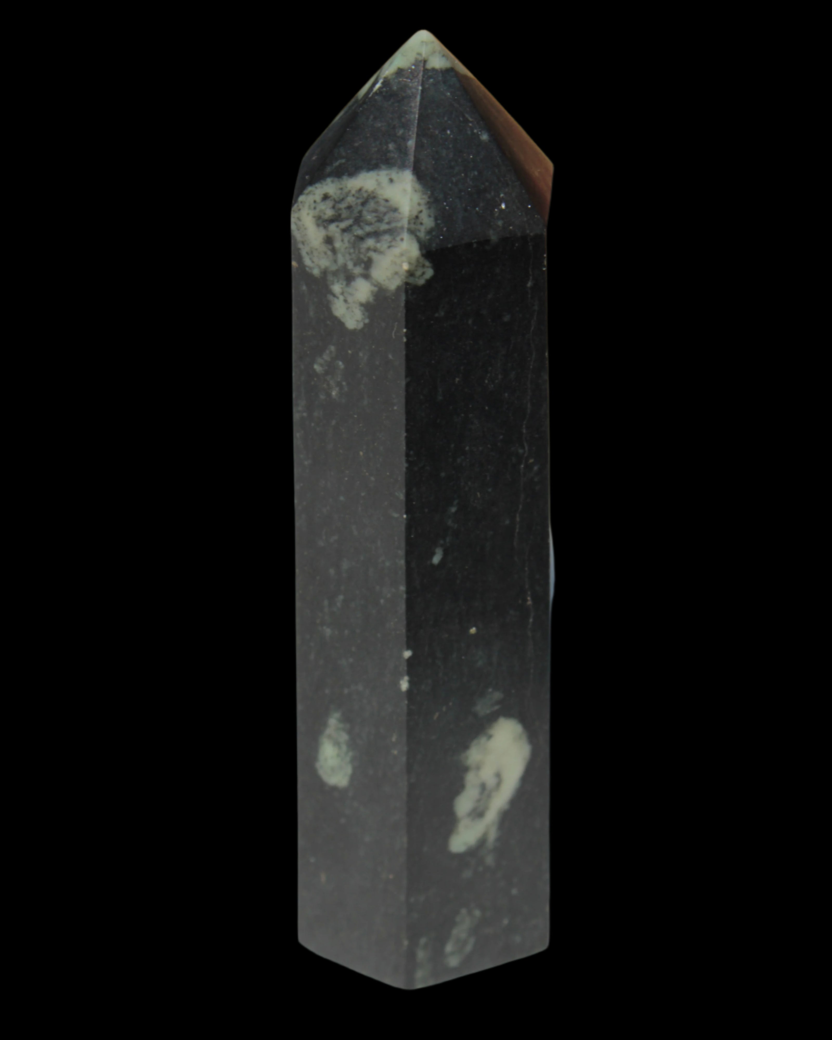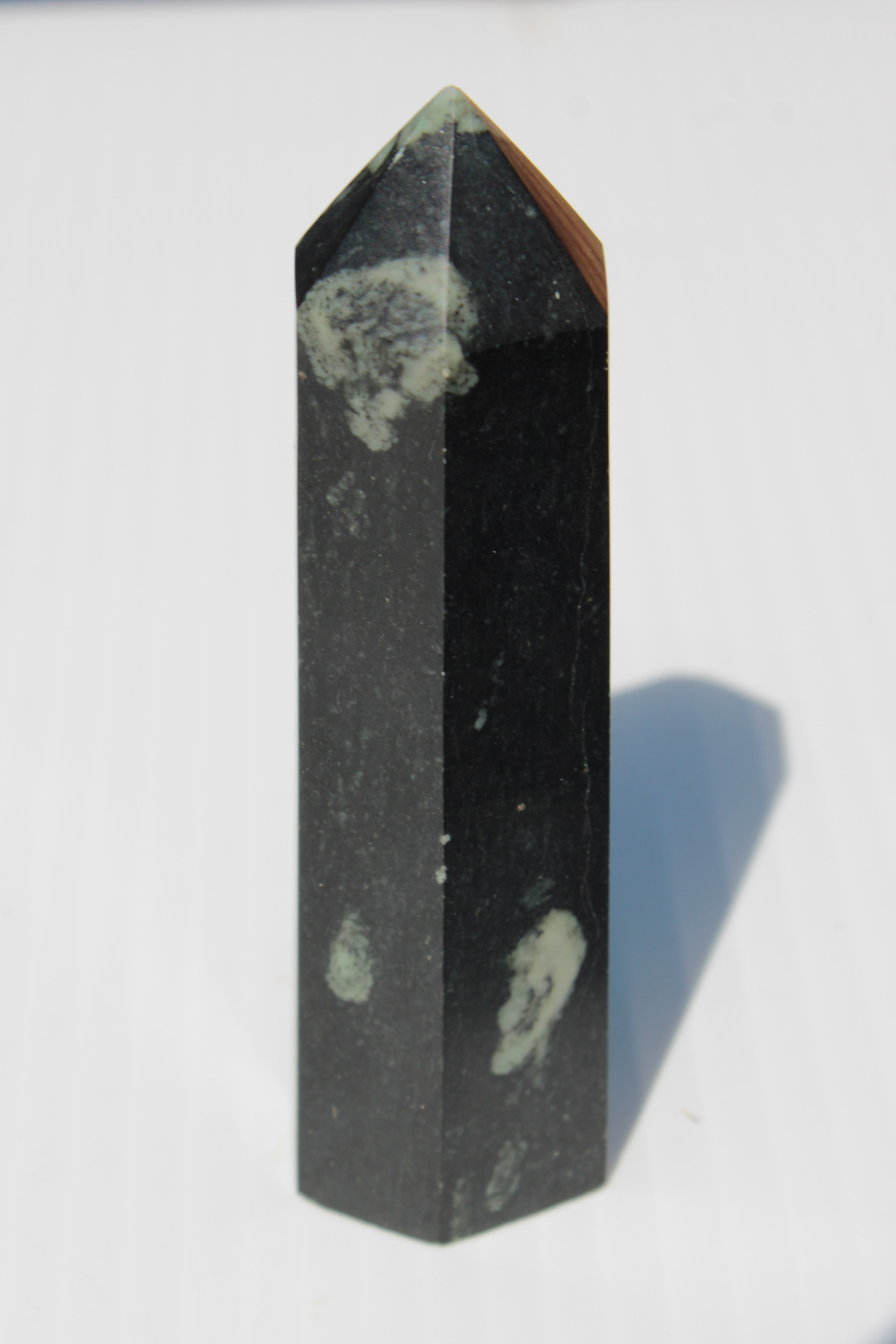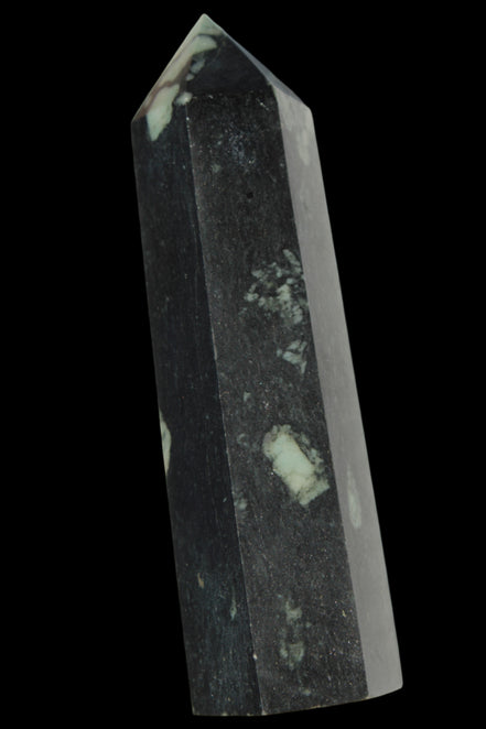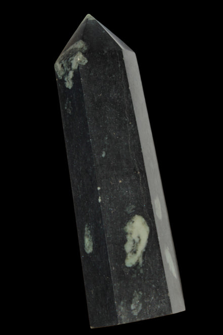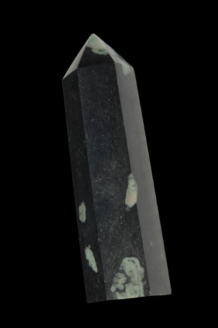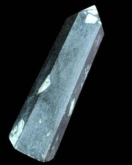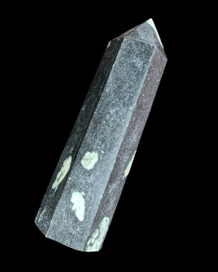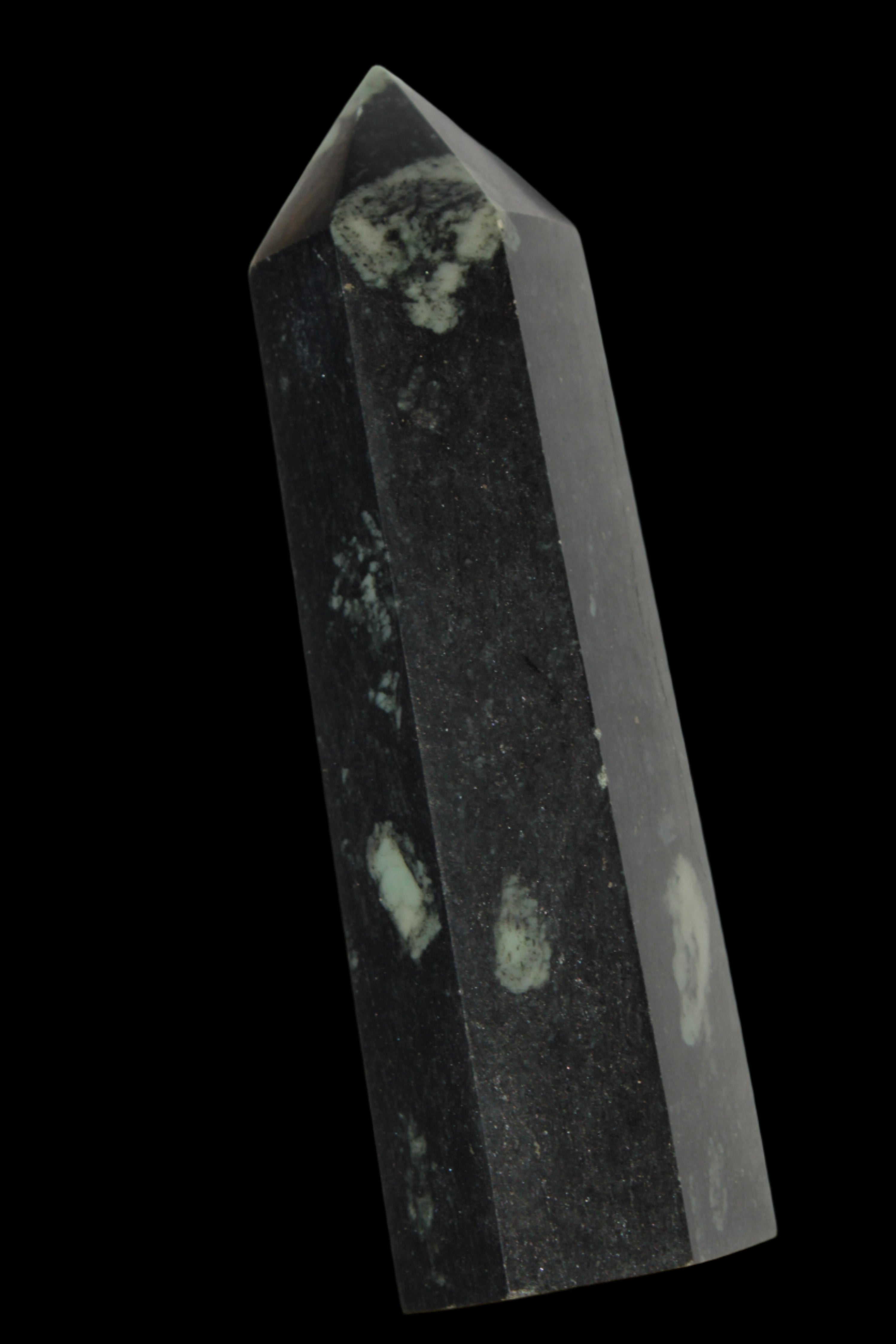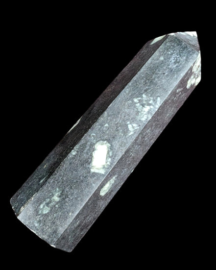 This Chrysanthemum Stone wand weighs 116g. Chrysanthemum Stone is a black stone with white crystal patterns resembling blooming flowers. It is also known as Flower Stone. It is a rare stone consisting of a black or brown matrix with natural inclusions of Calcite, Feldspar, Crandallite, Andalusite, or Celestite. These inclusions are usually white and prominent on a dark matrix, often resembling a Chrysanthemum flower. The matrix can consist of a mixture of Limestone, Dolomite, Porphyry, Clay and Gypsum. Chrysanthemum Stone formed over 290 million years ago with from organic-rich mud on sea floors, metamorphosed through heat and pressure.