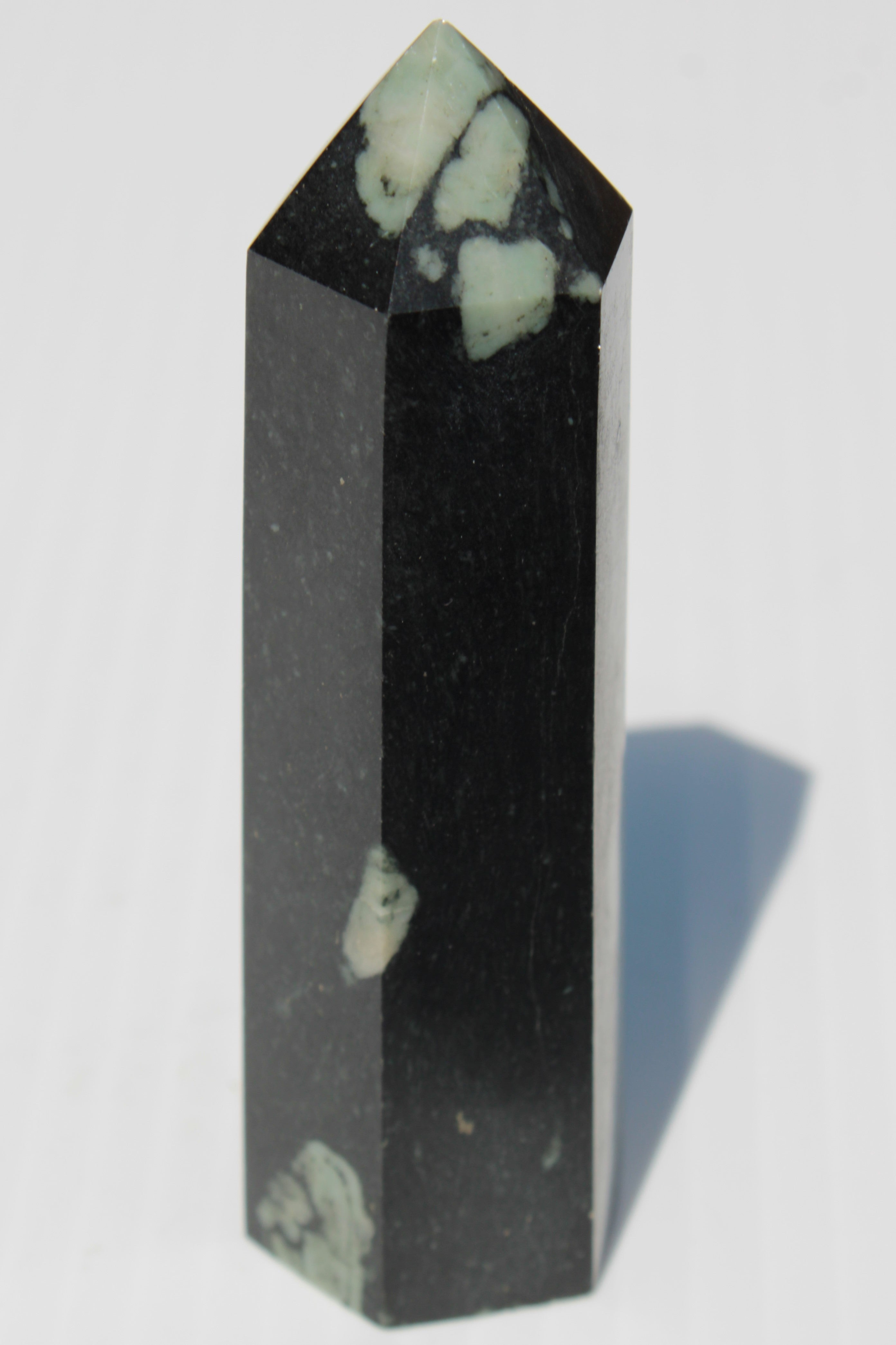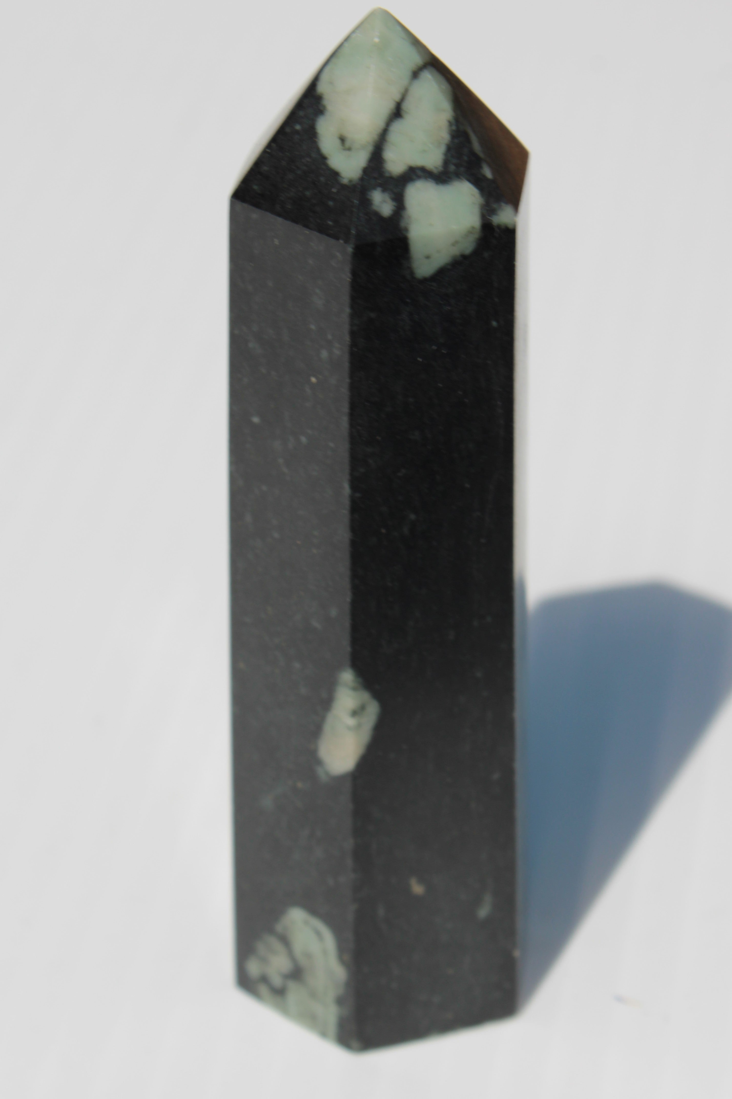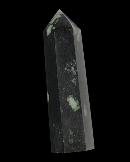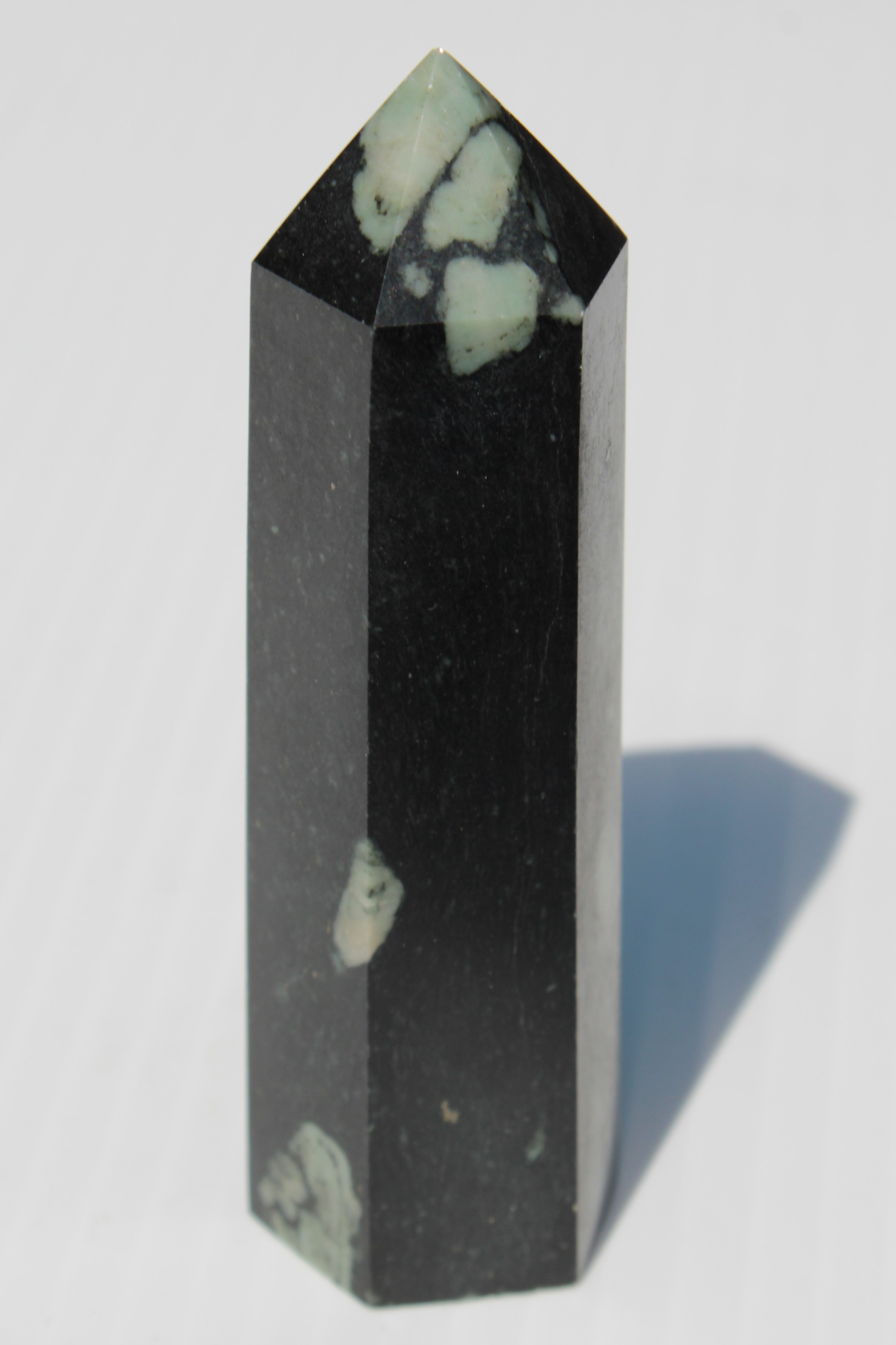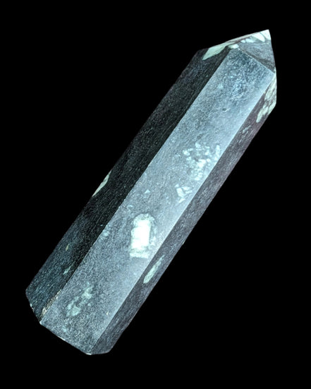 This Chrysanthemum Stone wand weighs 116g. Chrysanthemum Stone is a black stone with white crystal patterns resembling blooming flowers. It is also known as Flower Stone. It is a rare stone consisting of a black or brown matrix with natural inclusions of Calcite, Feldspar, Crandallite, Andalusite, or Celestite. These inclusions are usually white and prominent on a dark matrix, often resembling a Chrysanthemum flower. The matrix can consist of a mixture of Limestone, Dolomite, Porphyry, Clay and Gypsum. Chrysanthemum Stone formed over 290 million years ago with from organic-rich mud on sea floors, metamorphosed through heat and pressure.