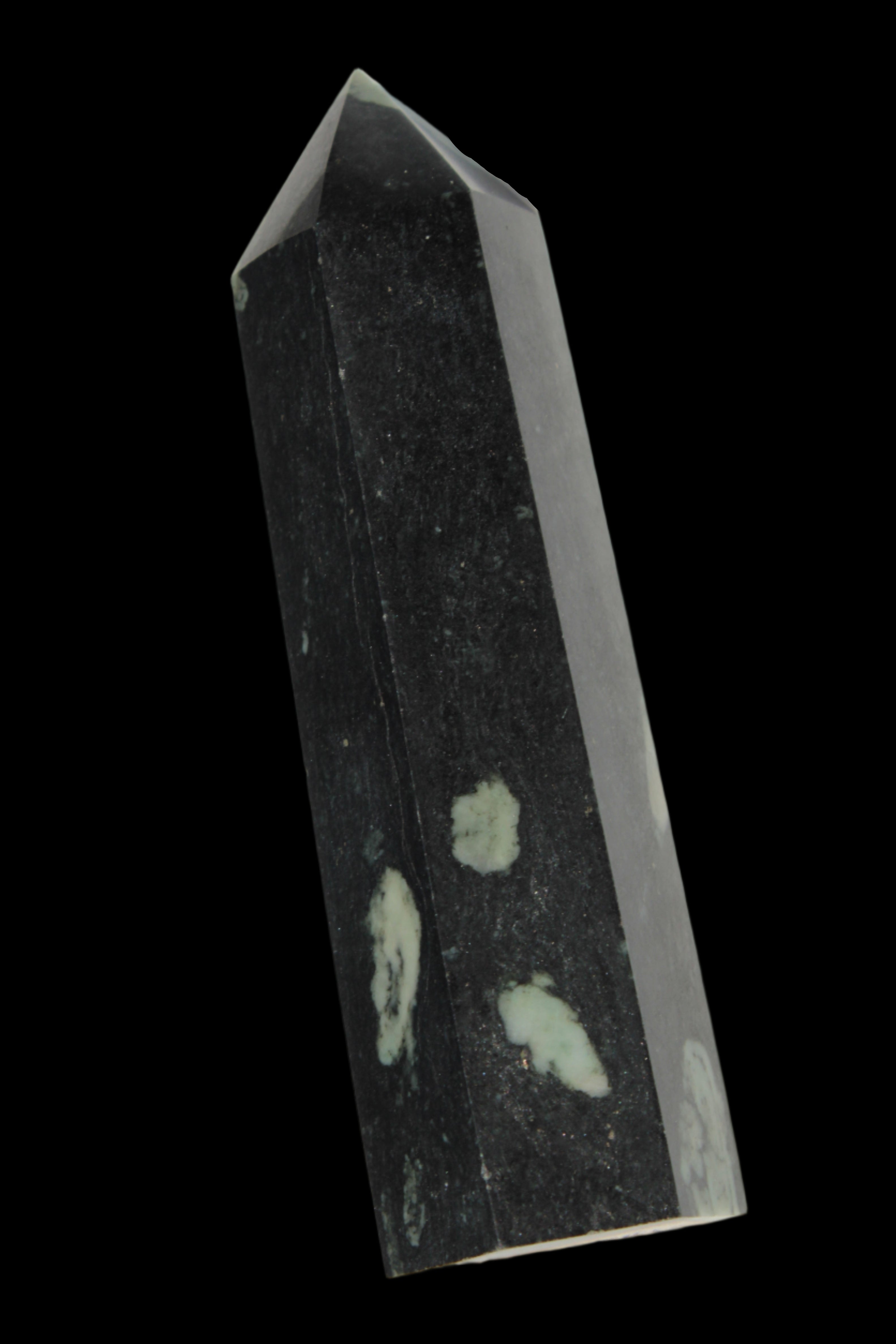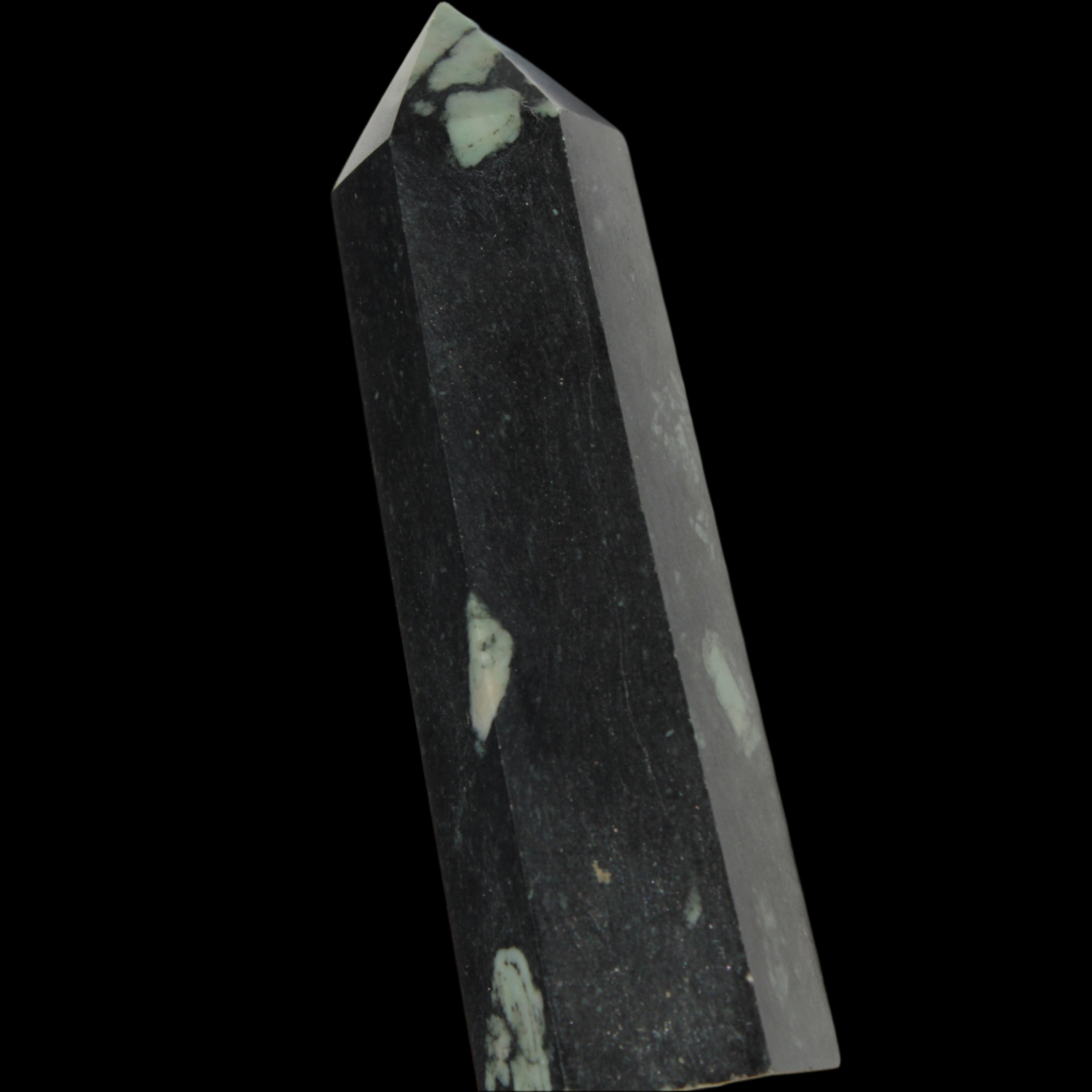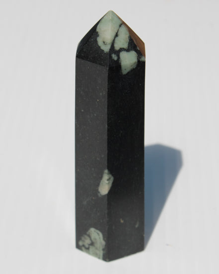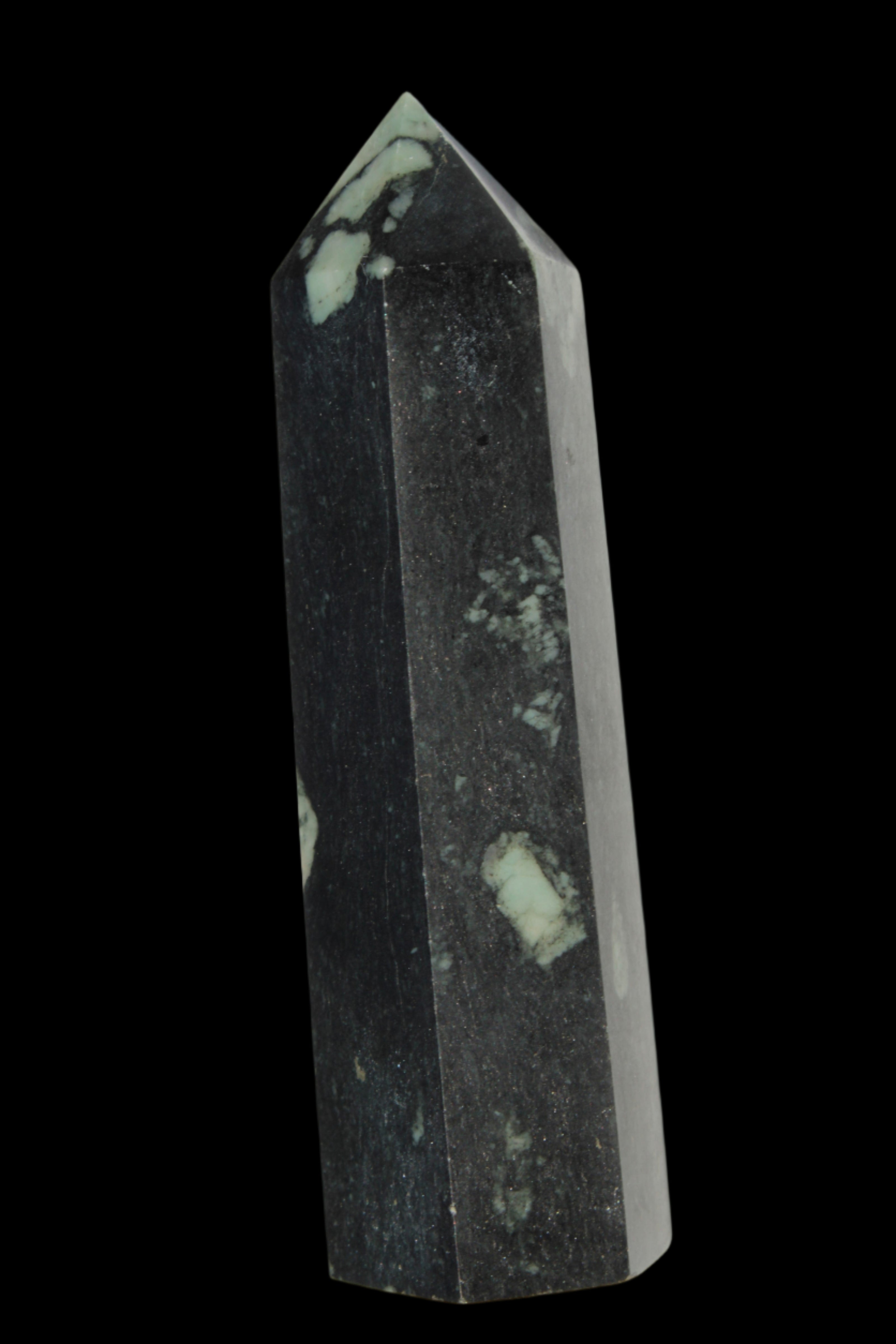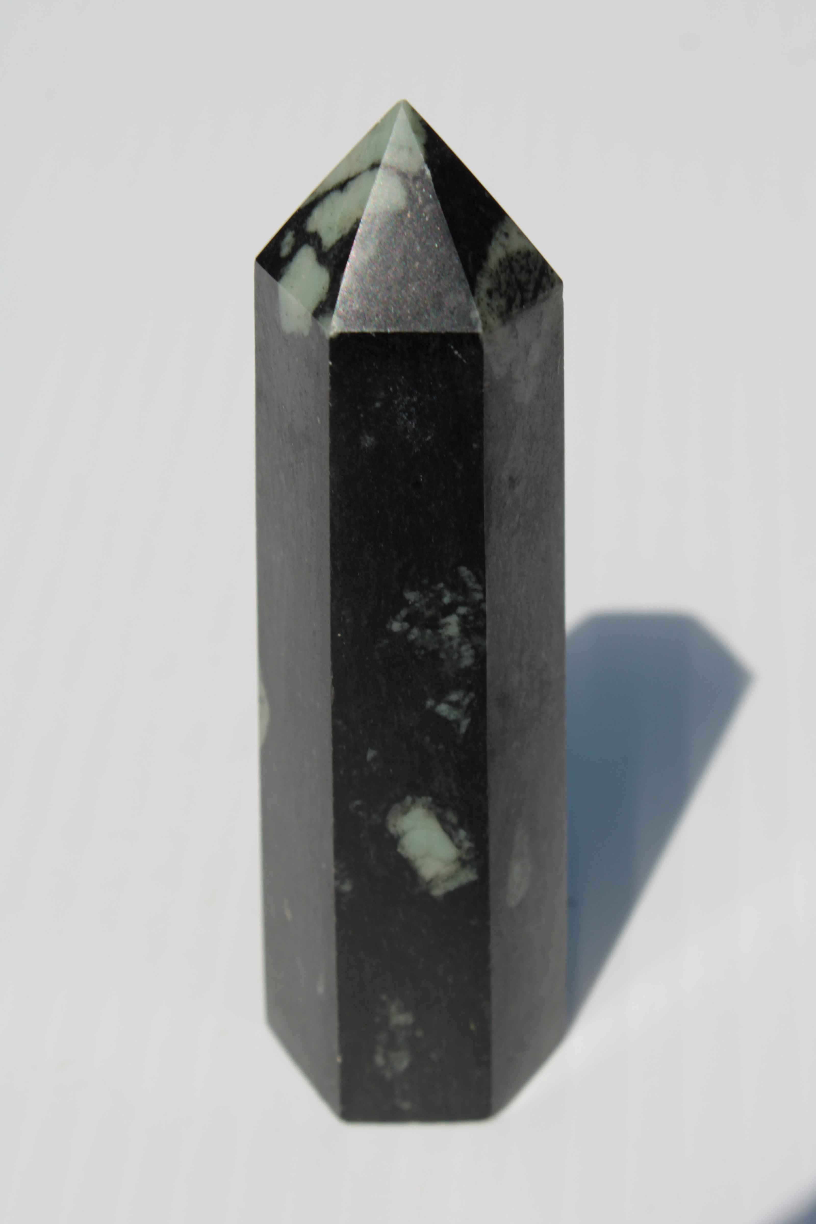 This Chrysanthemum Stone wand weighs 116g. Chrysanthemum Stone is a black stone with white crystal patterns resembling blooming flowers. It is also known as Flower Stone. It is a rare stone consisting of a black or brown matrix with natural inclusions of Calcite, Feldspar, Crandallite, Andalusite, or Celestite. These inclusions are usually white and prominent on a dark matrix, often resembling a Chrysanthemum flower. The matrix can consist of a mixture of Limestone, Dolomite, Porphyry, Clay and Gypsum. Chrysanthemum Stone formed over 290 million years ago with from organic-rich mud on sea floors, metamorphosed through heat and pressure.