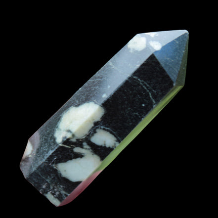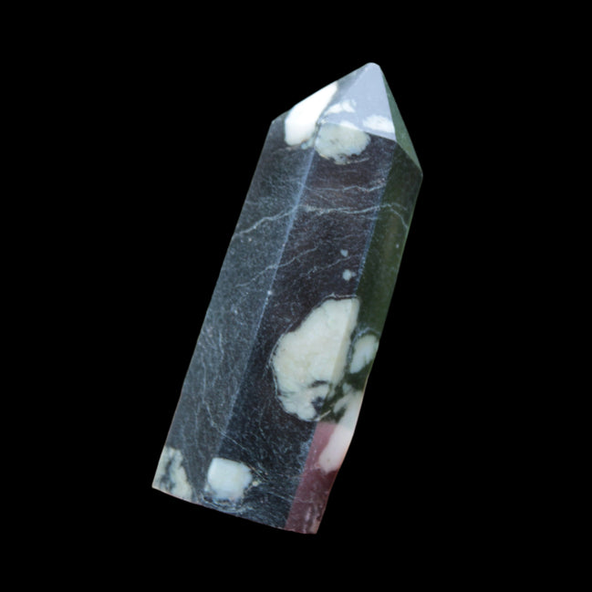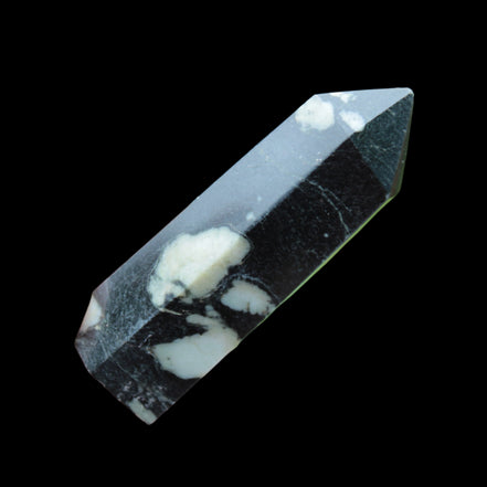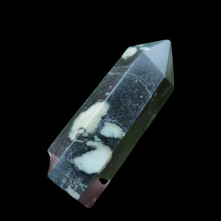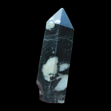 This Chrysanthemum Stone wand weighs 51g. Chrysanthemum Stone is a black stone with white crystal patterns resembling blooming flowers. It is also known as Flower Stone. It is a rare stone consisting of a black or brown matrix with natural inclusions of Calcite, Feldspar, Crandallite, Andalusite, or Celestite. These inclusions are usually white and prominent on a dark matrix, often resembling a Chrysanthemum flower. The matrix can consist of a mixture of Limestone, Dolomite, Porphyry, Clay and Gypsum. Chrysanthemum Stone formed over 290 million years ago with from organic-rich mud on sea floors, metamorphosed through heat and pressure.