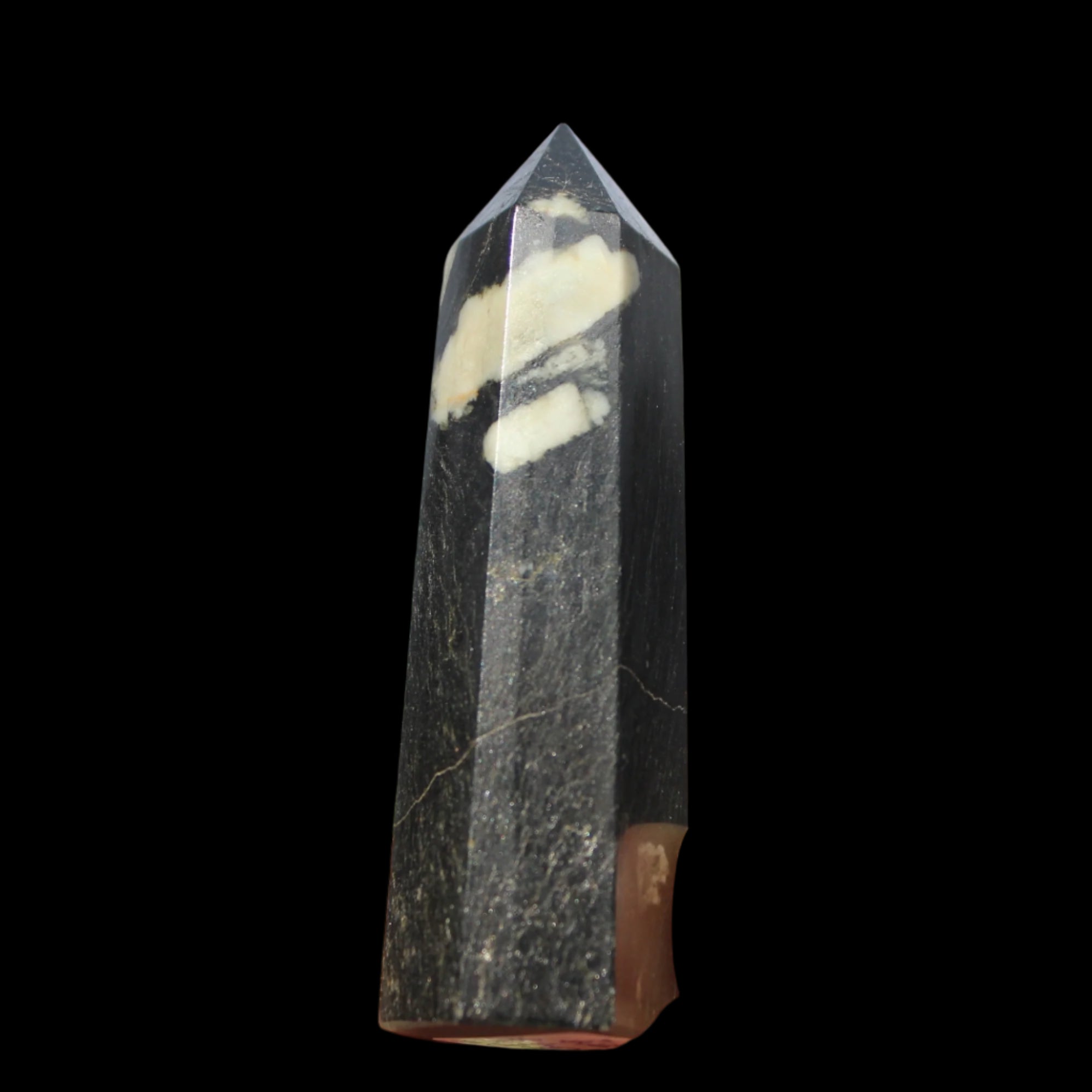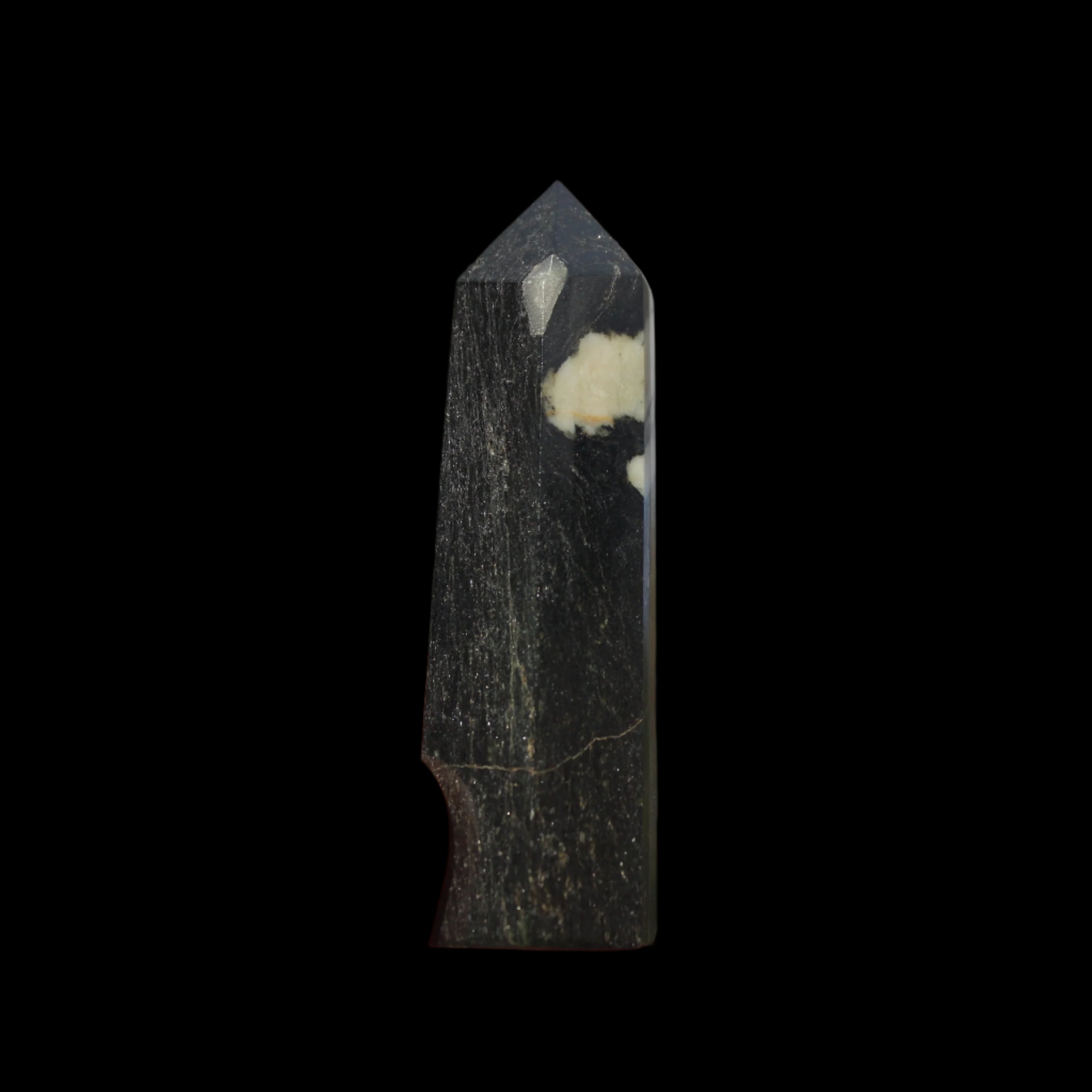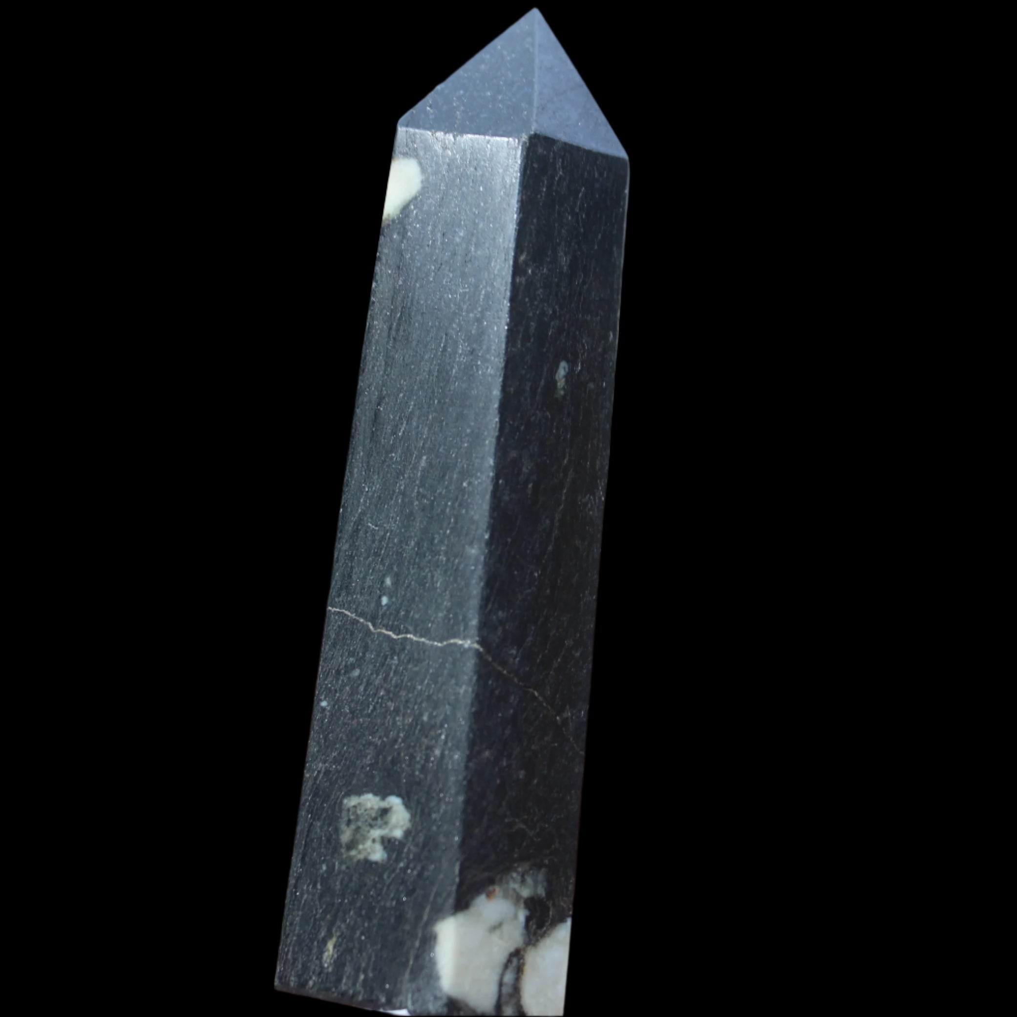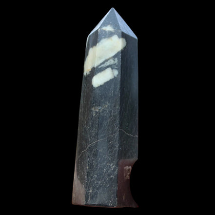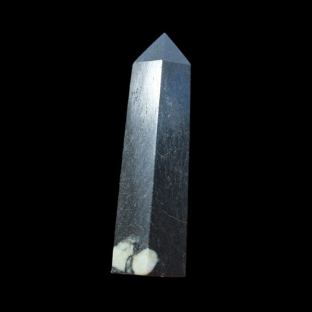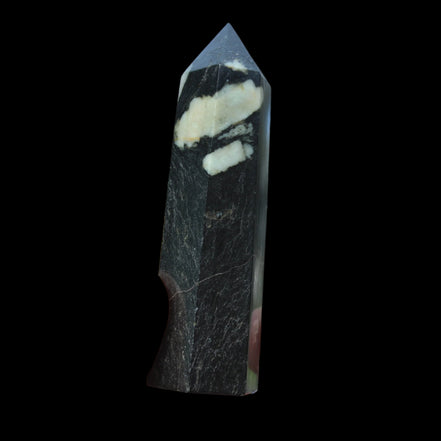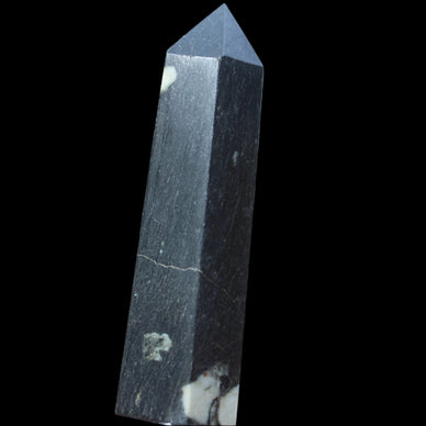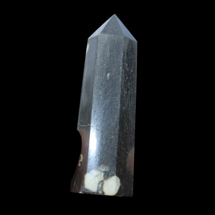 This Chrysanthemum Stone wand 81mm weighs 84g. Chrysanthemum Stone Chrysanthemum Stone is a black stone with white crystal patterns resembling blooming flowers. It is also known as Flower Stone. It is a rare stone consisting of a black or brown matrix with natural inclusions of Calcite, Feldspar, Crandallite, Andalusite, or Celestite. These inclusions are usually white and prominent on a dark matrix, often resembling a Chrysanthemum flower. The matrix can consist of a mixture of Limestone, Dolomite, Porphyry, Clay and Gypsum. Chrysanthemum Stone formed over 290 million years ago with from organic-rich mud on sea floors, metamorphosed through heat and pressure.