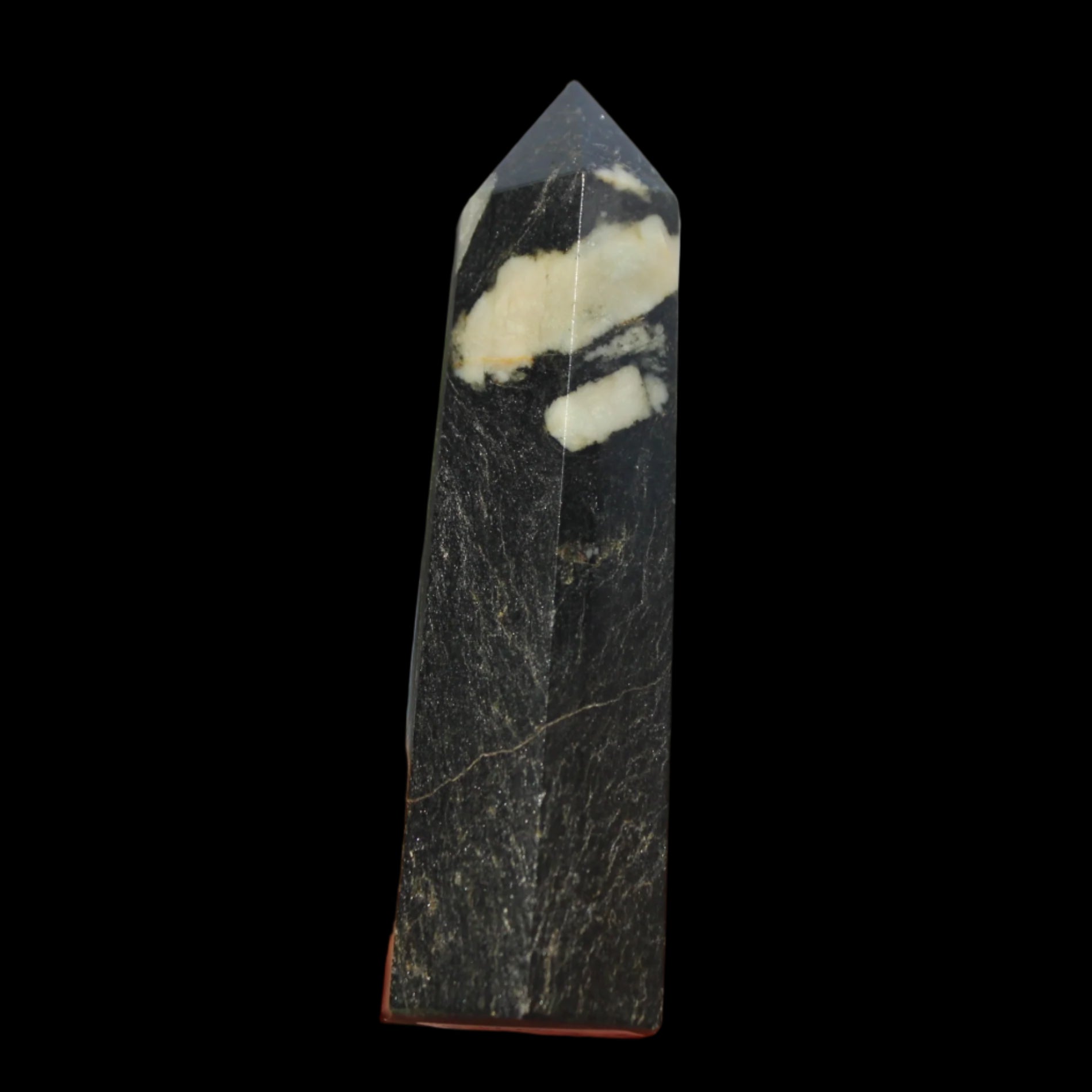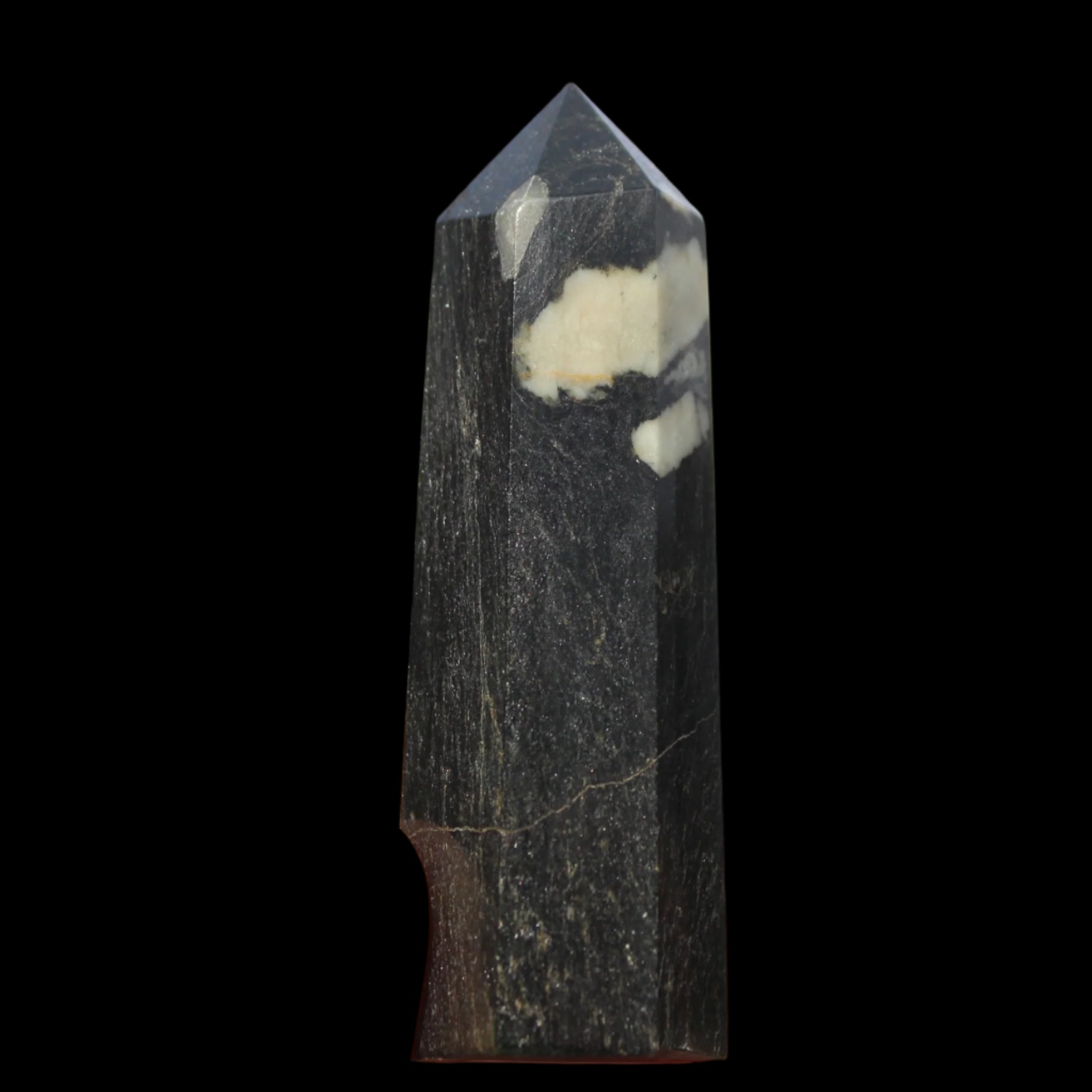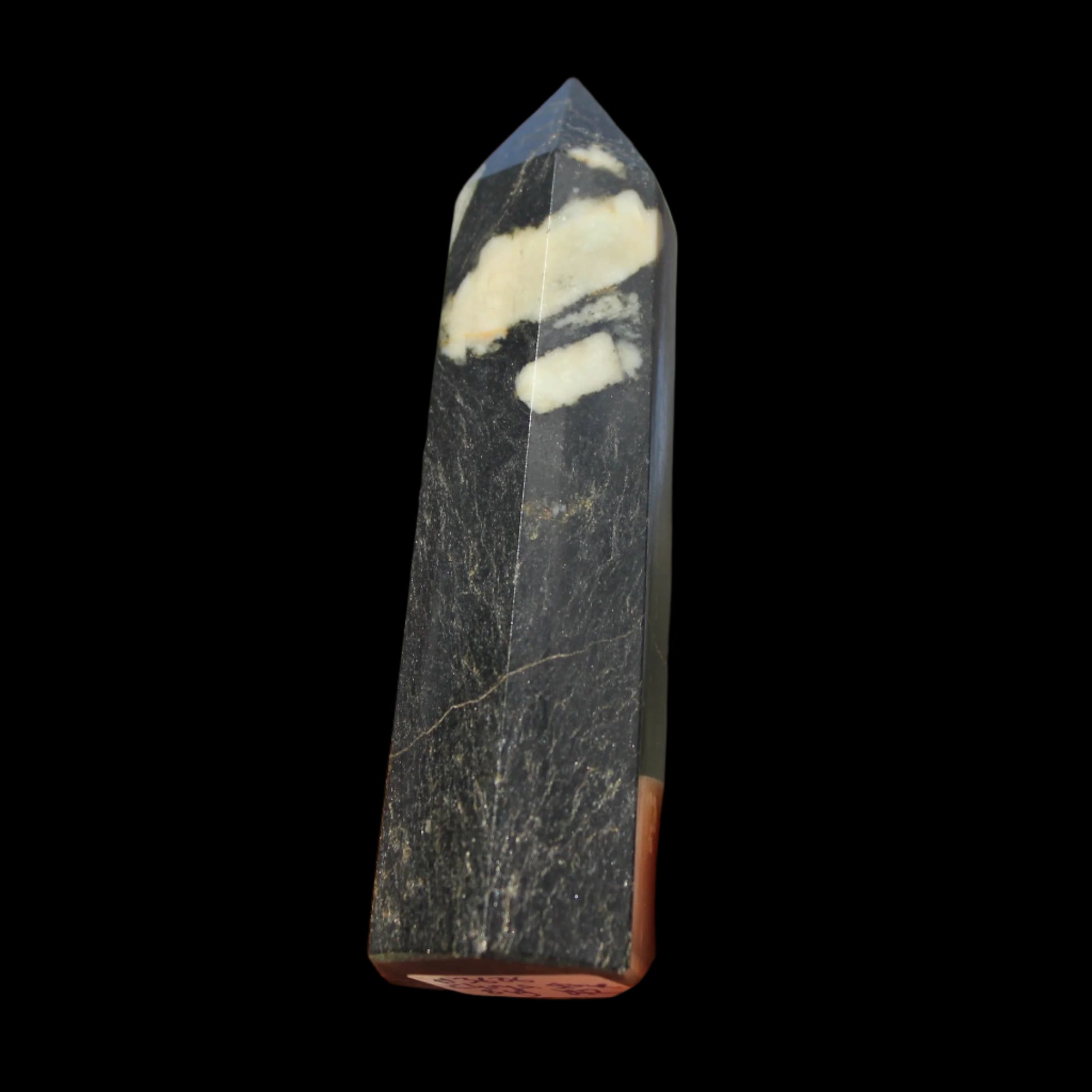 This Chrysanthemum Stone wand 81mm weighs 84g. Chrysanthemum Stone Chrysanthemum Stone is a black stone with white crystal patterns resembling blooming flowers. It is also known as Flower Stone. It is a rare stone consisting of a black or brown matrix with natural inclusions of Calcite, Feldspar, Crandallite, Andalusite, or Celestite. These inclusions are usually white and prominent on a dark matrix, often resembling a Chrysanthemum flower. The matrix can consist of a mixture of Limestone, Dolomite, Porphyry, Clay and Gypsum. Chrysanthemum Stone formed over 290 million years ago with from organic-rich mud on sea floors, metamorphosed through heat and pressure.