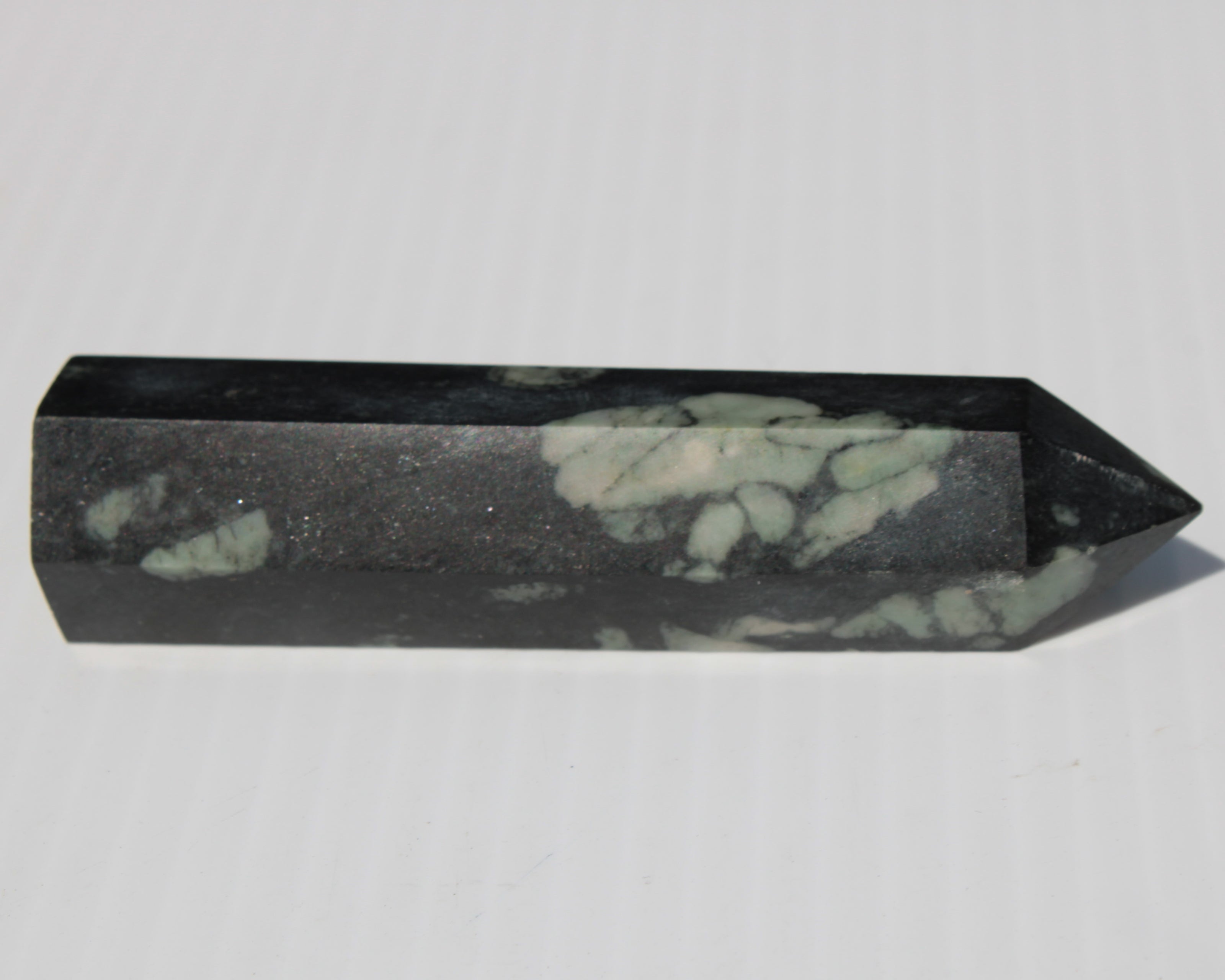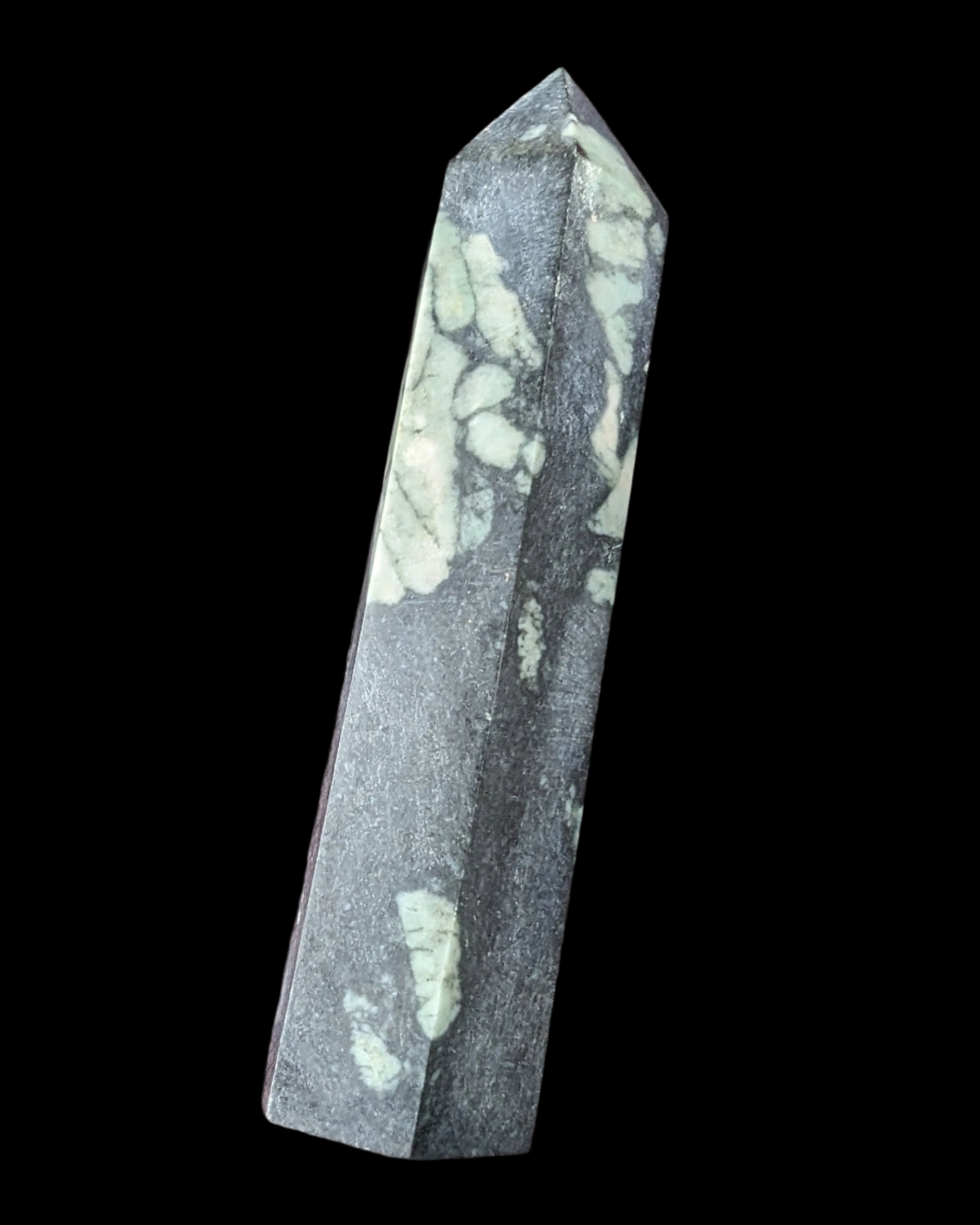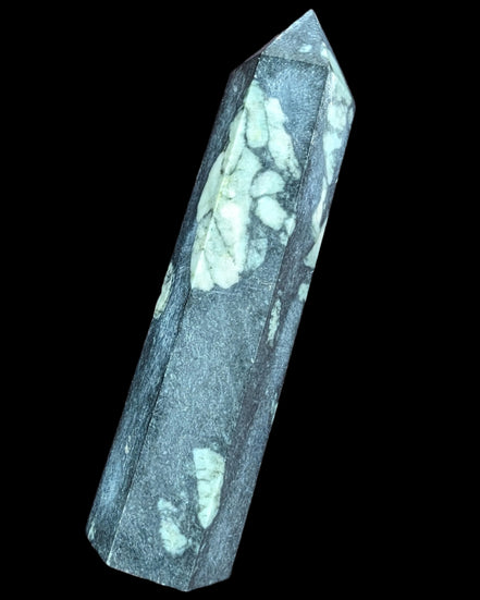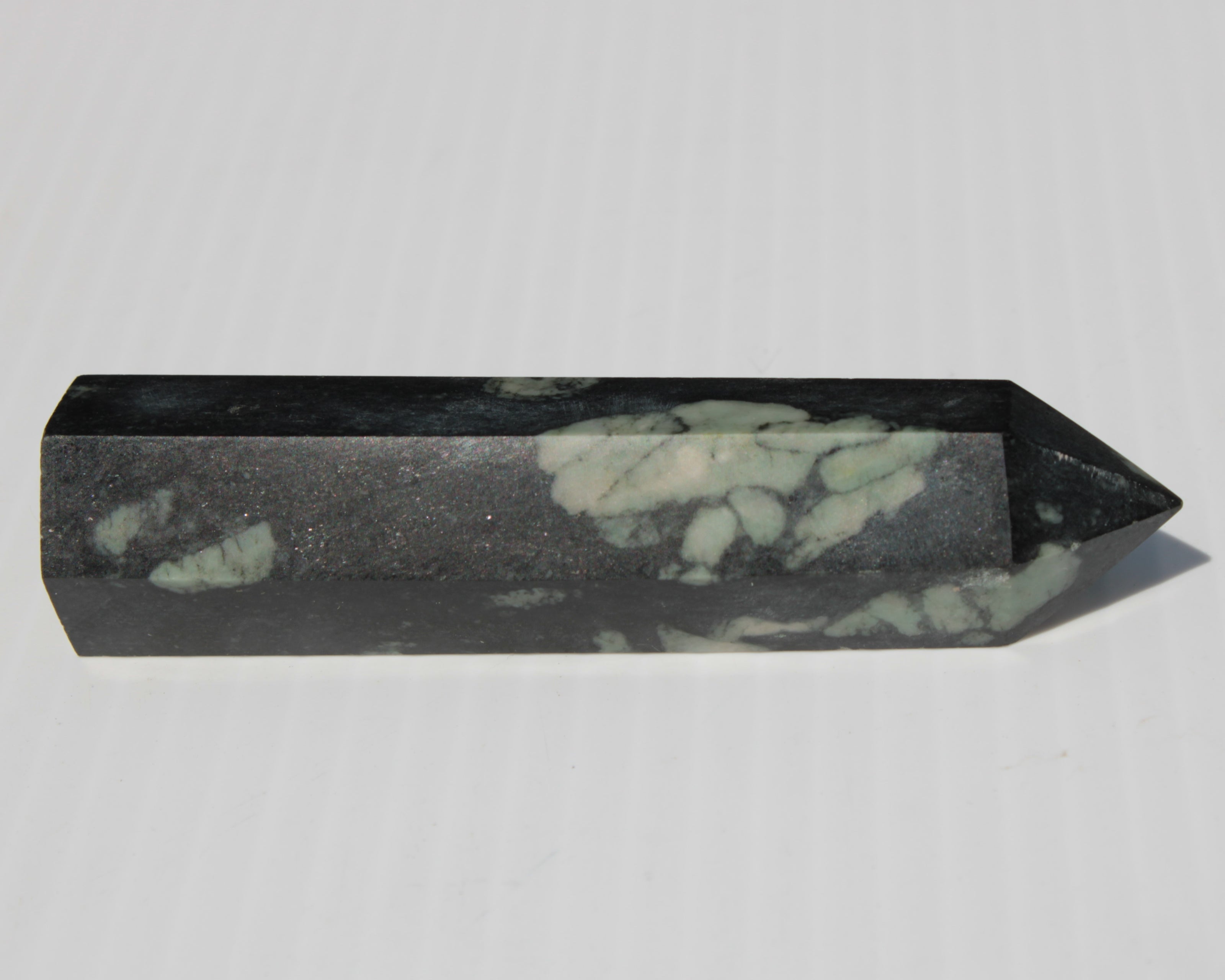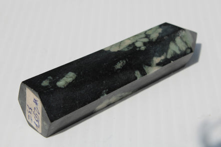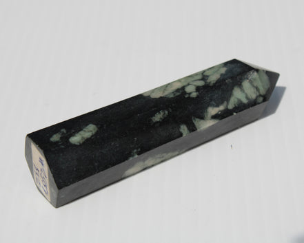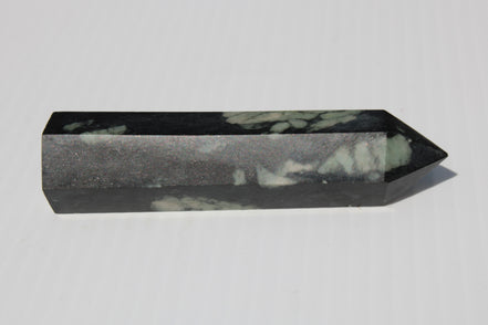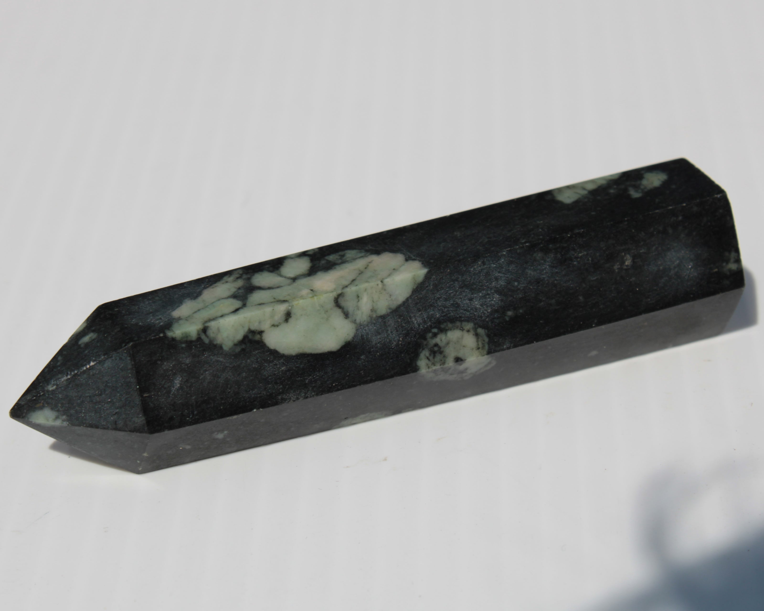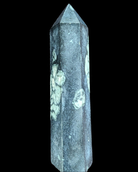 This Chrysanthemum Stone wand weighs 90g. Chrysanthemum Stone is a black stone with white crystal patterns resembling blooming flowers. It is also known as Flower Stone. It is a rare stone consisting of a black or brown matrix with natural inclusions of Calcite, Feldspar, Crandallite, Andalusite, or Celestite. These inclusions are usually white and prominent on a dark matrix, often resembling a Chrysanthemum flower. The matrix can consist of a mixture of Limestone, Dolomite, Porphyry, Clay and Gypsum. Chrysanthemum Stone formed over 290 million years ago with from organic-rich mud on sea floors, metamorphosed through heat and pressure.