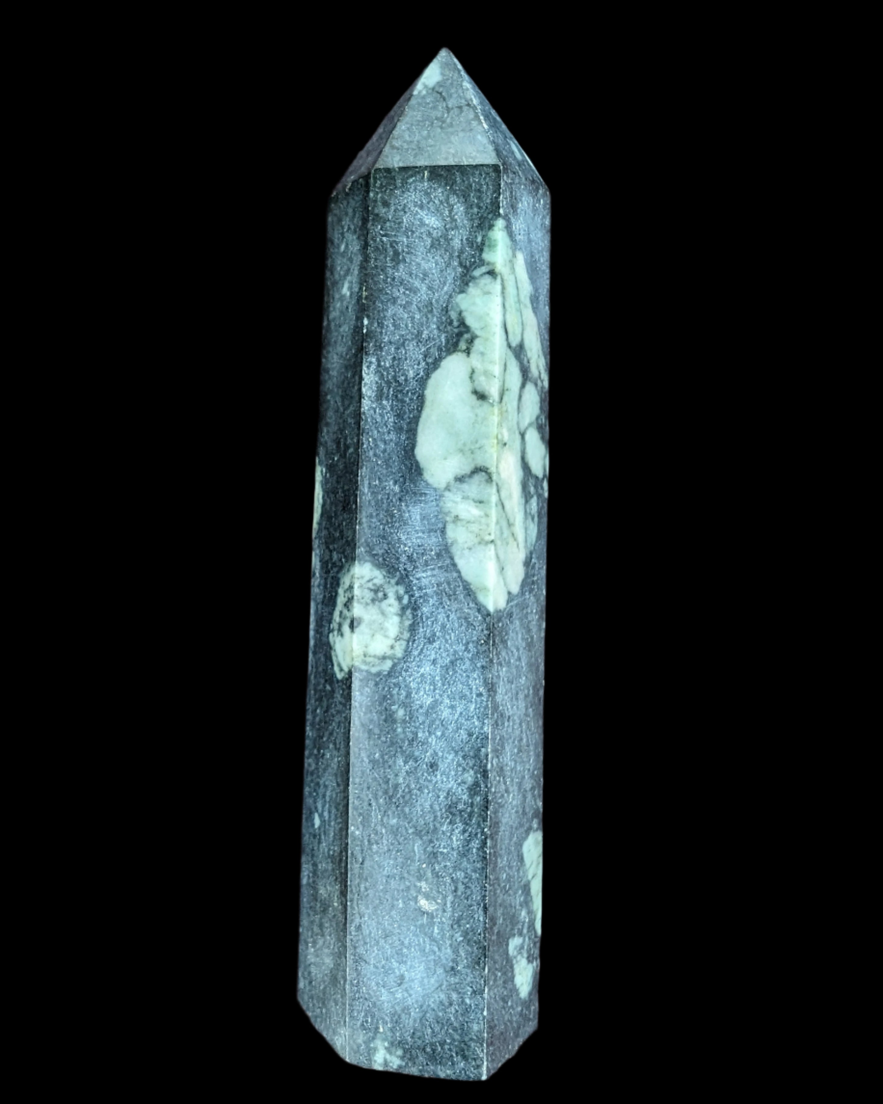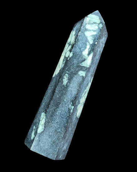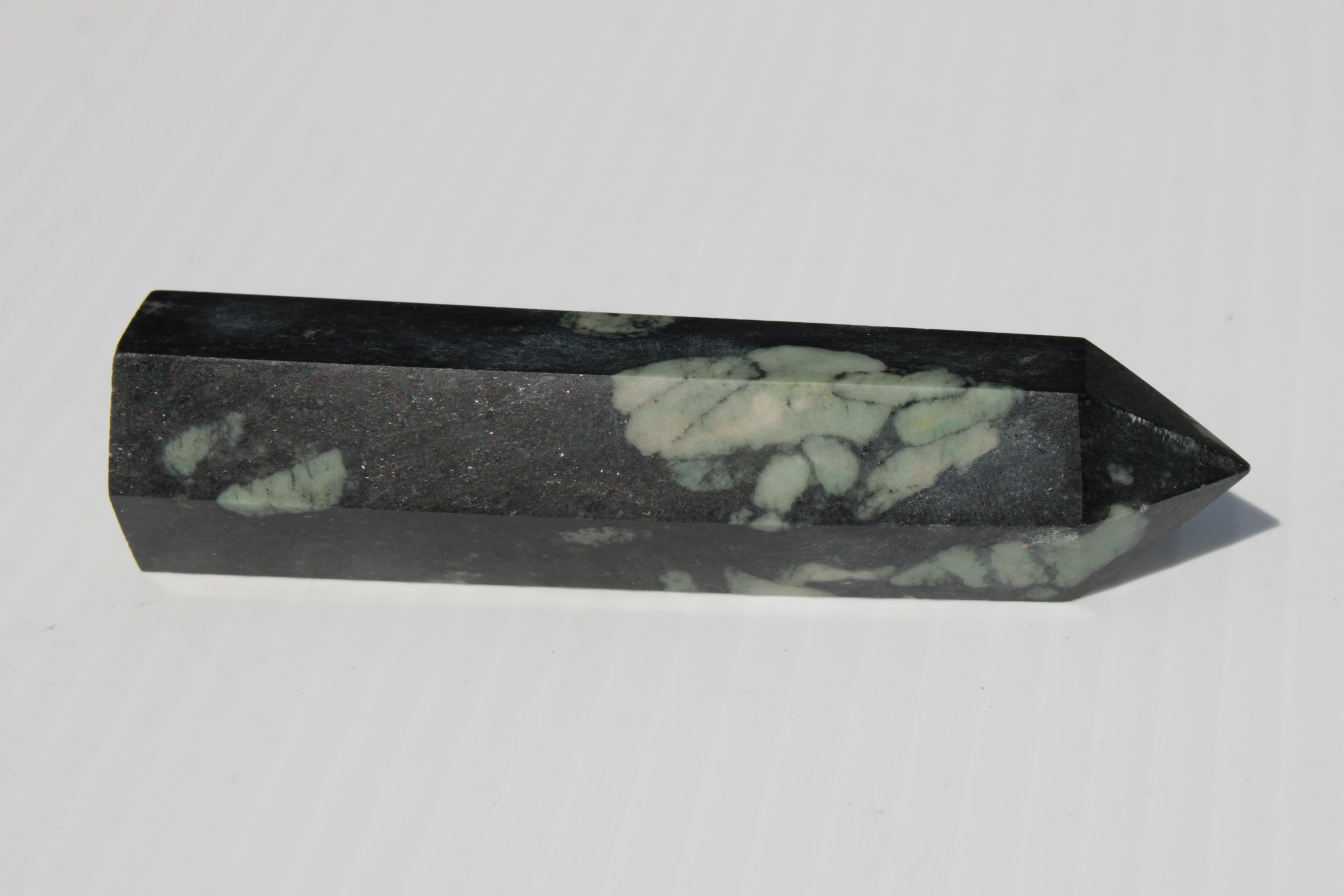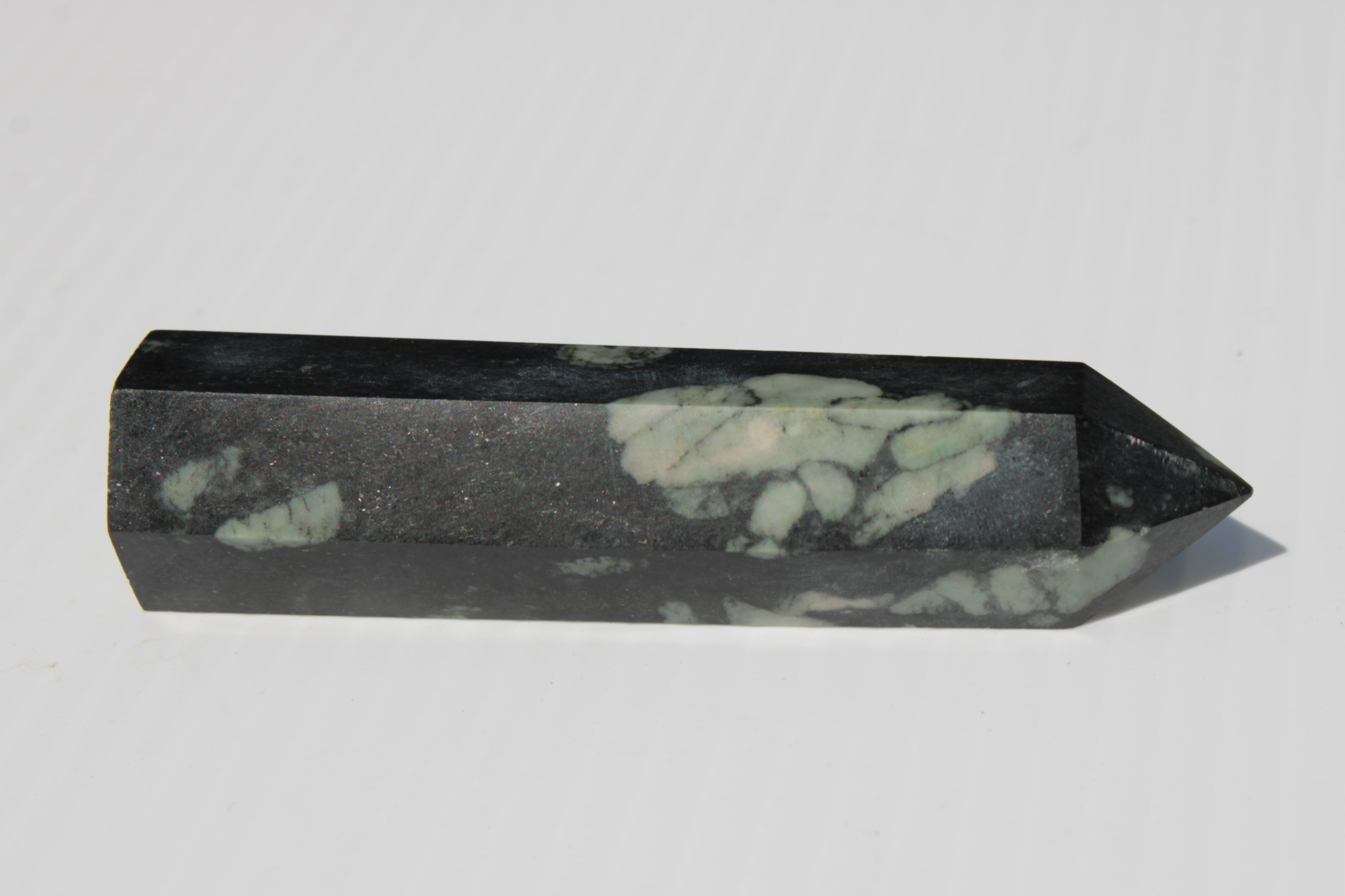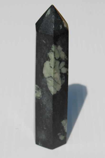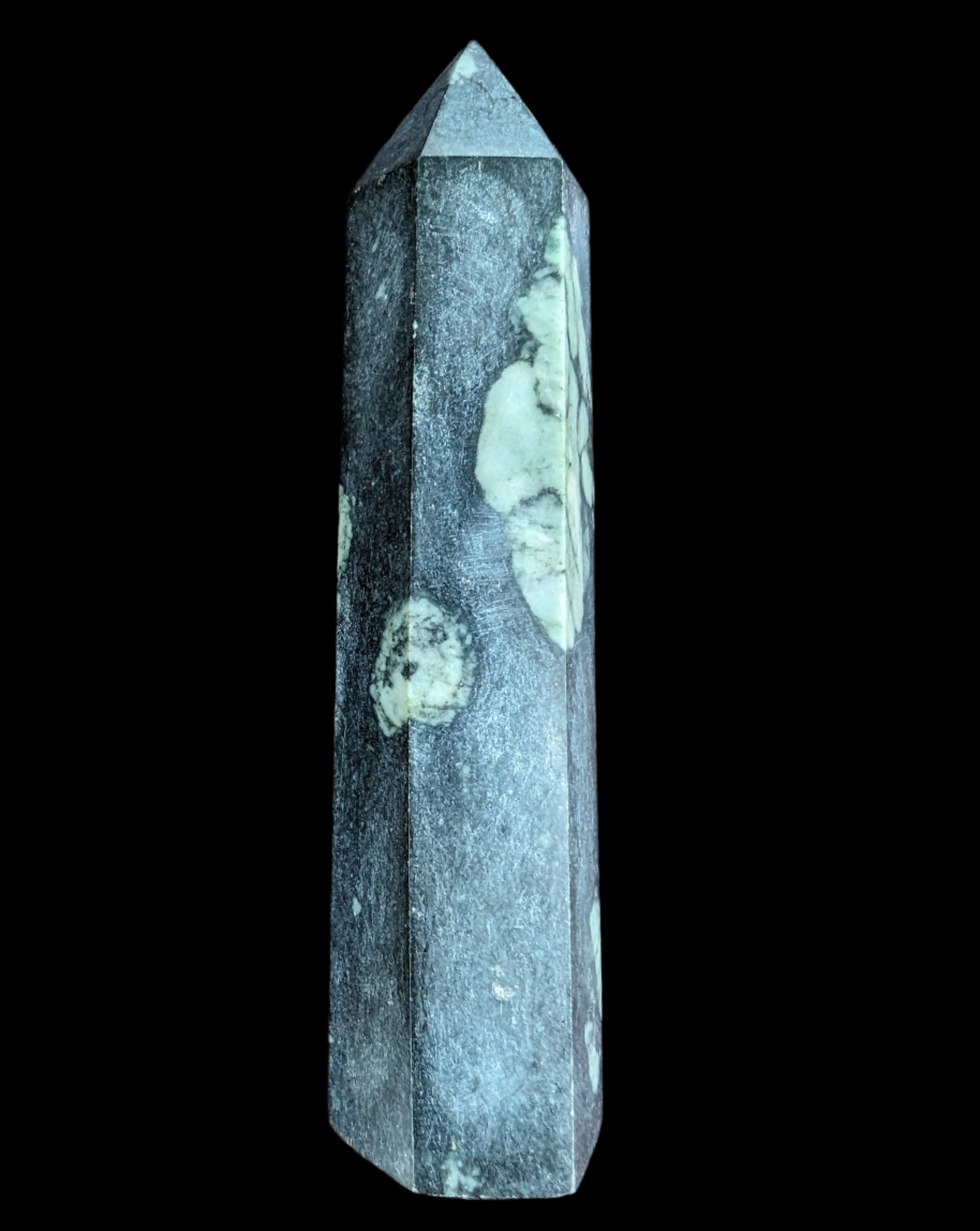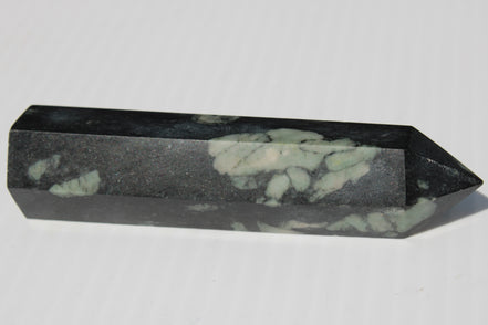 This Chrysanthemum Stone wand weighs 90g. Chrysanthemum Stone is a black stone with white crystal patterns resembling blooming flowers. It is also known as Flower Stone. It is a rare stone consisting of a black or brown matrix with natural inclusions of Calcite, Feldspar, Crandallite, Andalusite, or Celestite. These inclusions are usually white and prominent on a dark matrix, often resembling a Chrysanthemum flower. The matrix can consist of a mixture of Limestone, Dolomite, Porphyry, Clay and Gypsum. Chrysanthemum Stone formed over 290 million years ago with from organic-rich mud on sea floors, metamorphosed through heat and pressure.