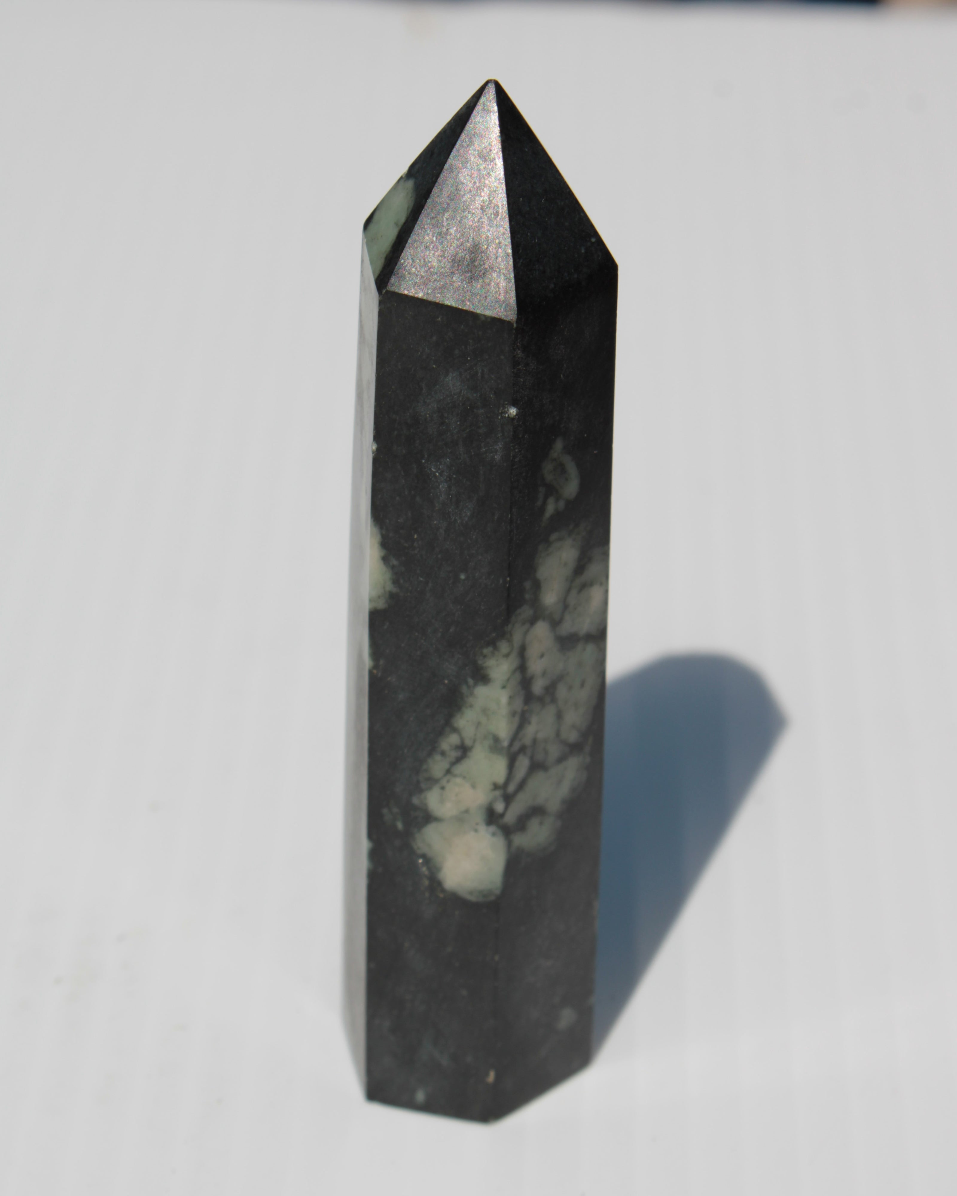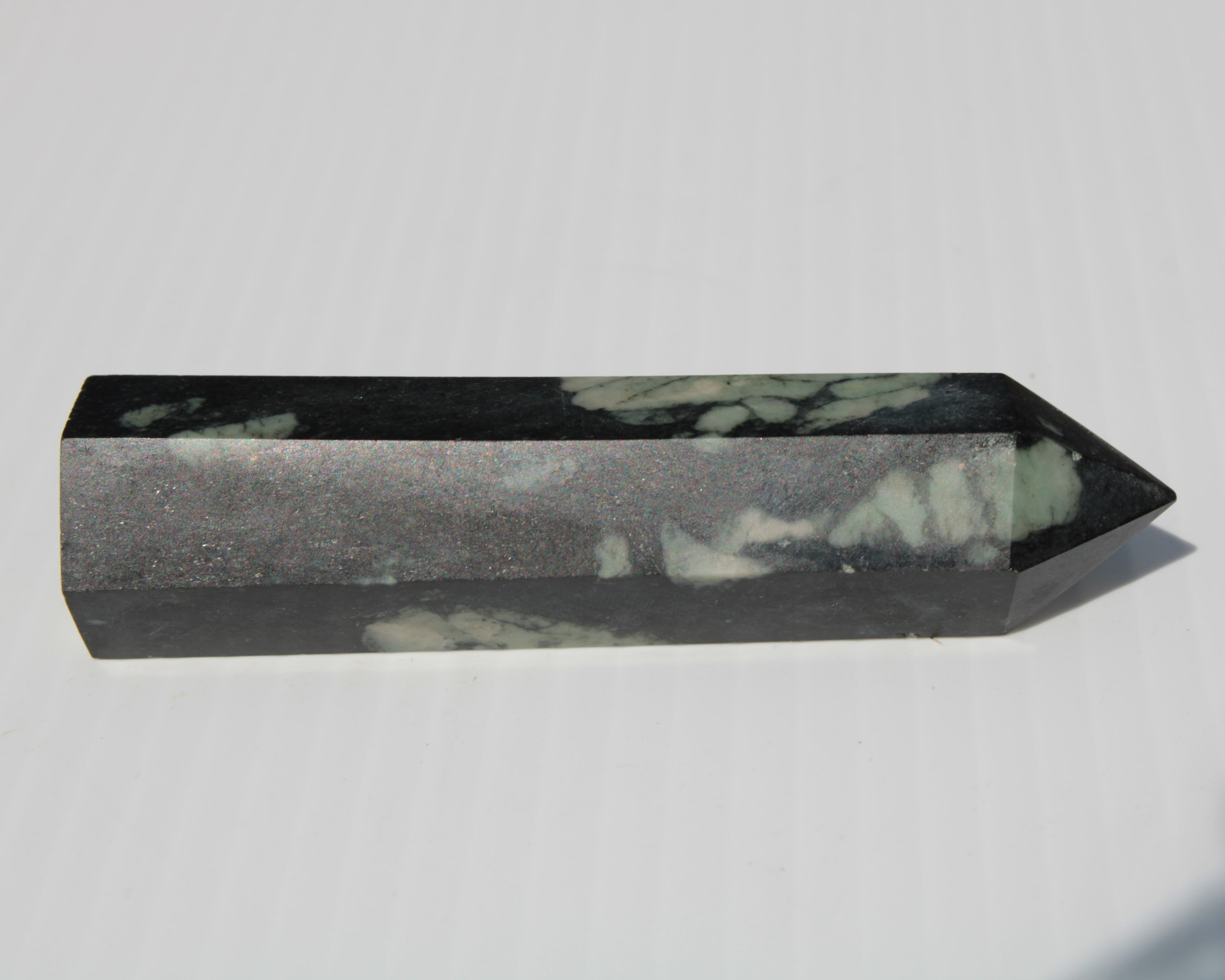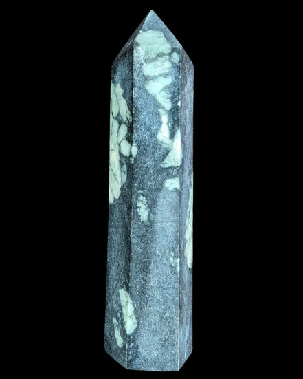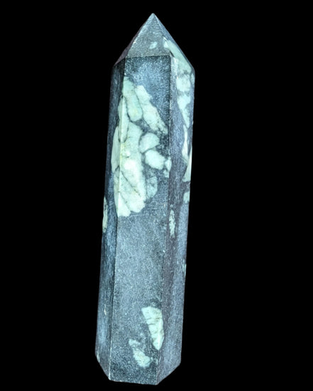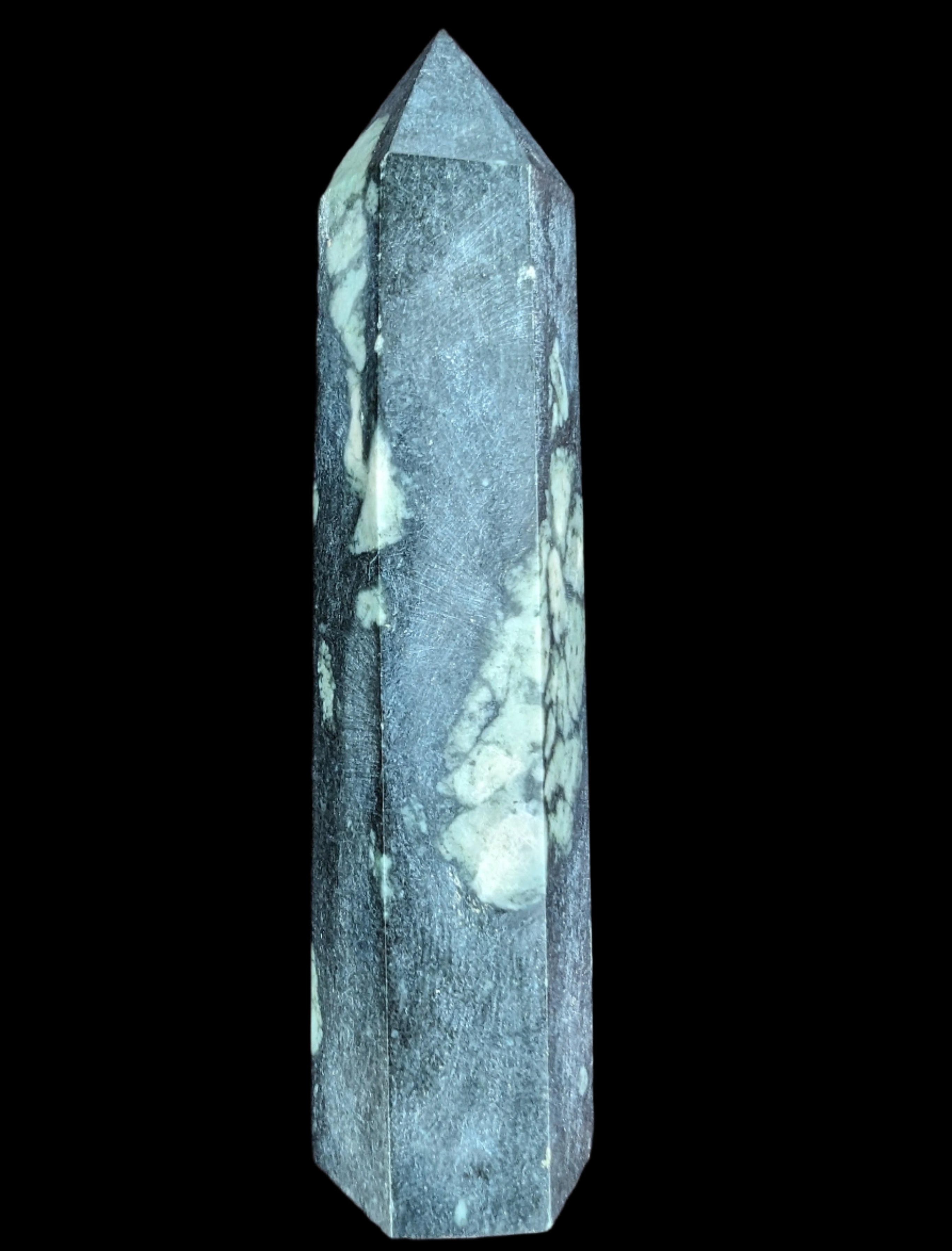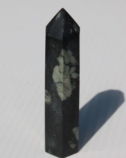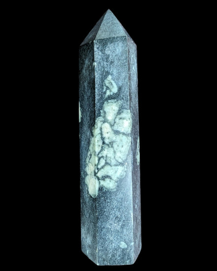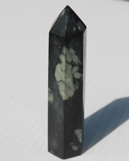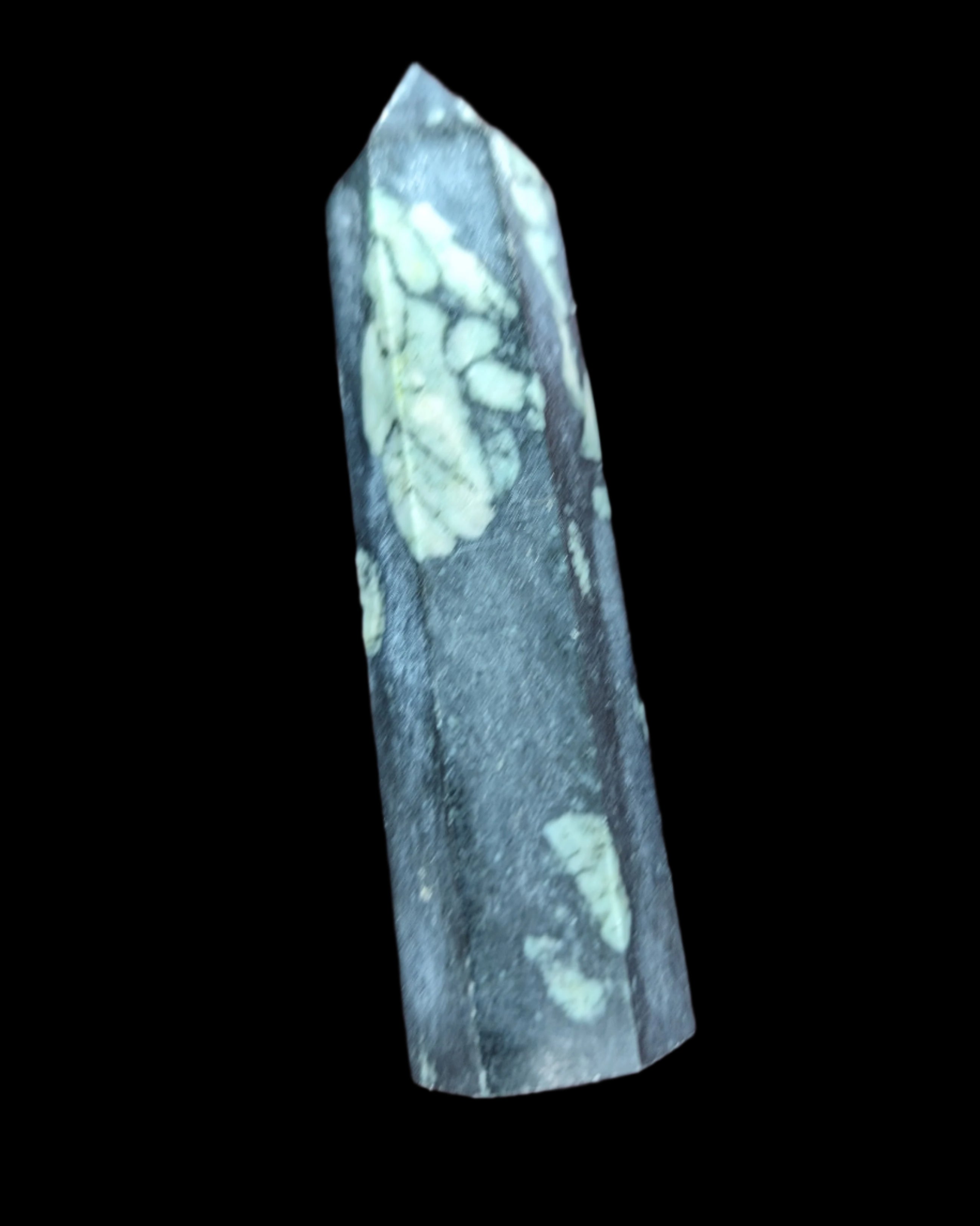This Chrysanthemum Stone wand weighs 90g. Chrysanthemum Stone is a black stone with white crystal patterns resembling blooming flowers. It is also known as Flower Stone. It is a rare stone consisting of a black or brown matrix with natural inclusions of Calcite, Feldspar, Crandallite, Andalusite, or Celestite. These inclusions are usually white and prominent on a dark matrix, often resembling a Chrysanthemum flower. The matrix can consist of a mixture of Limestone, Dolomite, Porphyry, Clay and Gypsum. Chrysanthemum Stone formed over 290 million years ago with from organic-rich mud on sea floors, metamorphosed through heat and pressure.