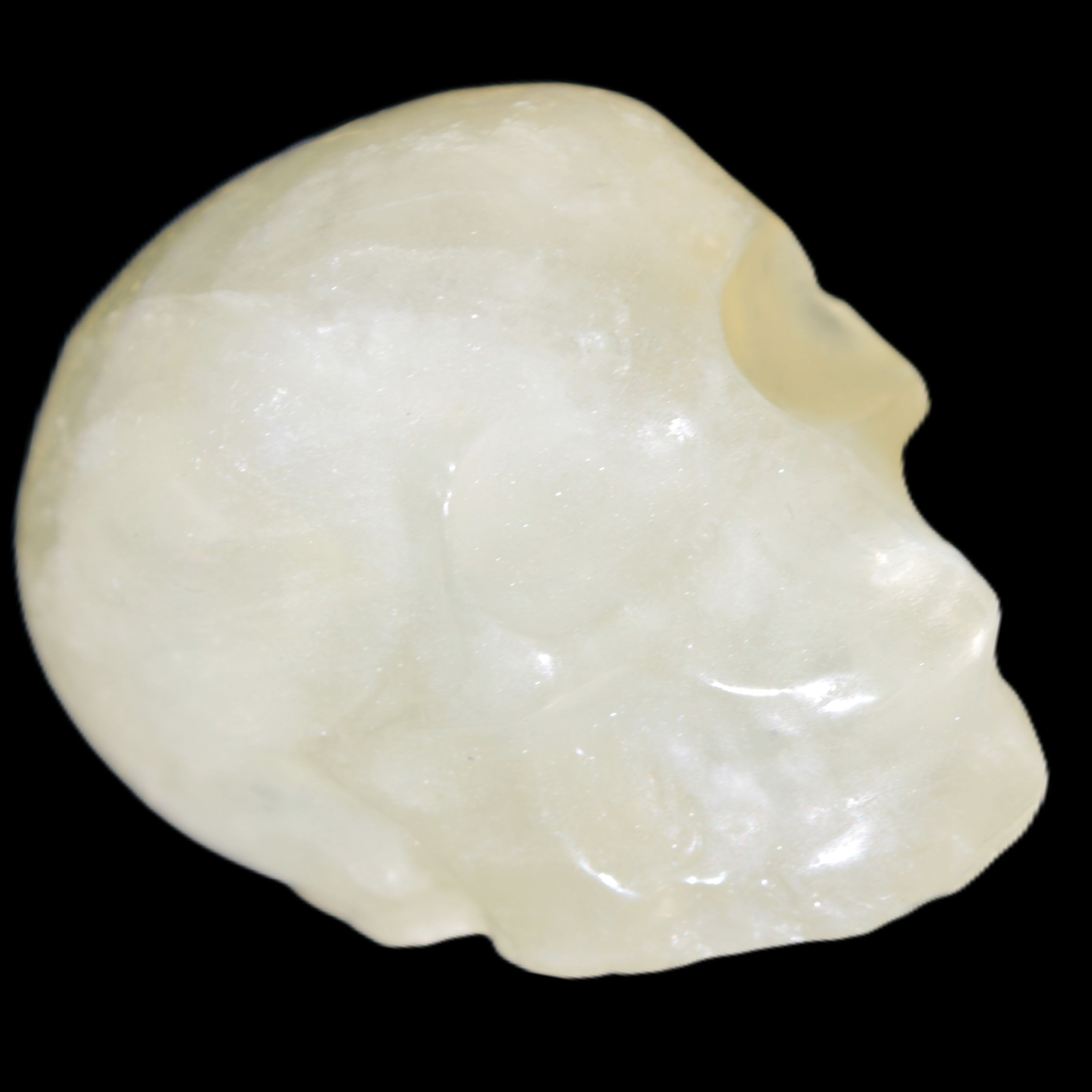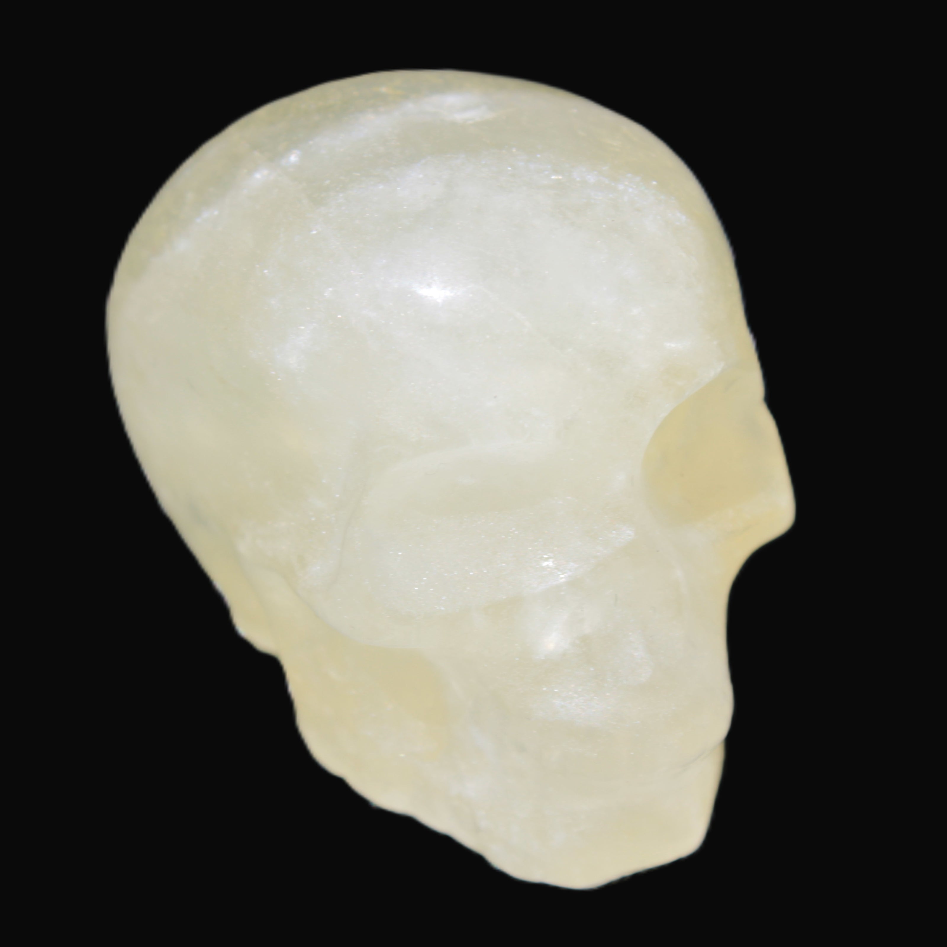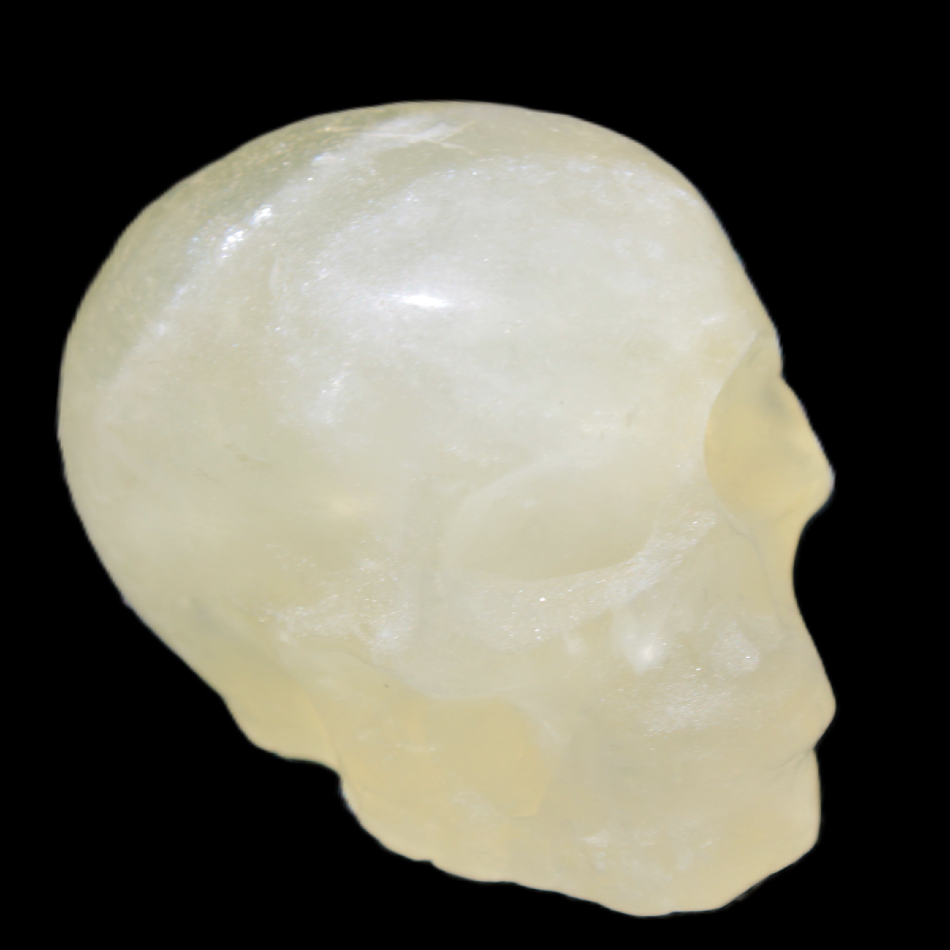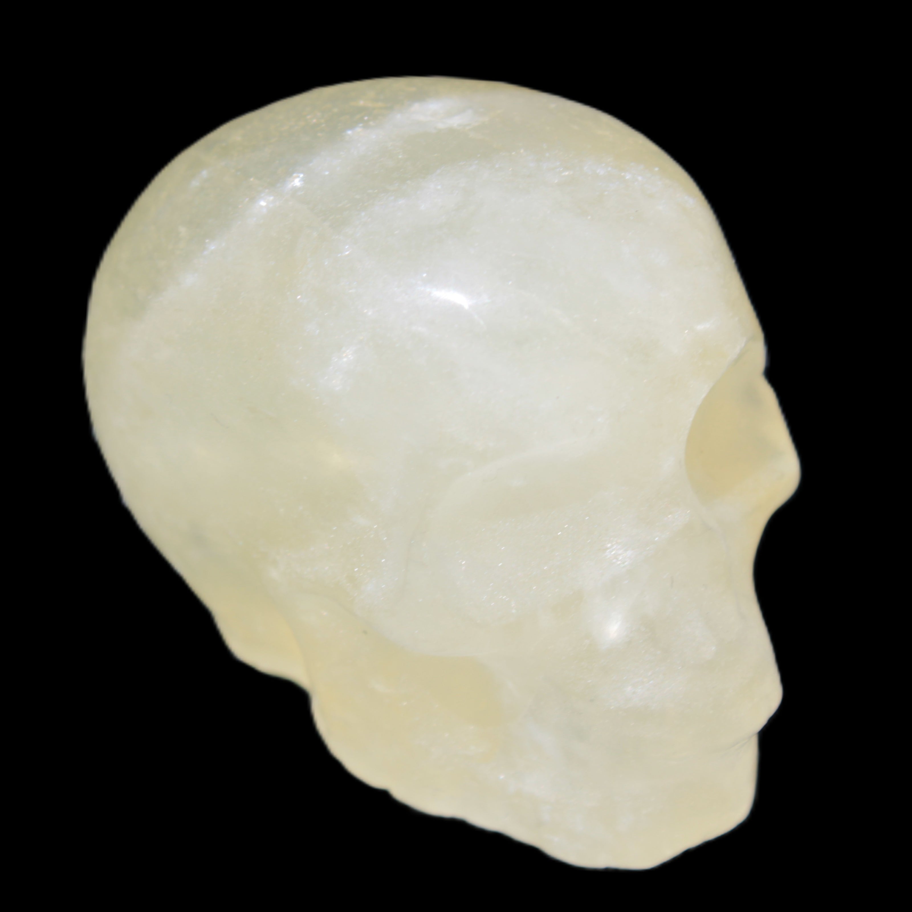 This Citrine skull is 32mm wide, 48mm deep and stands 35mm tall. It weighs 73g. Citrine is a yellow to golden variety of quartz that is strongly associated with joy, abundance, and personal power. It is often used to attract wealth and clear stagnant energies.