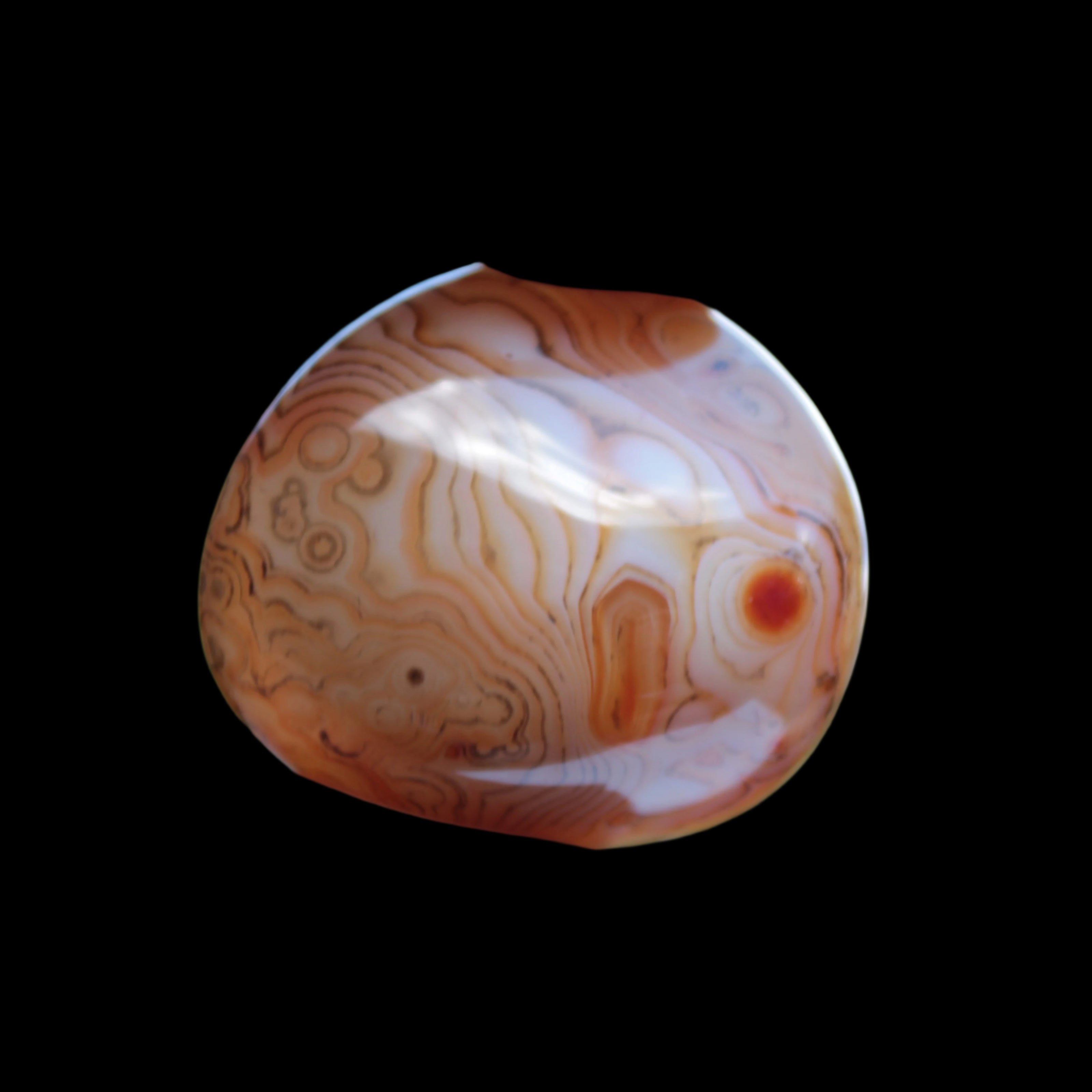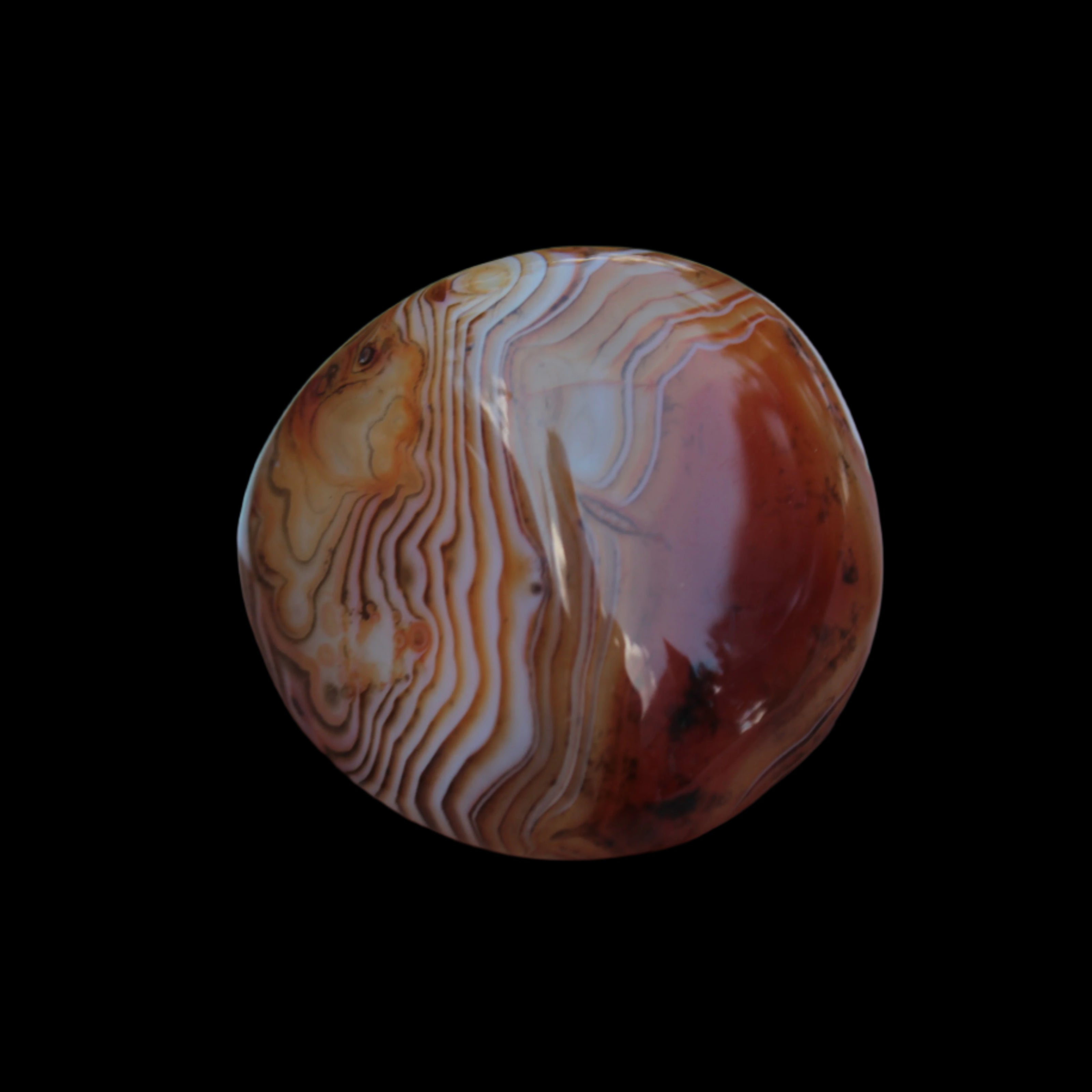 This Crazy Silk Banded Agate from Madagascar weighs 35g. The original Crazy Lace Agate is found only in Mexico. The Crazy Lace Silk Banded Agate is found only on the West Central Coast of Madagascar. Like all agates, these vibrate to a slower frequency than other microcrystalline quartz. This results from the multiplicity of tight banding, layers, and eyes within the agates. These beautiful features teach the importance of slowing down and being at peace with a slower pace. The Madagascar Agate has pronounced ability to encourage positive thoughts, allowing you to deal with negative thinking. These agates have an instant soothing feel to them.