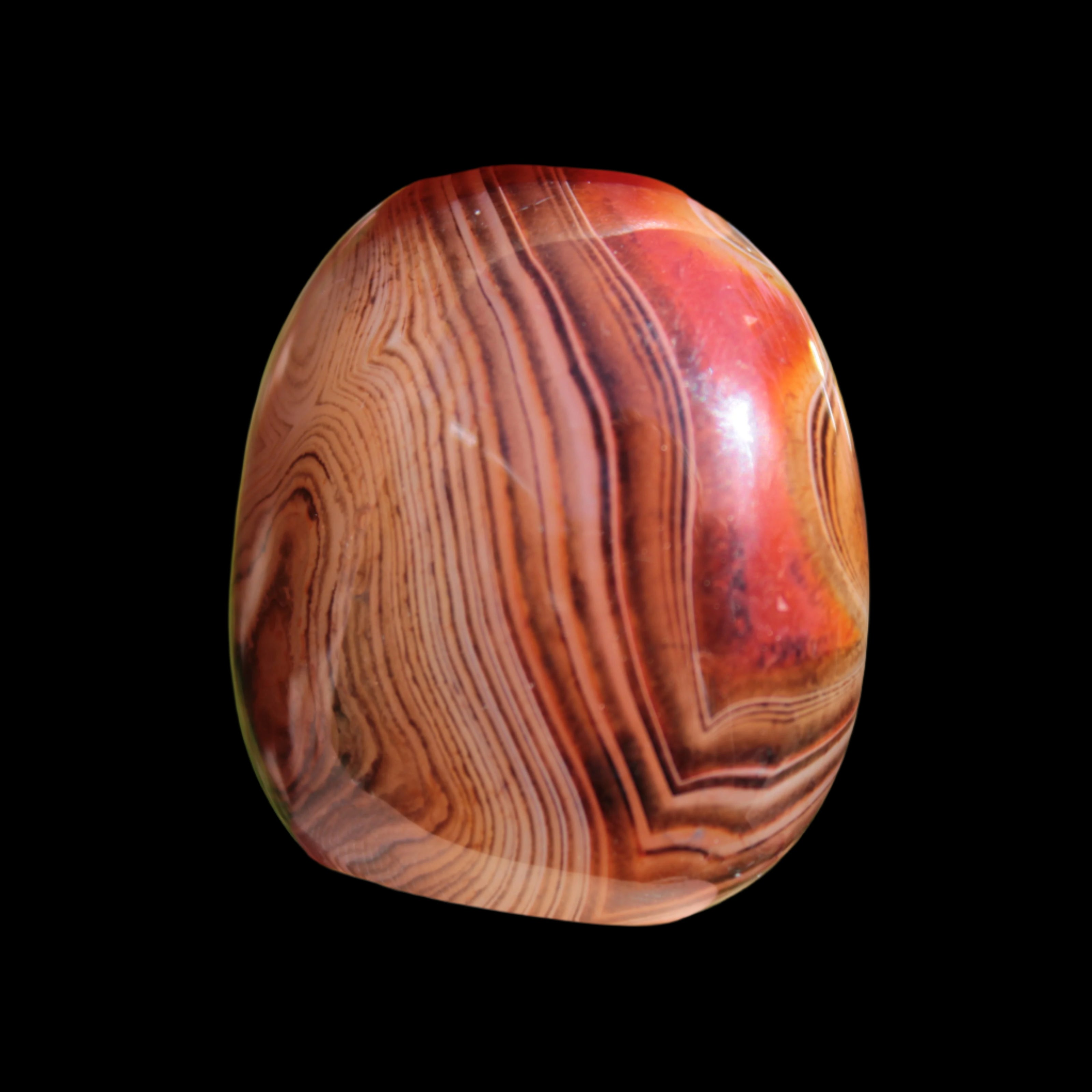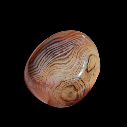 This Crazy Silk Banded Agate from Madagascar weighs 43g. The original Crazy Lace Agate is found only in Mexico. The Crazy Lace Silk Banded Agate is found only on the West Central Coast of Madagascar. Crazy Lace Agate features swirling patterns of cream, brown, red, and yellow. It is uplifting, protective, and encourages mental agility and balance.