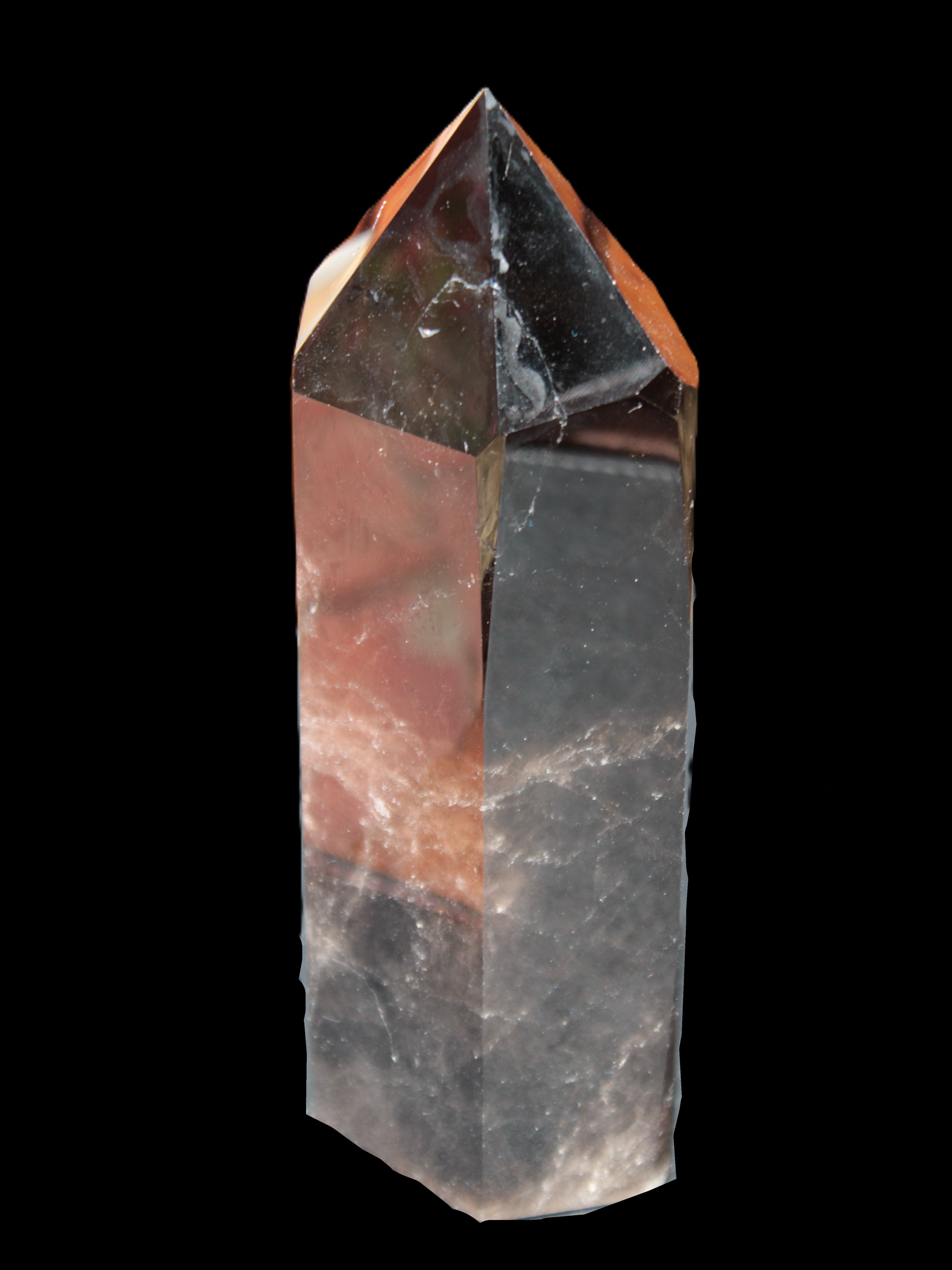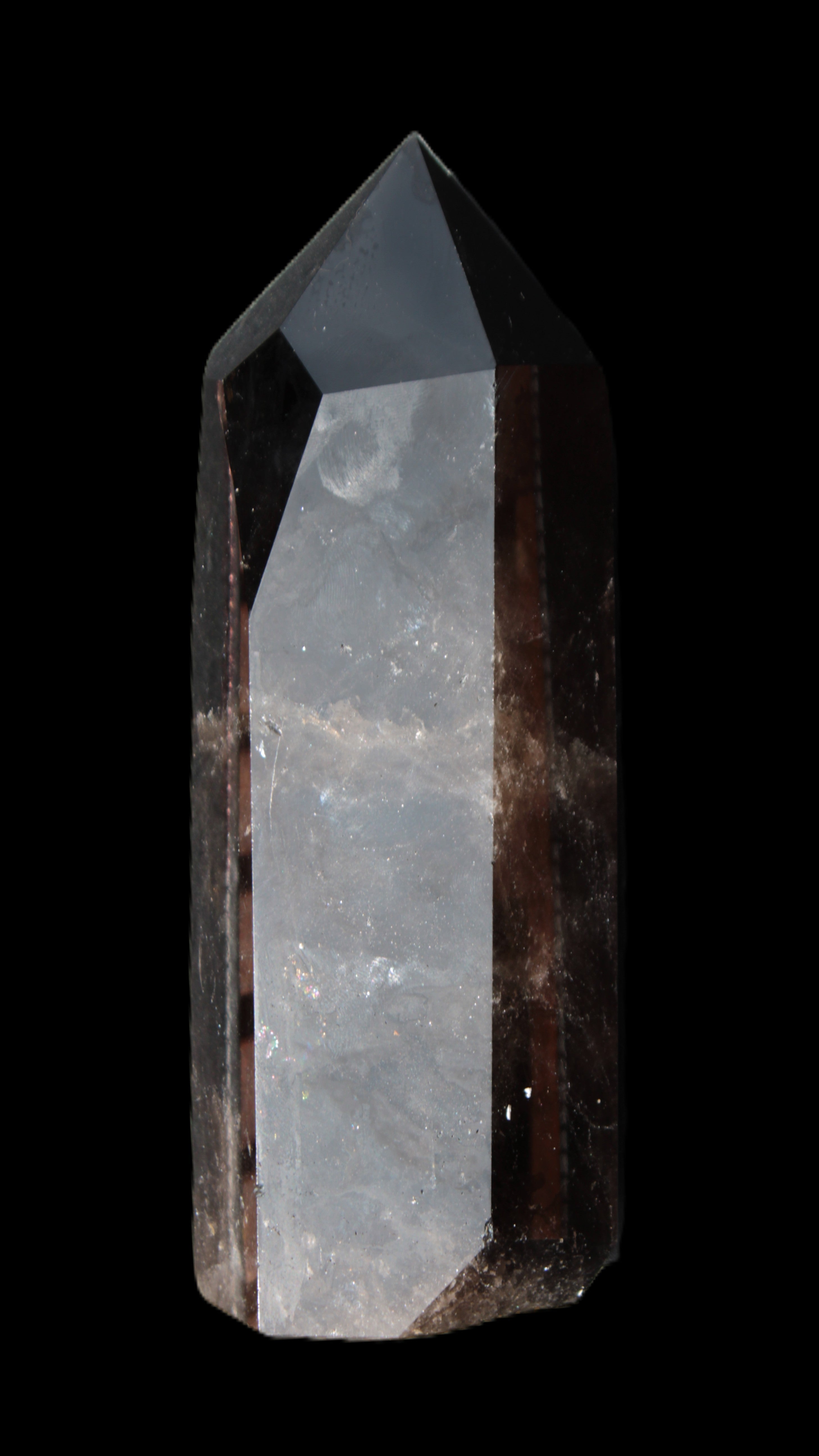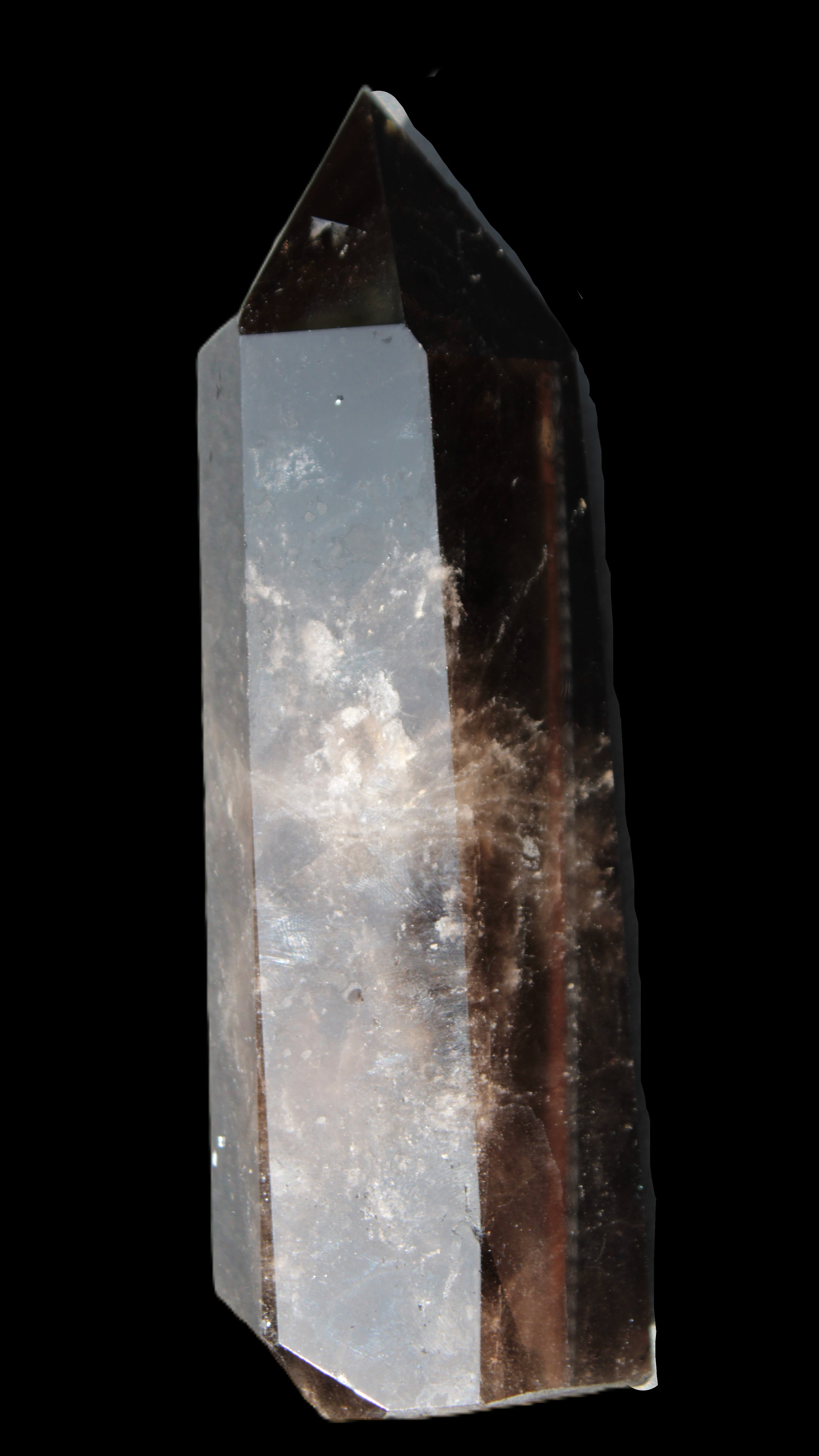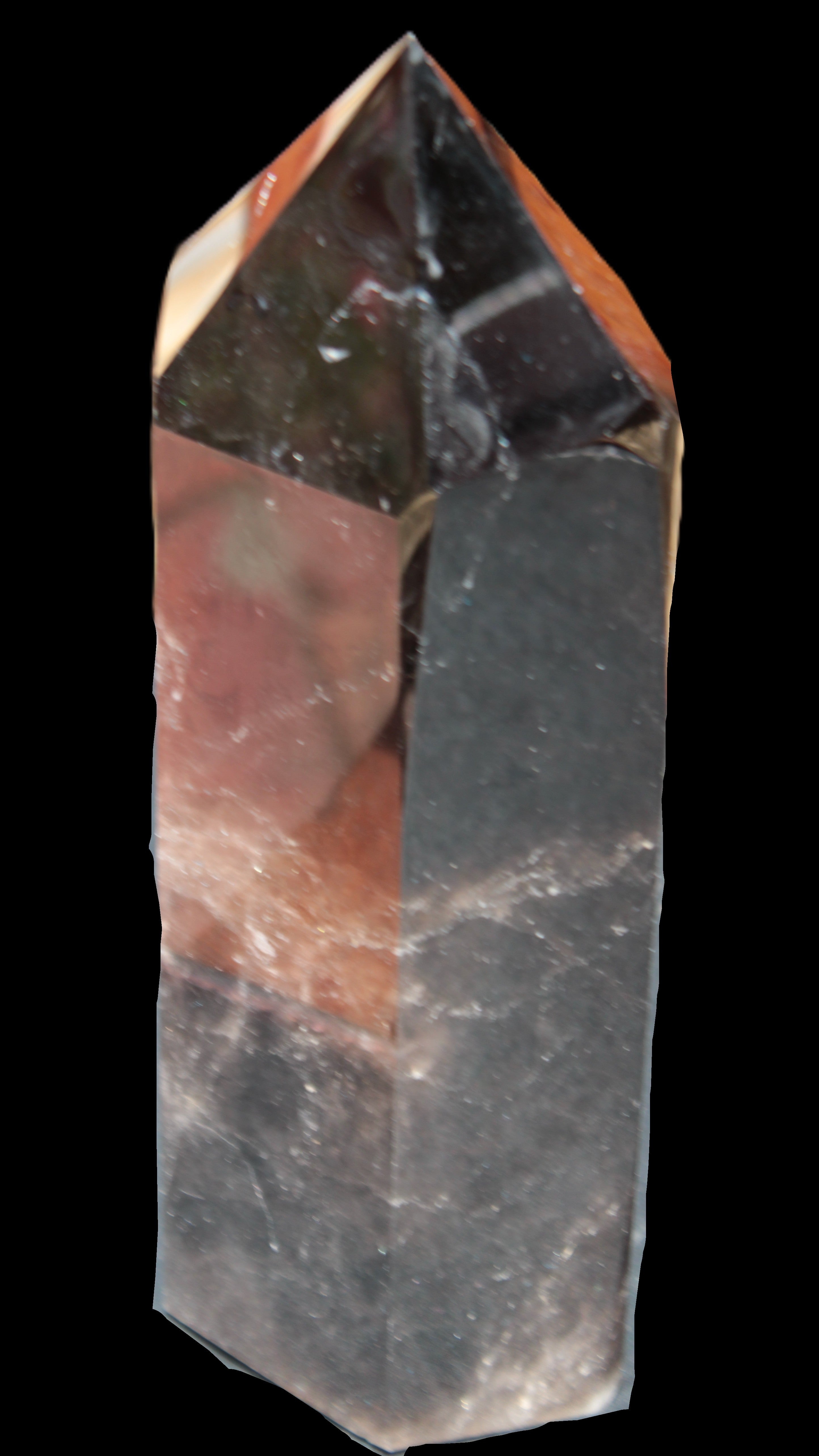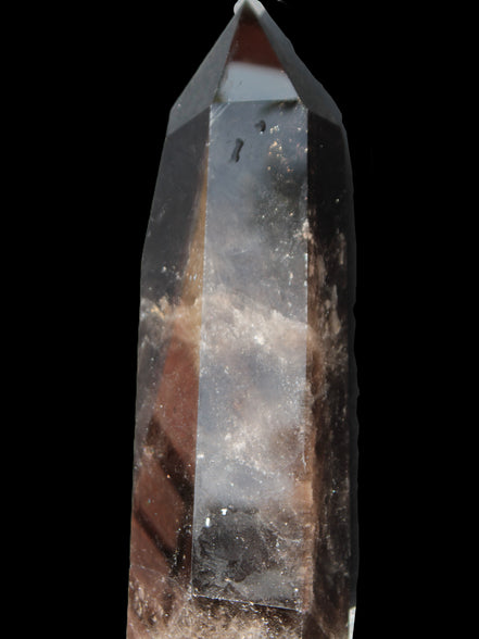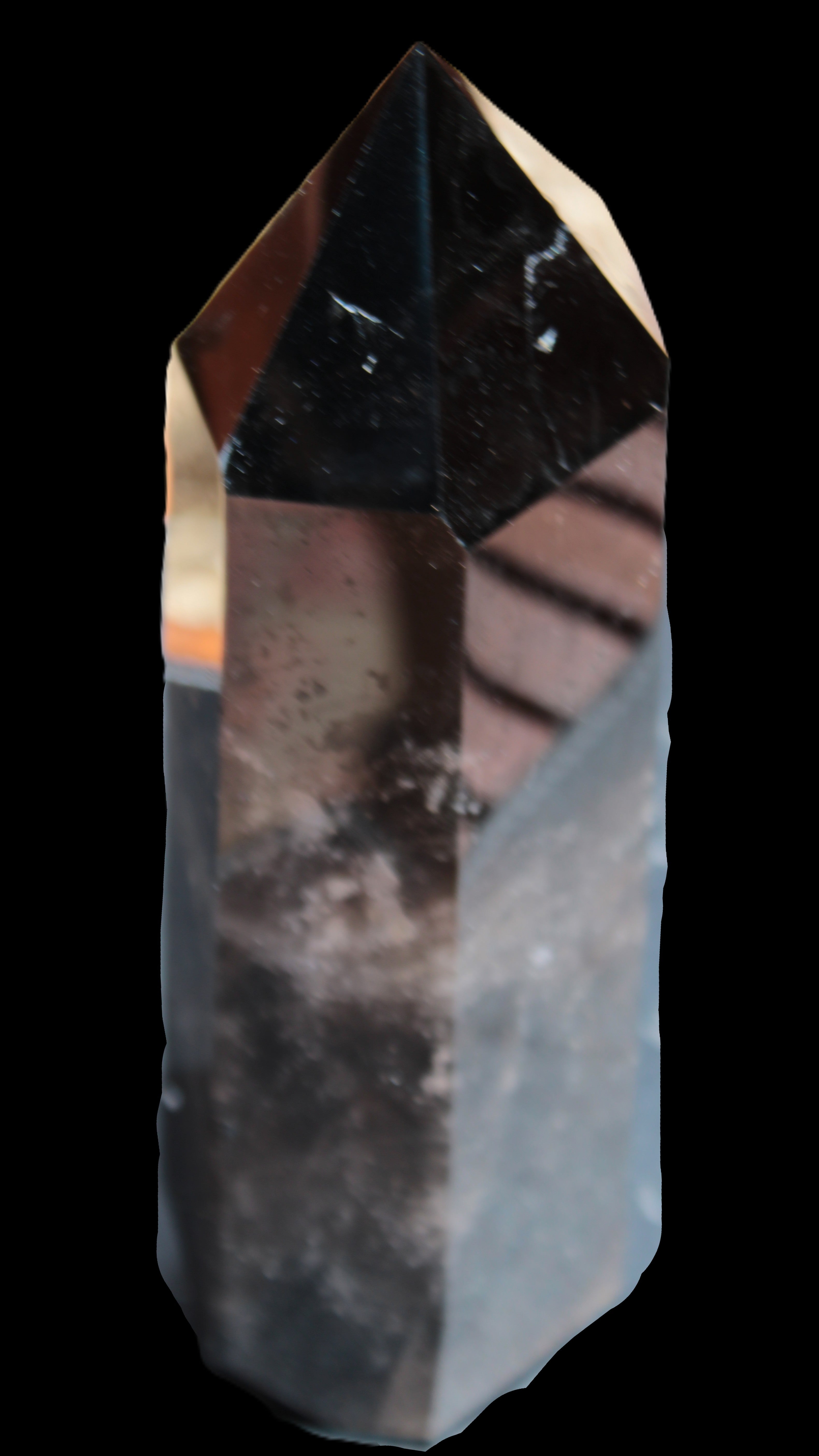 This large Dark Smoky Quartz hexagonal tower 226*70mm weighs 1883g. The natural trigonal crystal form of Smoky Quartz has been sympathetically enhanced through shaping and polishing. It has many lovely features, including rainbows in sunlight and internal reflections.
