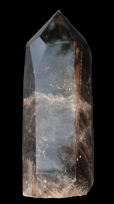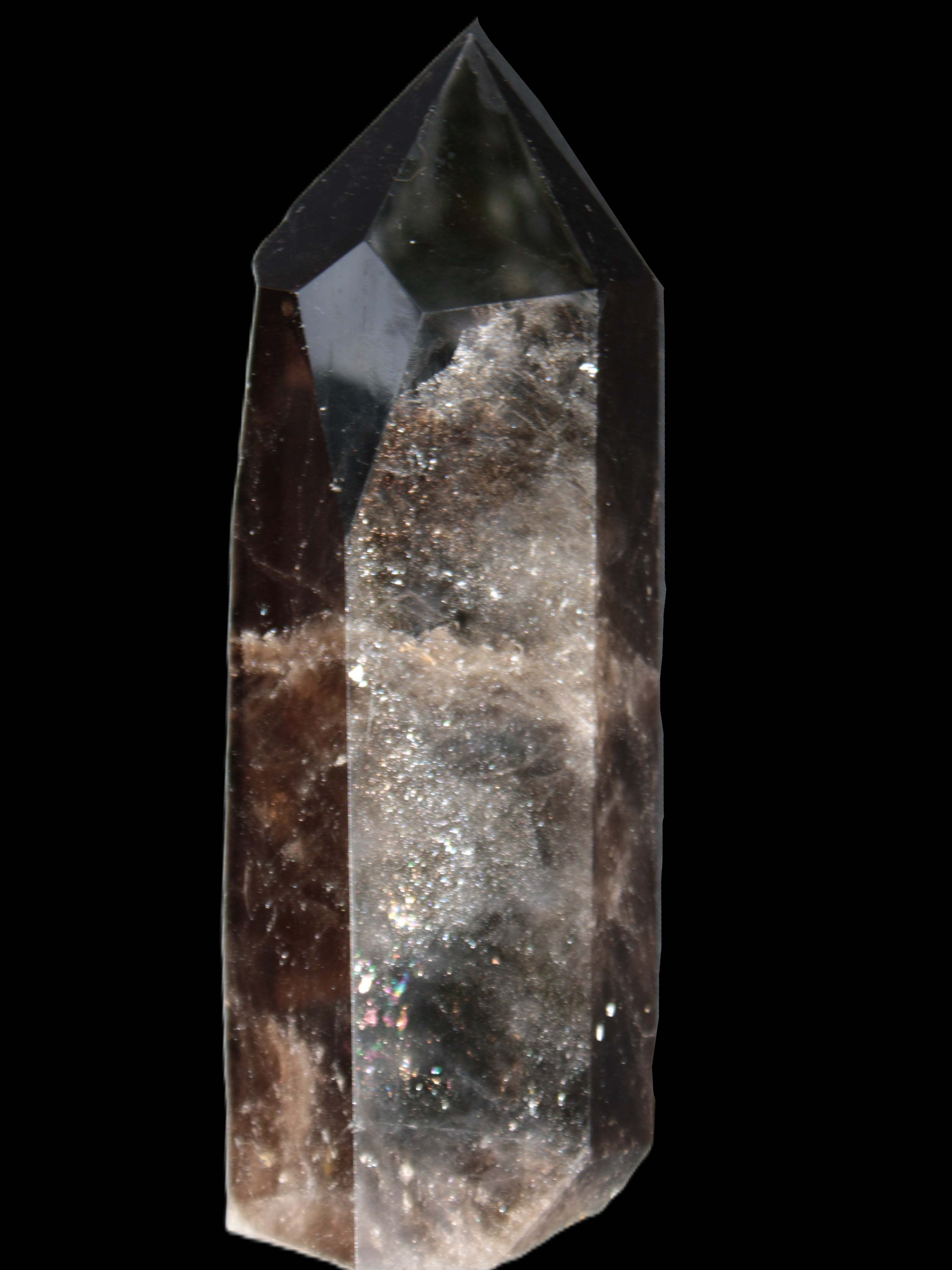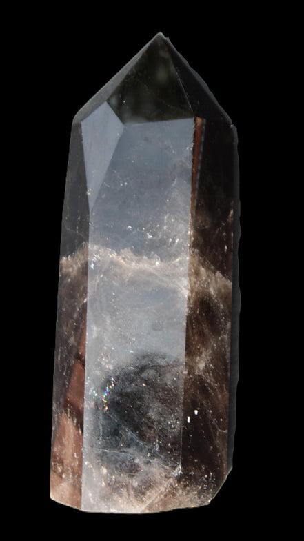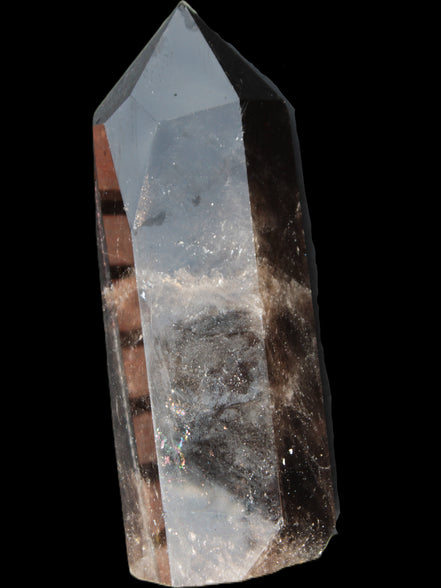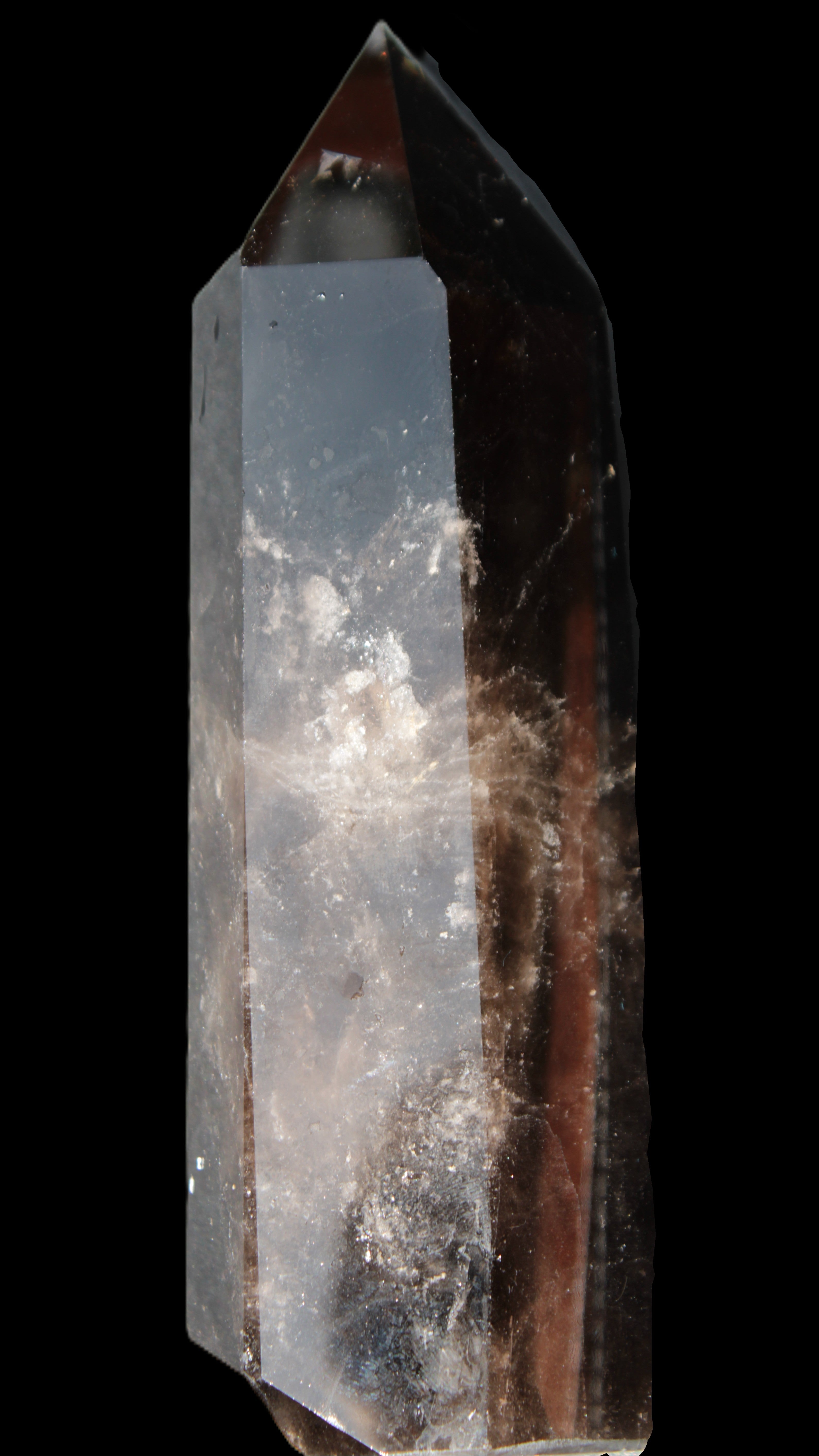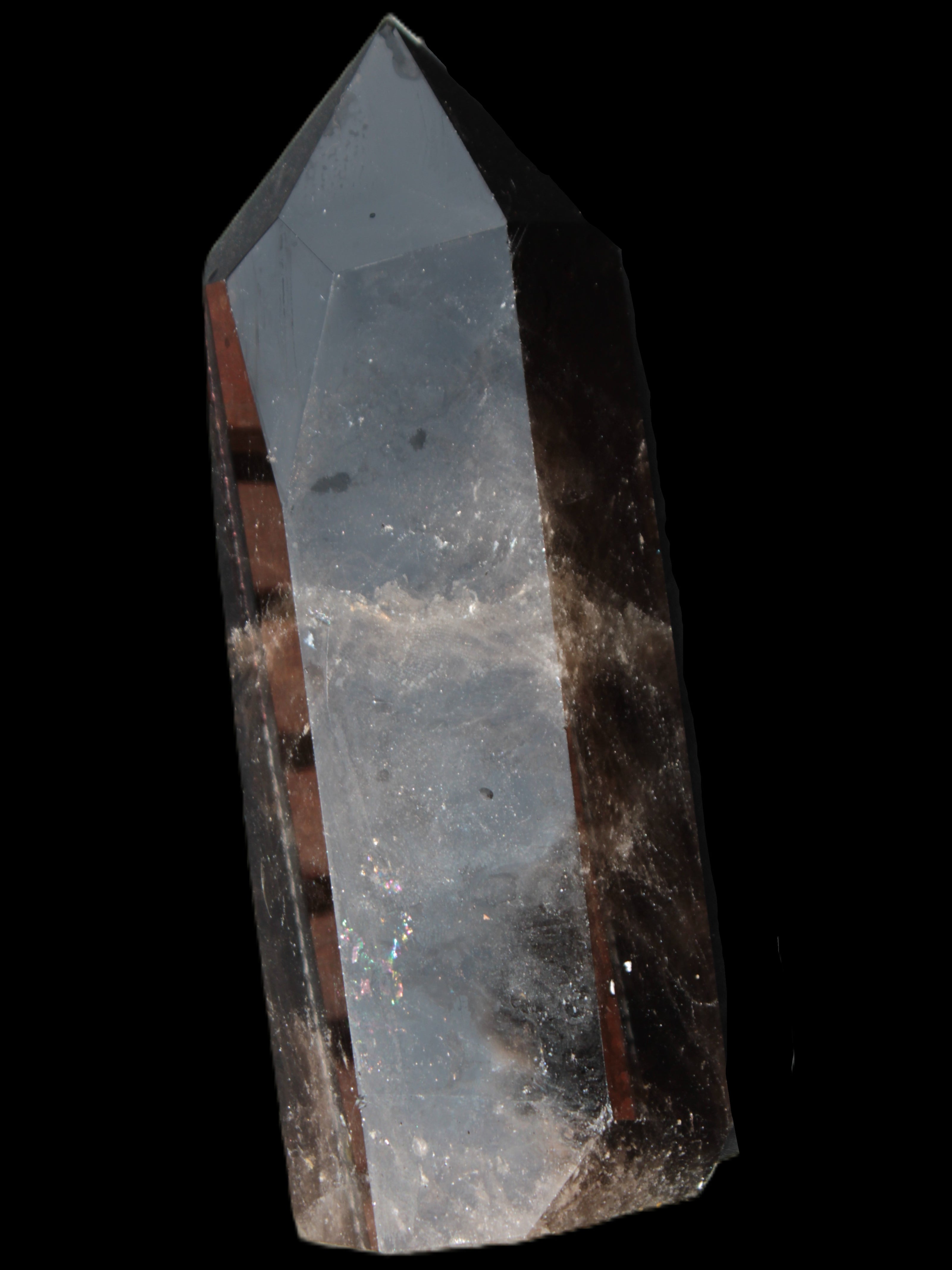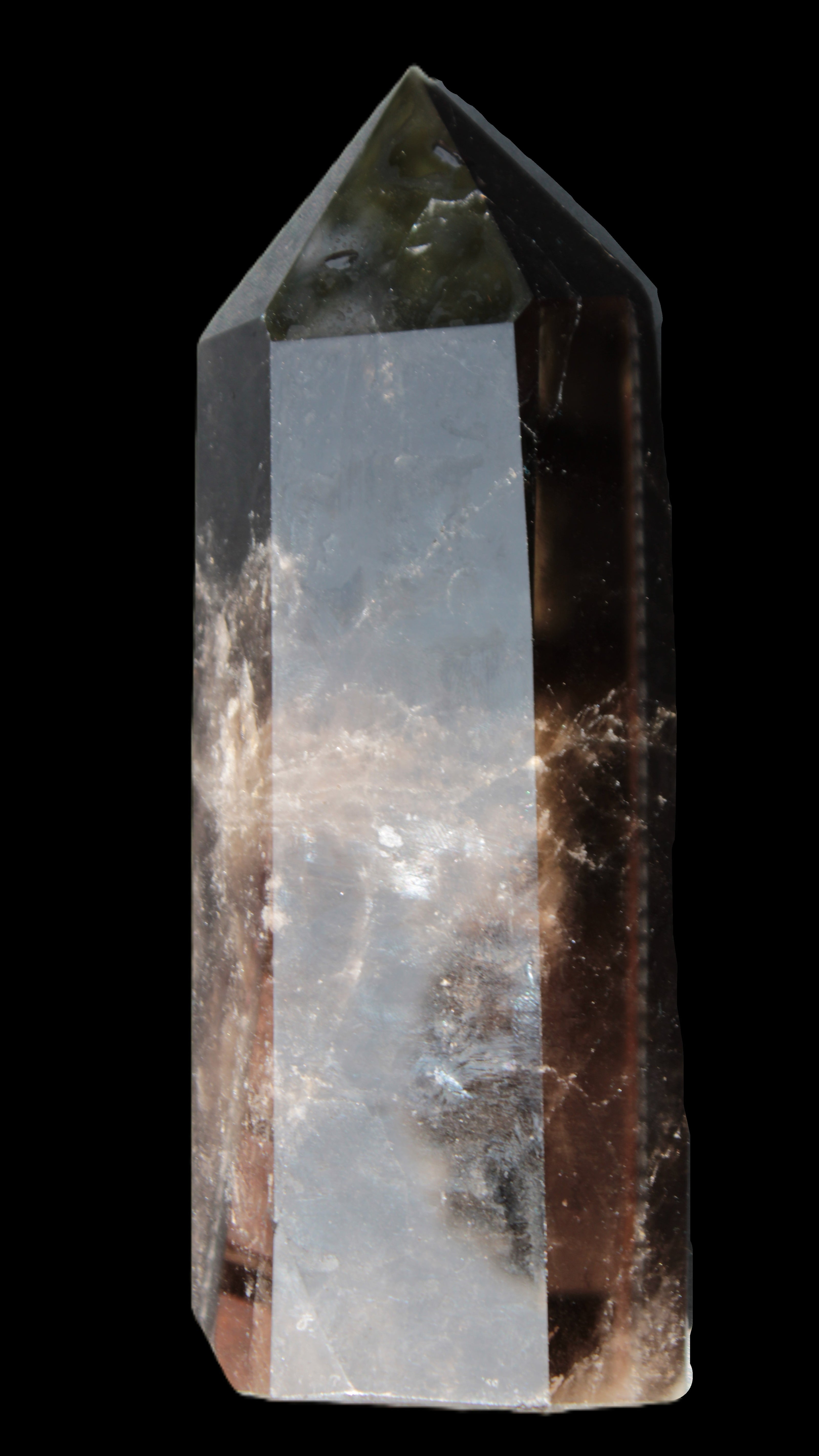 This large Dark Smoky Quartz hexagonal tower 226*70mm weighs 1883g. The natural trigonal crystal form of Smoky Quartz has been sympathetically enhanced through shaping and polishing. It has many lovely features, including rainbows in sunlight and internal reflections.