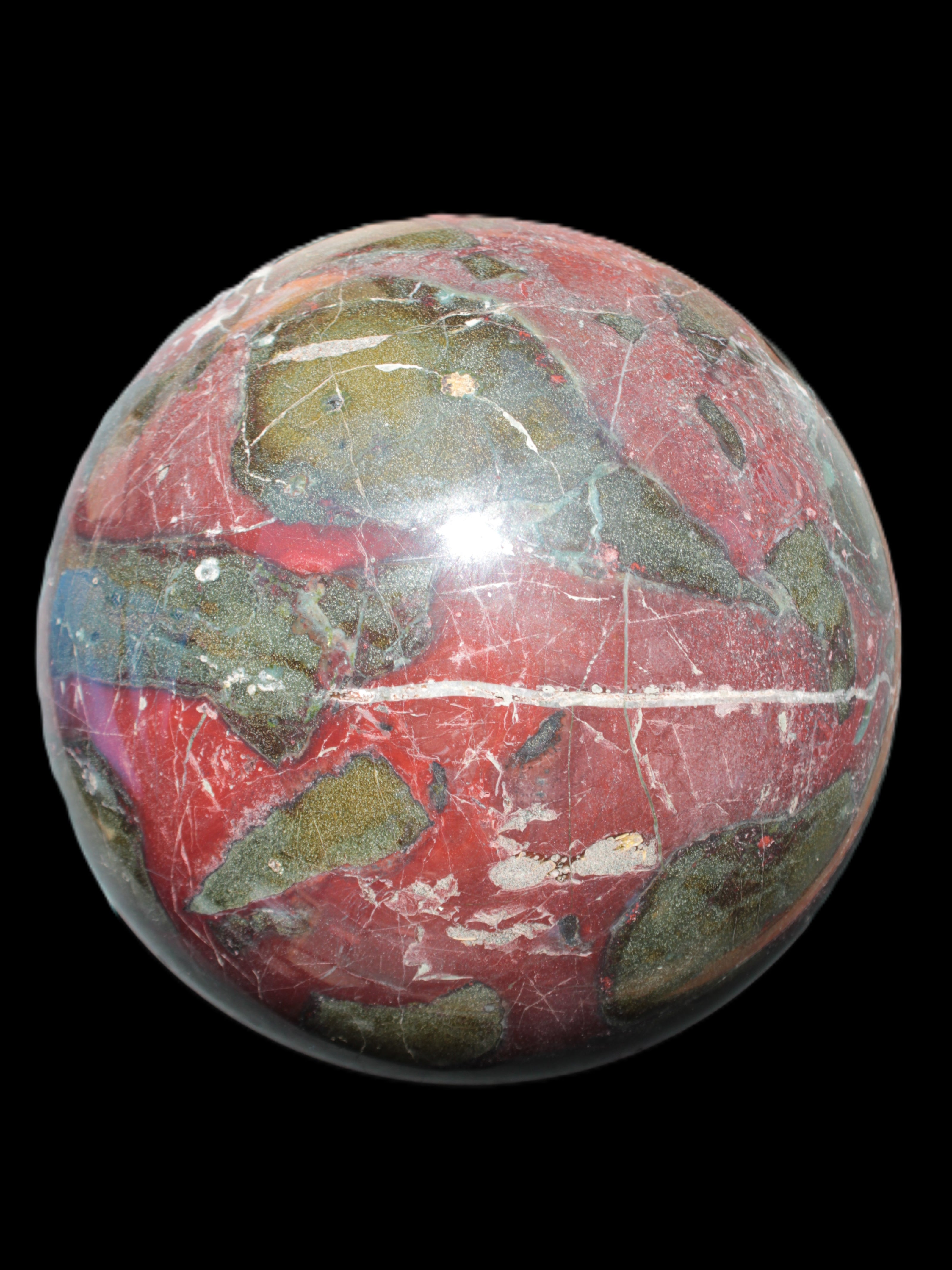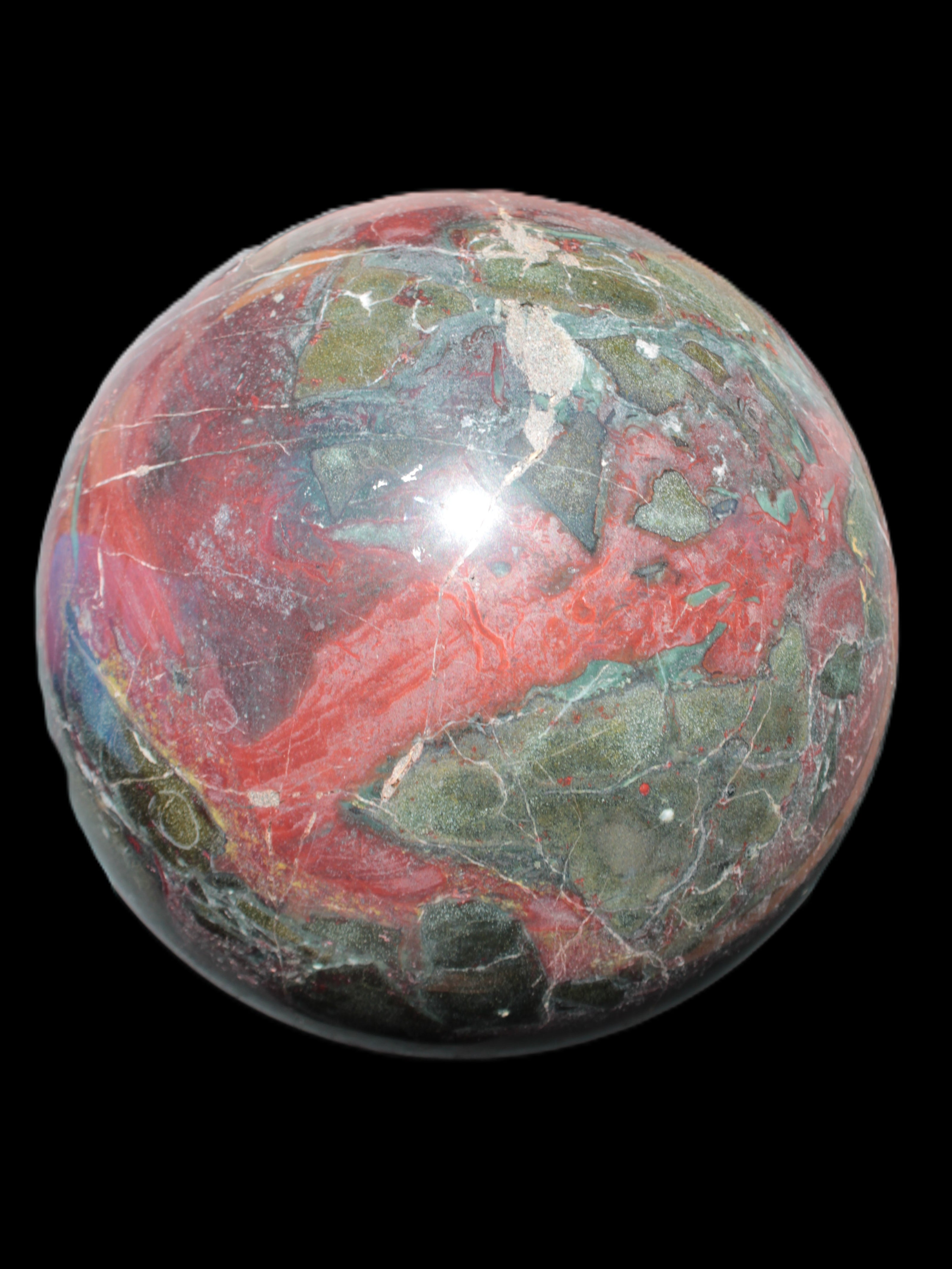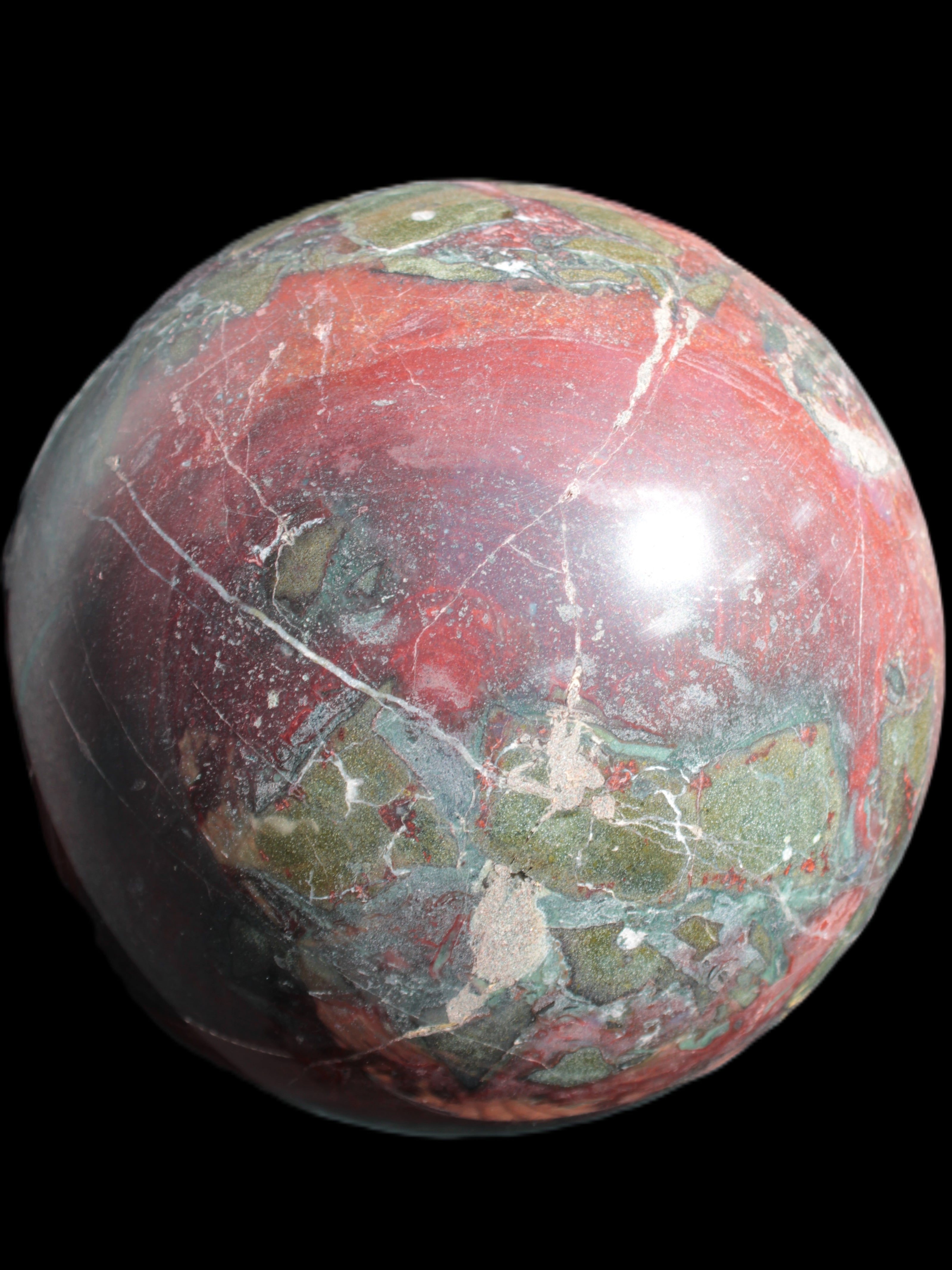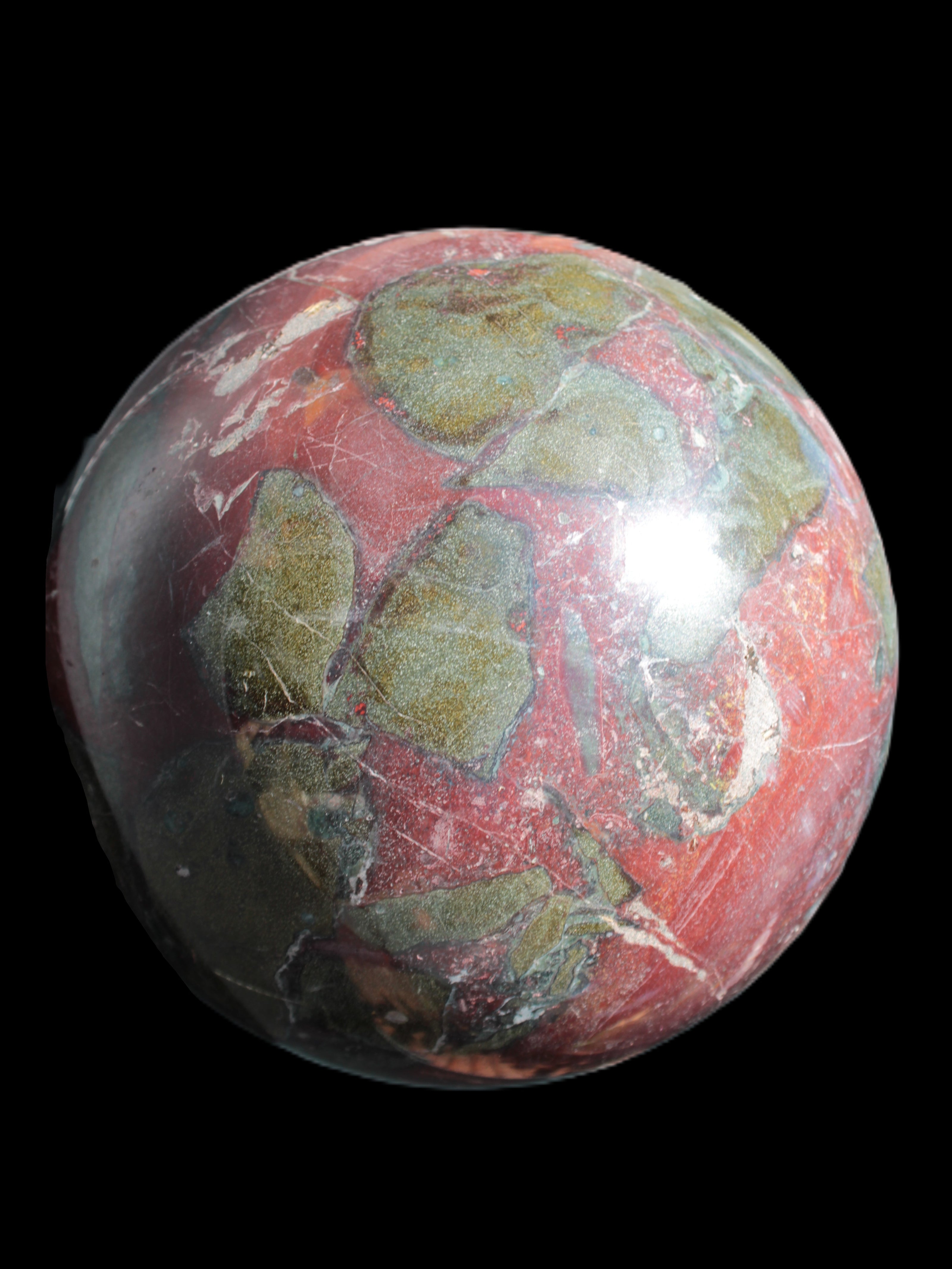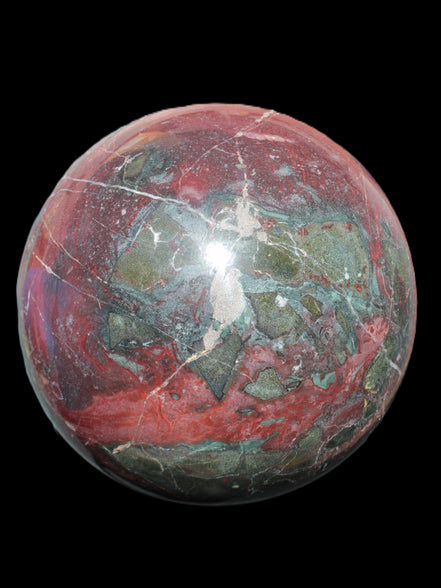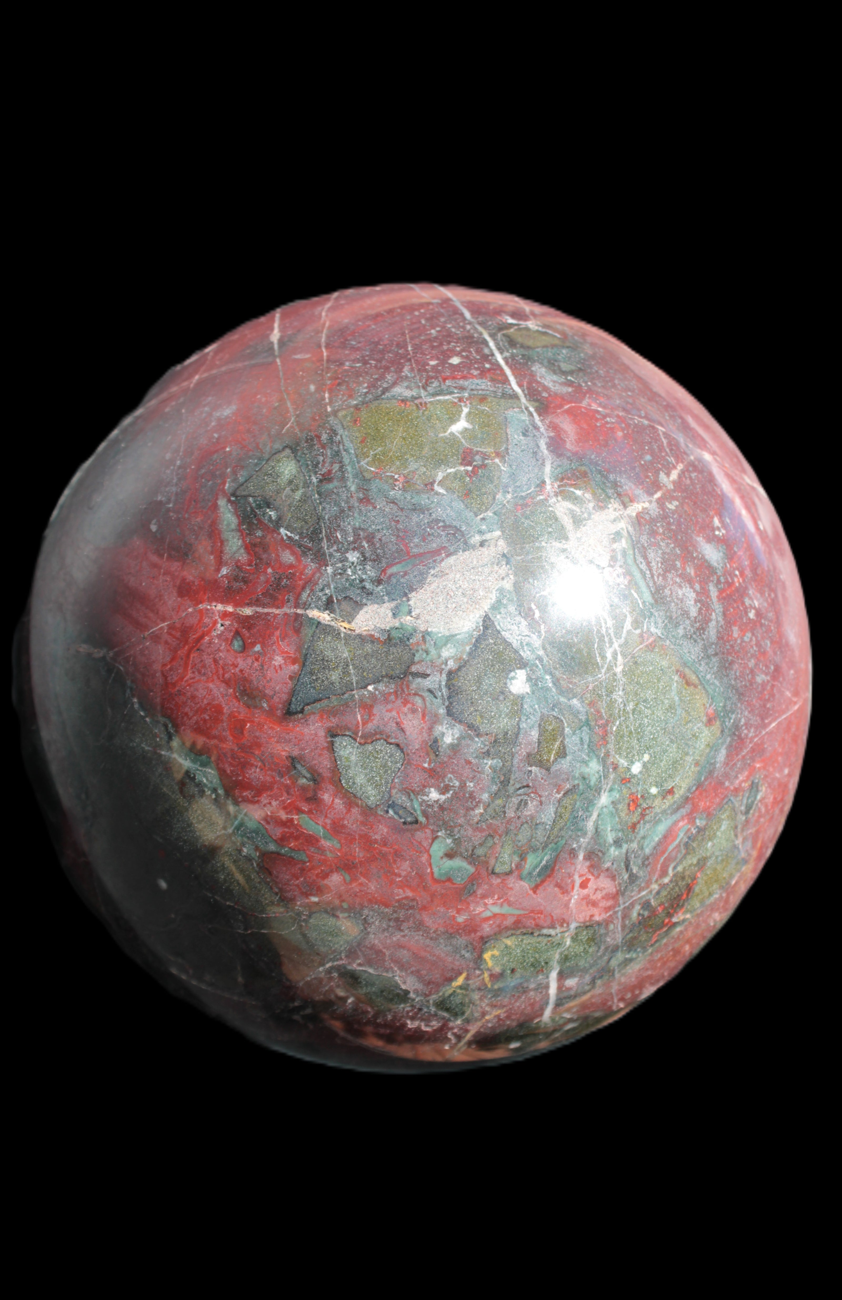 Dragons Blood Stone sphere 151mm 5380g. Dragons Blood Stone is found only in Western Australia and South Africa. , It is a magnifier of energy. Dragon Blood Stone activates and unlocks the heart. Dragons Blood Stone aids the connection between heart, mind and soul, bringing compassion, forgiveness and love.