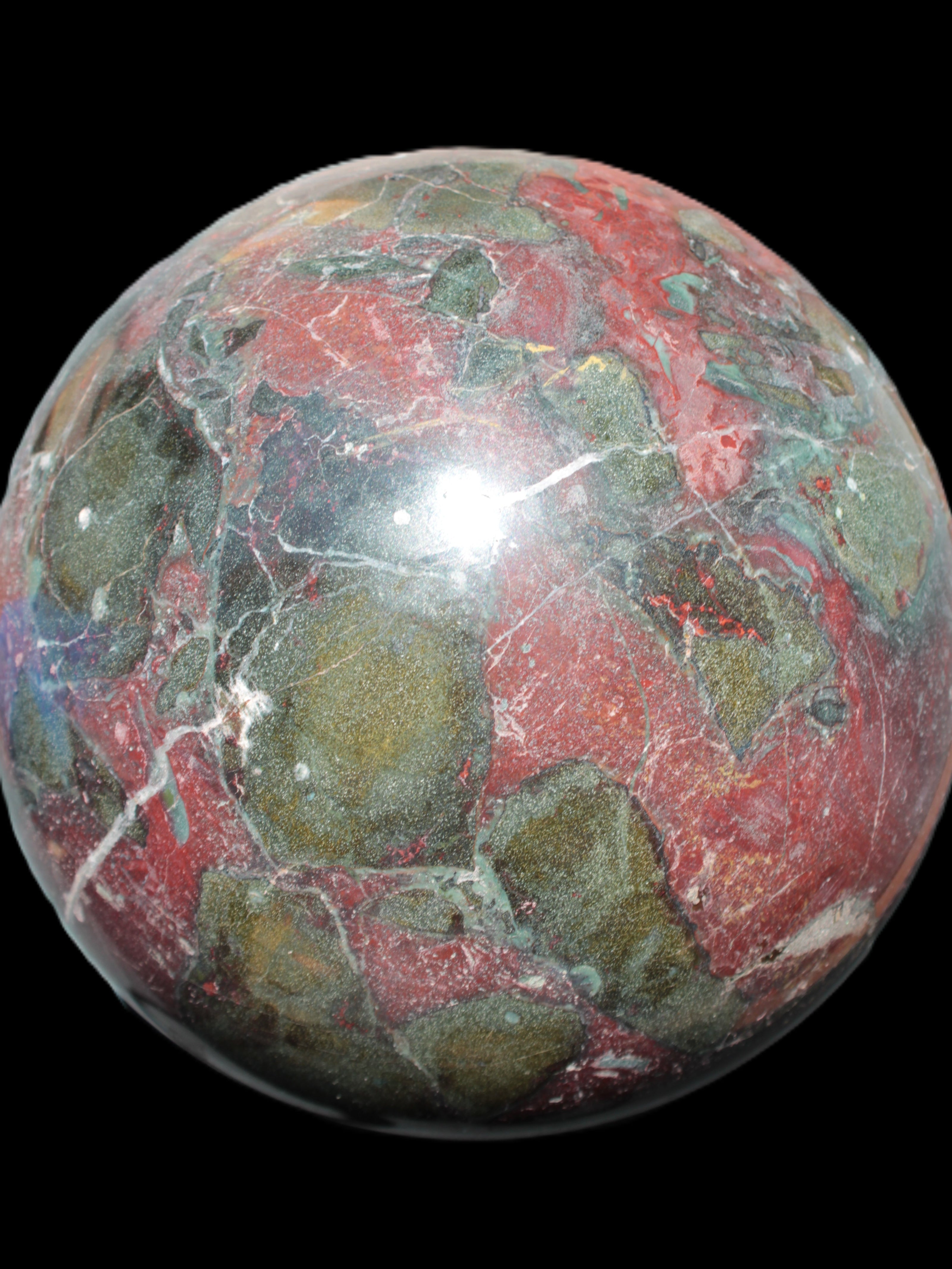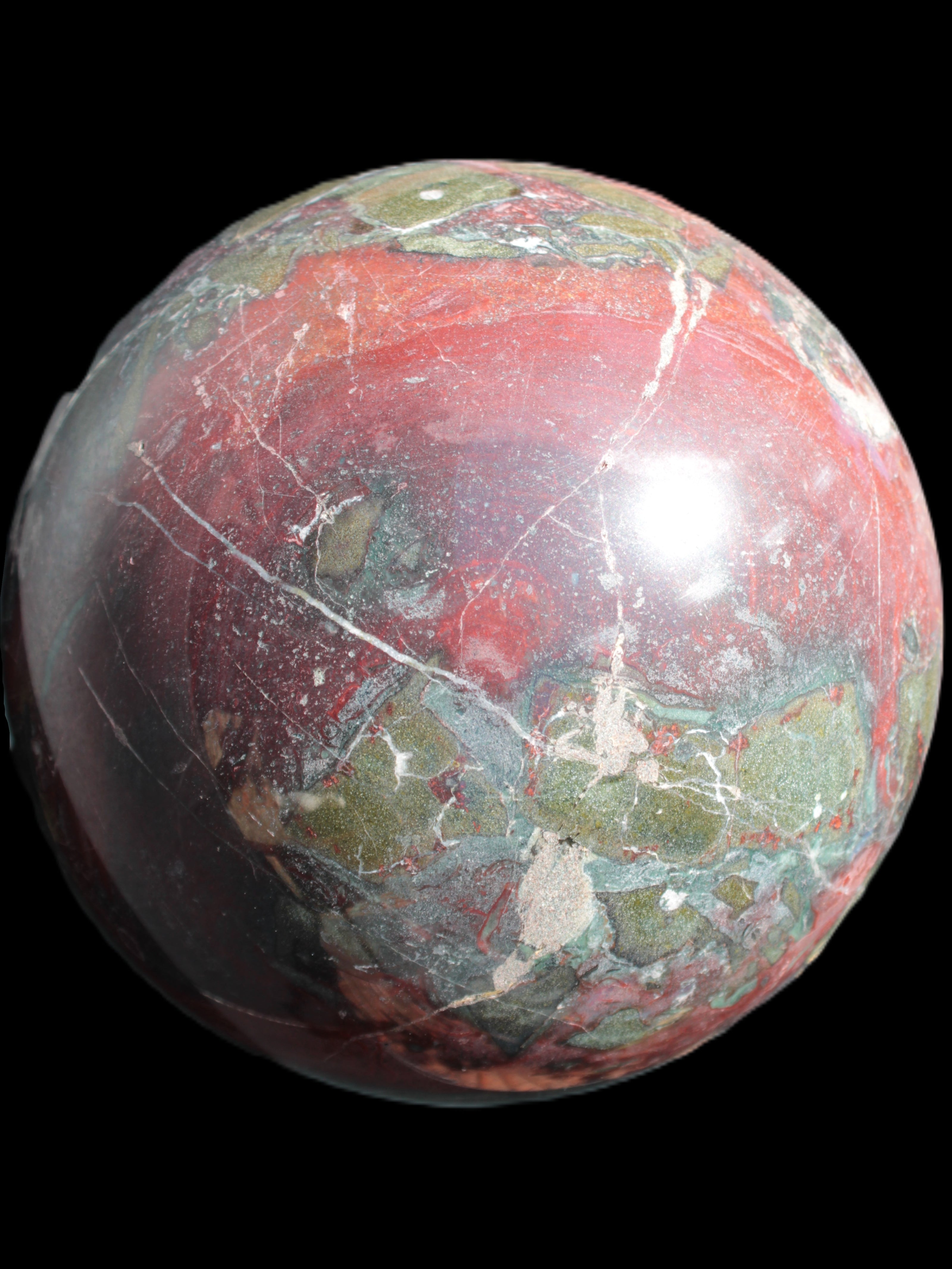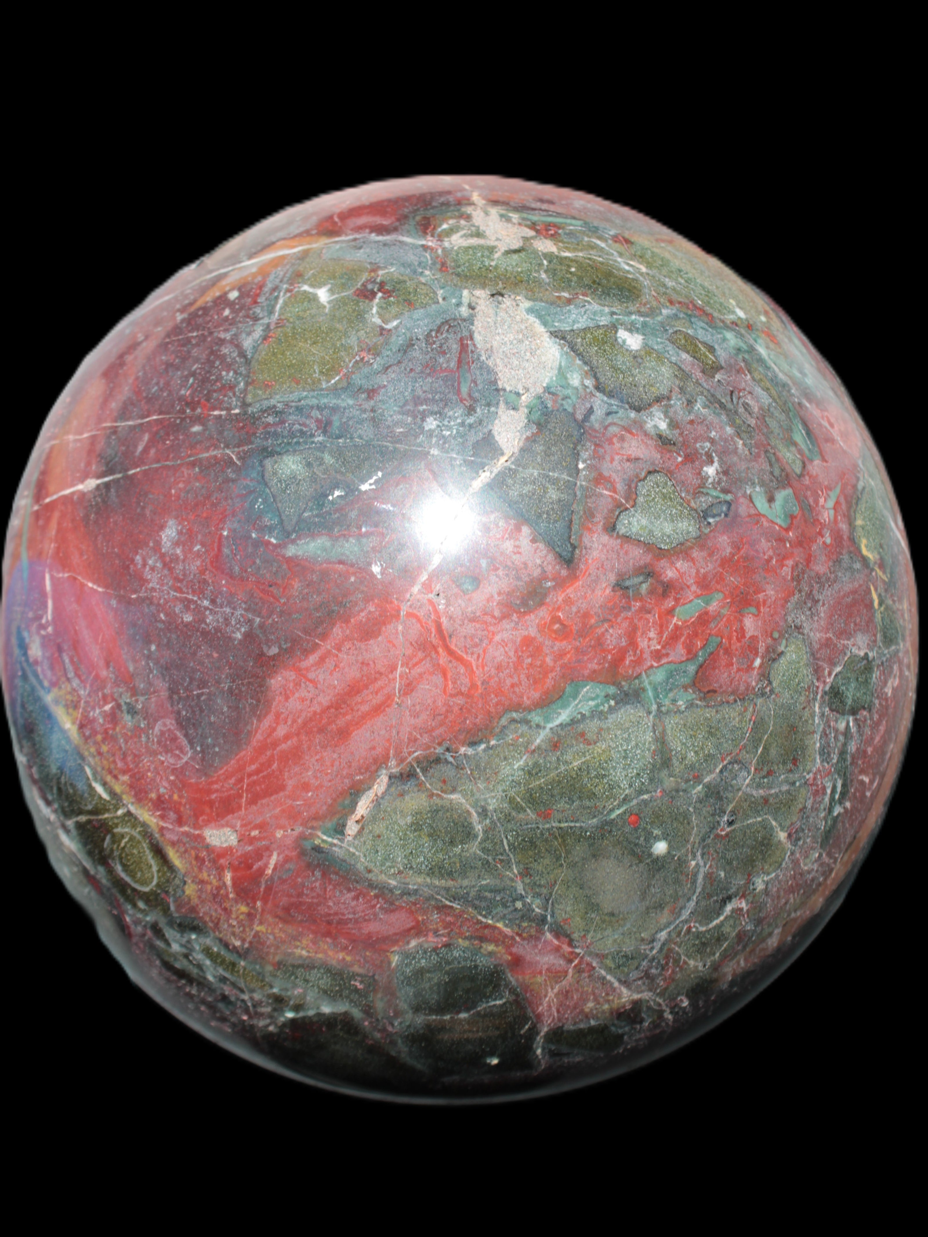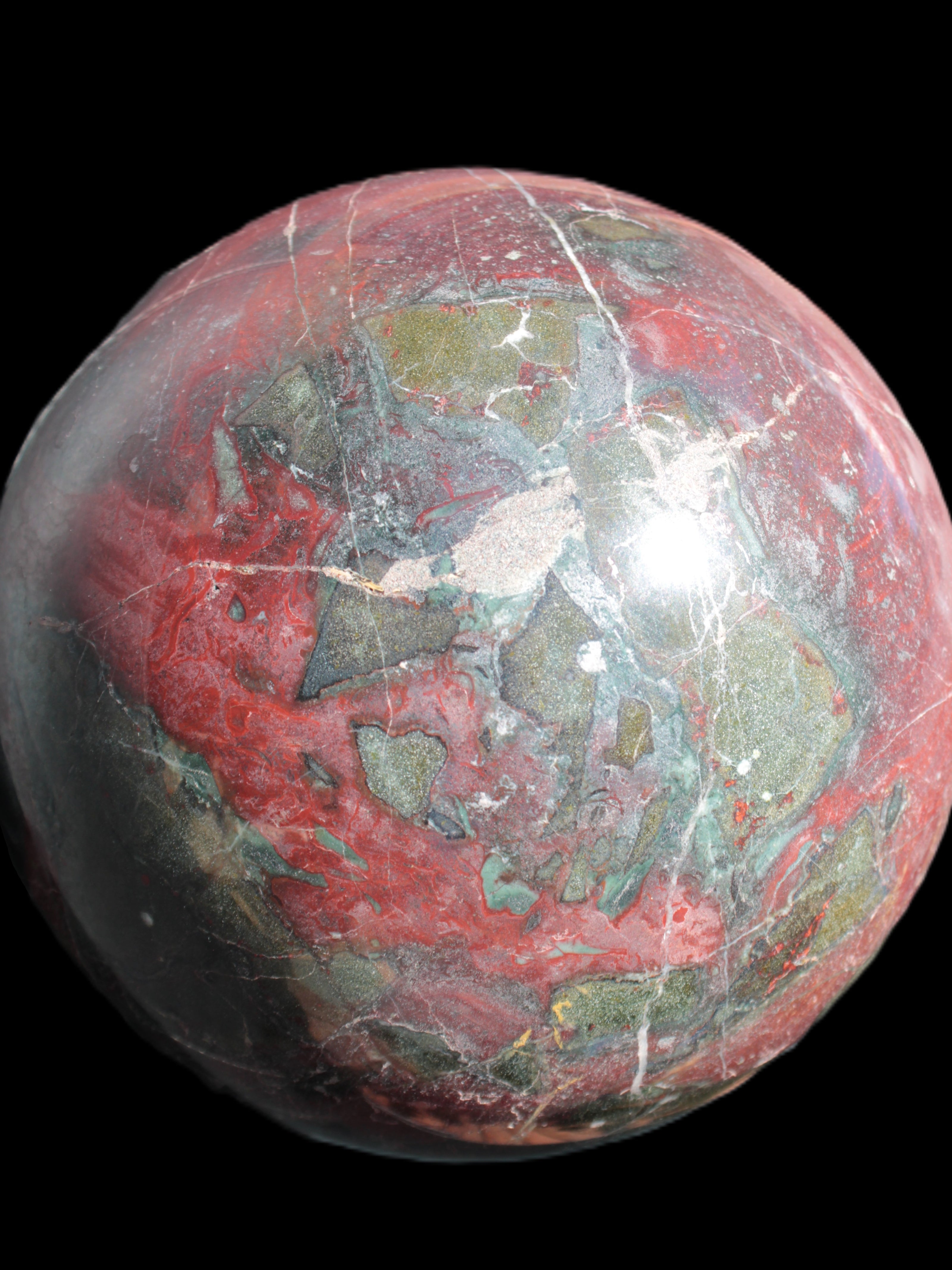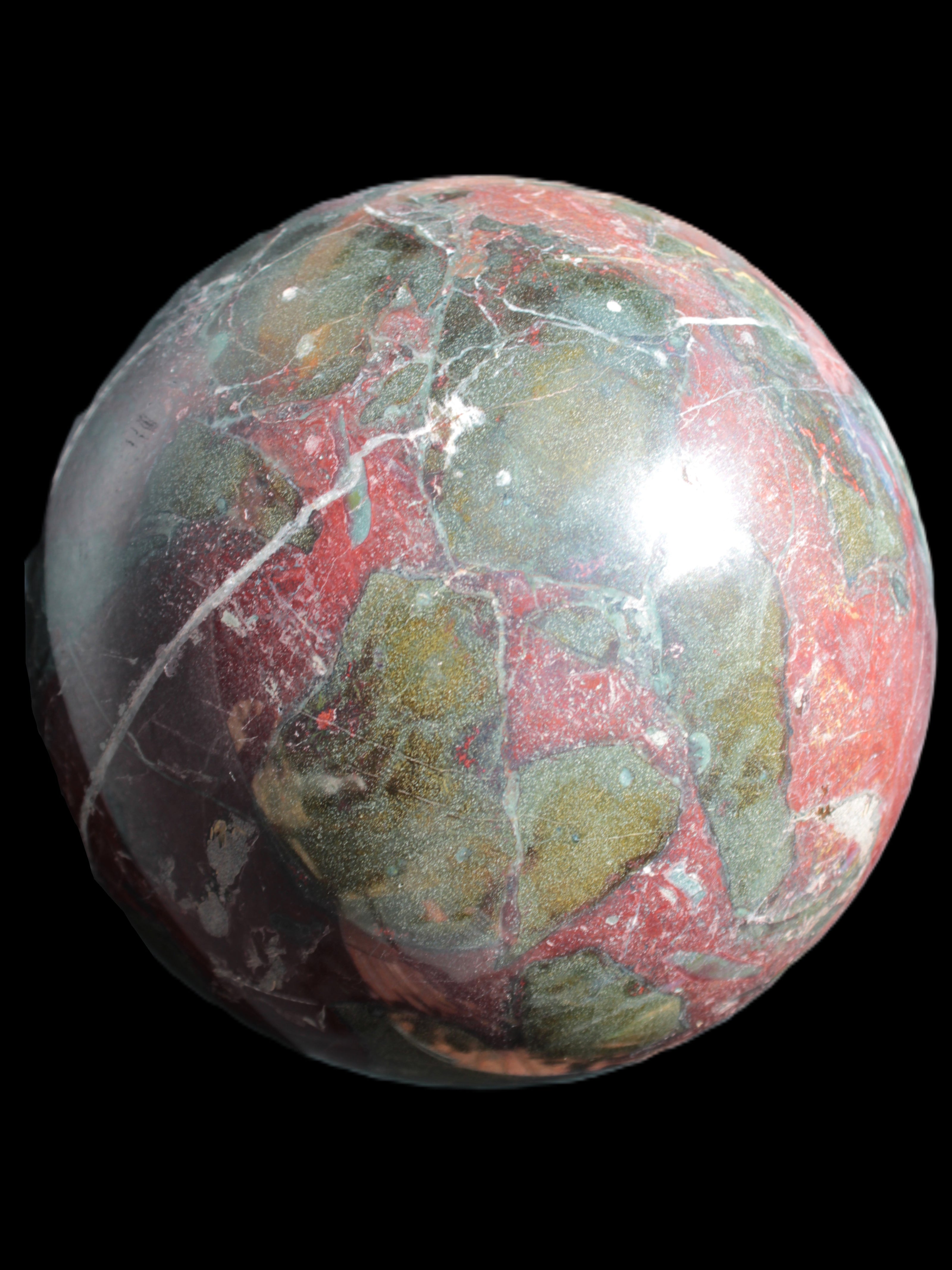Dragons Blood Stone sphere 151mm 5380g. Dragons Blood Stone is found only in Western Australia and South Africa. , It is a magnifier of energy. Dragon Blood Stone activates and unlocks the heart. Dragons Blood Stone aids the connection between heart, mind and soul, bringing compassion, forgiveness and love.