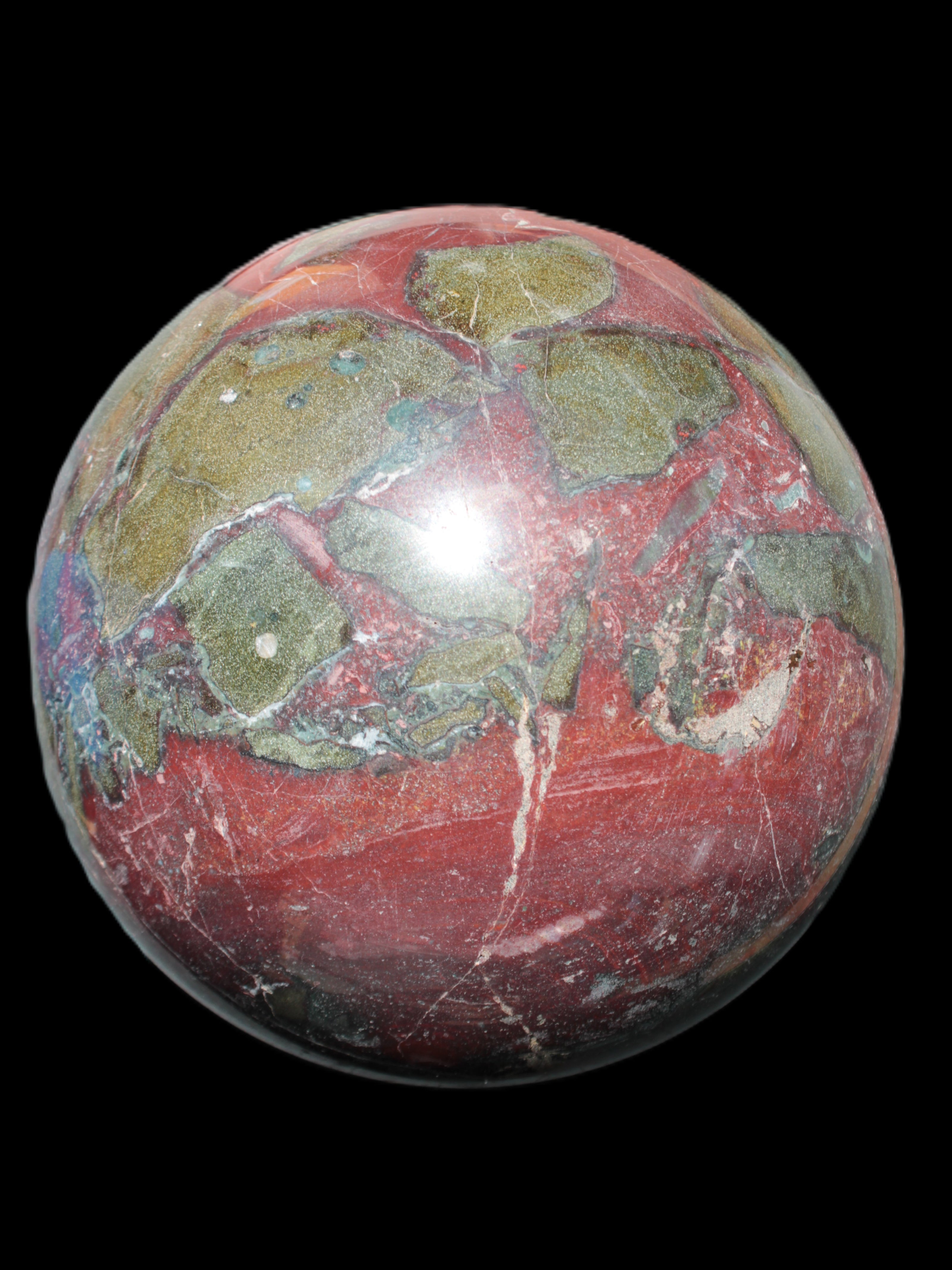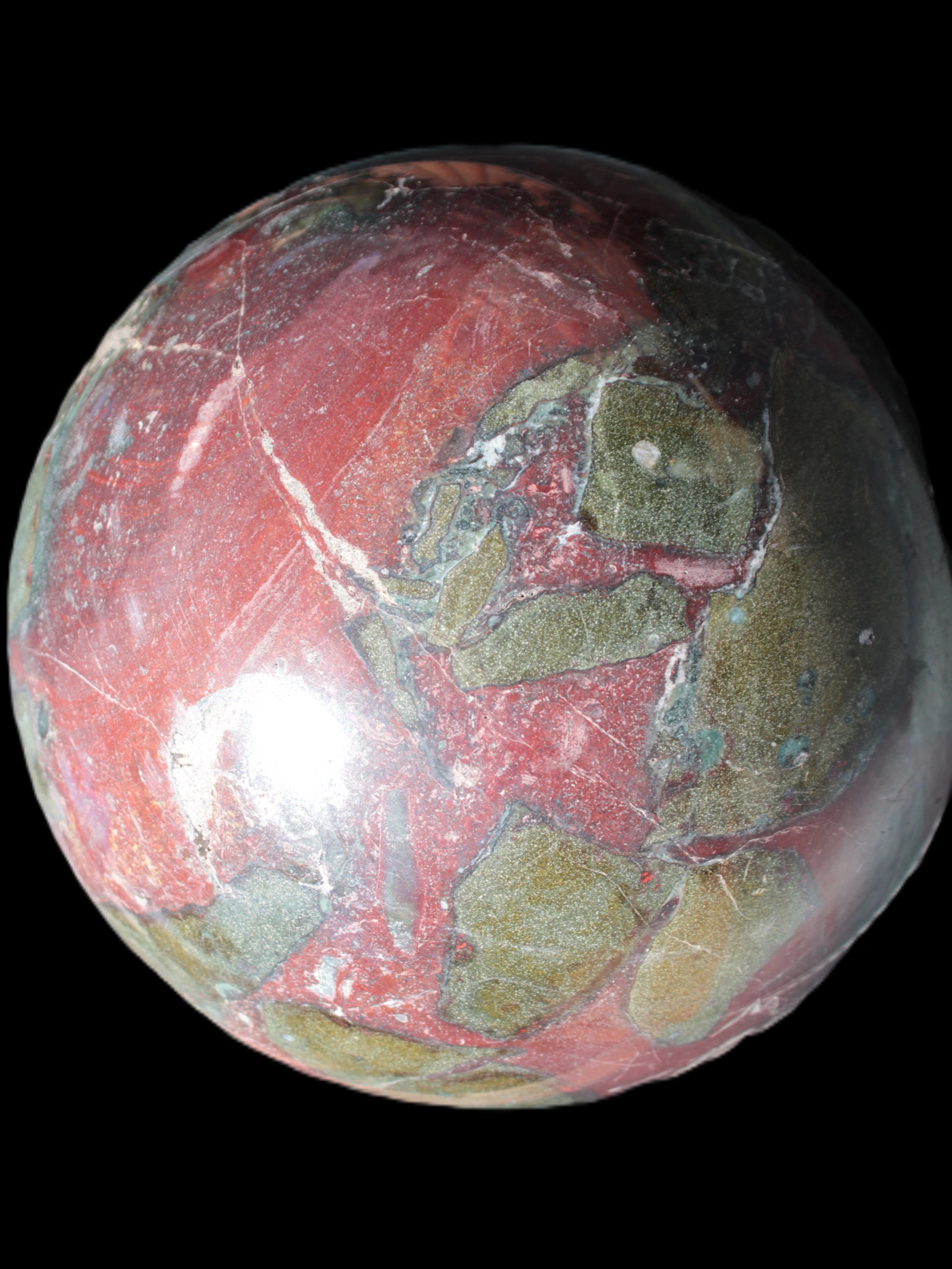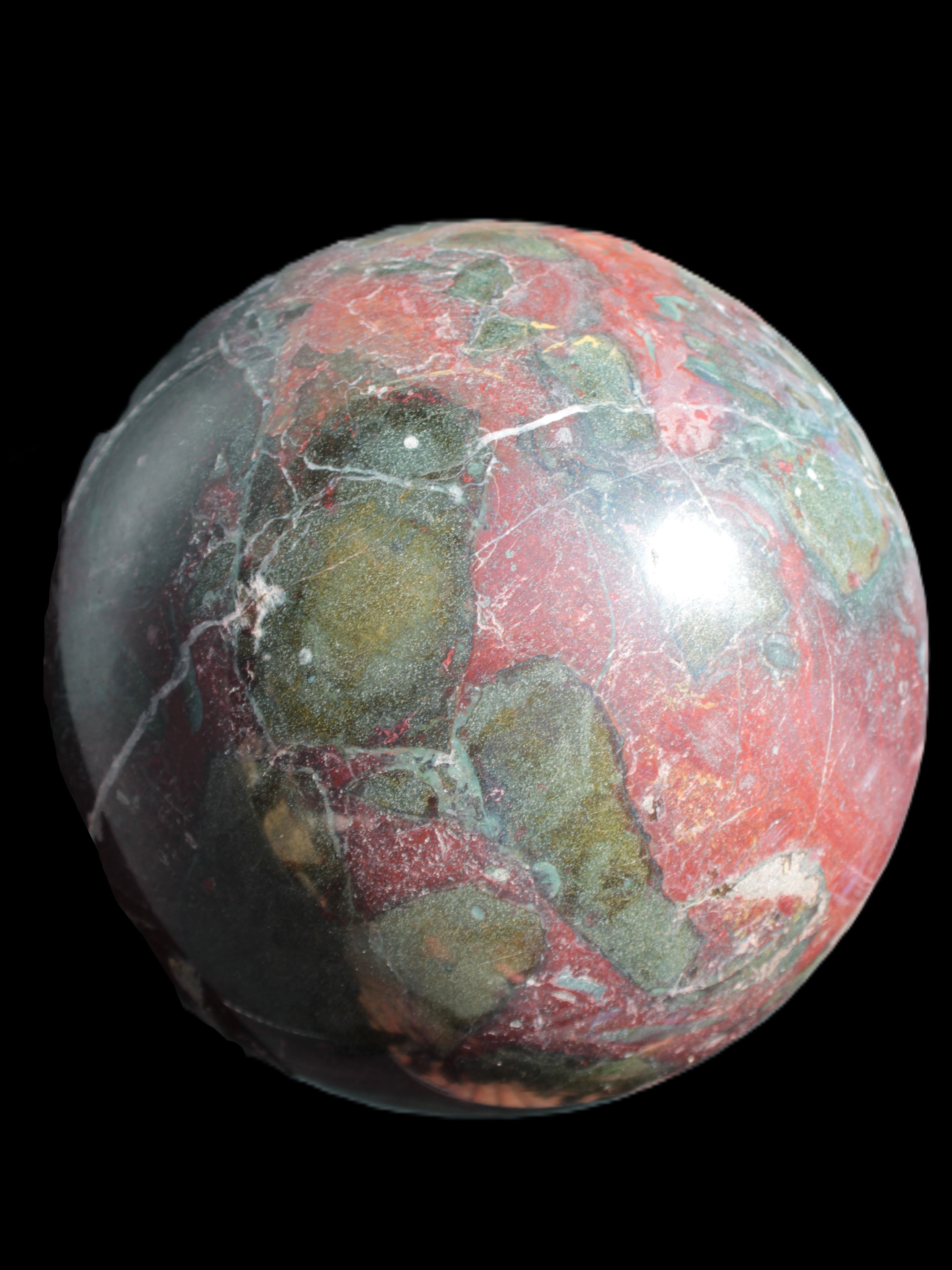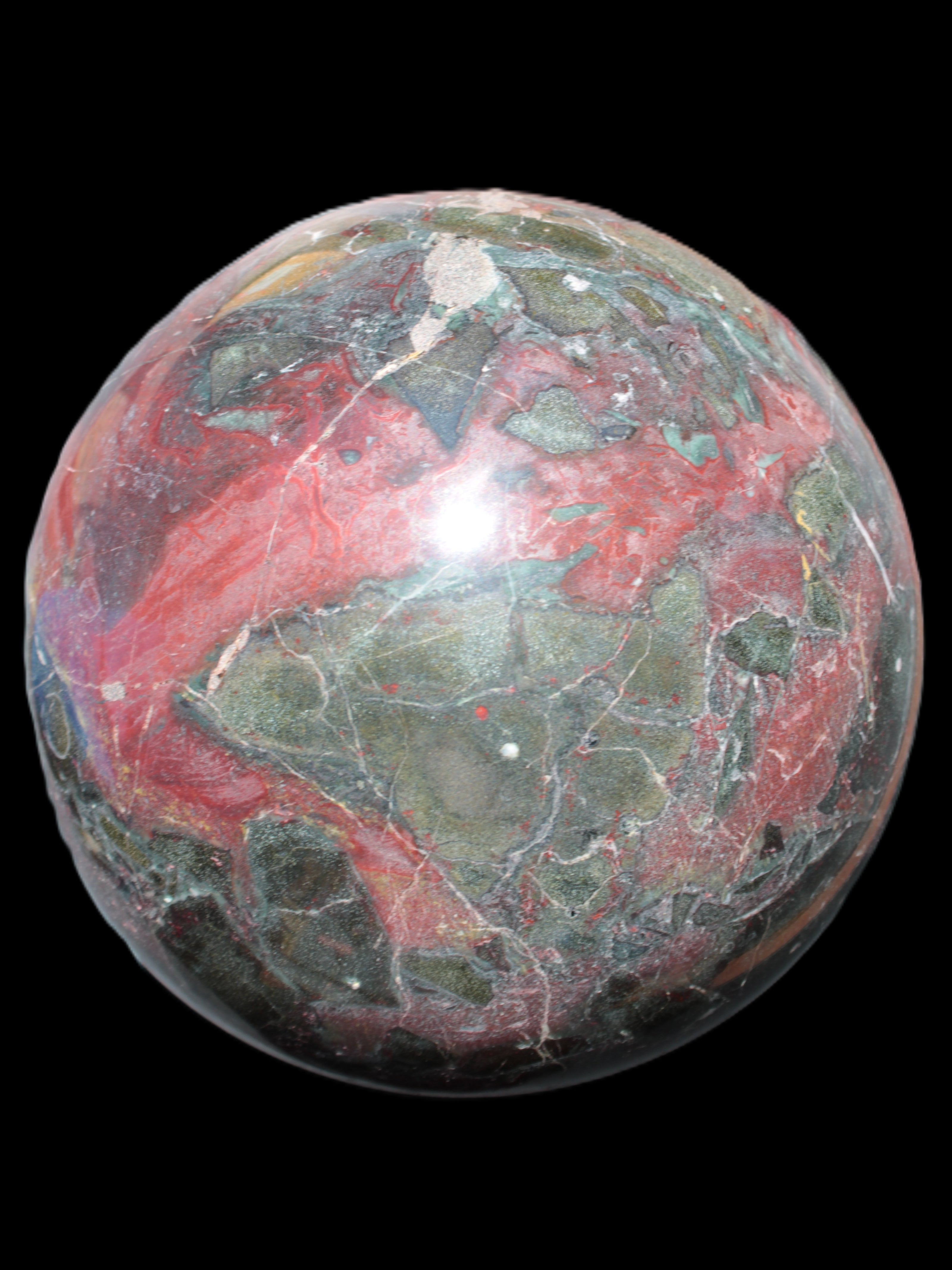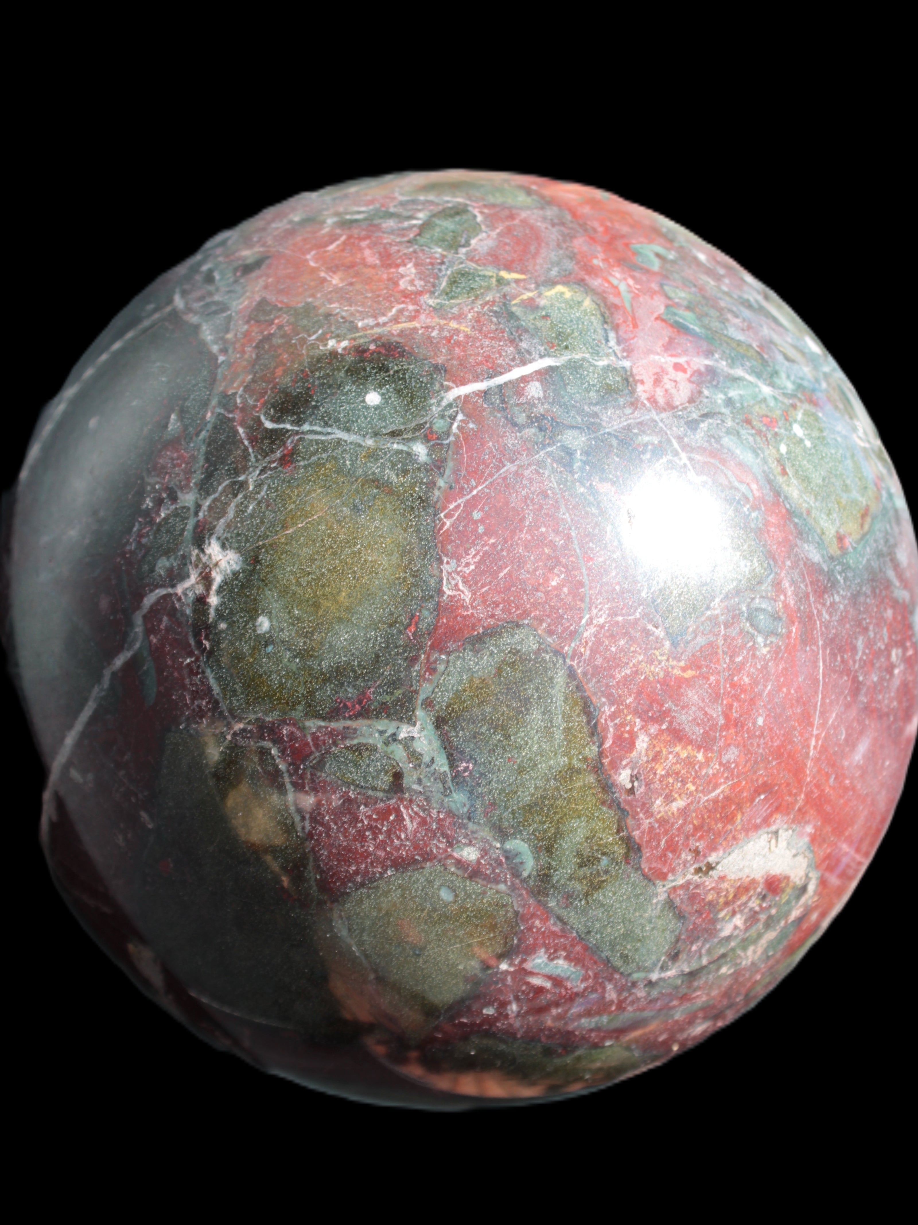 Dragons Blood Stone sphere 151mm 5380g. Dragons Blood Stone is found only in Western Australia and South Africa. , It is a magnifier of energy. Dragon Blood Stone activates and unlocks the heart. Dragons Blood Stone aids the connection between heart, mind and soul, bringing compassion, forgiveness and love.