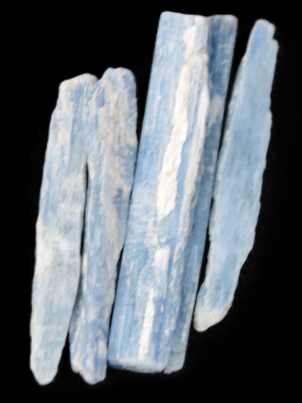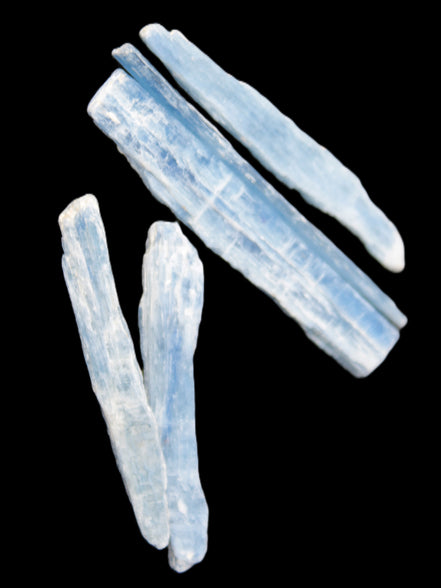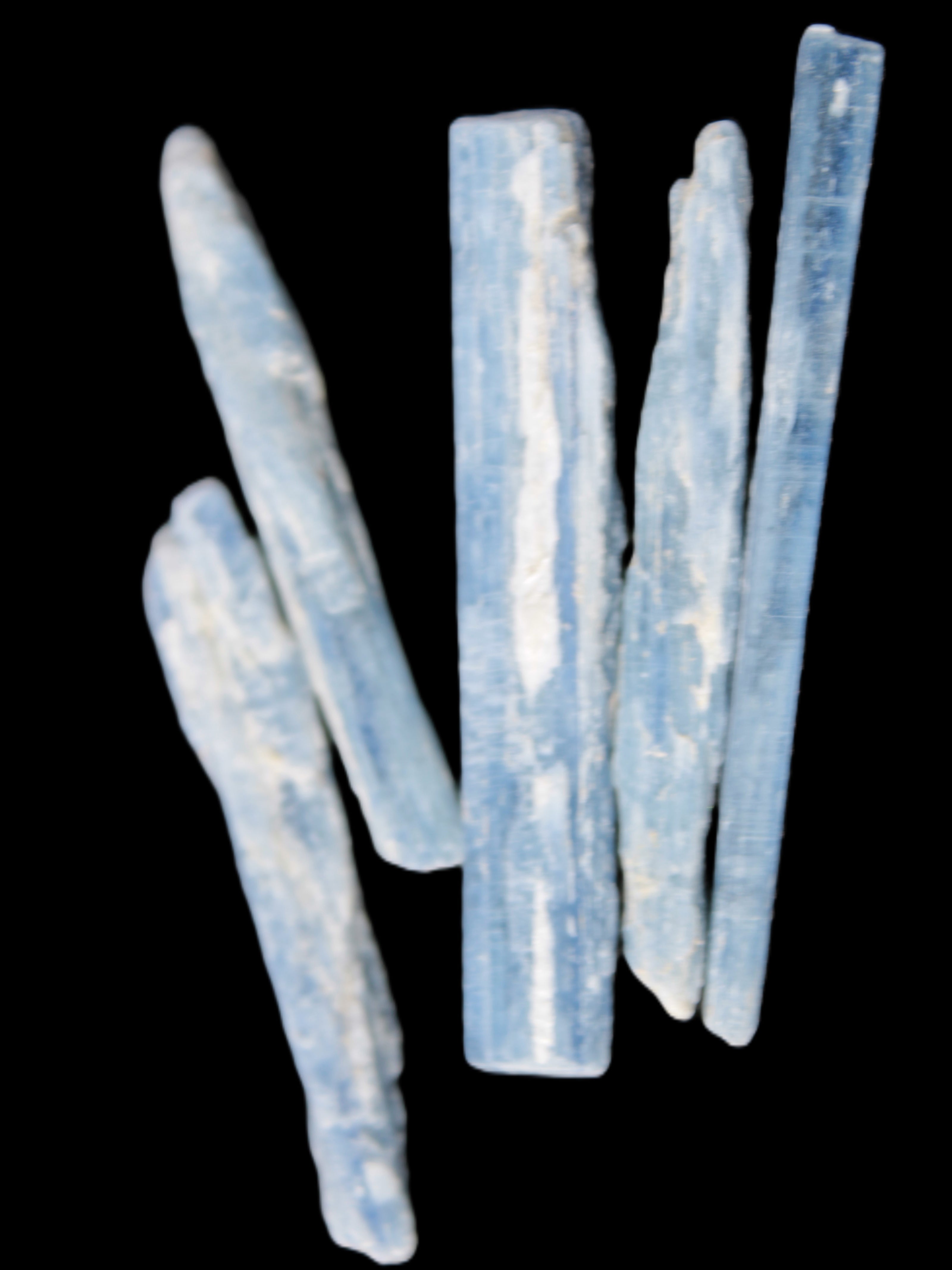 These five Kyanite blades weigh 10.4g. They are 45mm to 50mm long. Kyanite crystals consist of multiple thin flat blade layers. Kyanite is most commonly blue, but it may also be black, grey, green or orange. Kyanite has two distinct hardness ratings for its parallel and perpendicular axis.
