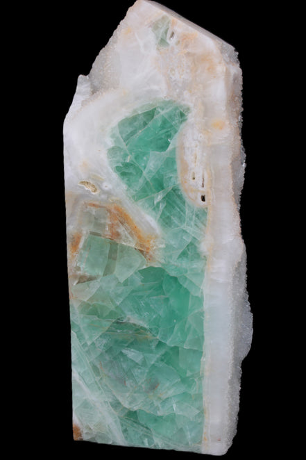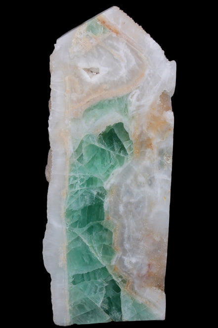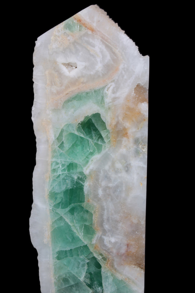 This item is a Fluorite obelisk 5160g. It has been fashioned from a huge Fluorite slab. It has a druzy edge on green, yellow and white Fluorite. It stands 320mm tall. This obelisk makes for a great statement piece.