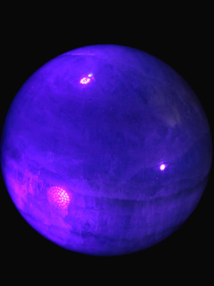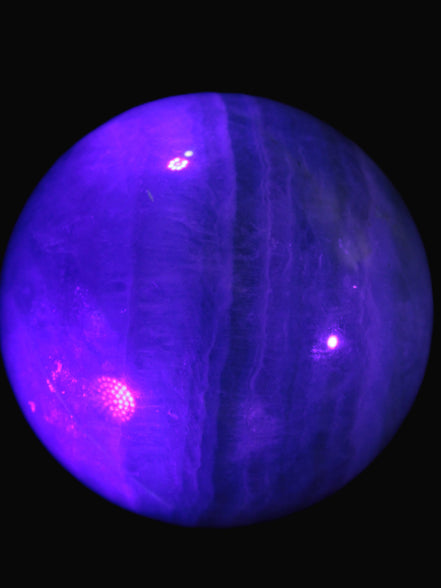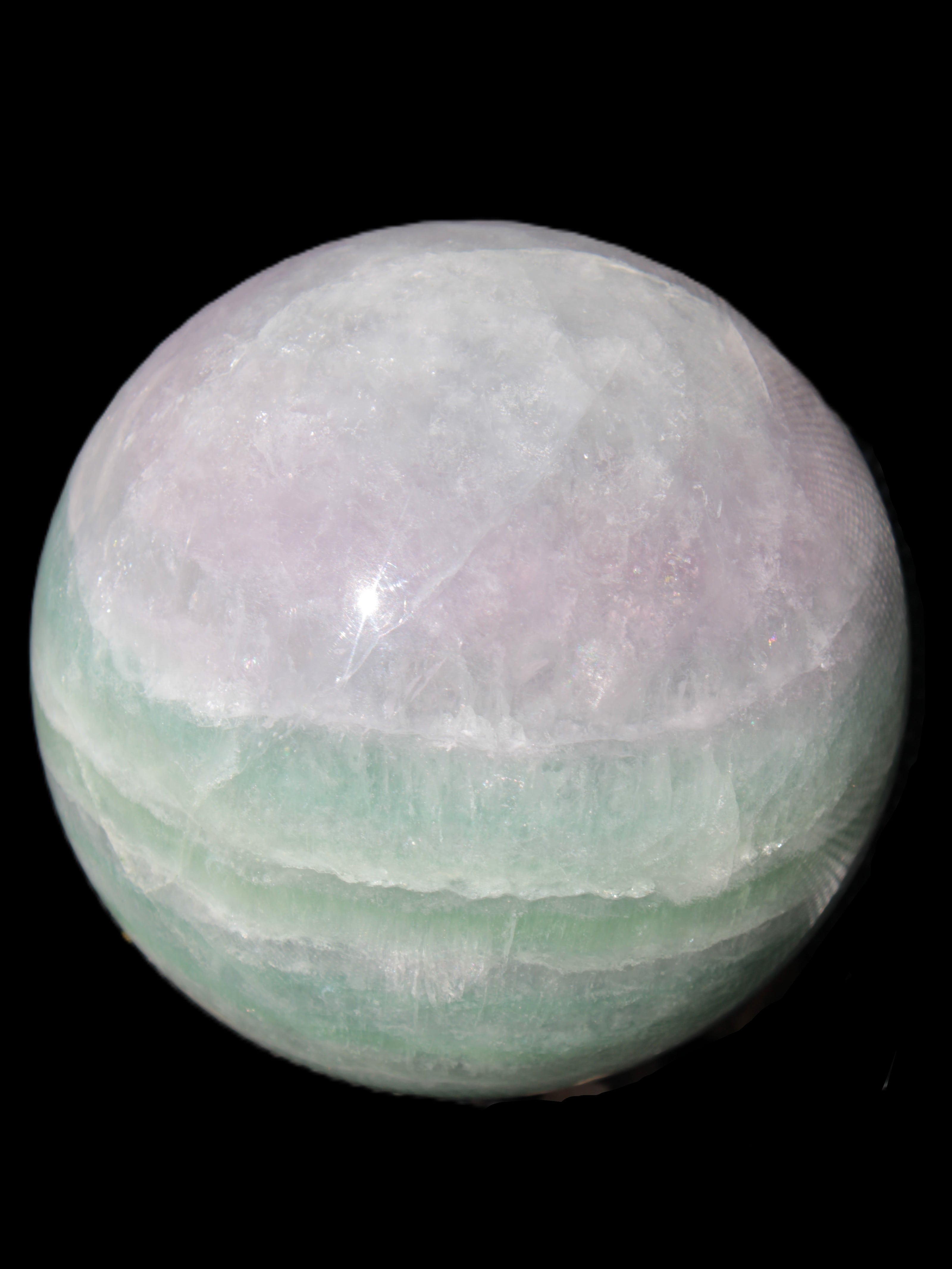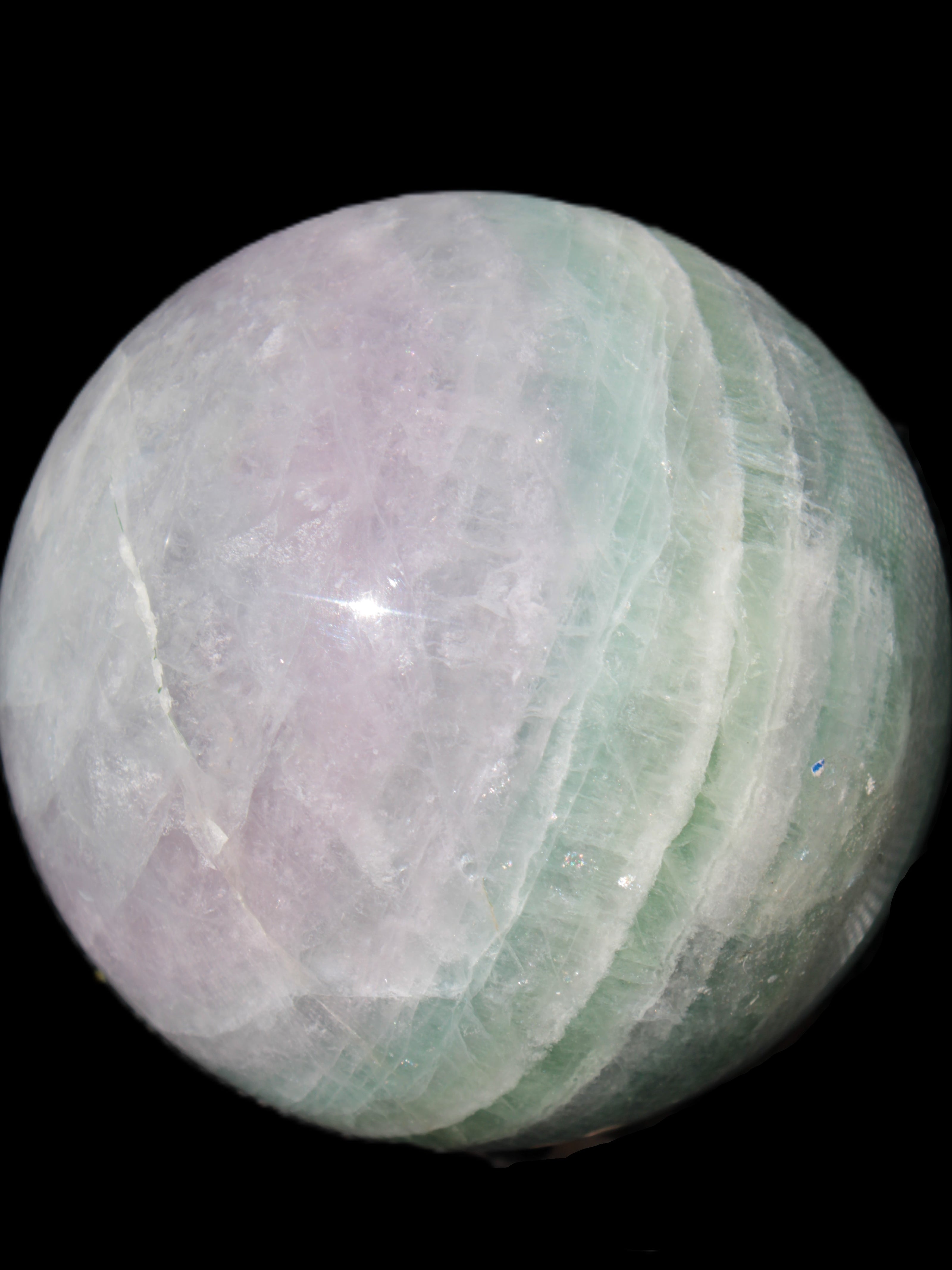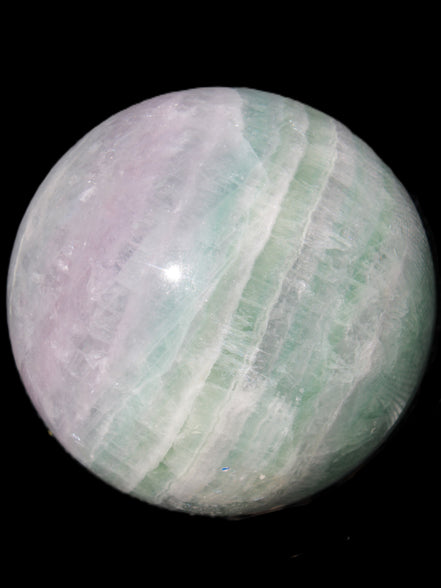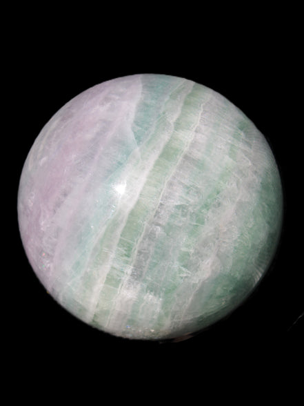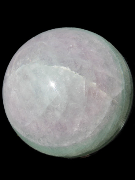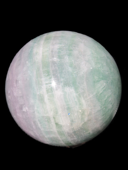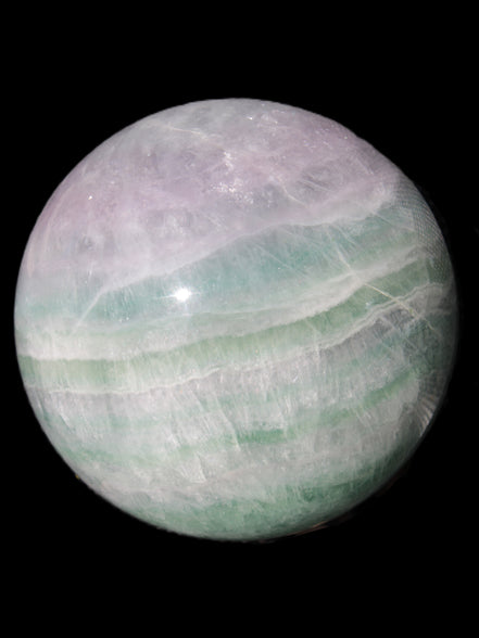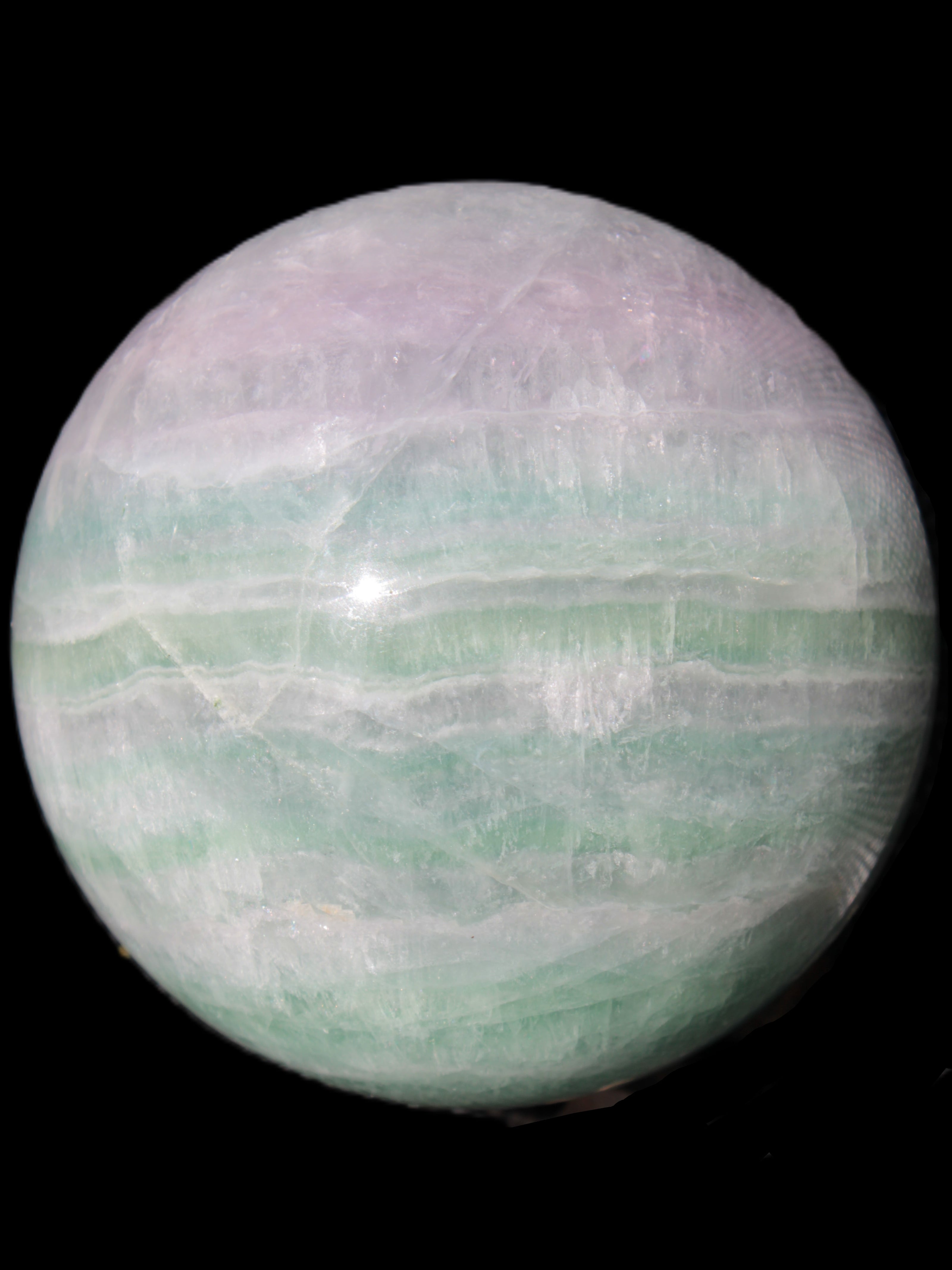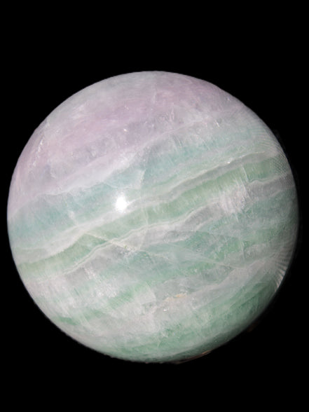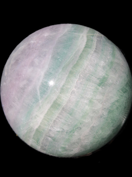 This Fluorite sphere 112mm 1953g is simply lovely. Its gentle colours are soft and soothing. It is large too at 112mm in diameter and weighing nearly 2kg. All of this makes it a great statement piece. As well, this large Fluorite sphere is UV reactive, turning blue under ultra-violet light.