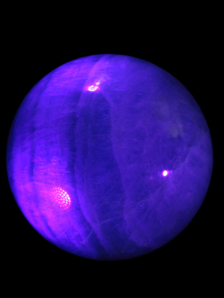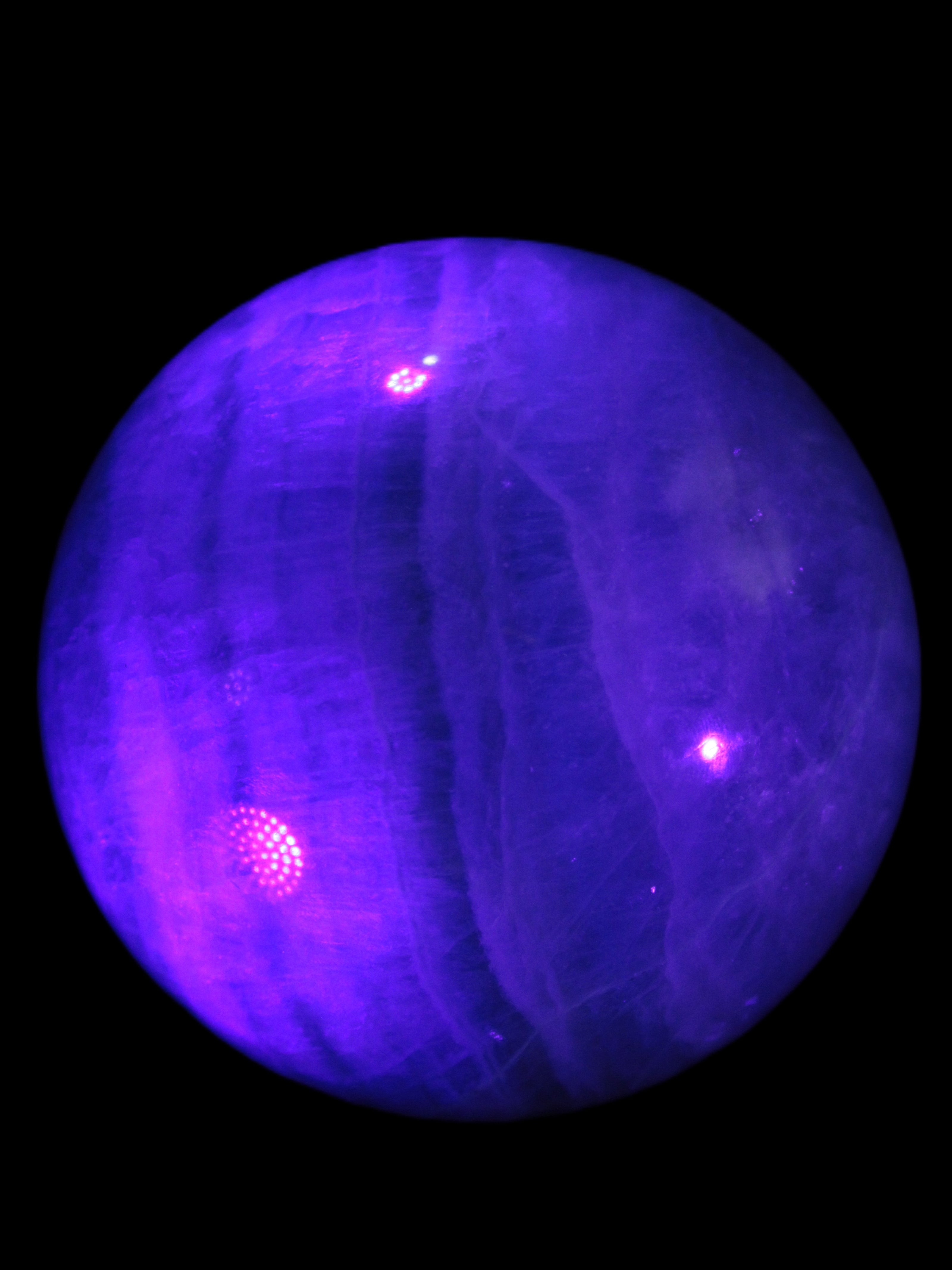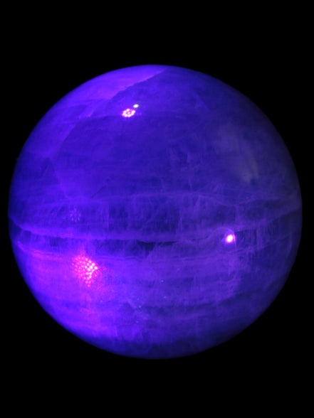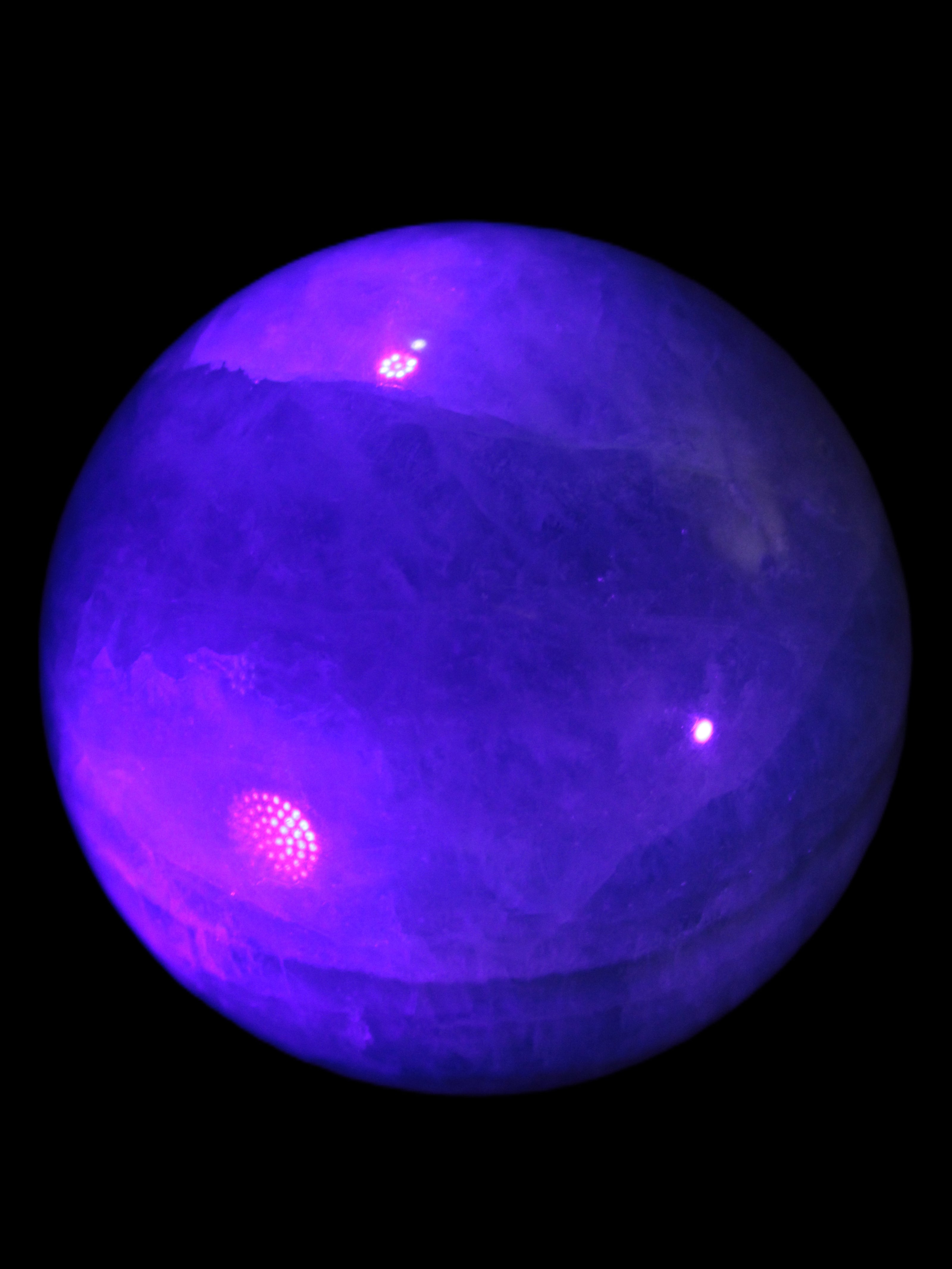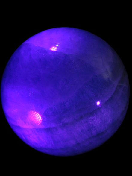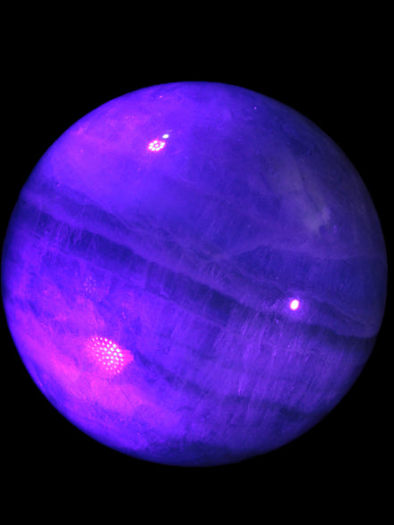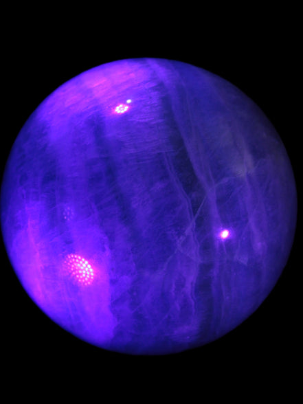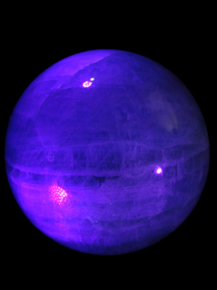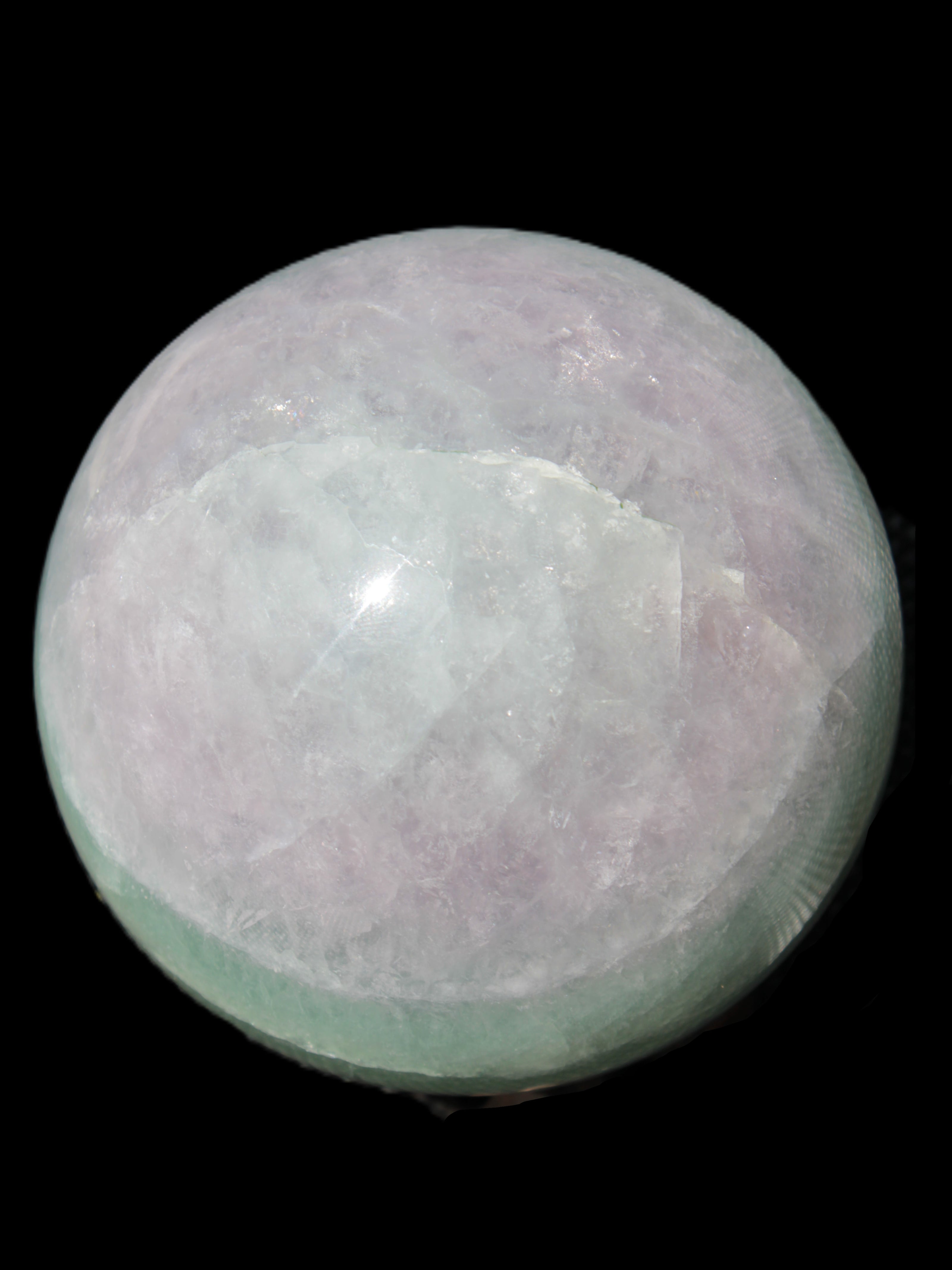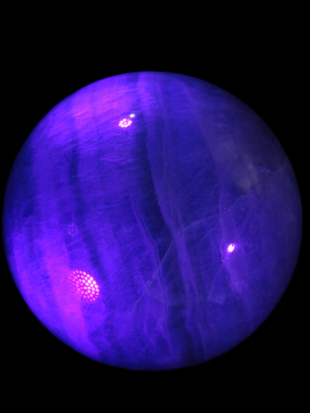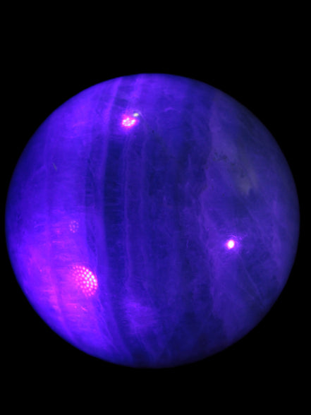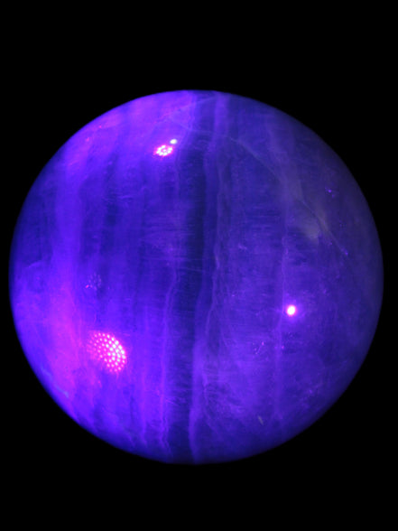This Fluorite sphere 112mm 1953g is simply lovely. Its gentle colours are soft and soothing. It is large too at 112mm in diameter and weighing nearly 2kg. All of this makes it a great statement piece. As well, this large Fluorite sphere is UV reactive, turning blue under ultra-violet light.