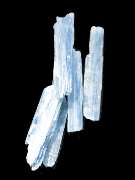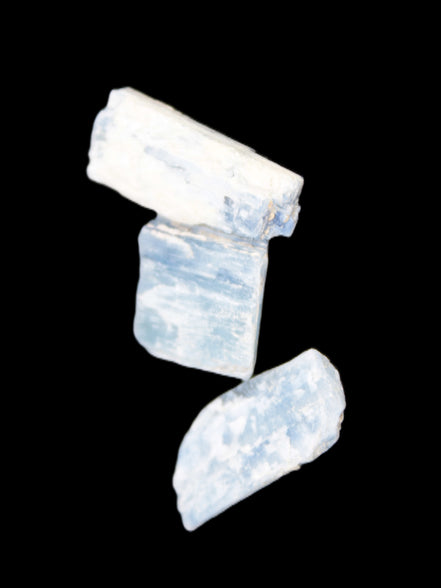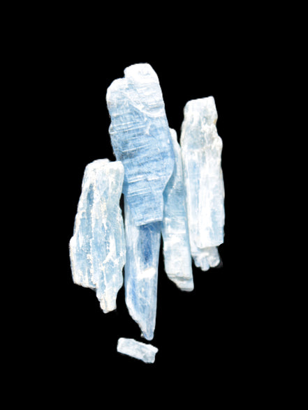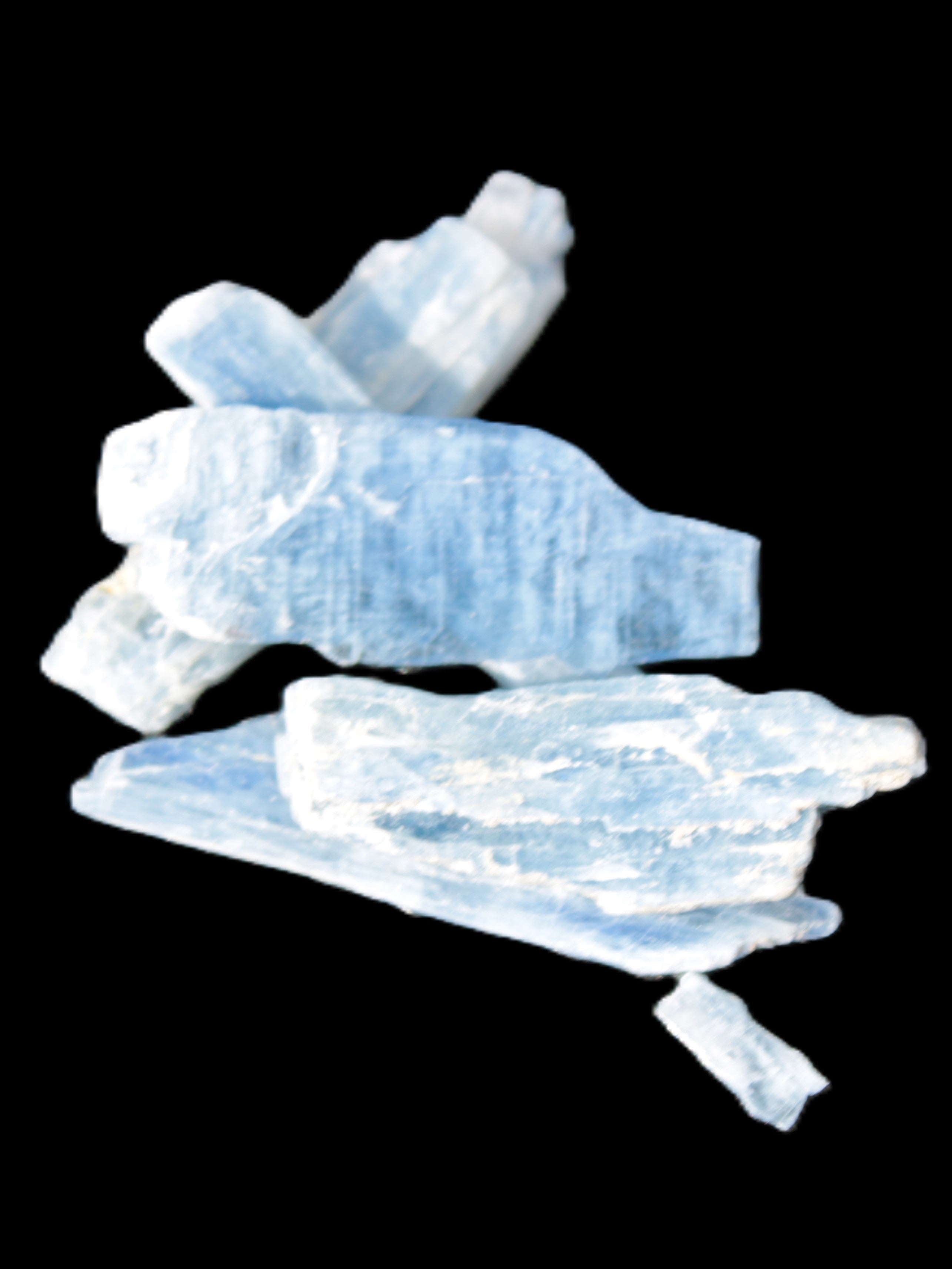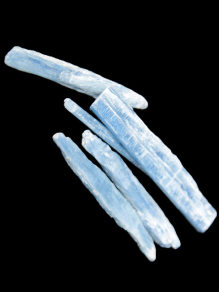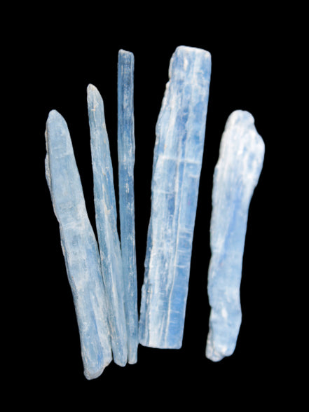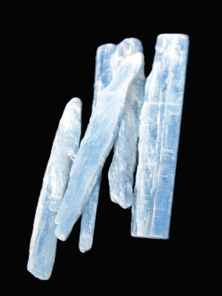 These thin Kyanite blades weigh 4.7g to 5.3g together. Their length ranges from 22m to 32mm. There are four or five blades in this selection. Kyanite crystals consist of multiple thin flat blade layers. Kyanite is most commonly blue, but it may also be black, grey, green or orange. Kyanite has two distinct hardness ratings for its parallel and perpendicular axis.