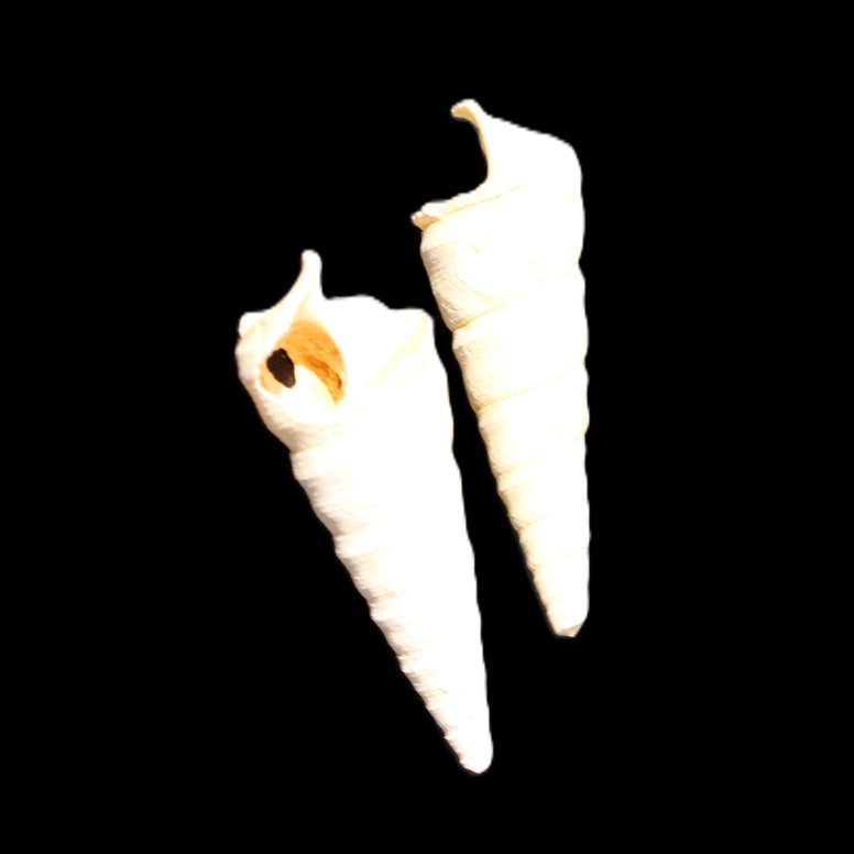 These Gastropod Maoricolpus murrayna two Miocene fossils from Morgan South Australia 31-34mm weigh 3-4g. These well preserved fossil shells were obtained in the Cadell Marl Lens found in Morgan, South Australia. The Miocene Epoch was the first part of the Neogene Period, lasting approximately from 23.03 million to 5.333 million years ago. It was a time of a generally warmer climate and continental drift to near modern positions. This Epoch also saw the emergence of many modern plant and animal species, including early hominins.
