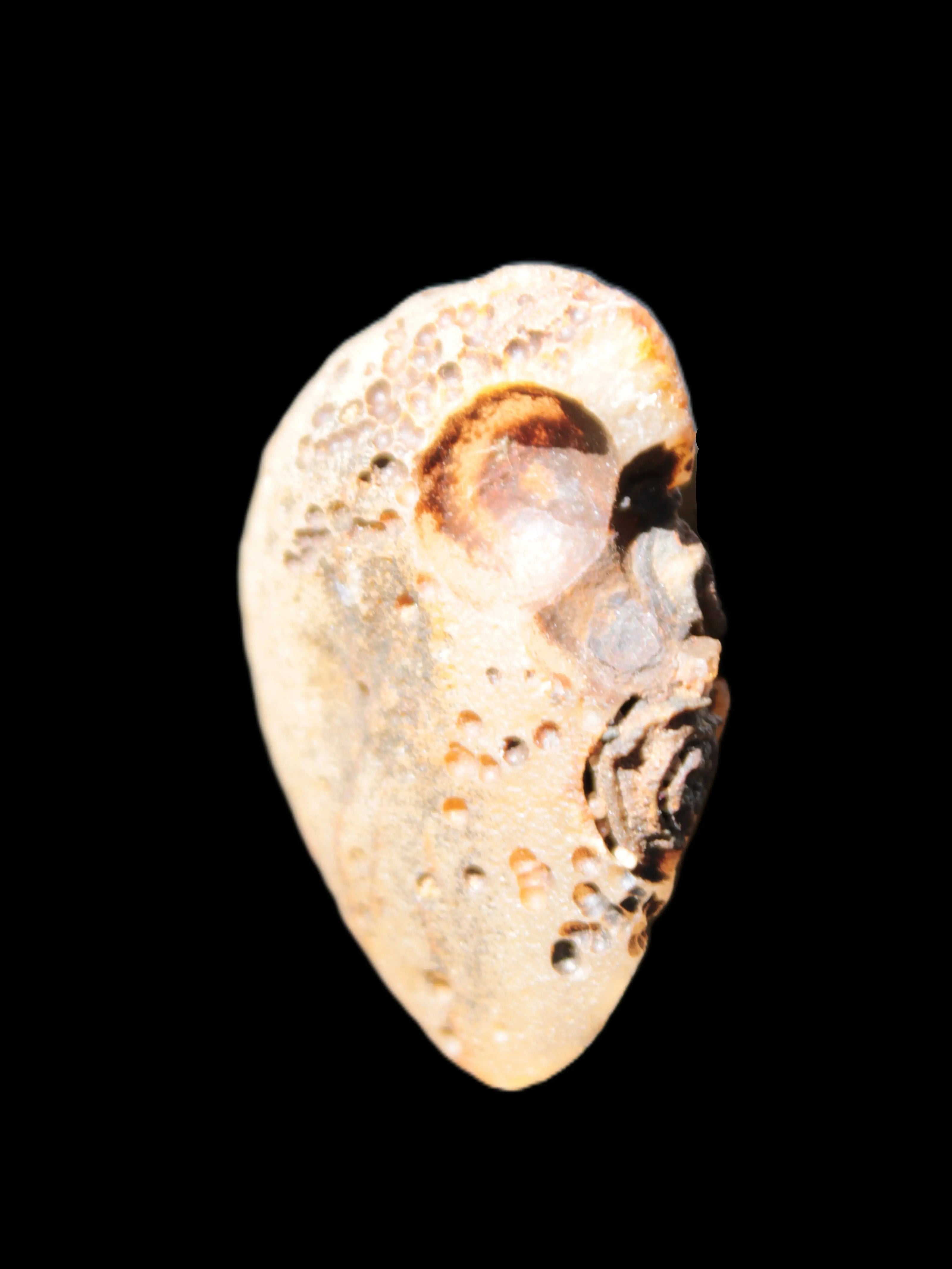 This Gobi Agate Eyes specimen from Mongolia 40.30*16mm weighs 24.5g. It owes its curious and fascinating features to its desert formation. It was tumbled in wind and rain on the floor of the Mongolian Desert. These agates ground excess spiritual energy, returning it to Mother Earth. The stone resonates with a heart-based vibration, supporting balanced enduring energy.