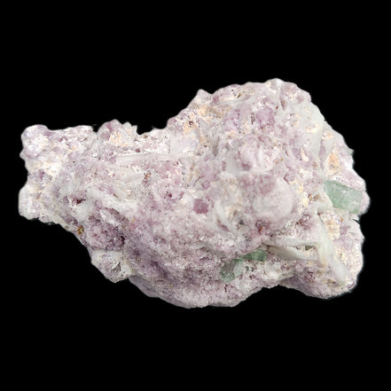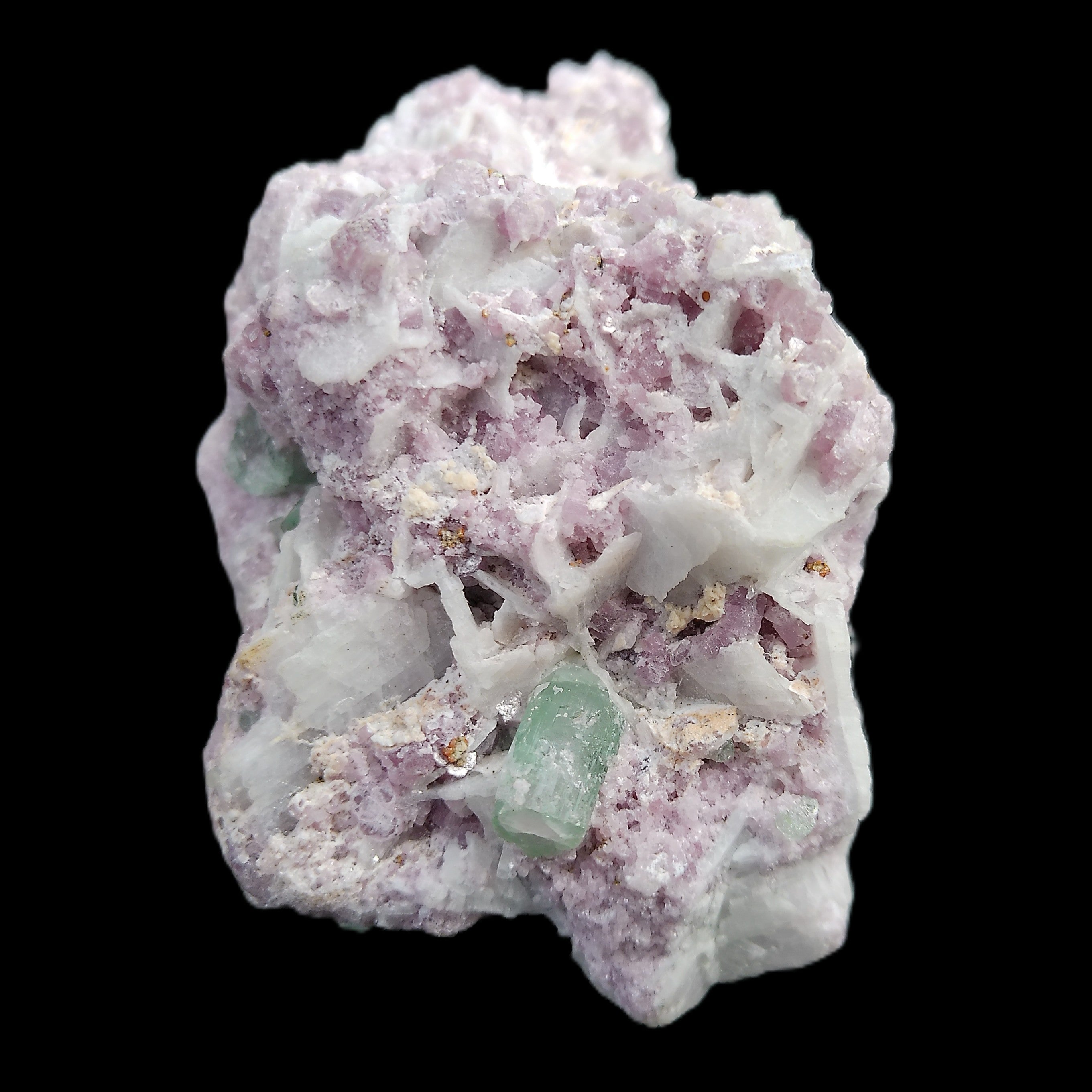 This fabulous Green and Pink Tourmaline, Lepidolite, Kunzite, Aquamarine, Quartz Feldspar cluster weighs 332g. It measures 102*55*60mm. Green Tourmaline is a beautiful complex lithium-rich borosilicate mineral. Elbaite usually forms as elongated rods or prismatic crystals that are heavily striated. Green (and blue) Elbaite crystals are often pleochroic, which means that the crystal appears darker in colour when viewed along its vertical axis, compared to viewing along its horizontal axis. Elbaite is an igneous mineral that almost always forms in granite pegmatites.
