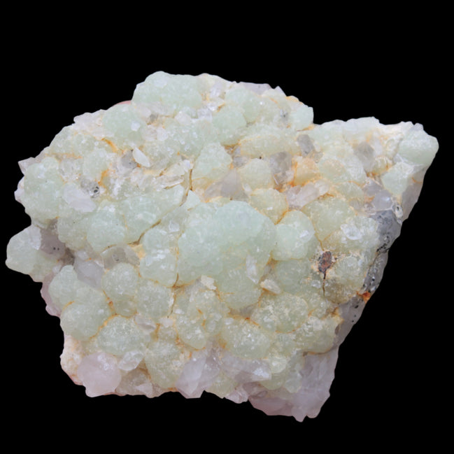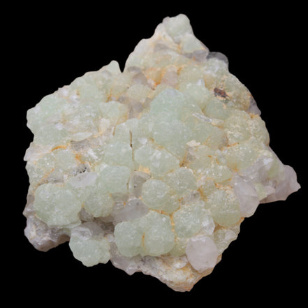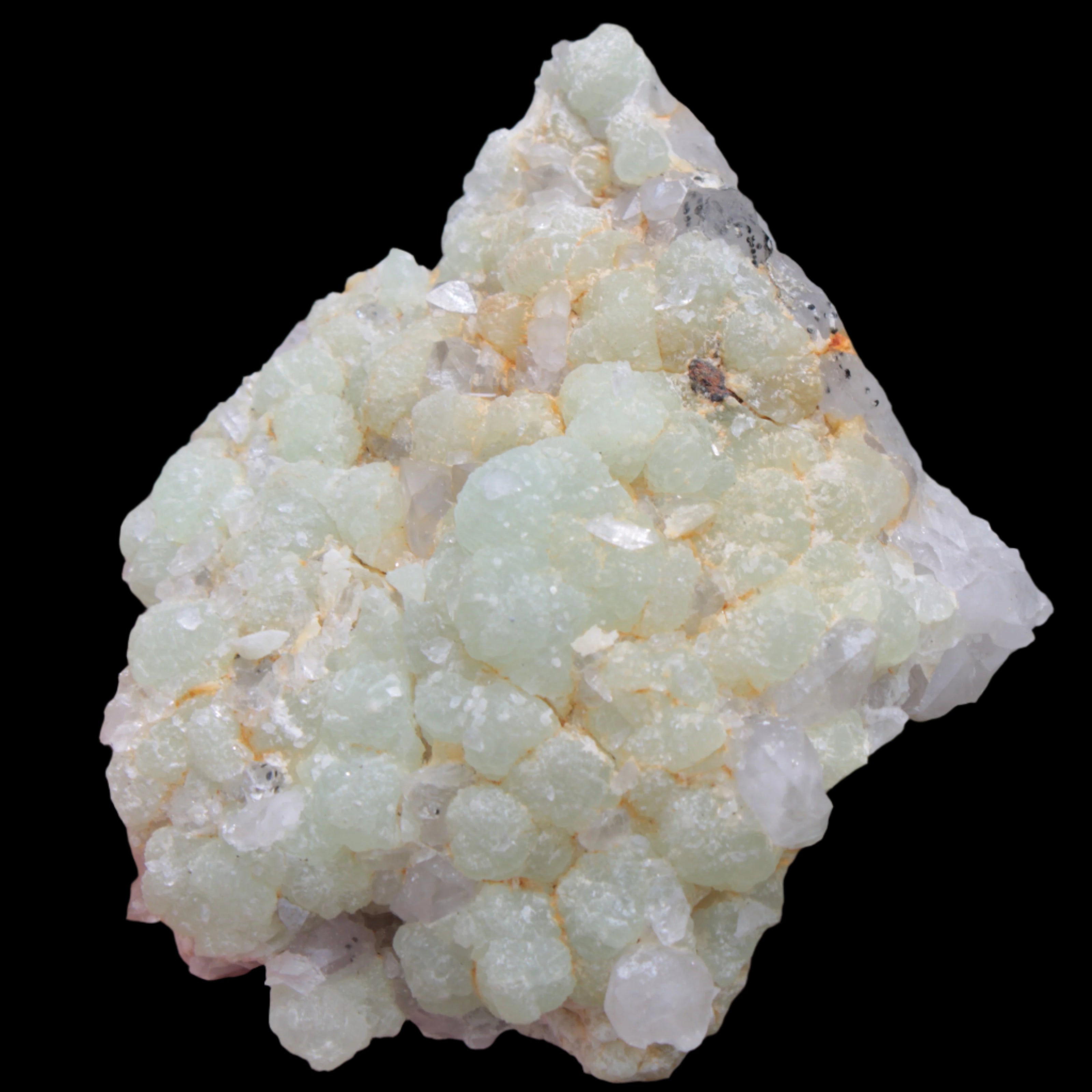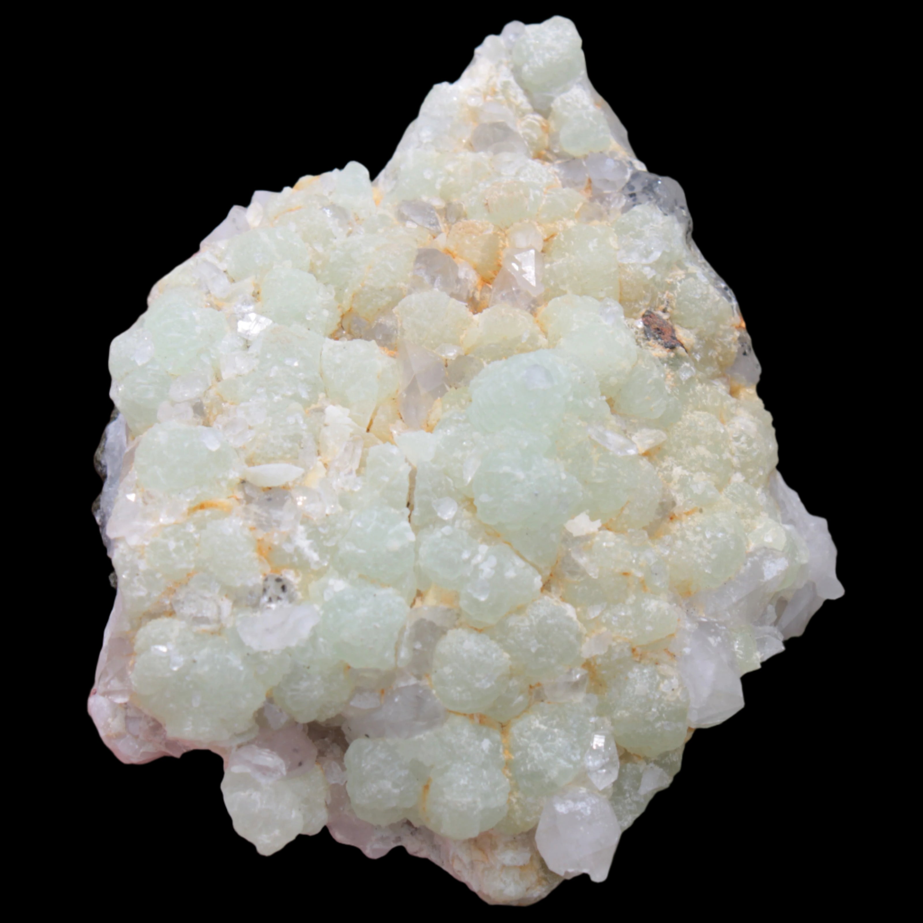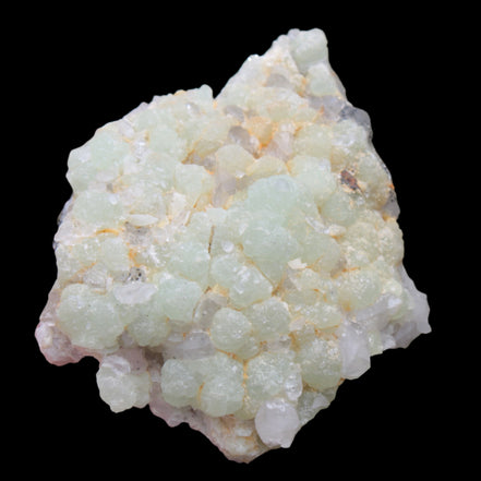 This Green Prehnite with Quartz complex natural crystal cluster specimen, from Guizhou, China, weighs 203g. Prehnite is a calcium aluminium silicate hydroxide. It usually forms in massive, botryoidal, granular or stalactite habits. It also rarely forms as prismatic, pyramidal or tabular crystals. Prehnite commonly occurs with intergrowths of Epidote. Prehnite is translucent and rarely transparent with a vitreous, waxy or pearly lustre. Its usual colour is green or yellow. Prehnite is UV reactive.