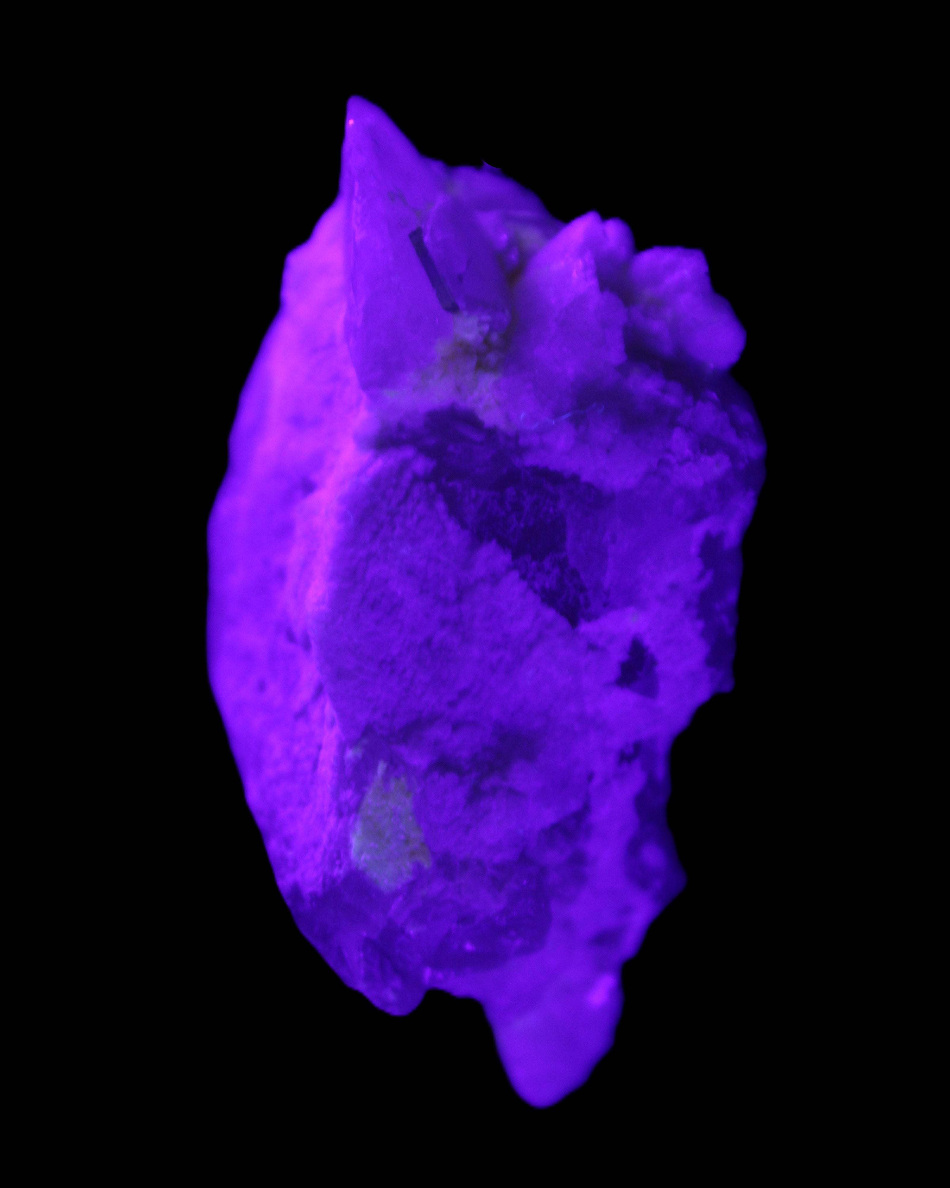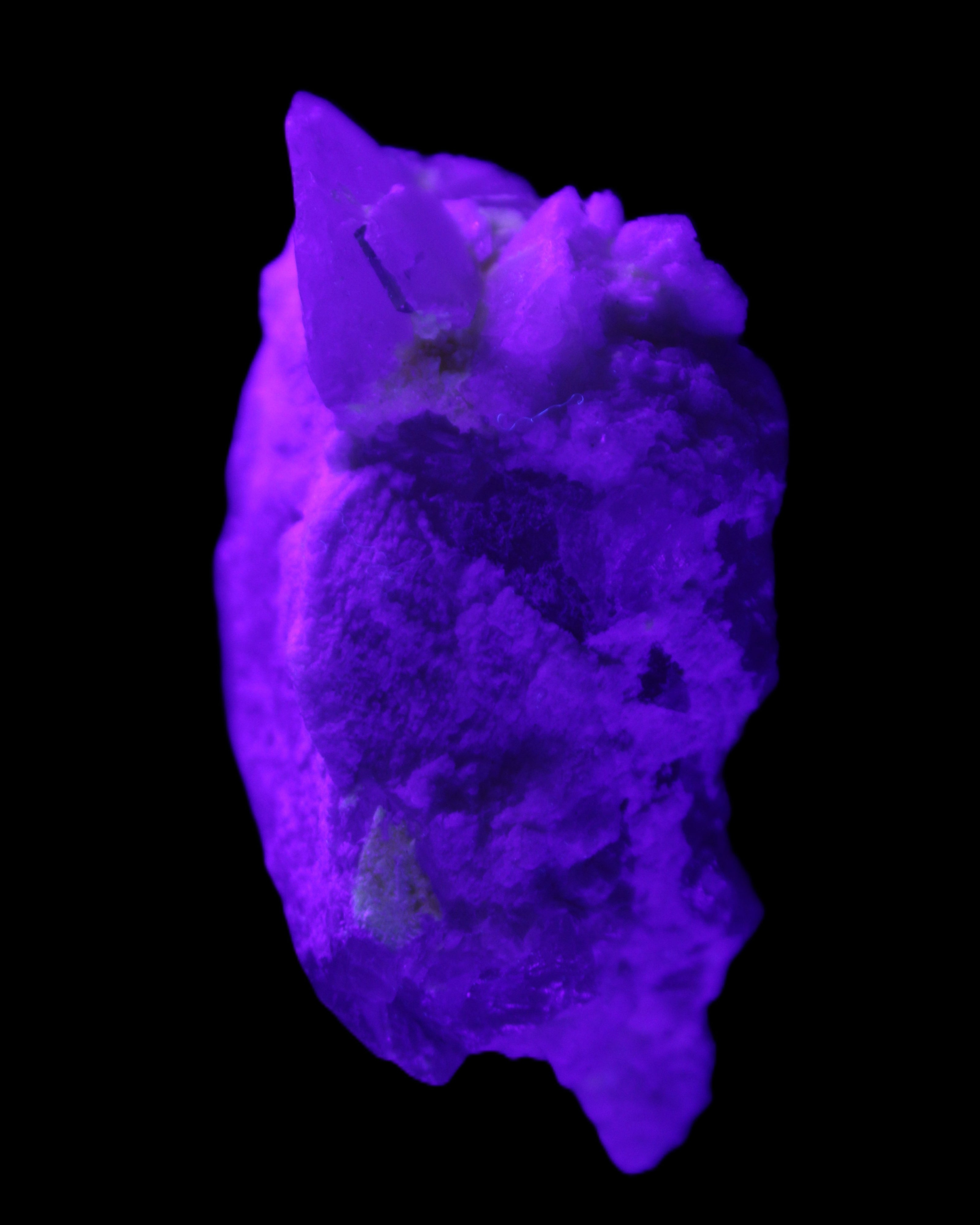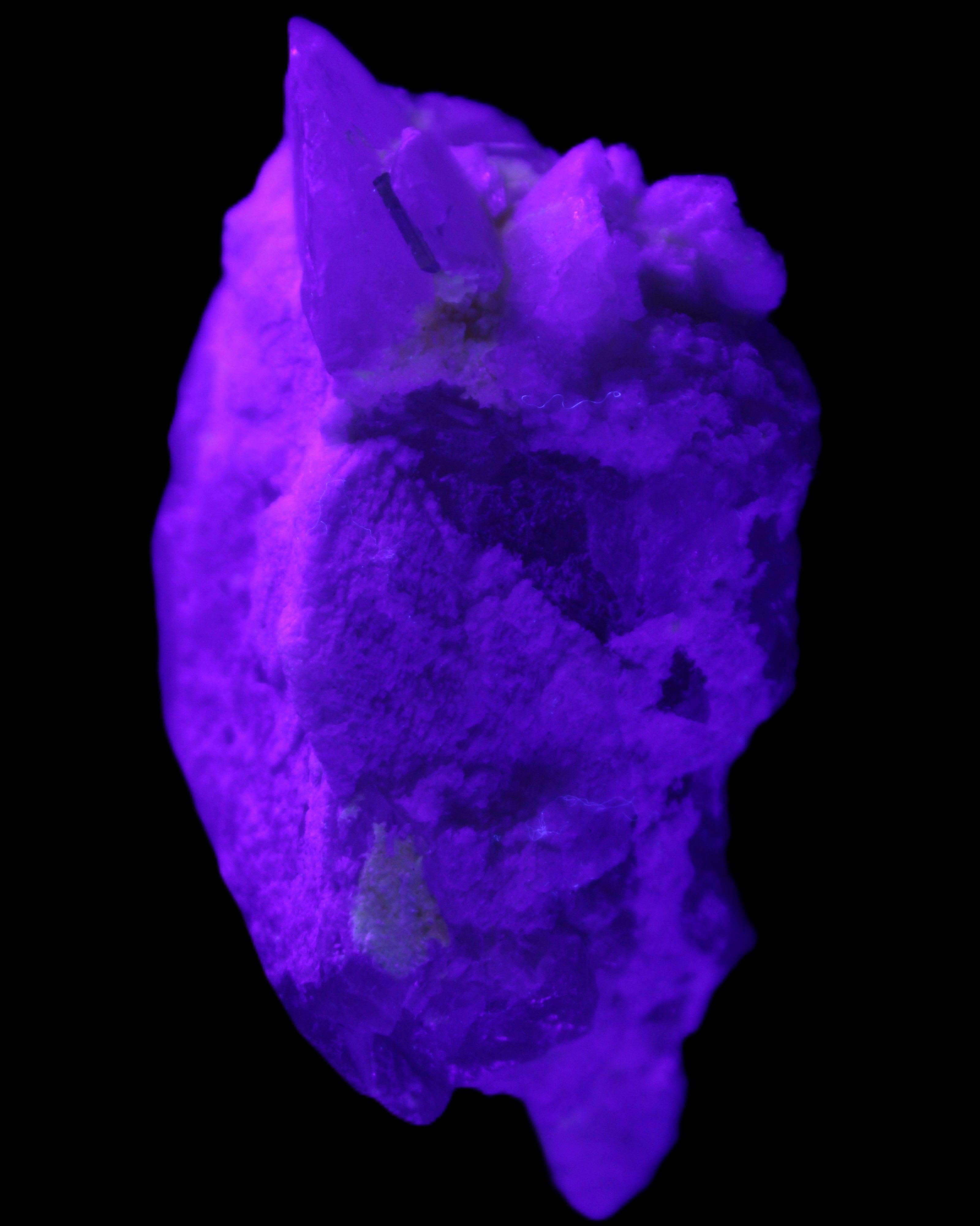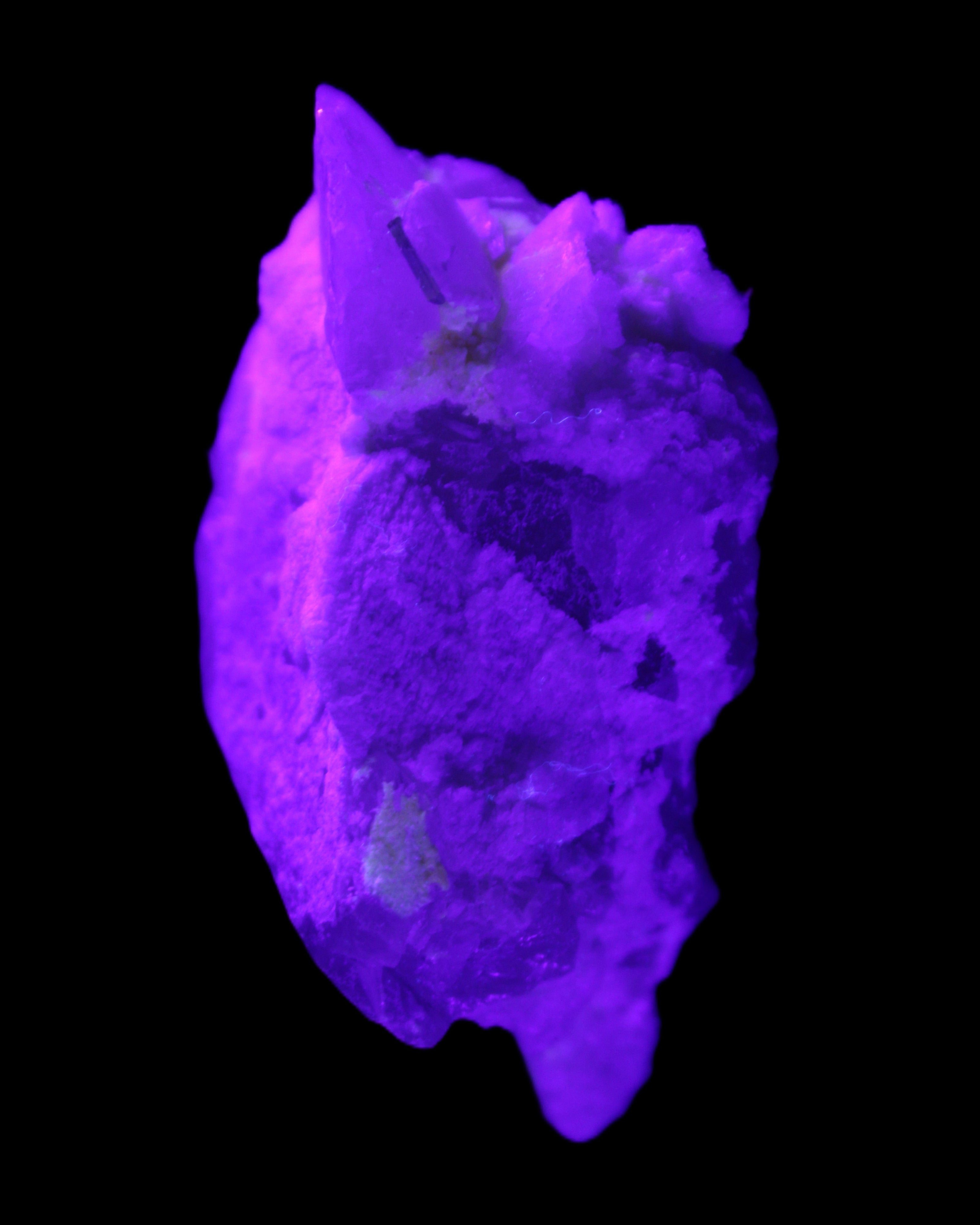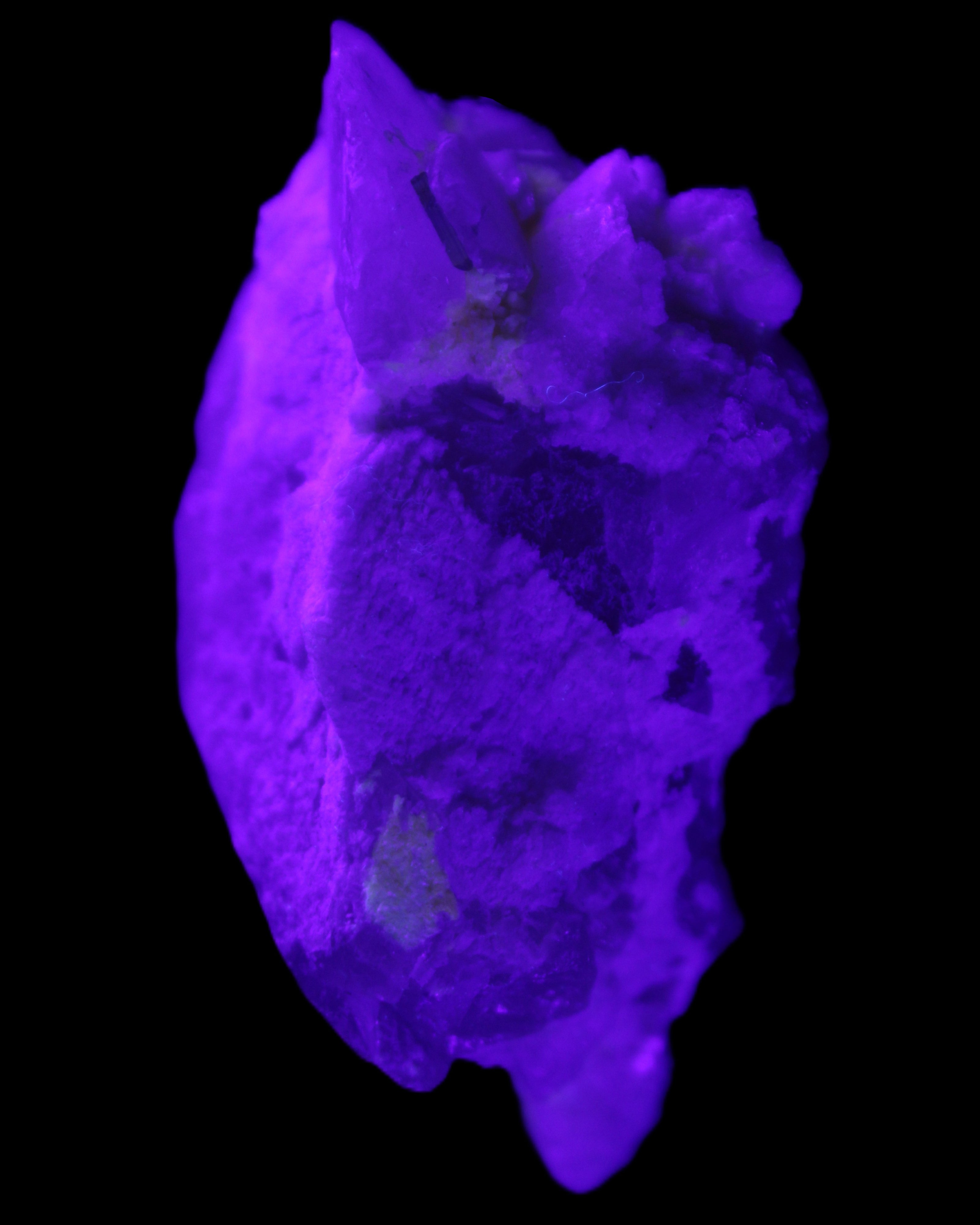 This Green Tourmaline on Elestial Quartz 64*30*30mm weighs 52g. This specimen was sourced in Afghanistan for us by our partner, Lawrence Handicrafts. Under UV light there is a crystal that reacts with yellow fluorescence. I suspect these spots are small Apatite crystals