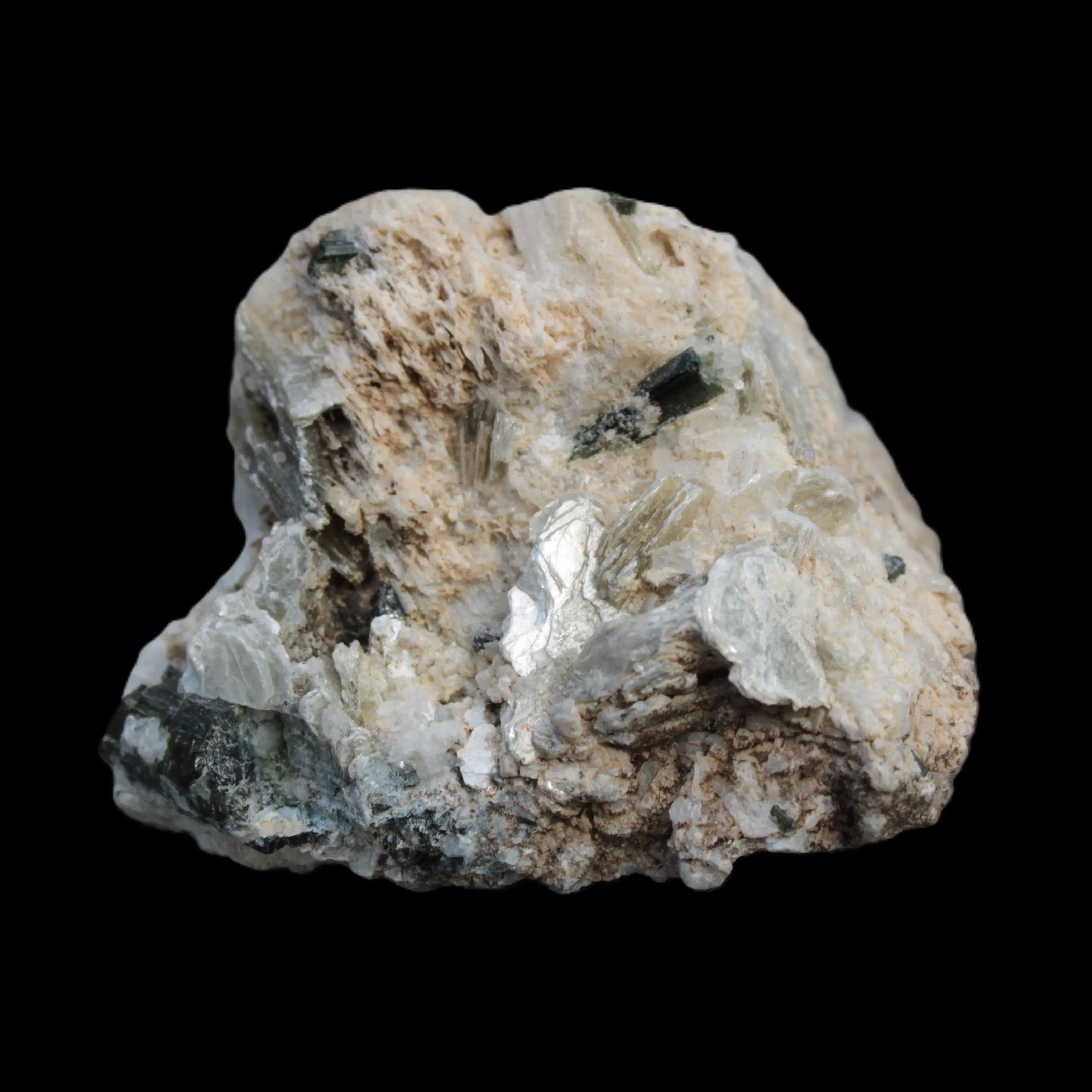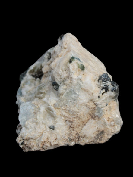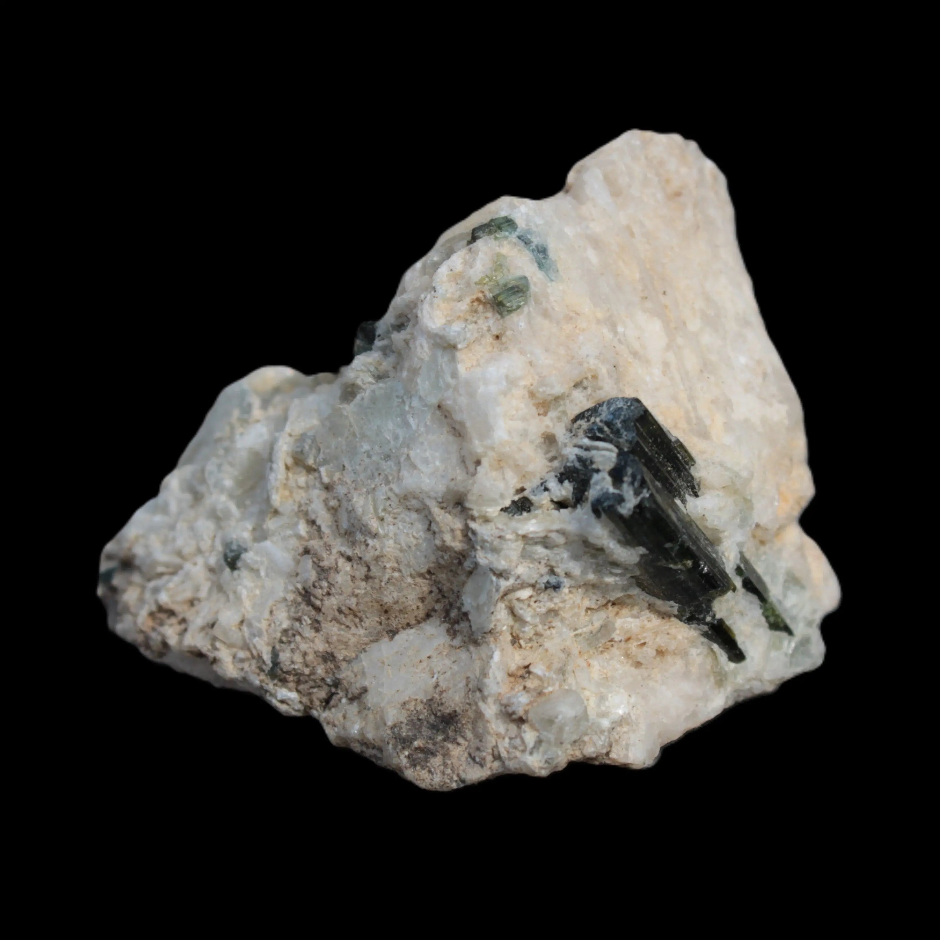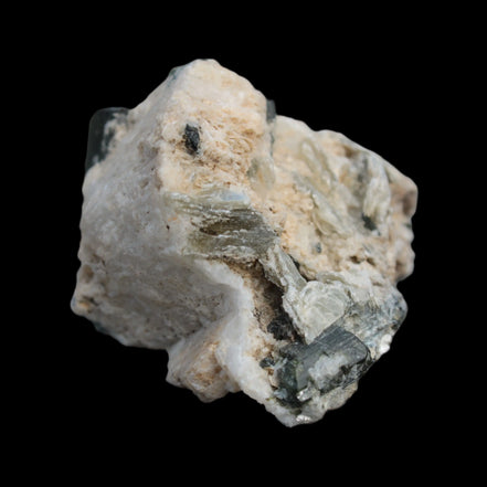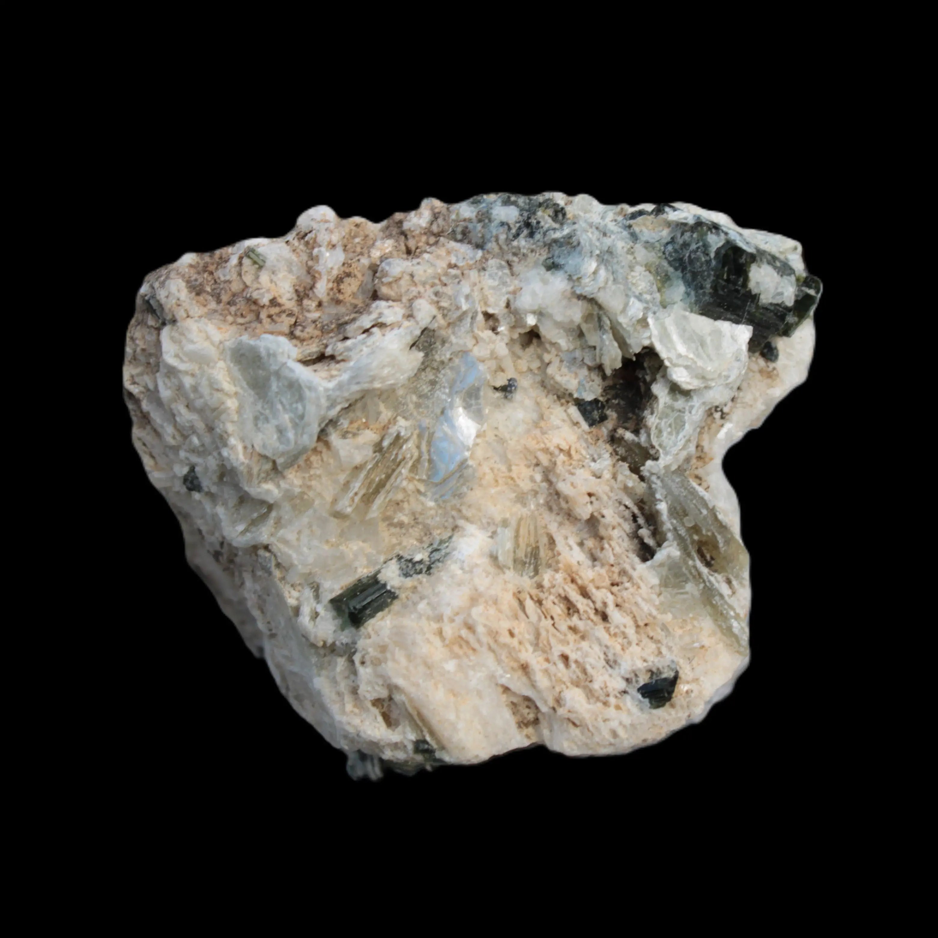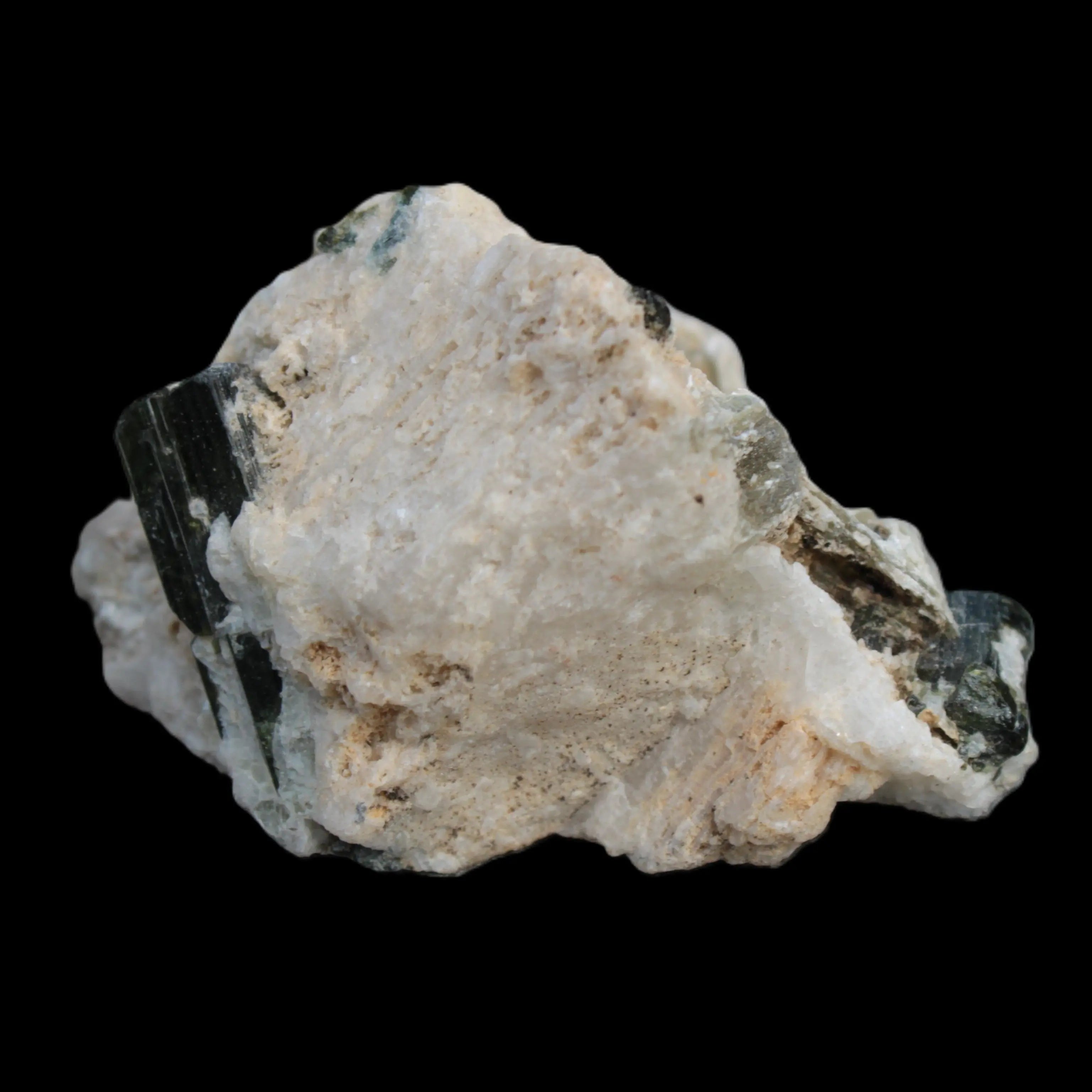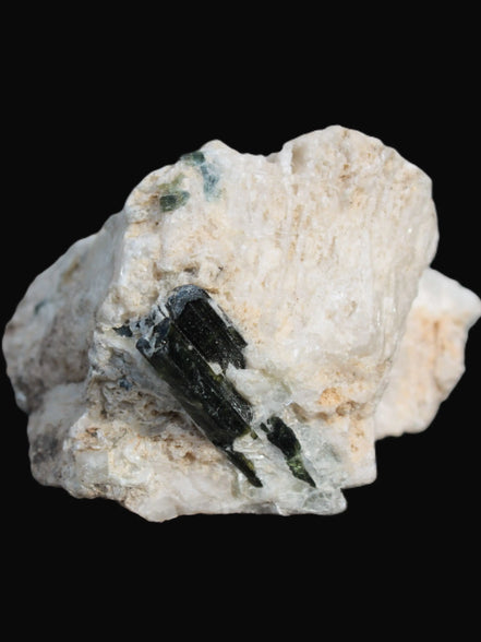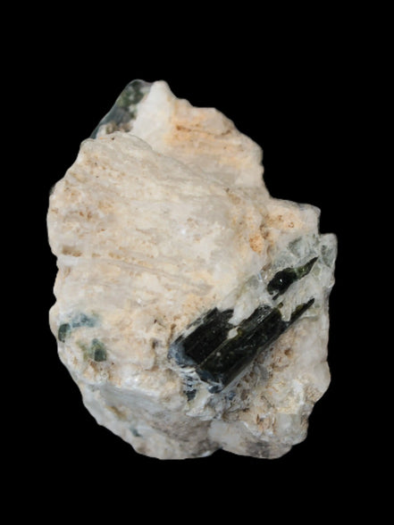 This specimen from Skardu is Green Tourmaline with Mica and Feldspar matrix. The mica includes Lepidolite. Green Tourmaline is a complex lithium rich borosilicate mineral and member of the Tourmaline family. It crystallizes in the form of elongated rods or triangular and pyramidal crystals. It is usually associated with Quartz.