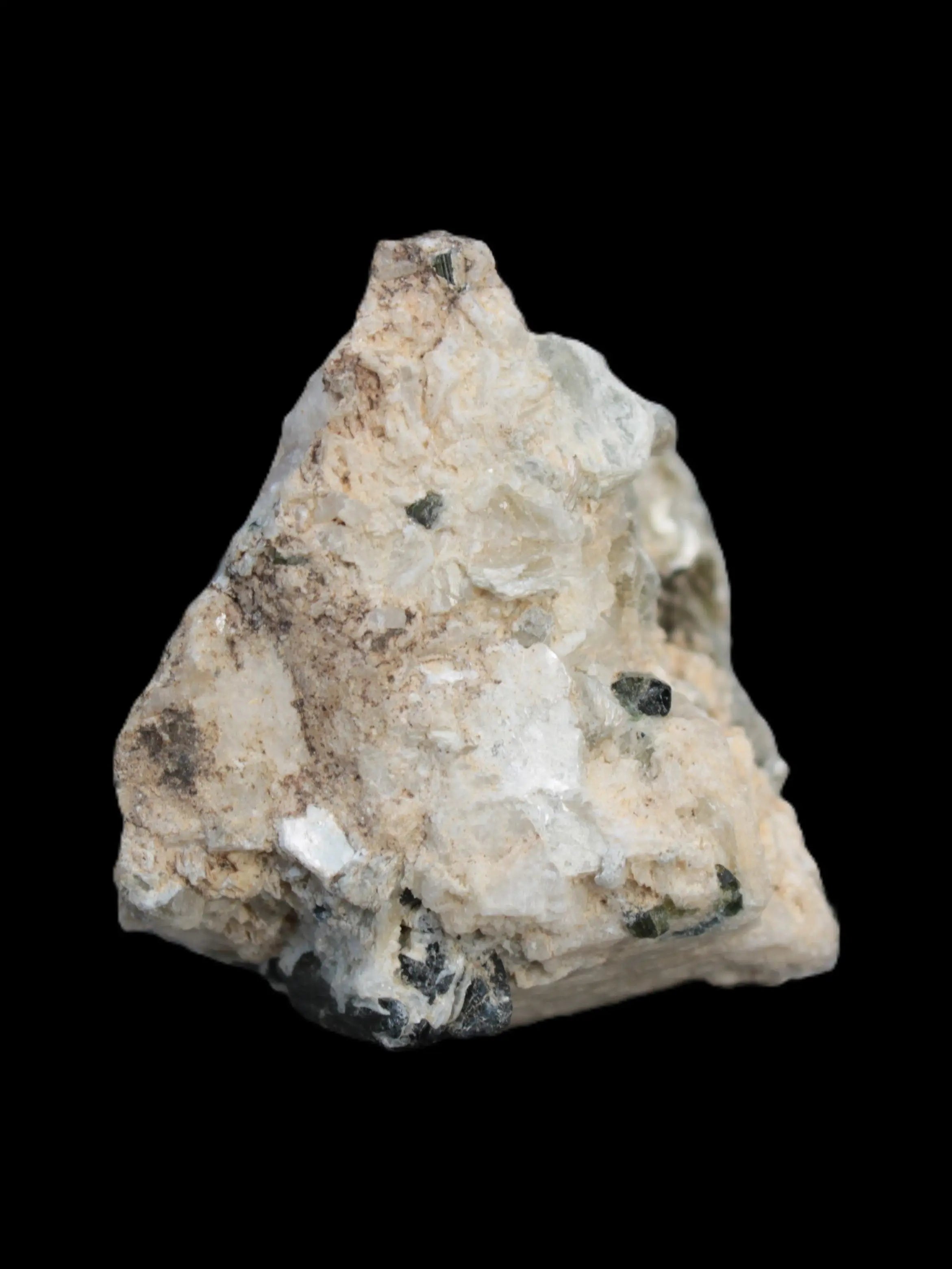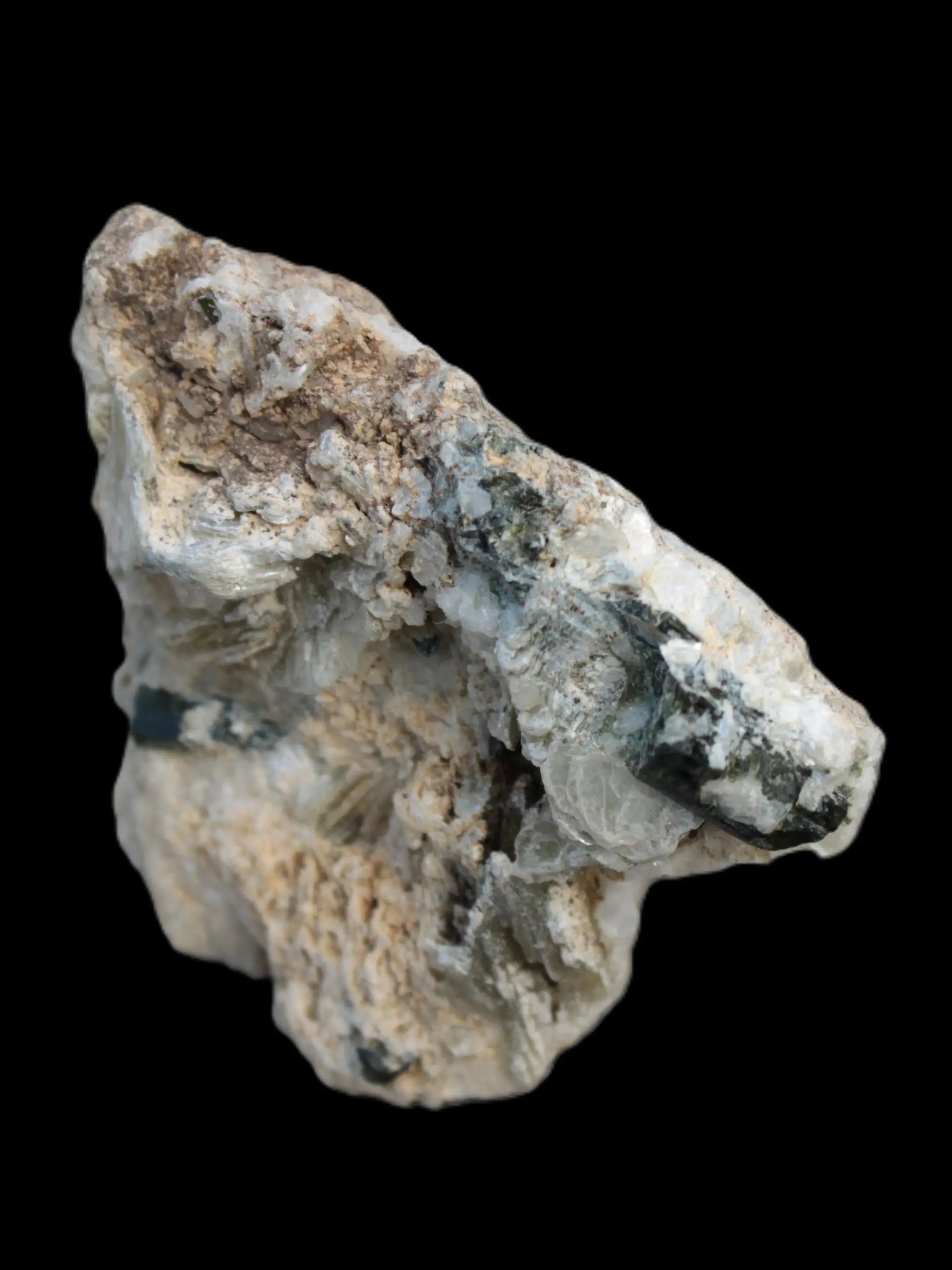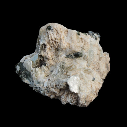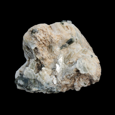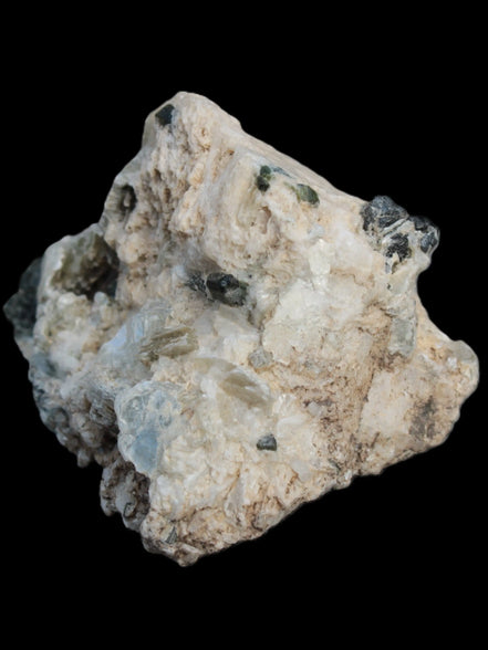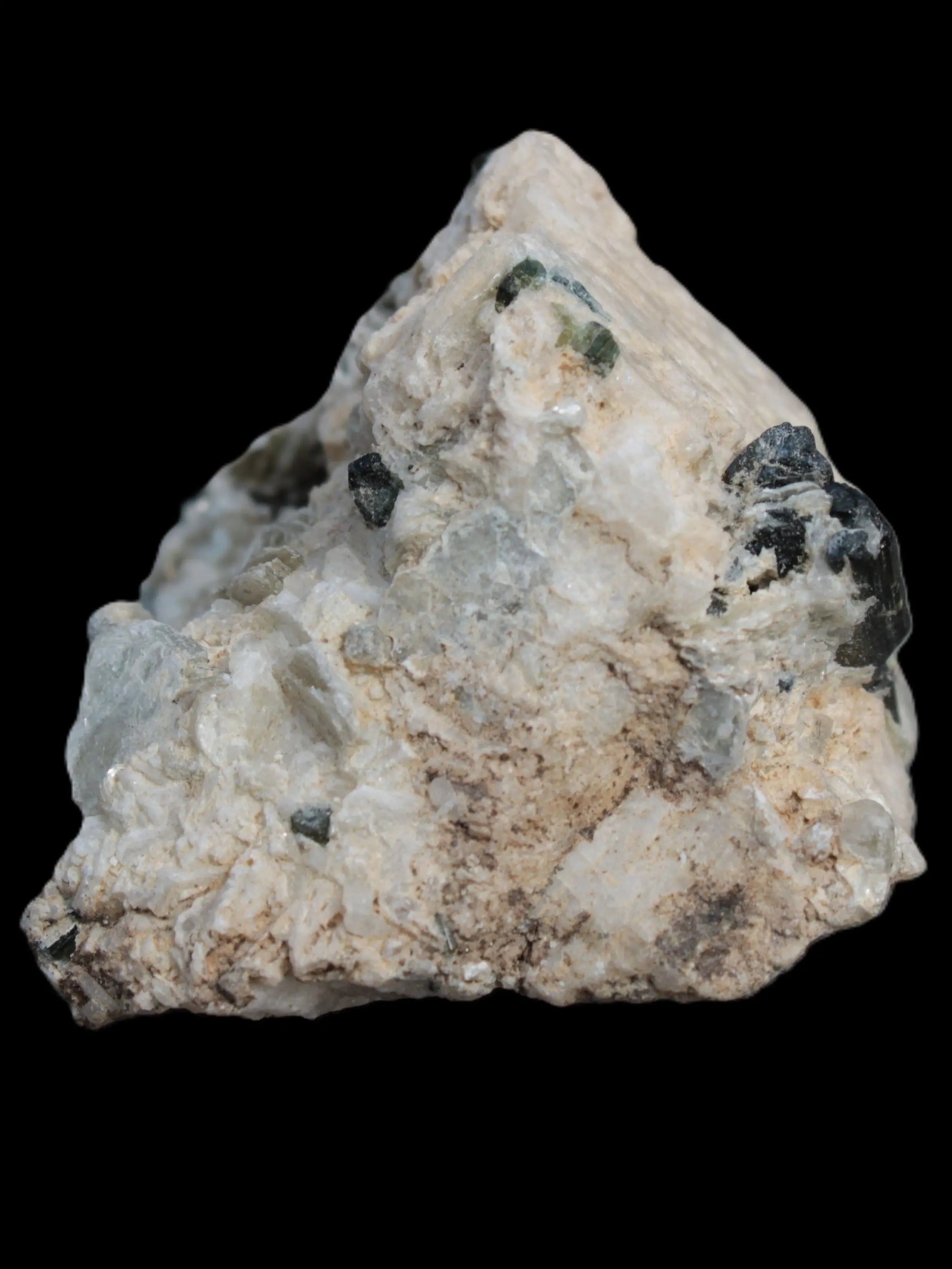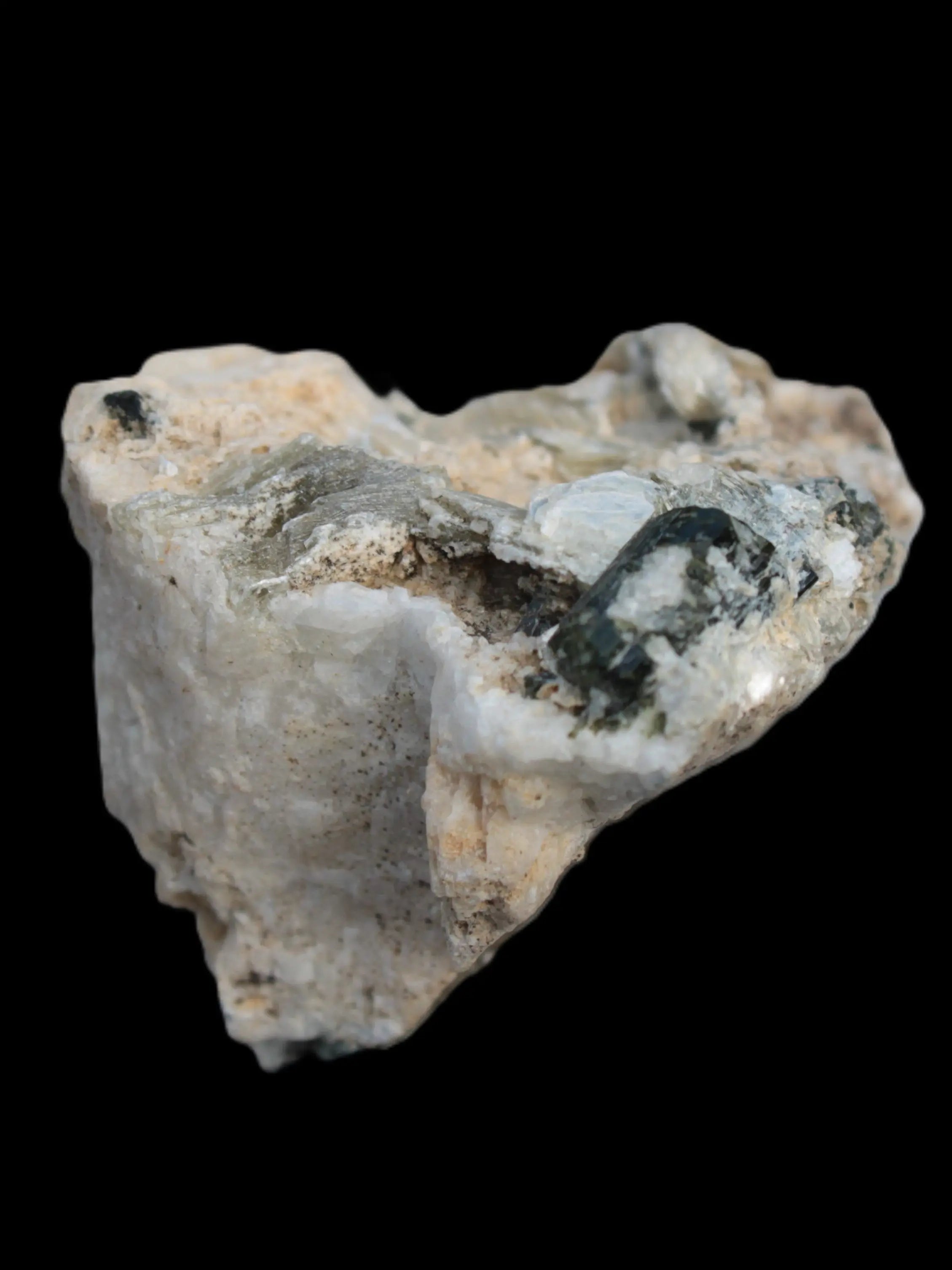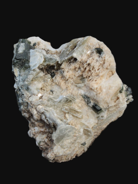 This specimen from Skardu is Green Tourmaline with Mica and Feldspar matrix. The mica includes Lepidolite. Green Tourmaline is a complex lithium rich borosilicate mineral and member of the Tourmaline family. It crystallizes in the form of elongated rods or triangular and pyramidal crystals. It is usually associated with Quartz.