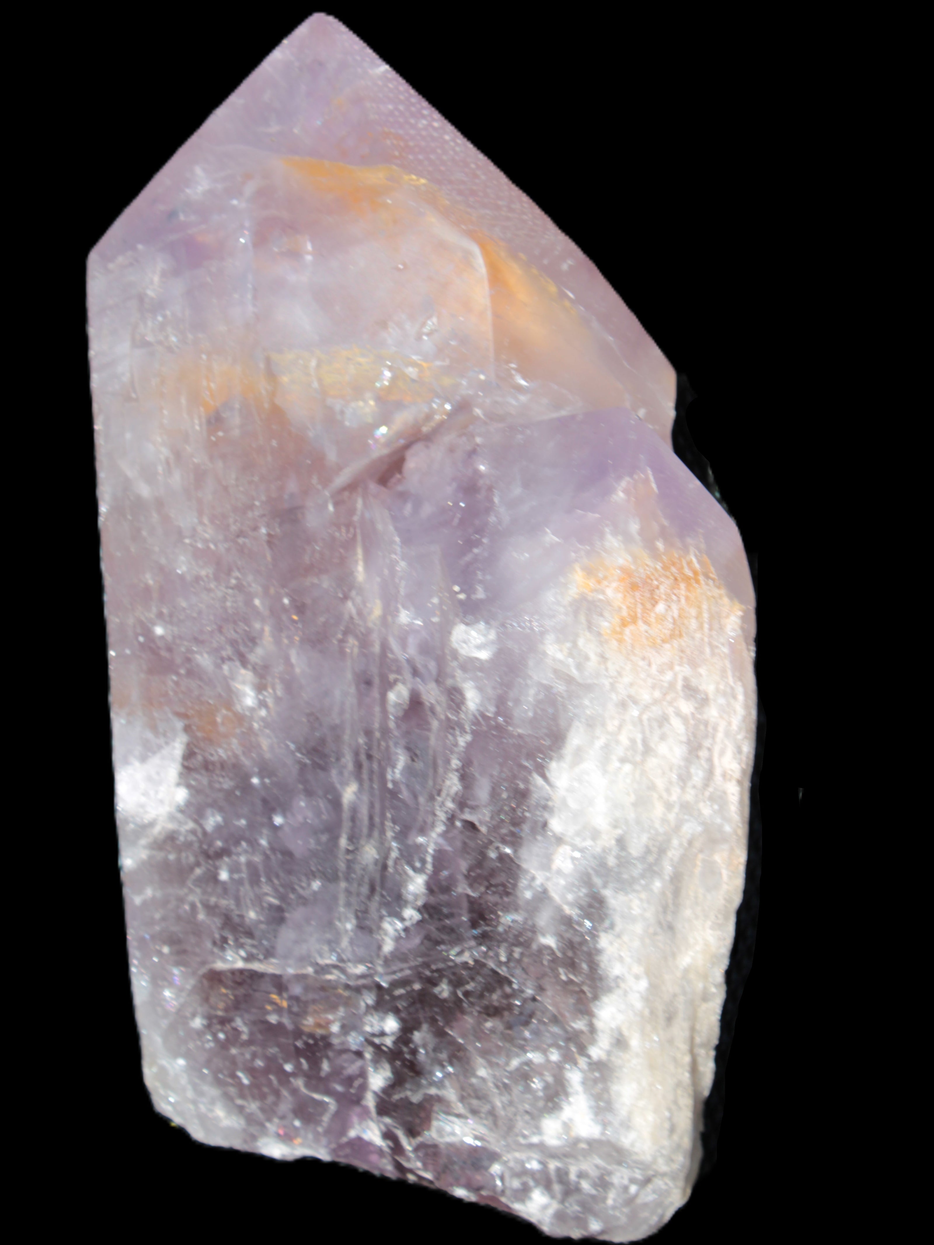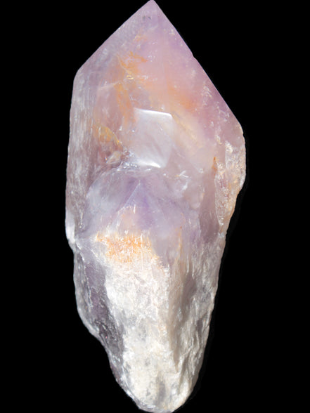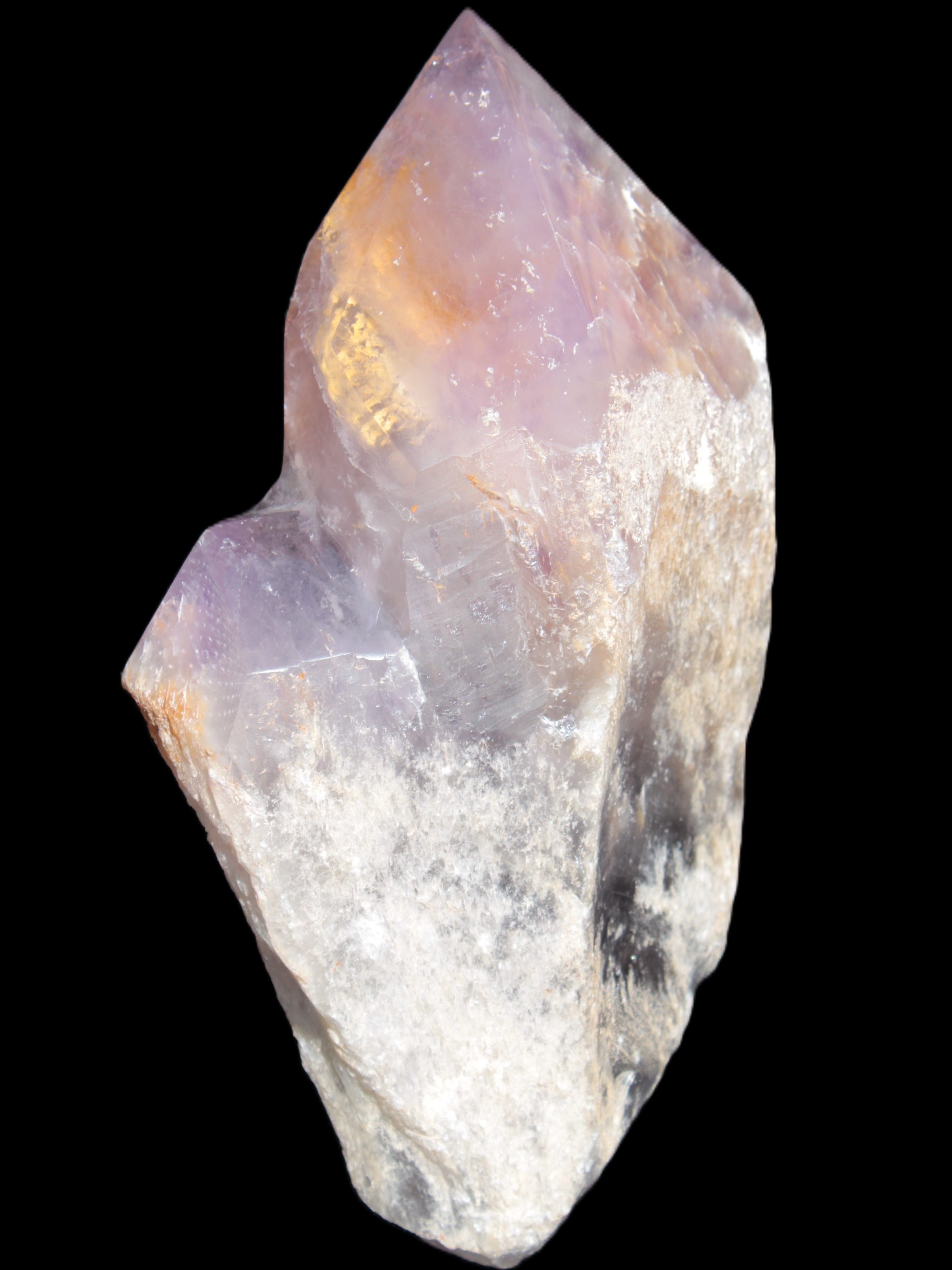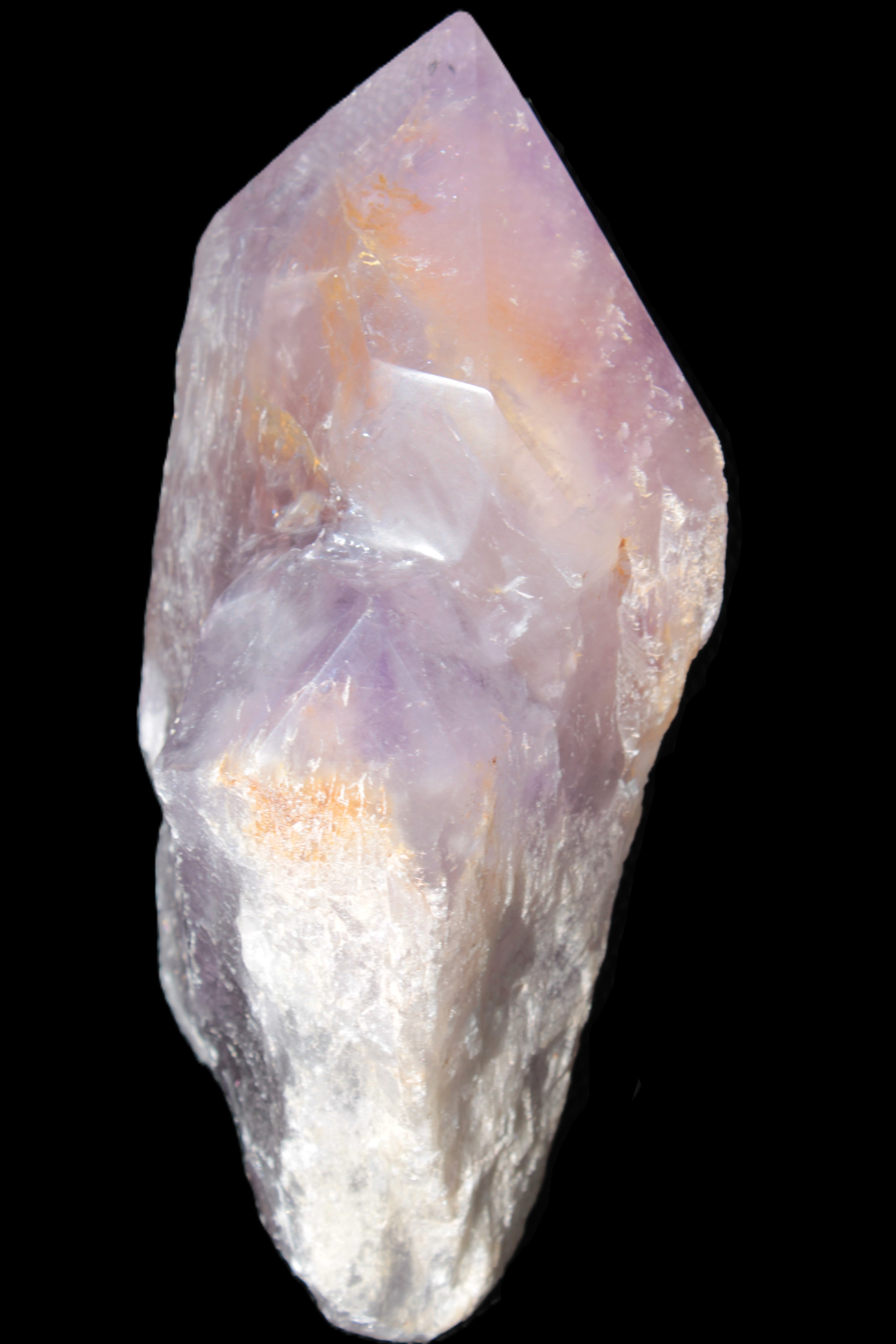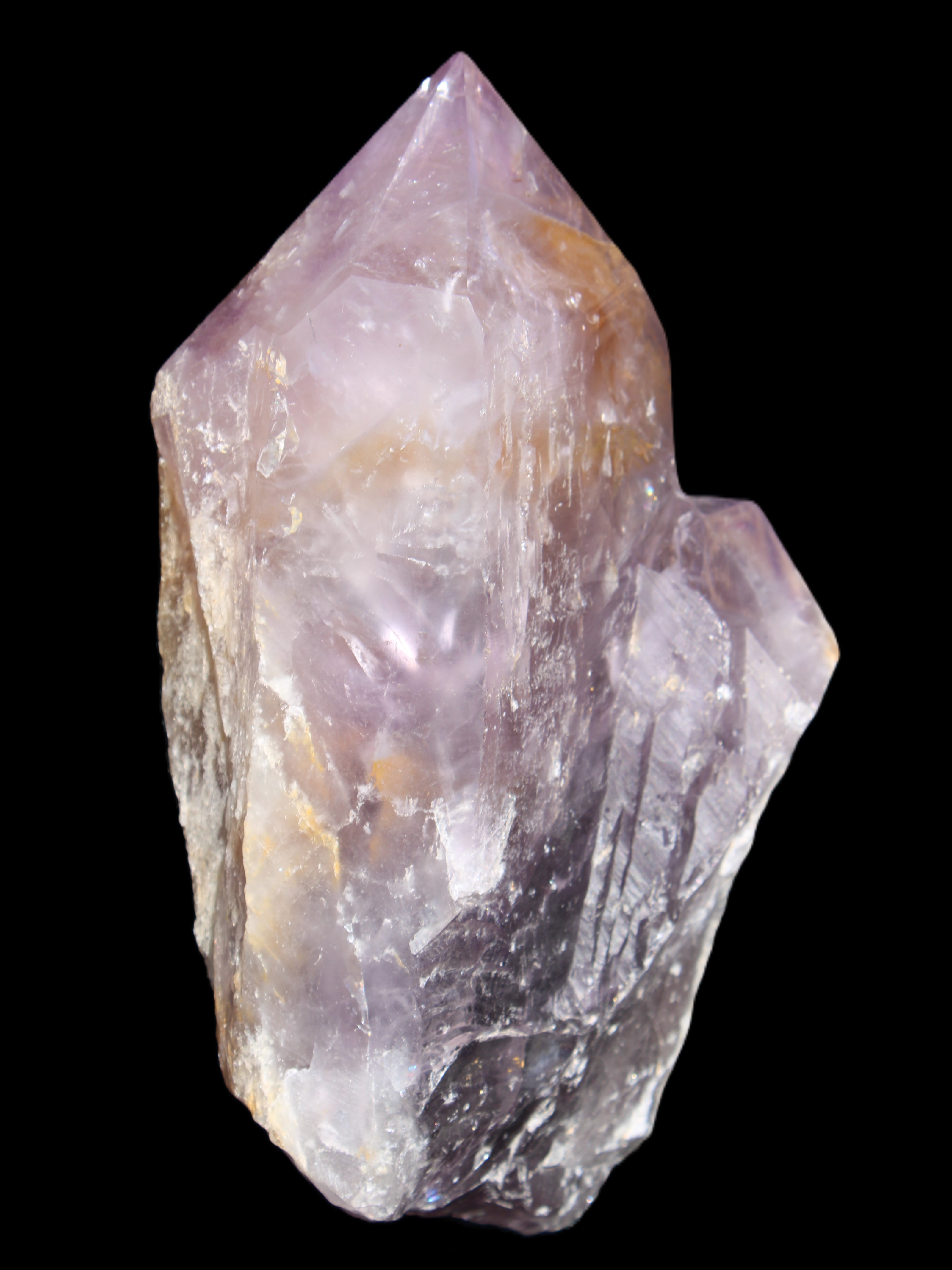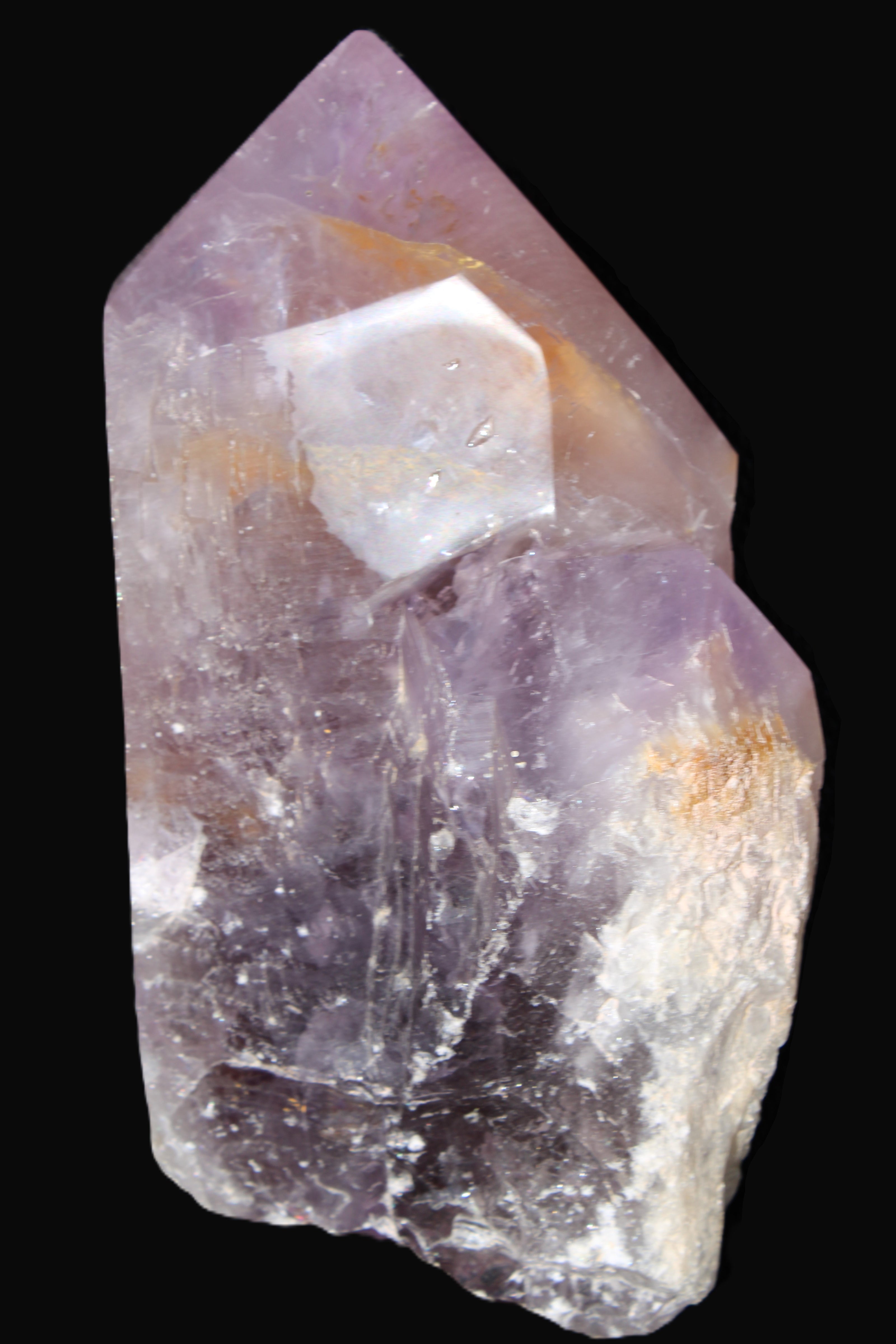 This is a huge Amethyst twinned crystal. The main crystal is 225mm tall. Its smaller twin is 16mm high. The width of the two crystals at the base is 110mm. It is a little wider towards the tip of the smaller twin. Together, they are about 100 mm deep or thick. There are some strong hints of Citrine in this amazing crystal too.