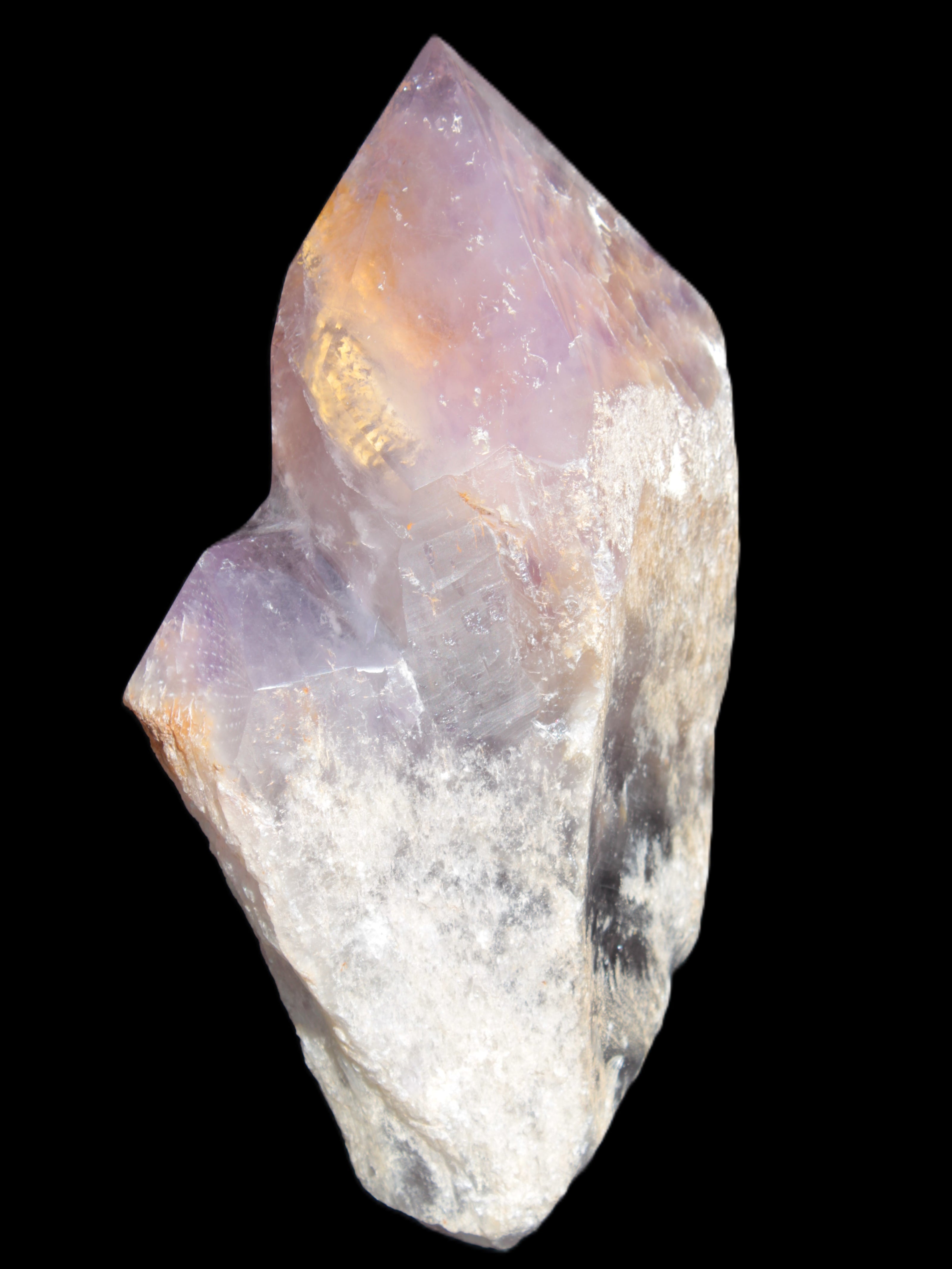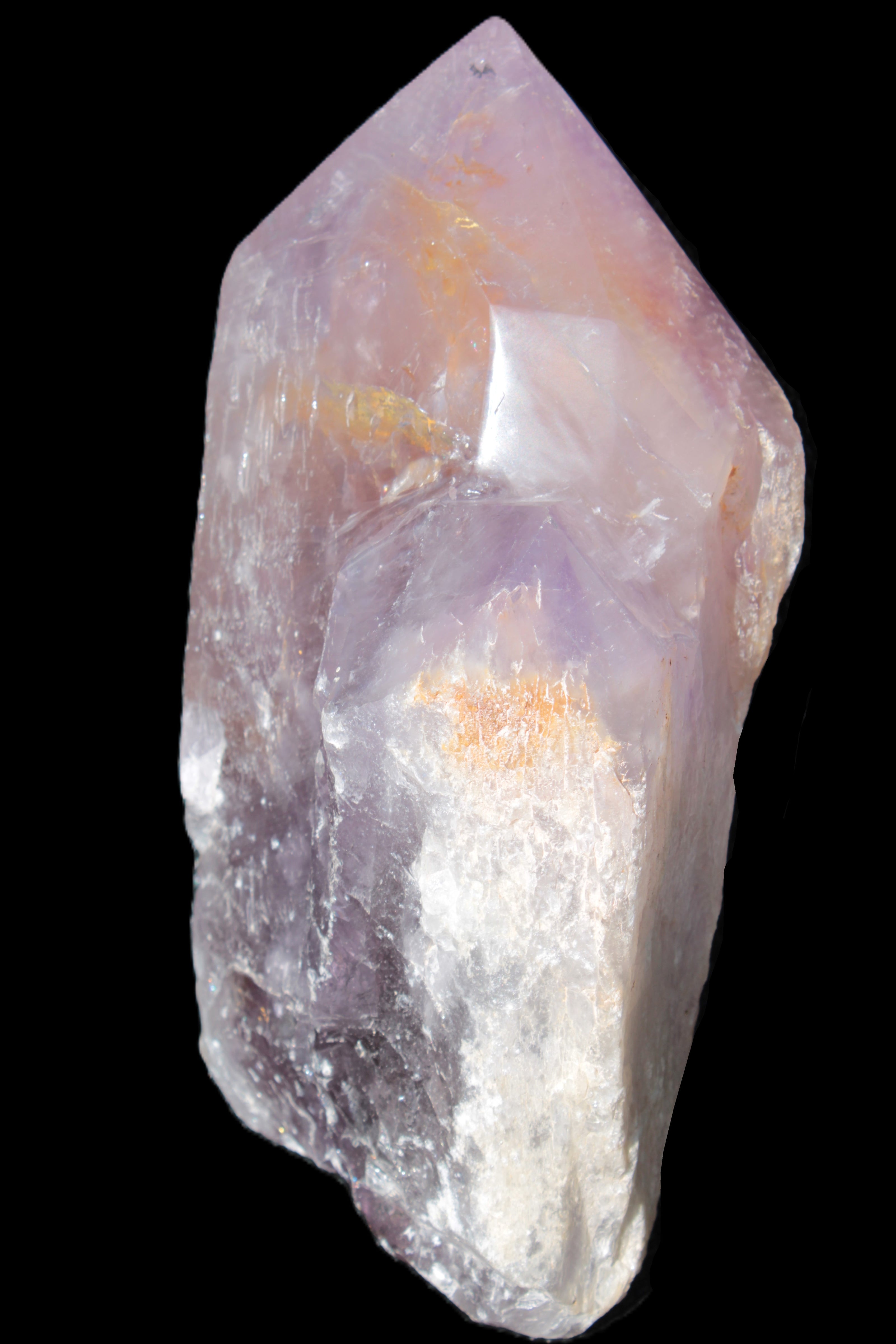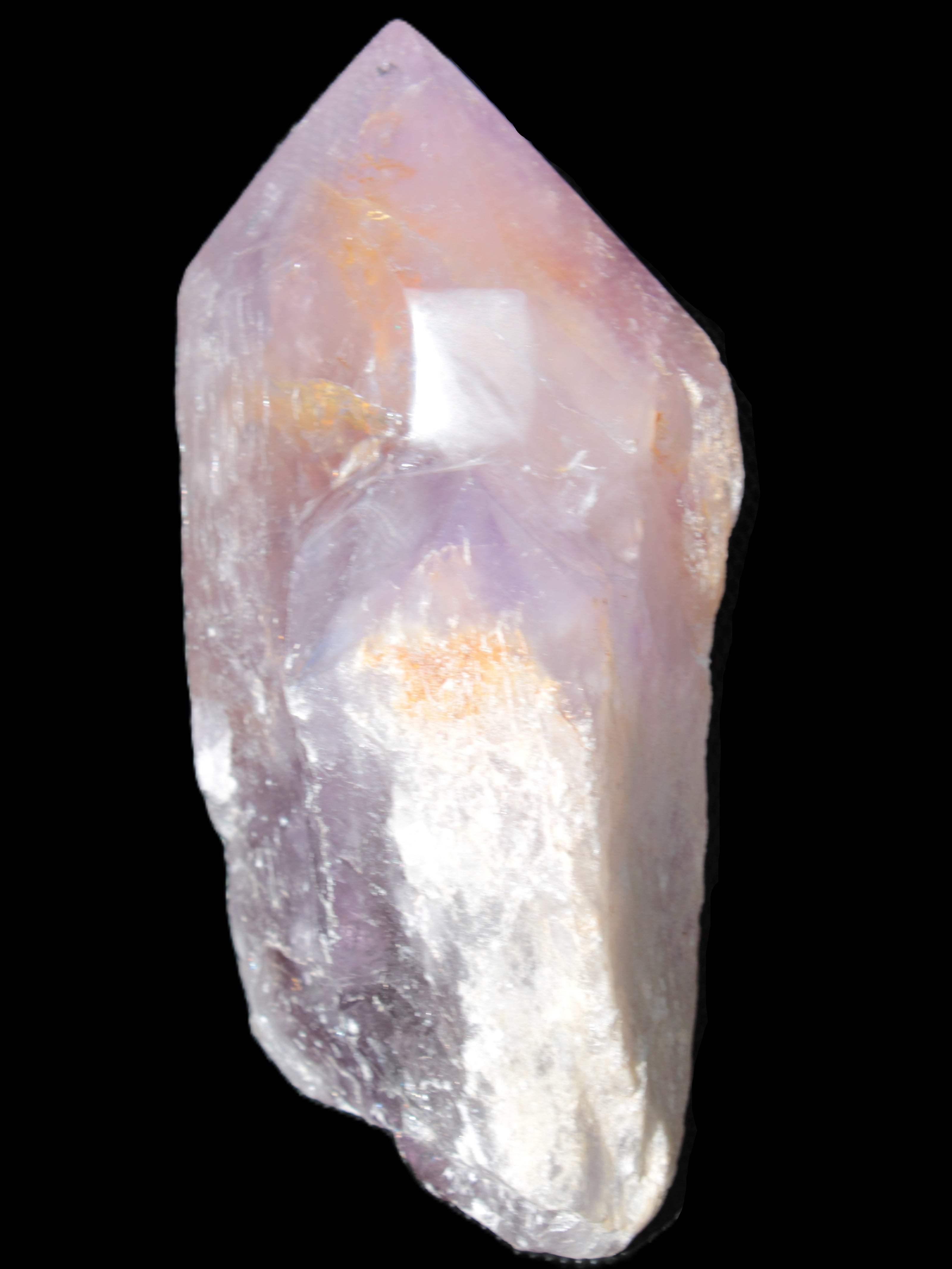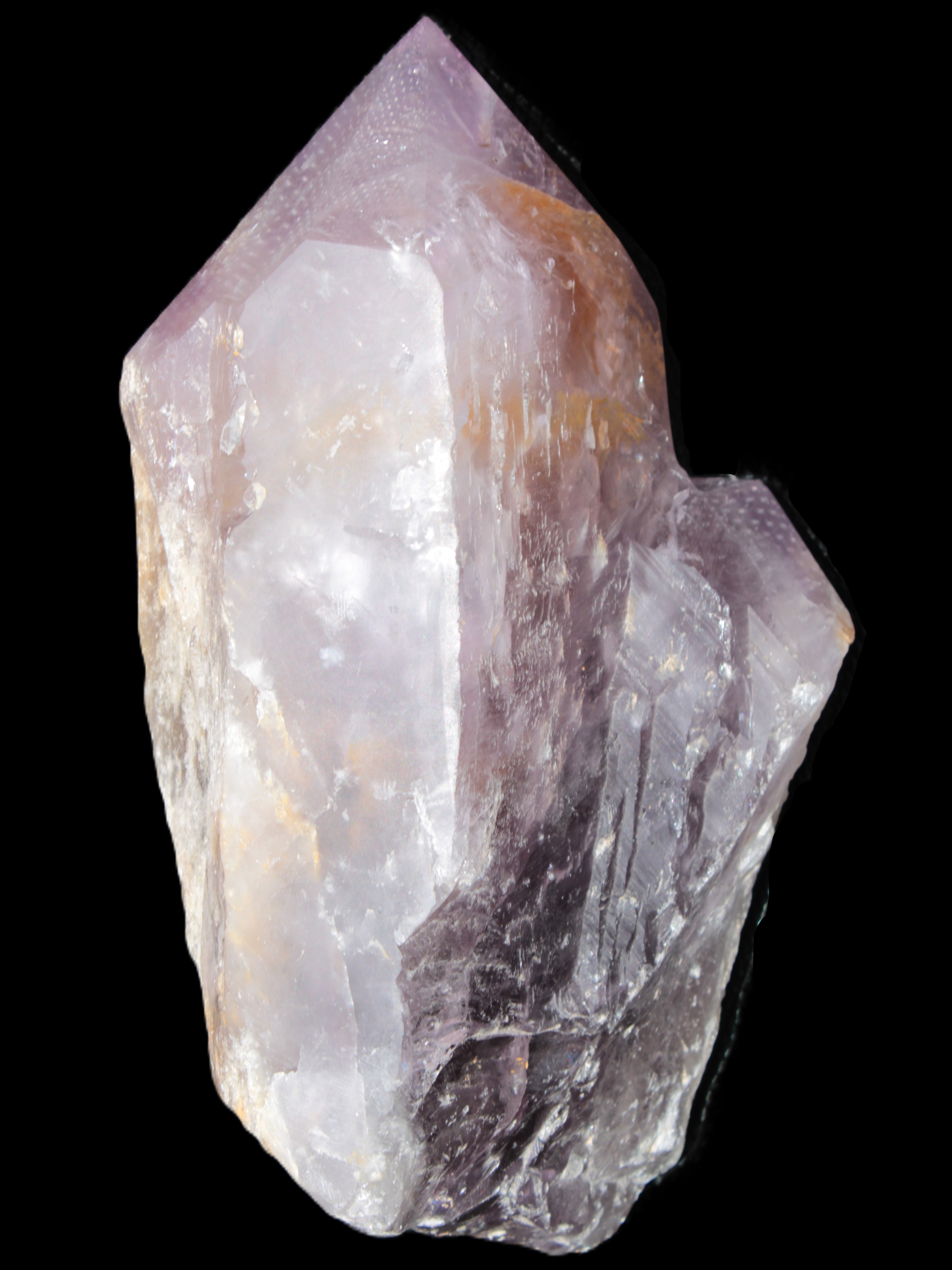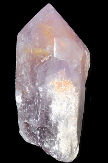 This is a huge Amethyst twinned crystal. The main crystal is 225mm tall. Its smaller twin is 16mm high. The width of the two crystals at the base is 110mm. It is a little wider towards the tip of the smaller twin. Together, they are about 100 mm deep or thick. There are some strong hints of Citrine in this amazing crystal too.