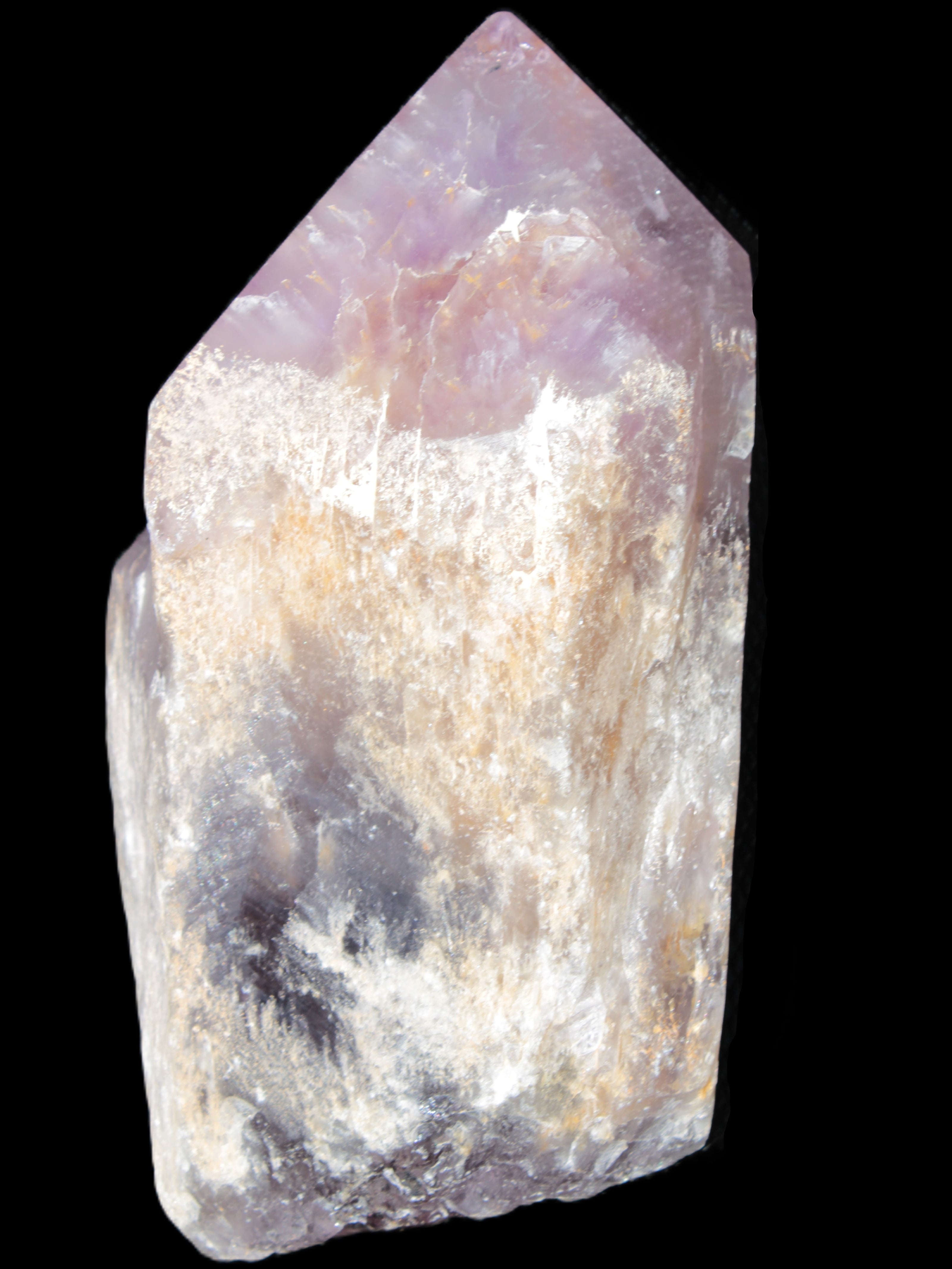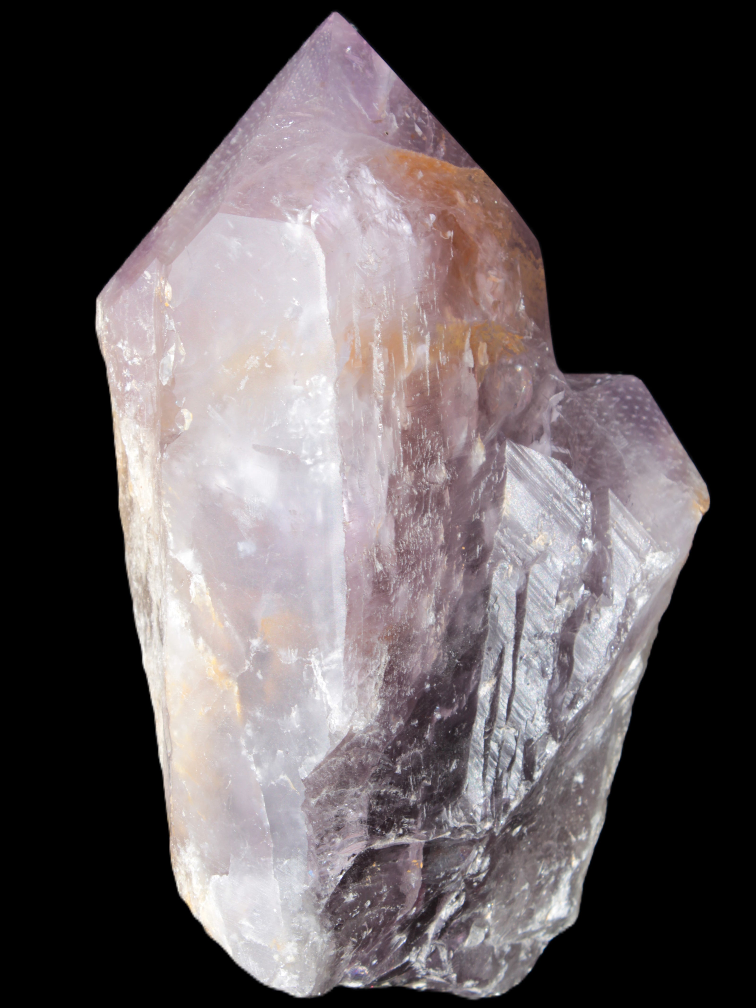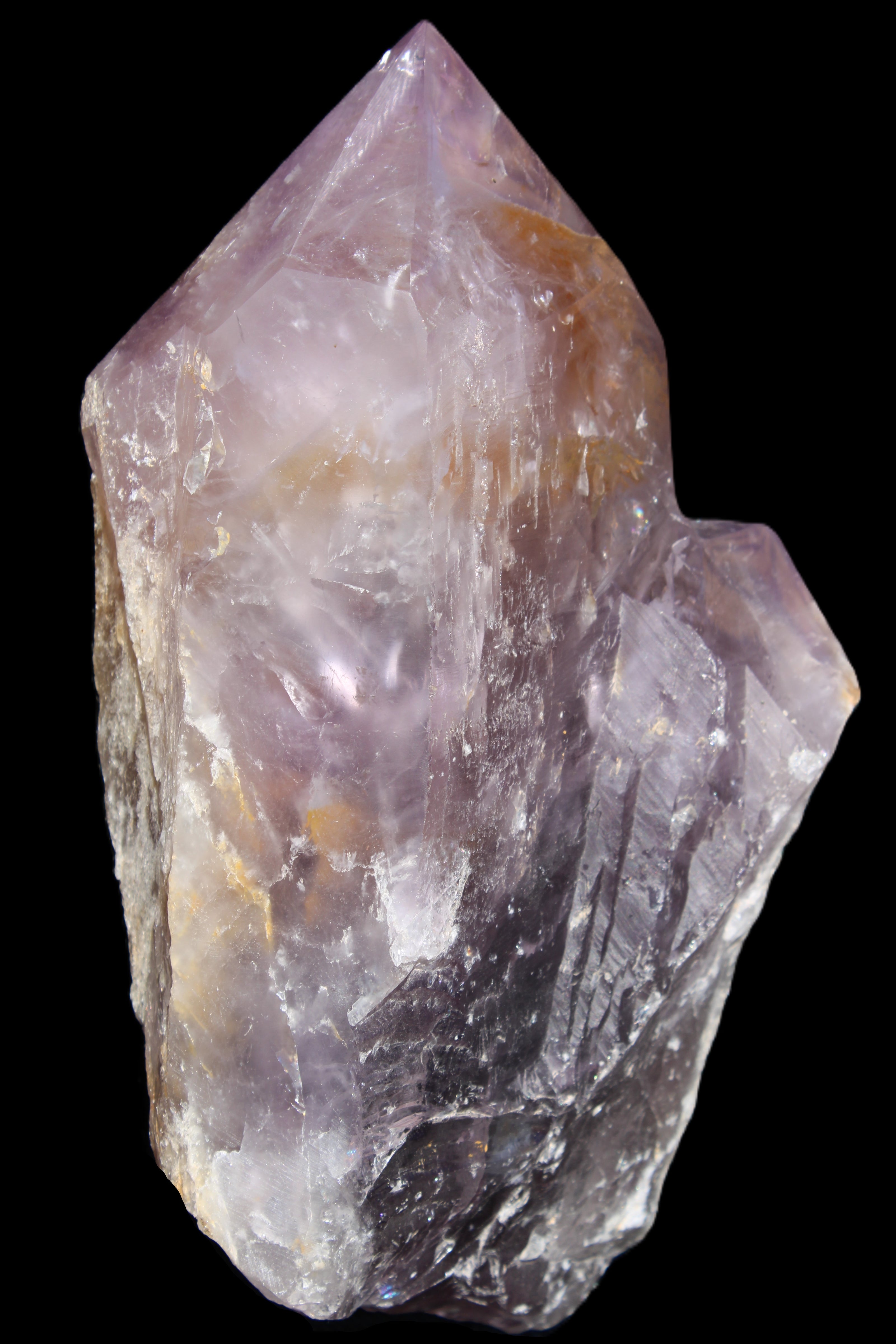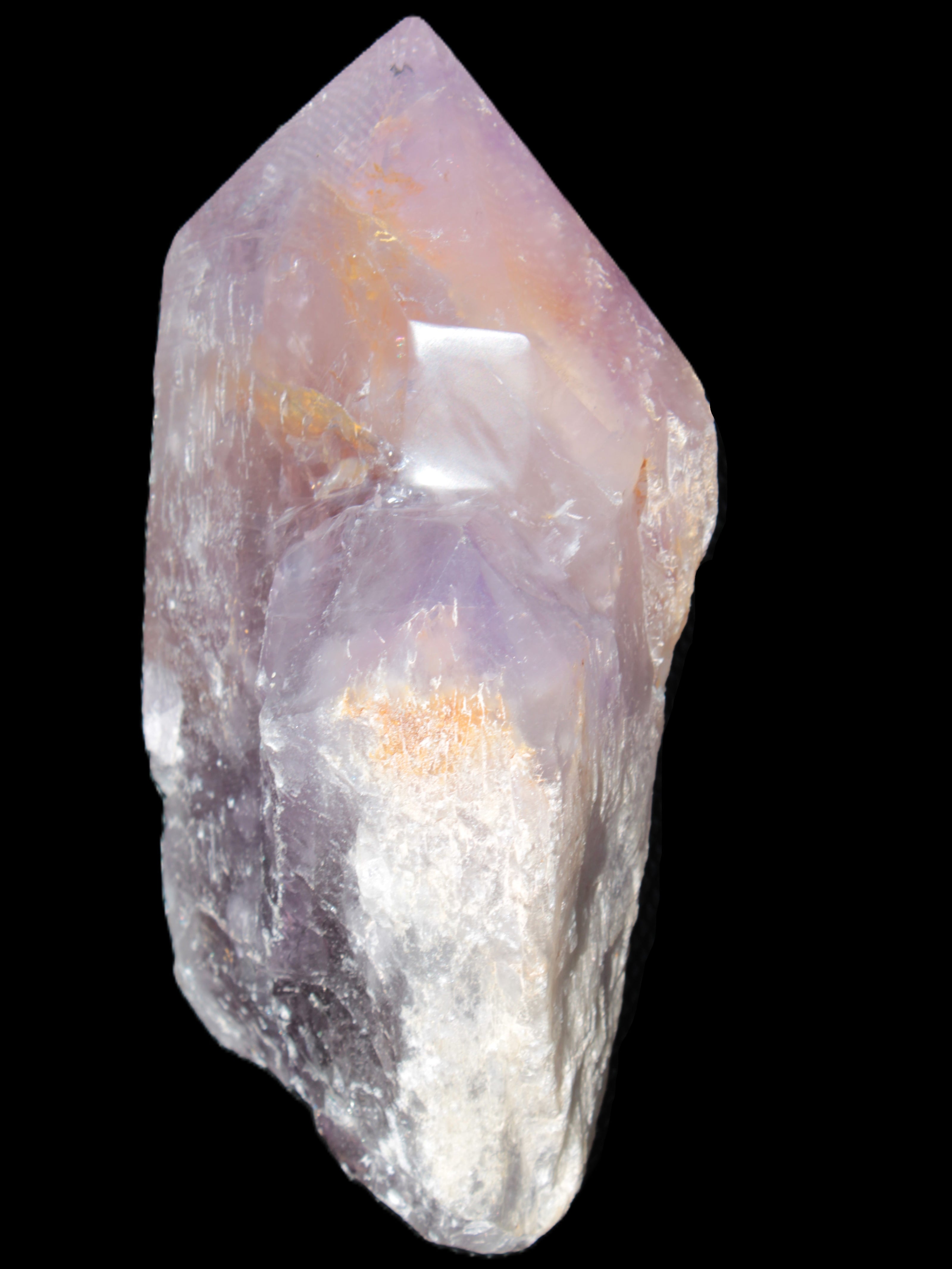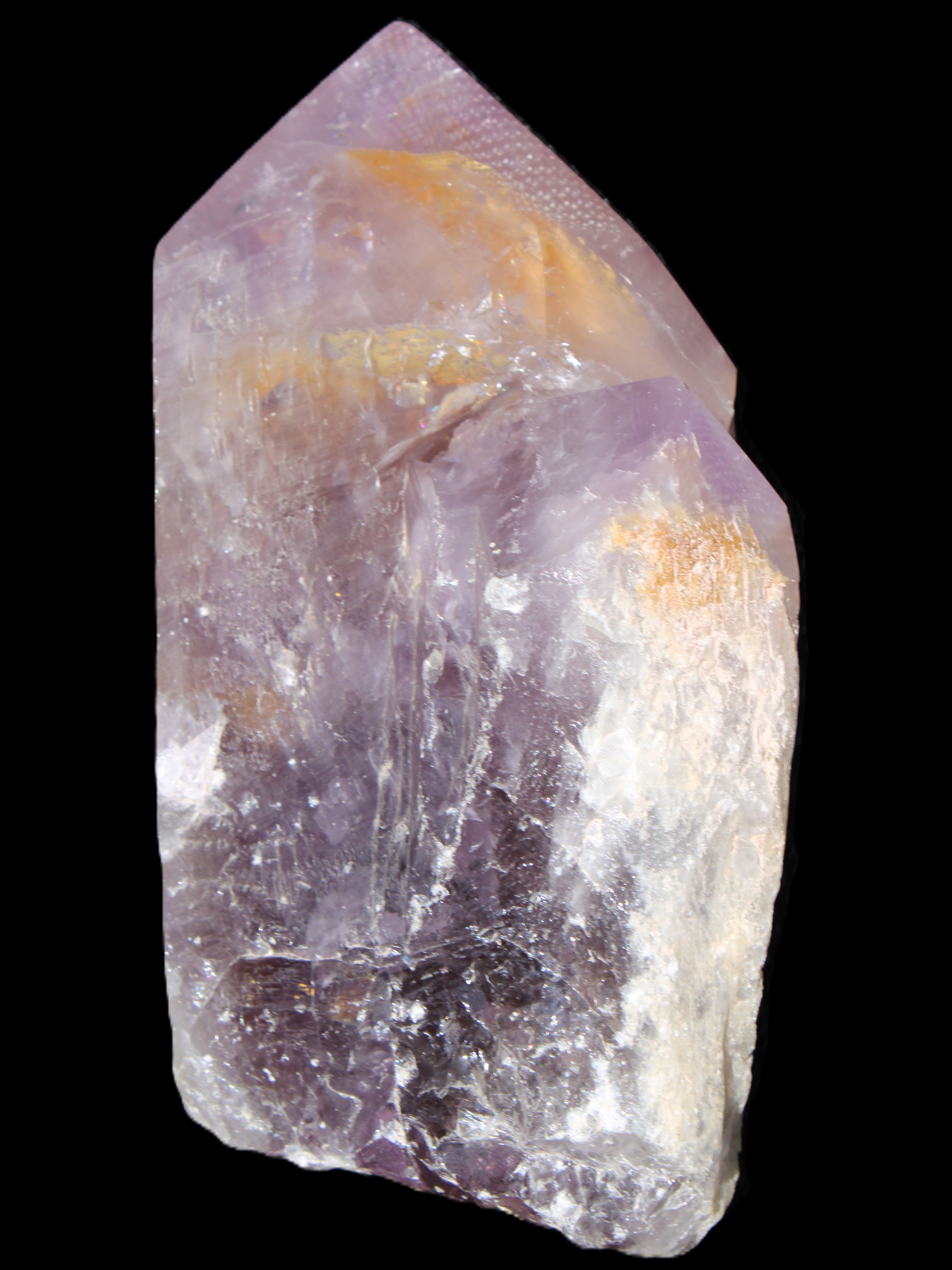 This is a huge Amethyst twinned crystal. The main crystal is 225mm tall. Its smaller twin is 16mm high. The width of the two crystals at the base is 110mm. It is a little wider towards the tip of the smaller twin. Together, they are about 100 mm deep or thick. There are some strong hints of Citrine in this amazing crystal too.