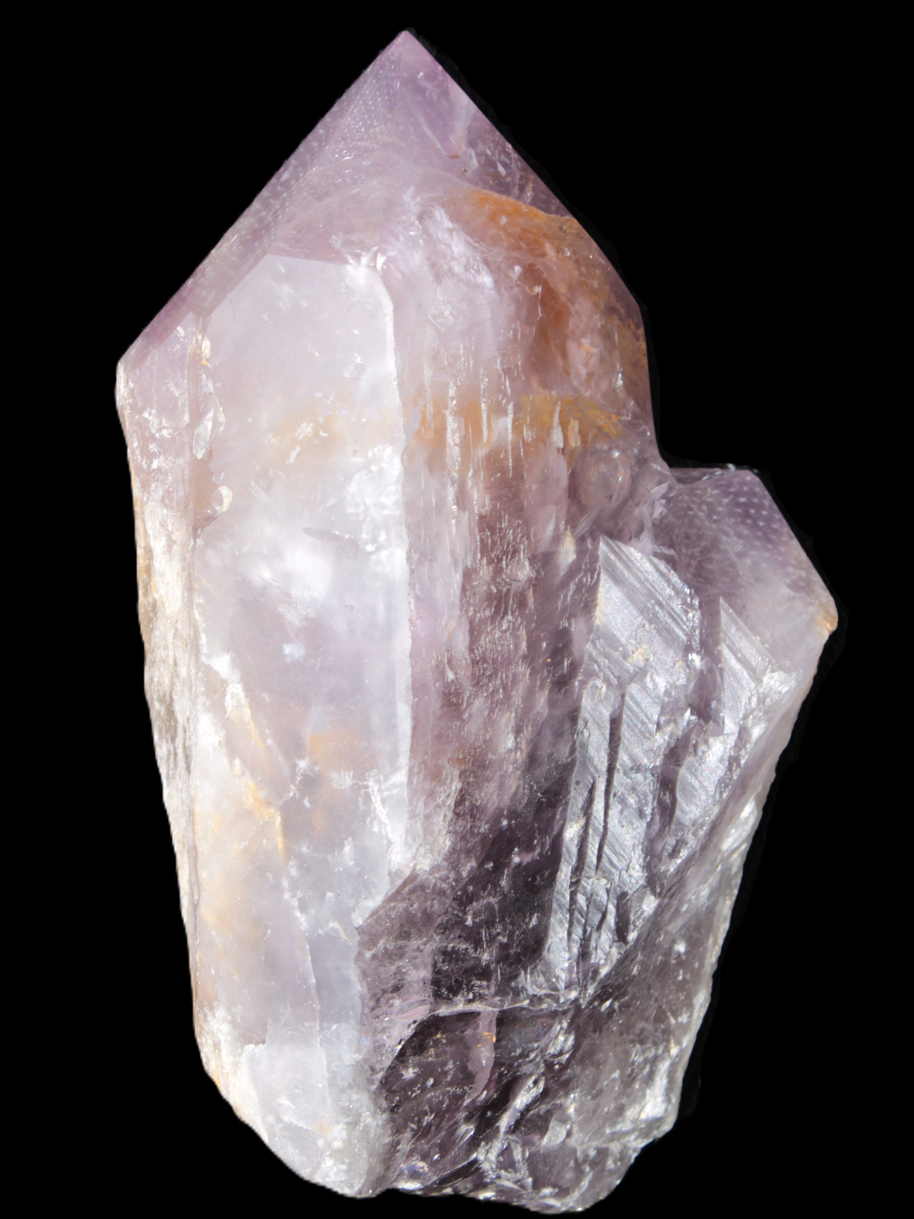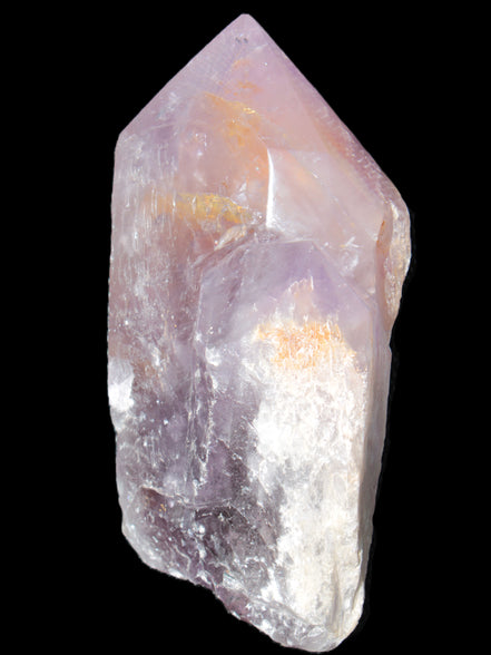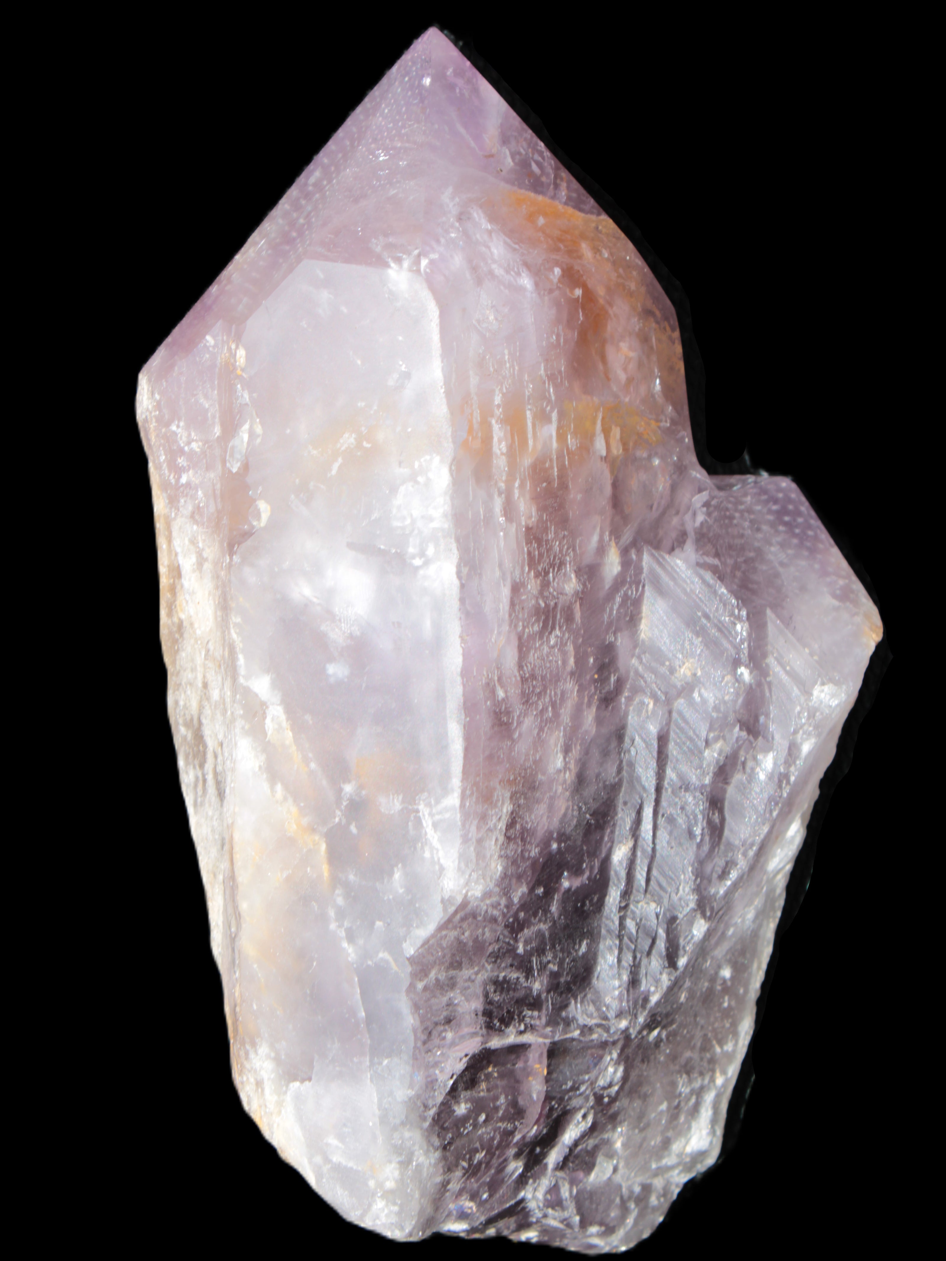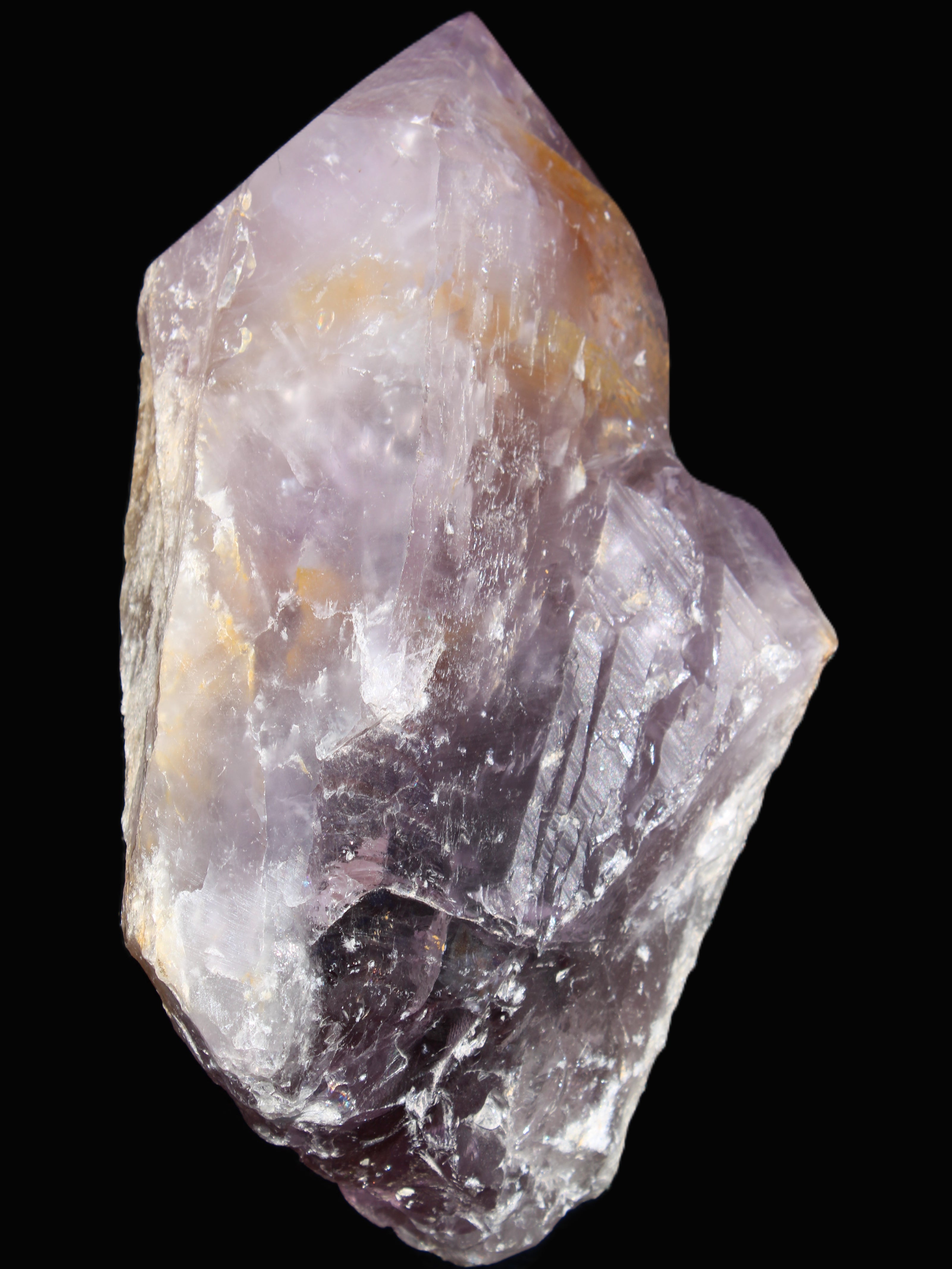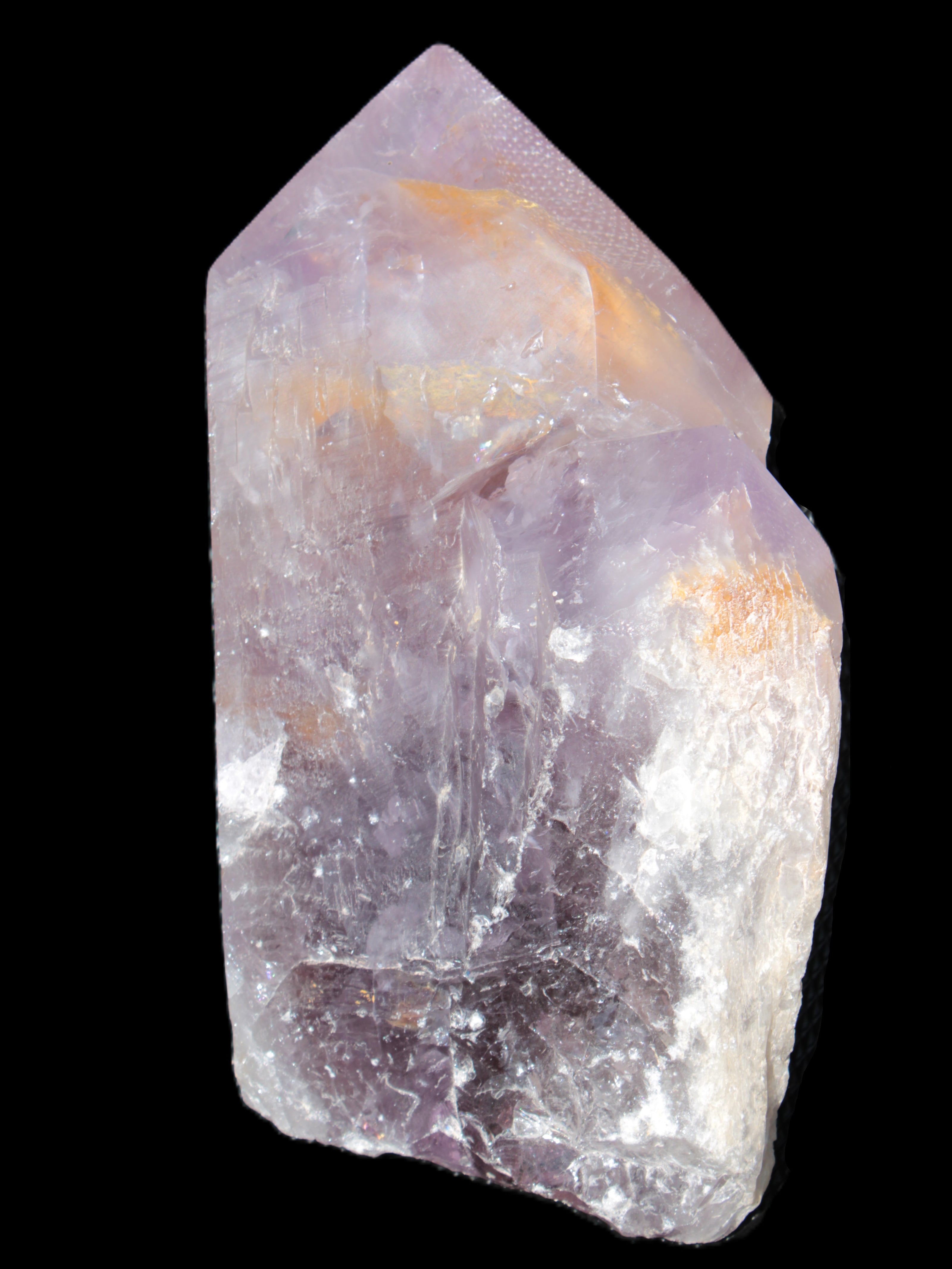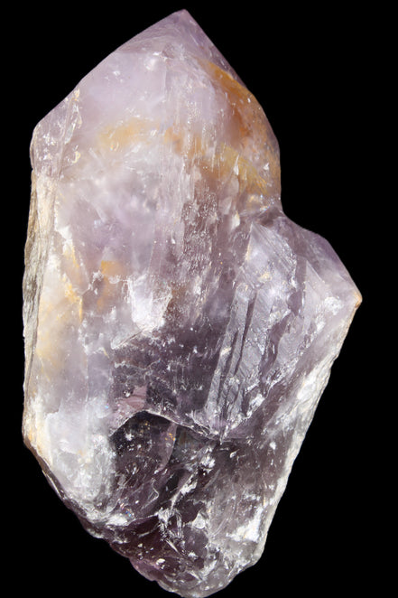 This is a huge Amethyst twinned crystal. The main crystal is 225mm tall. Its smaller twin is 16mm high. The width of the two crystals at the base is 110mm. It is a little wider towards the tip of the smaller twin. Together, they are about 100 mm deep or thick. There are some strong hints of Citrine in this amazing crystal too.