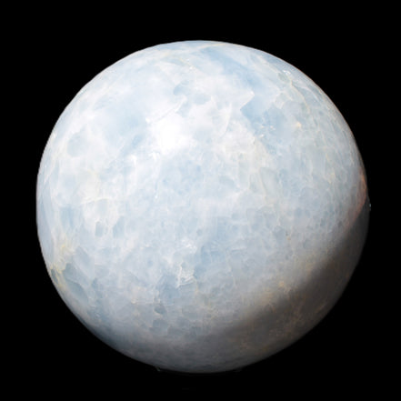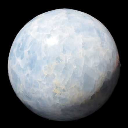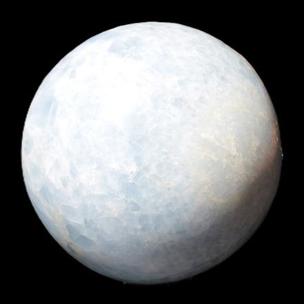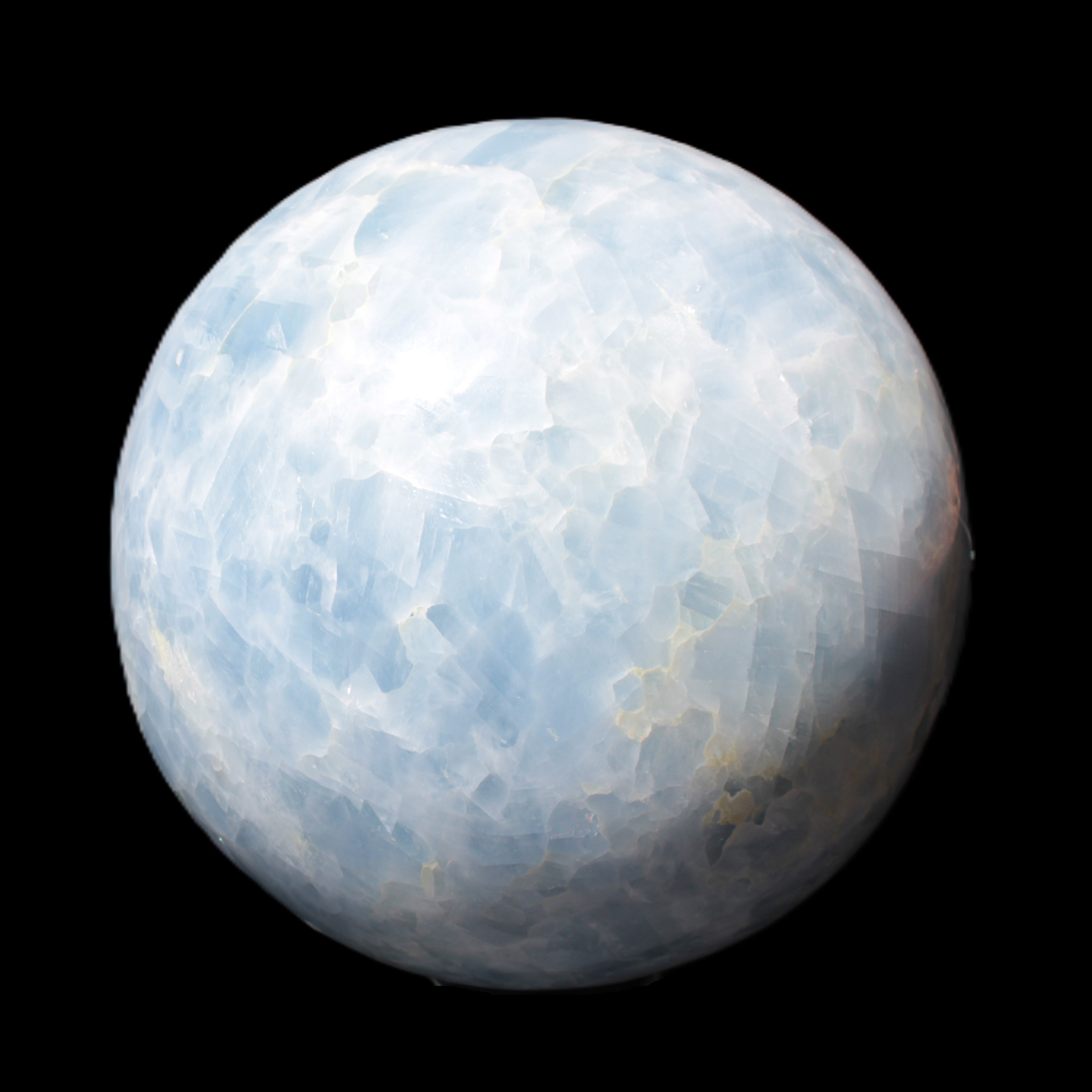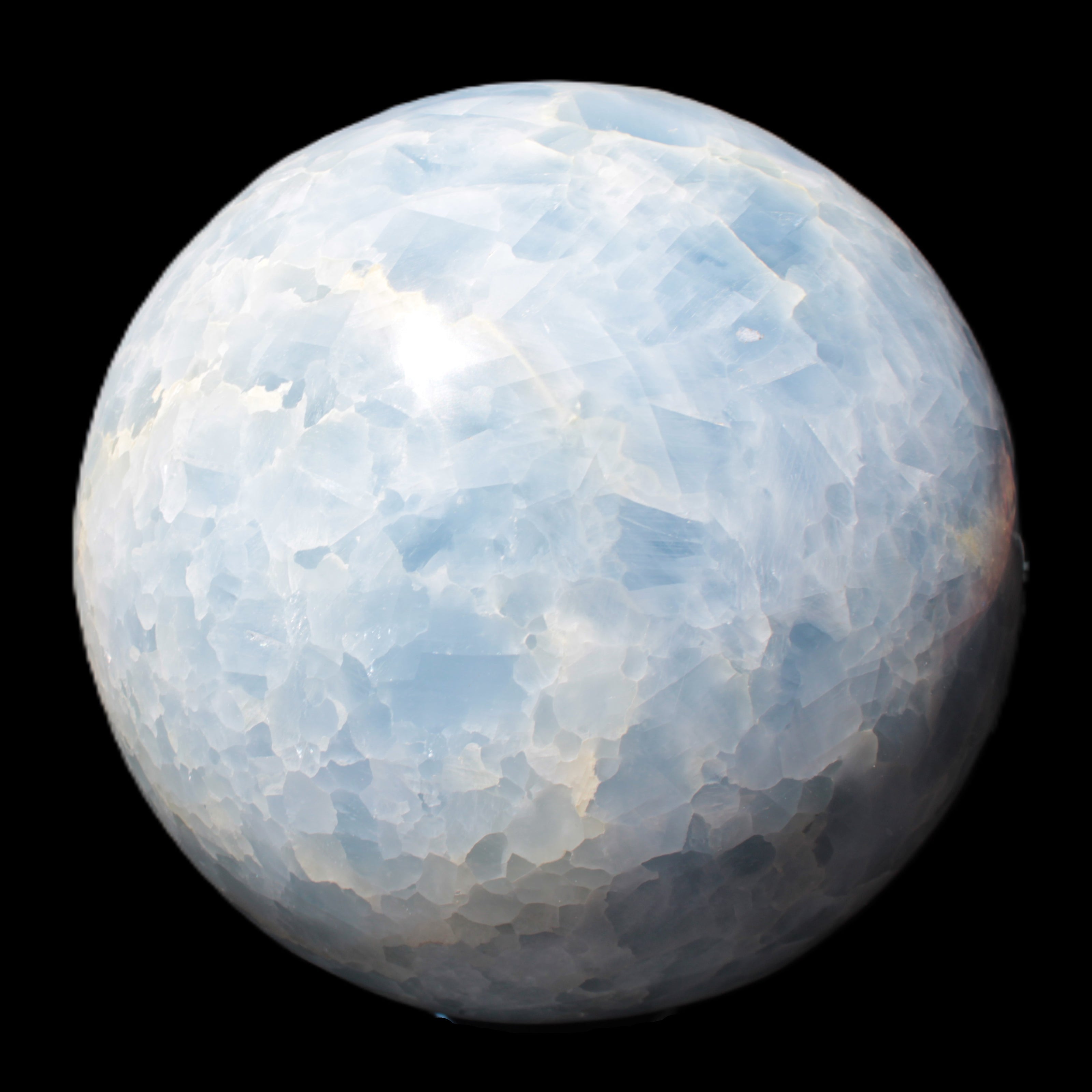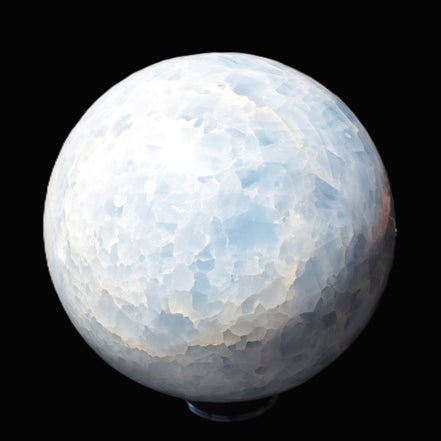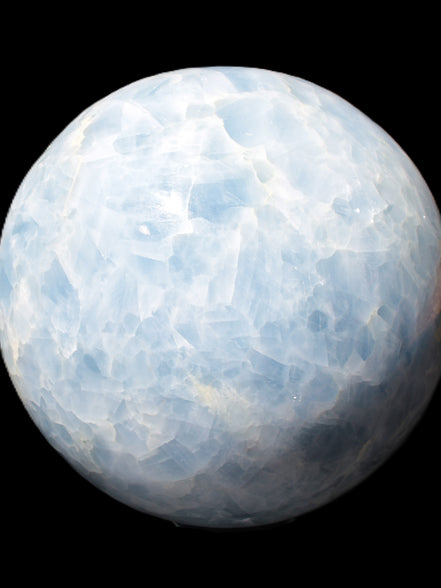 This Huge Celestite sphere 145mm weighs 4440g.  This natural crystal is a Sulphate formed with the rare element Strontium. This gives it the striking soft sky blue that gives such instant appeal. It also means it is a fragile crystal that needs to be carefully handled. It should also be kept away from prolonged exposure to direct sunlight as it will lose its colour.