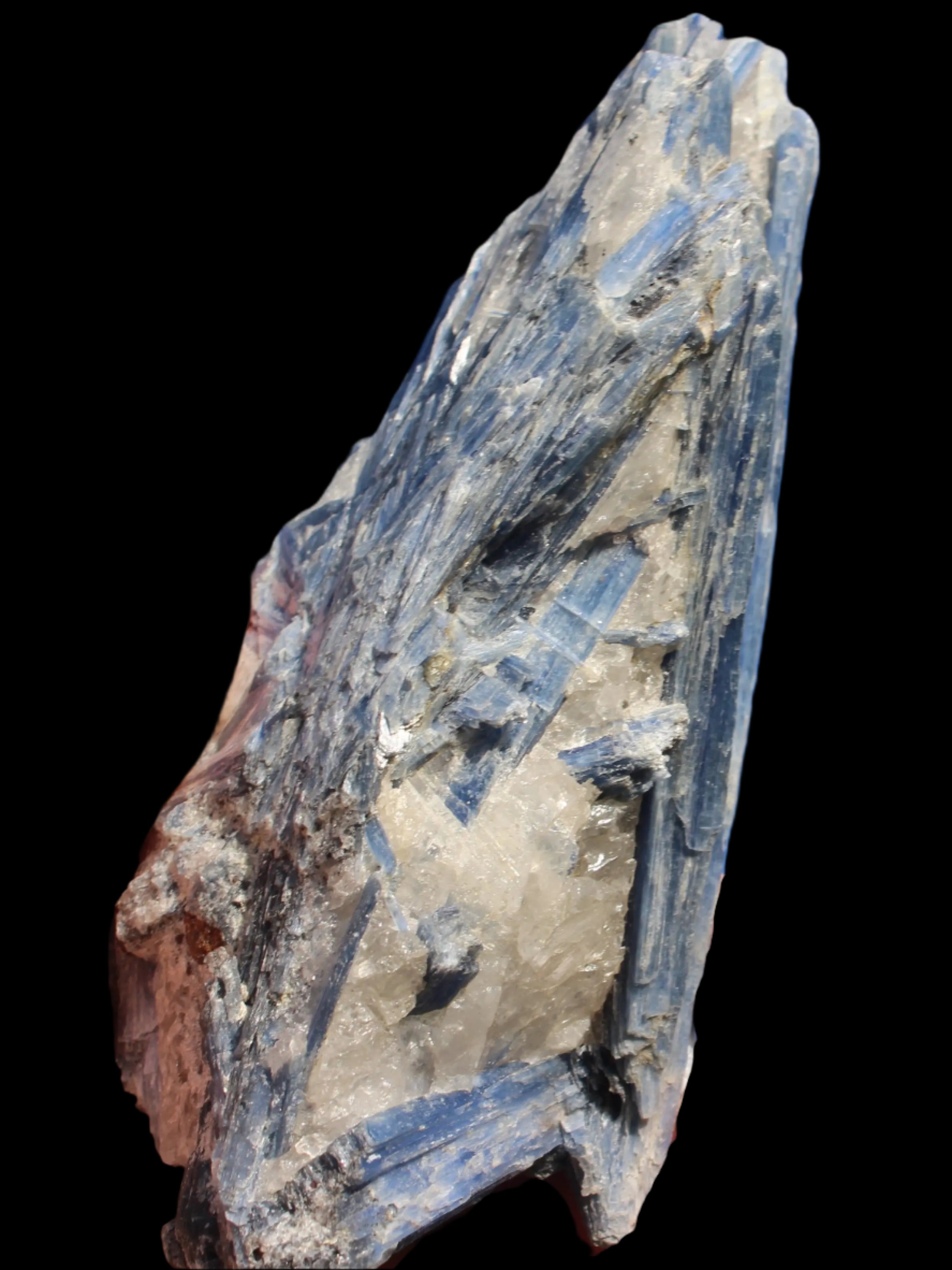 This imposing Blue Kyanite cluster specimen comes with a with stand. It is large at 830g. Kyanite consists of multiple layers of thin flat blades. It has two distinct hardness ratings for its parallel and perpendicular axis. Kyanite is most commonly blue, but it may also be black, grey, green or orange.