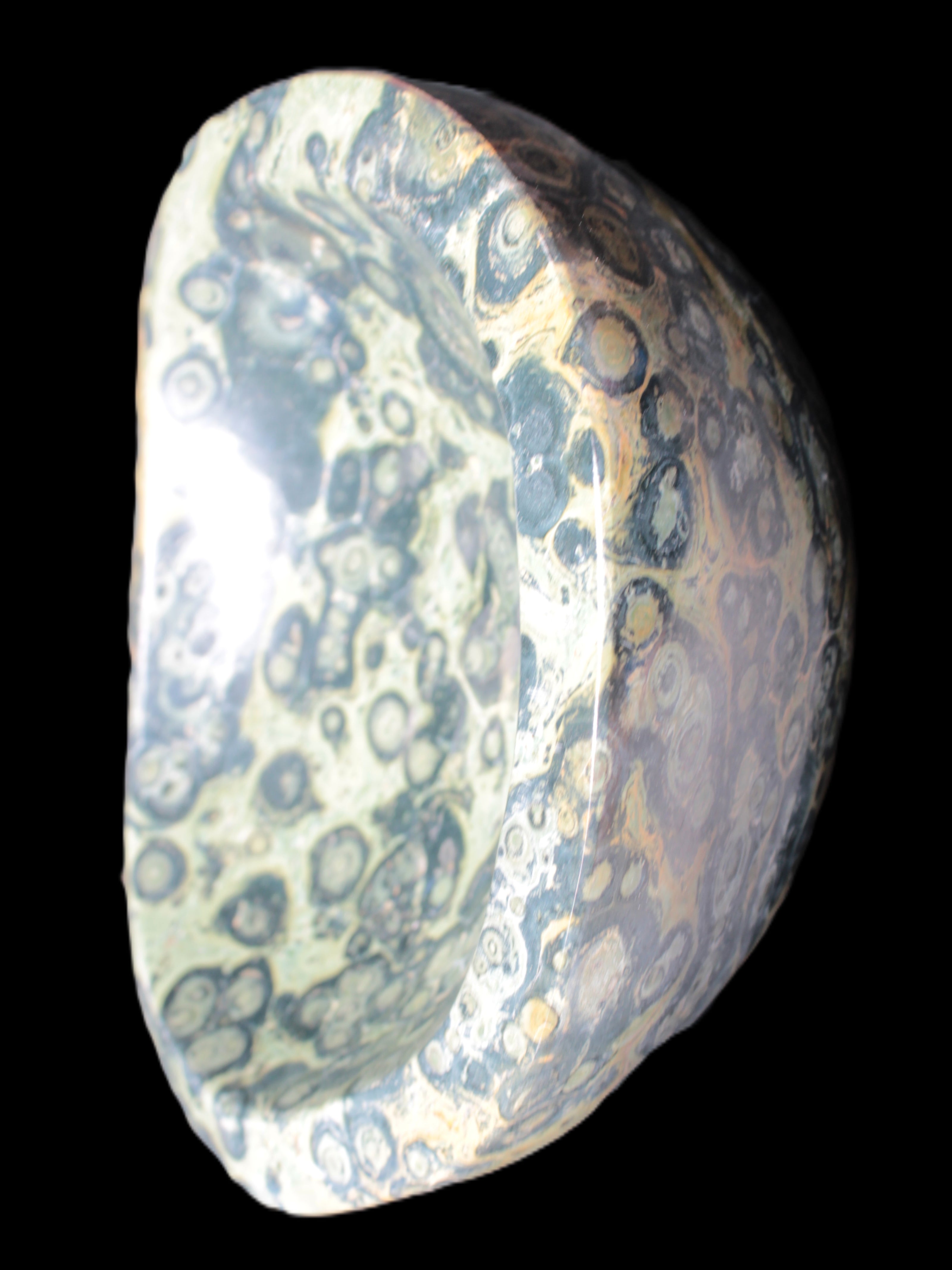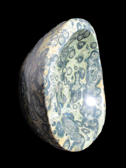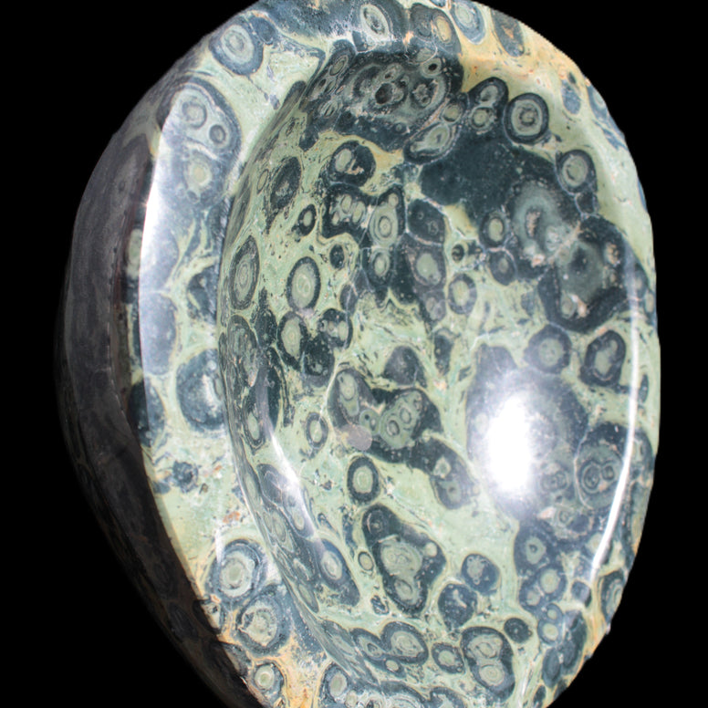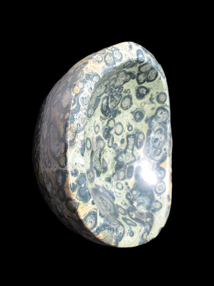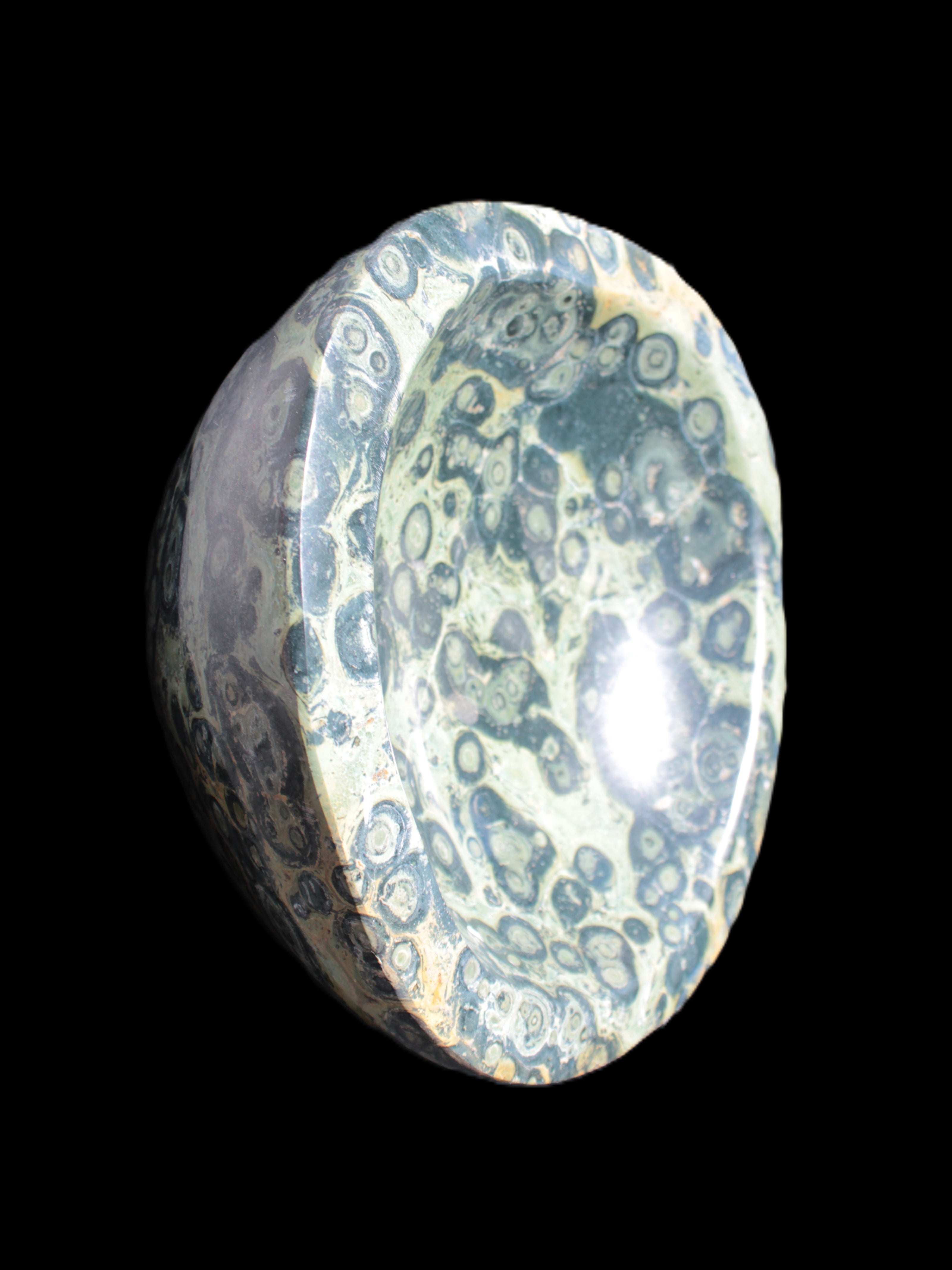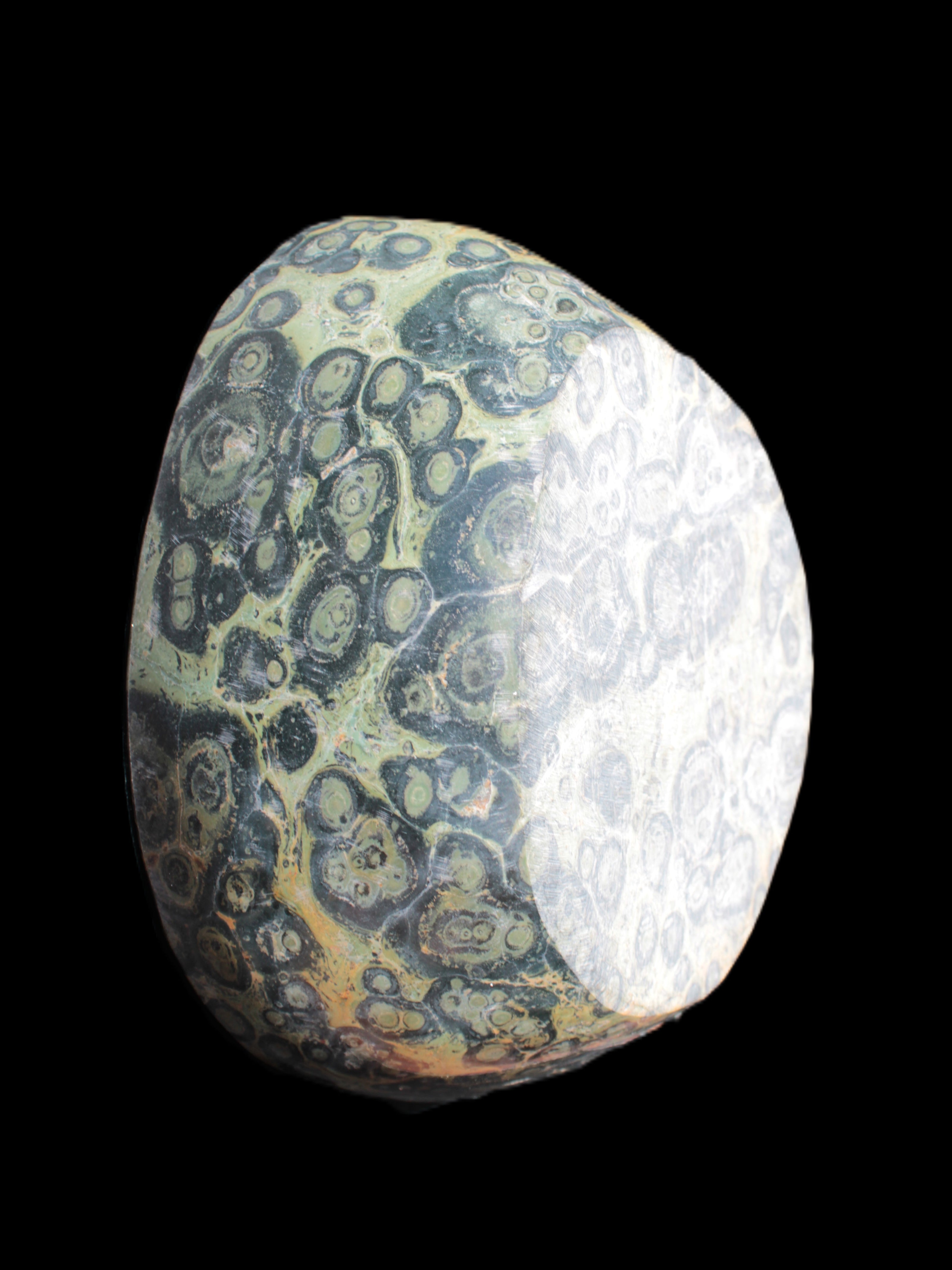Kambaba Jasper is sometimes confused with Malachite or the rare Nebula Stone. The black circles and the dark green swirls on the stone represent comfort and protection. It has aligning, grounding and cleansing energies. These provide calm, relaxation, balance and restoration.
