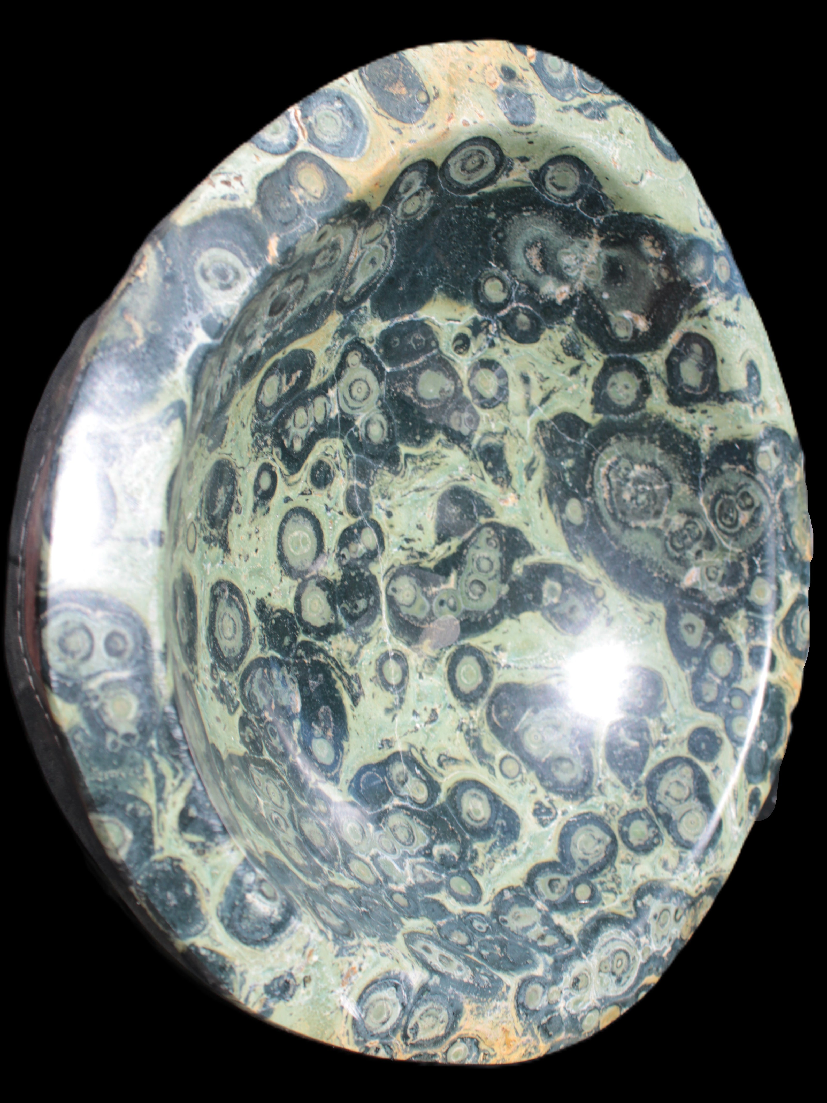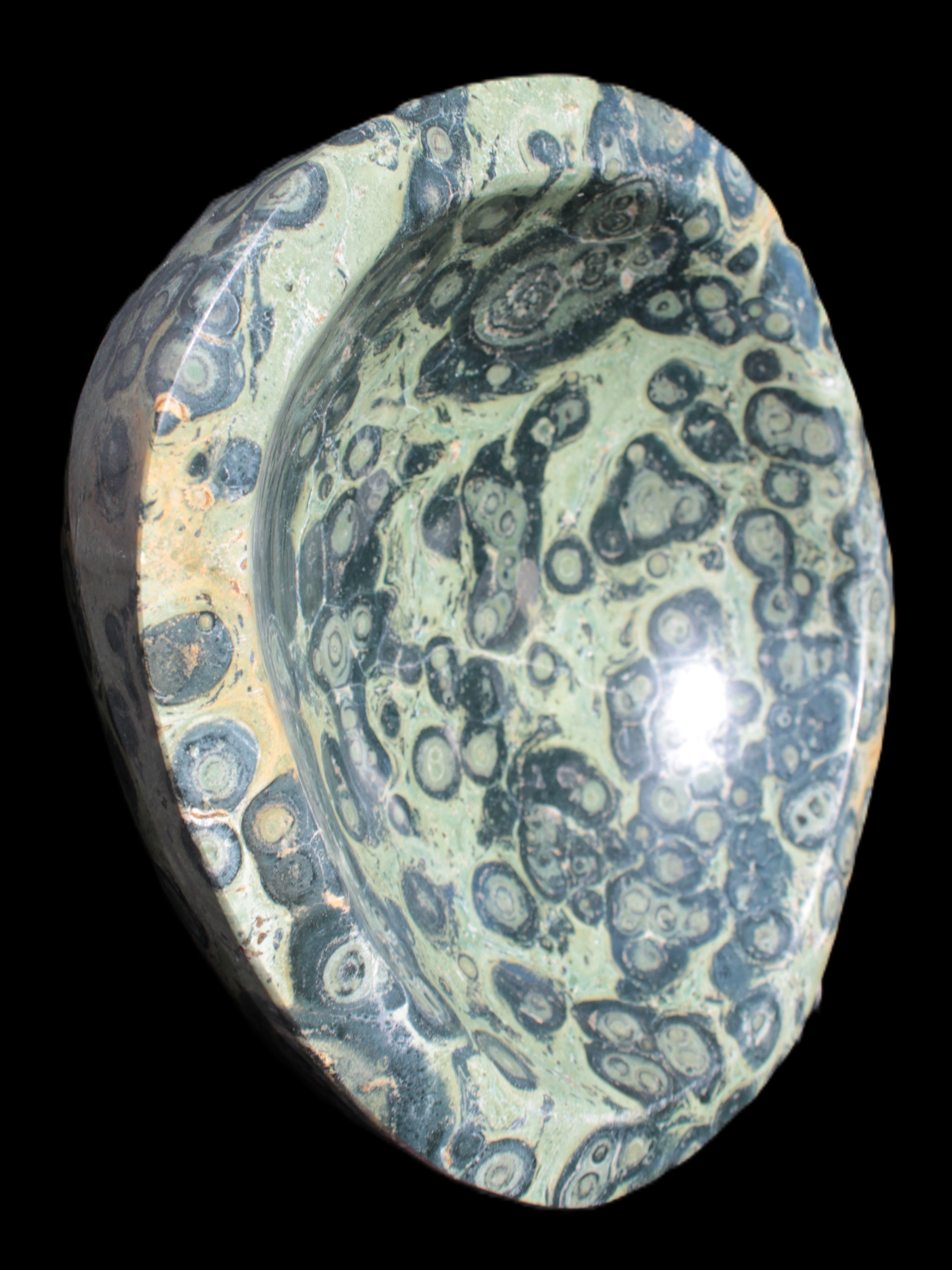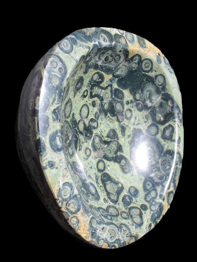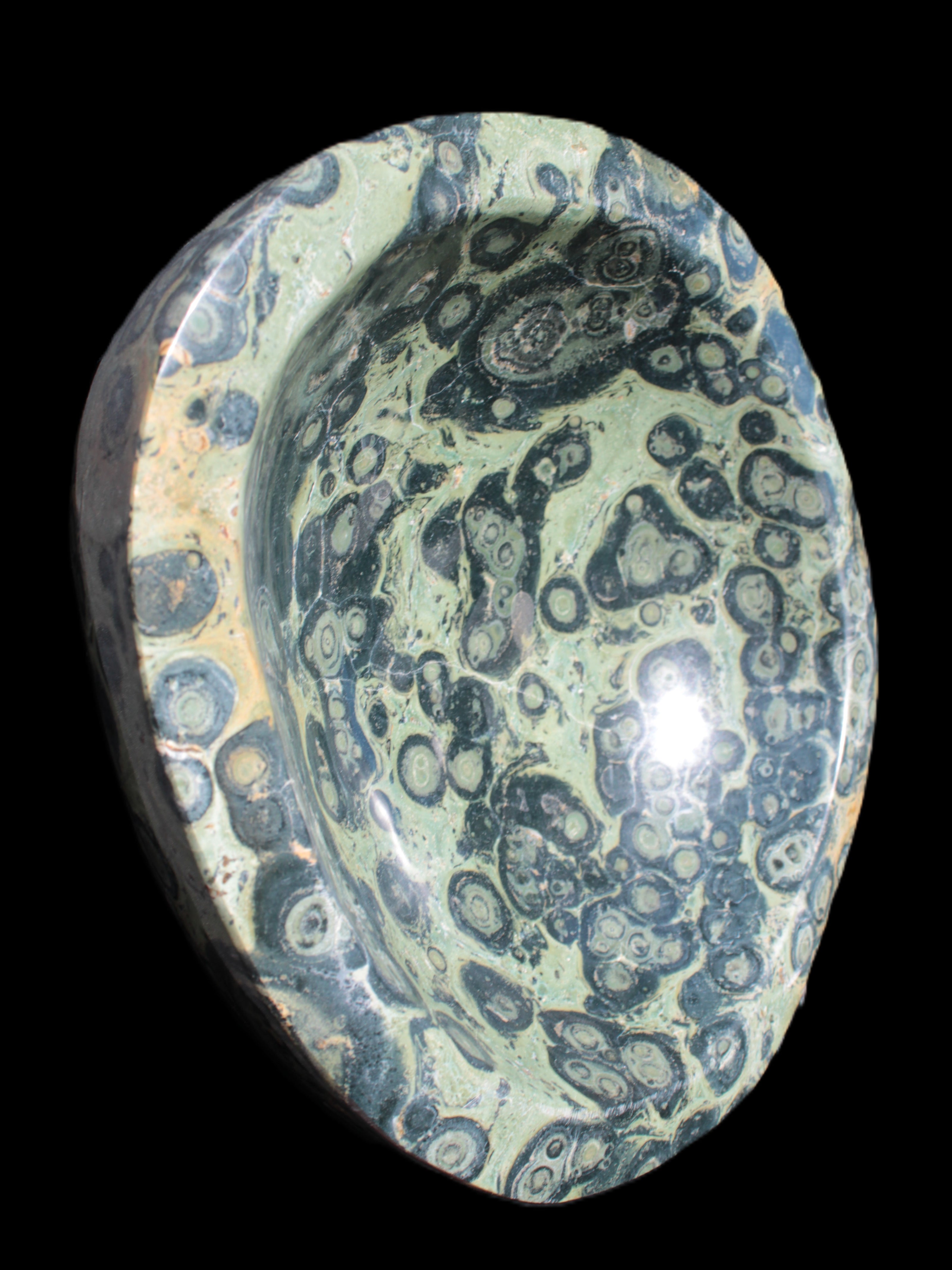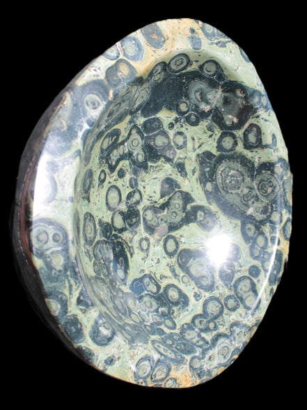 Kambaba Jasper is sometimes confused with Malachite or the rare Nebula Stone. The black circles and the dark green swirls on the stone represent comfort and protection. It has aligning, grounding and cleansing energies. These provide calm, relaxation, balance and restoration.