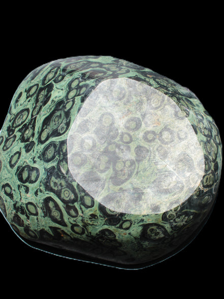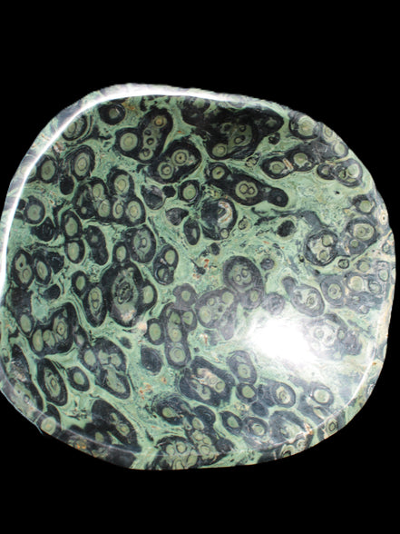 The black circles and the dark green swirls on the stone represent comfort and protection. It has aligning, grounding and cleansing energies. These provide calm, relaxation, balance and restoration.