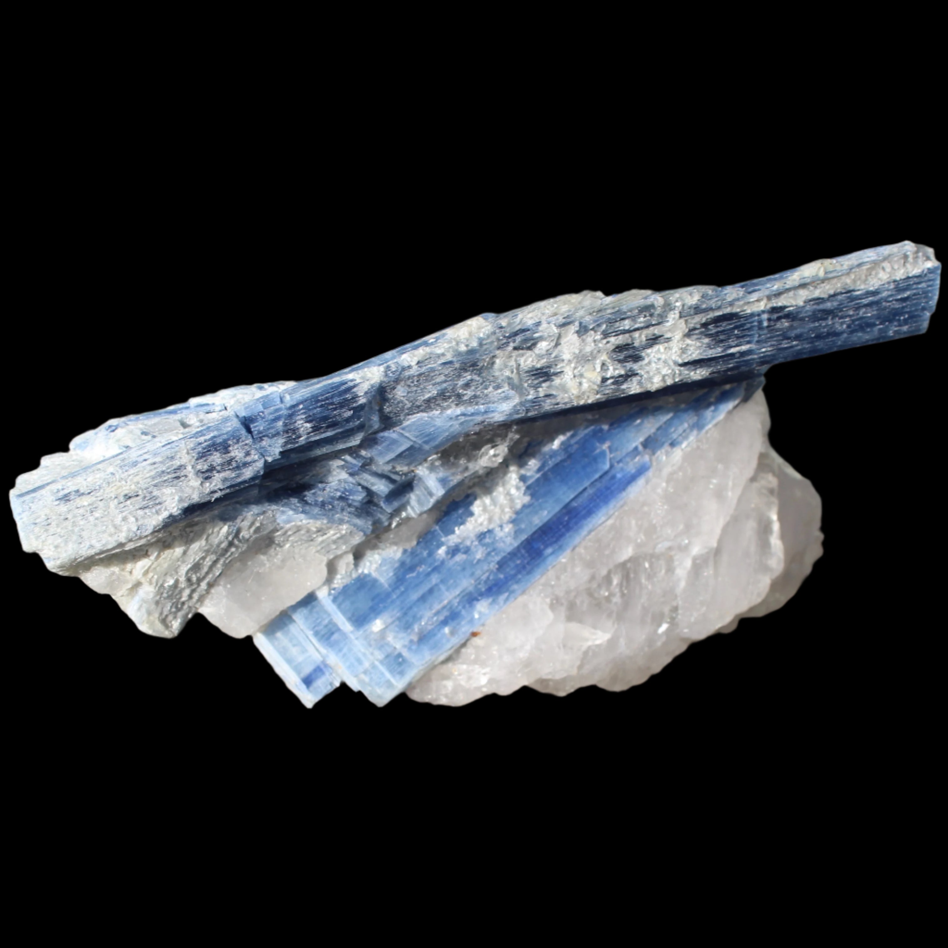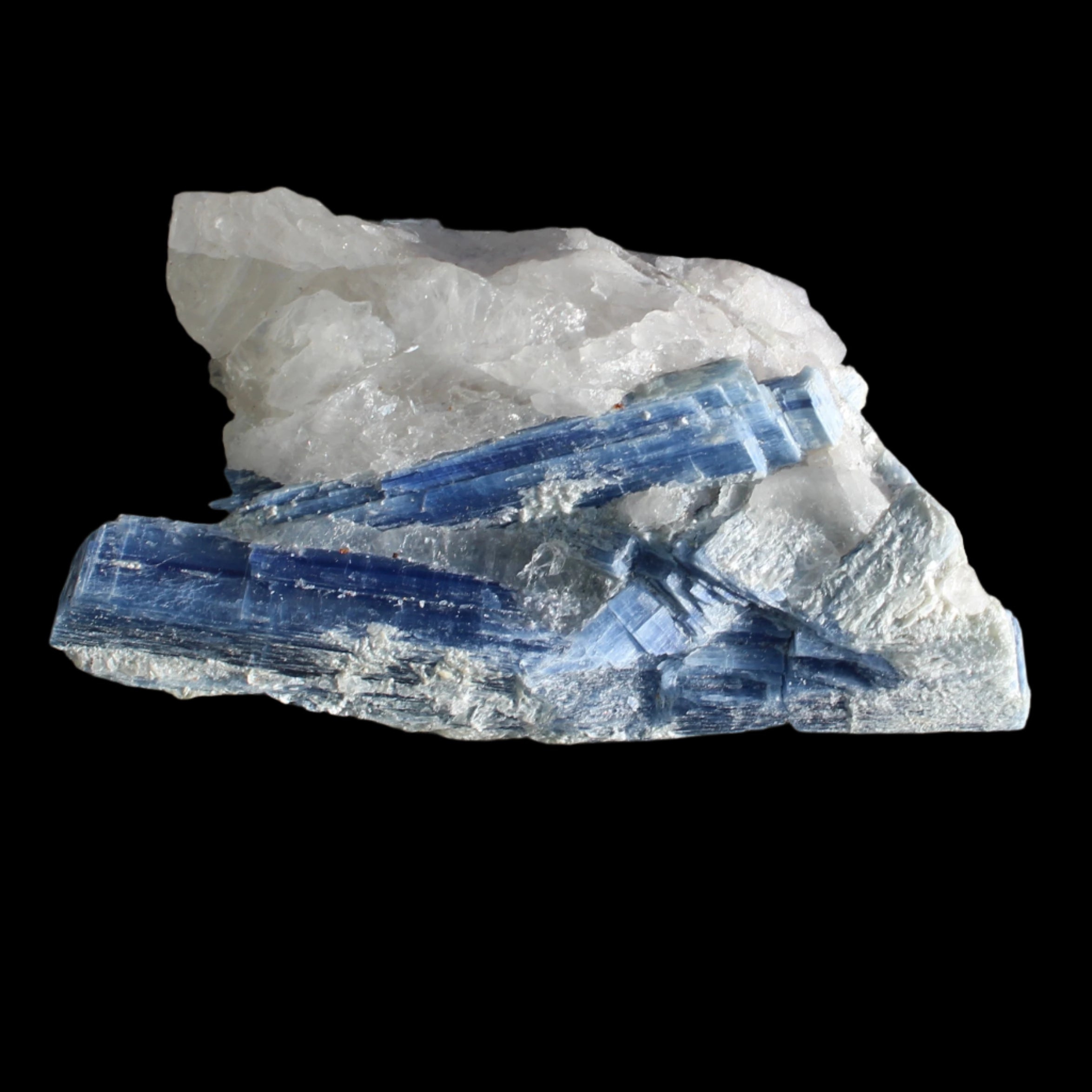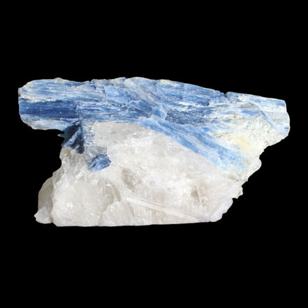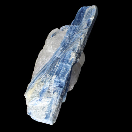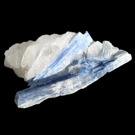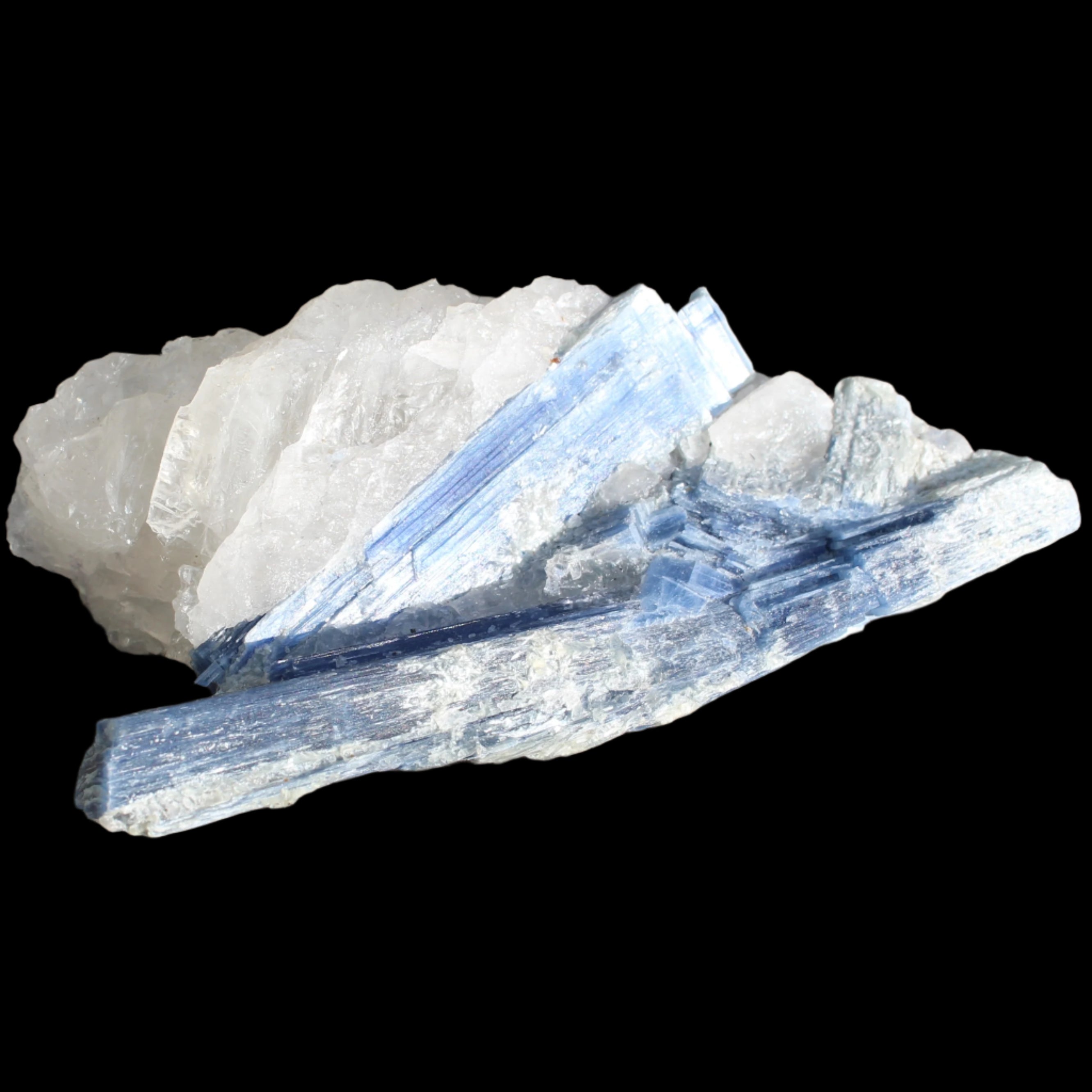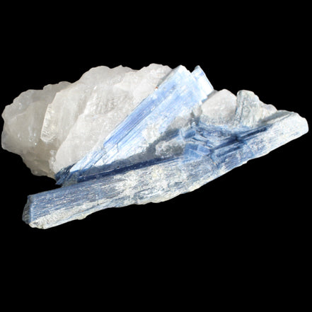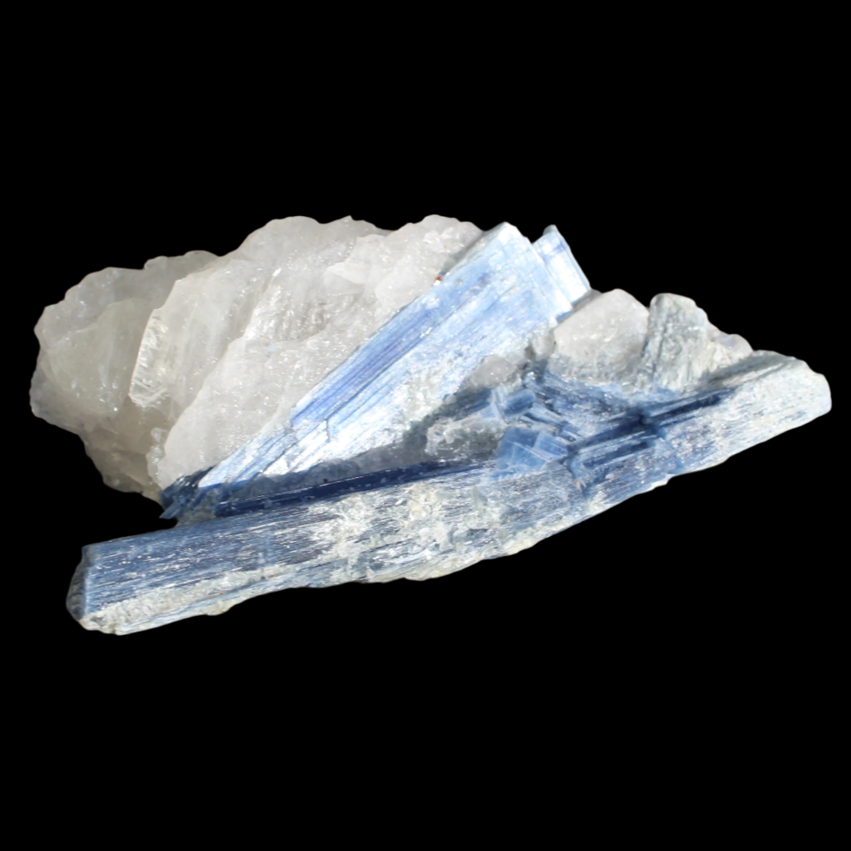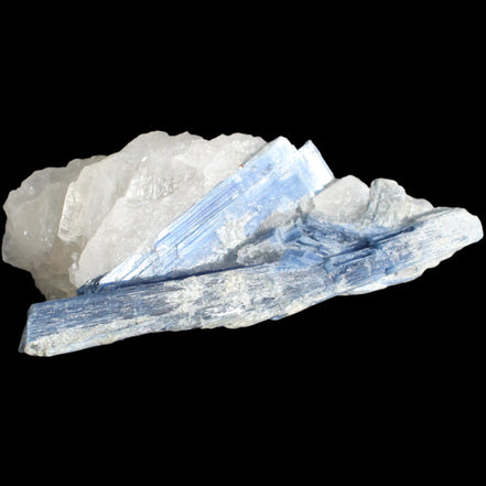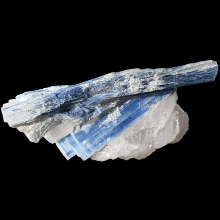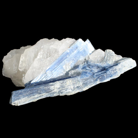 This Kyanite blade cluster on clear Quartz weighs 315g. Kyanite consists of multiple layers of thin flat blades. It has two distinct hardness ratings for its parallel and perpendicular axis. Kyanite is most commonly blue, but it may also be black, grey, green or orange.