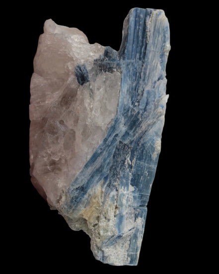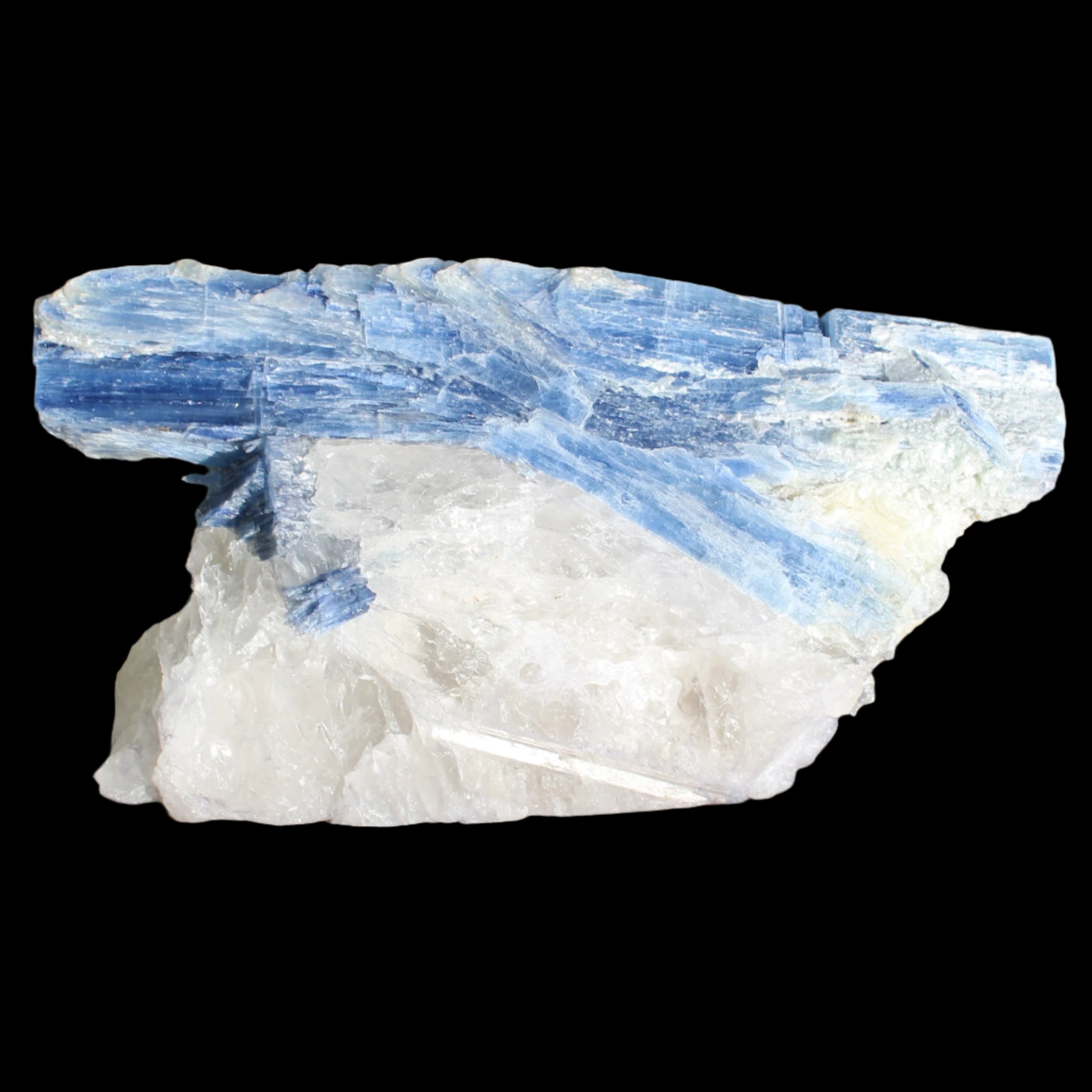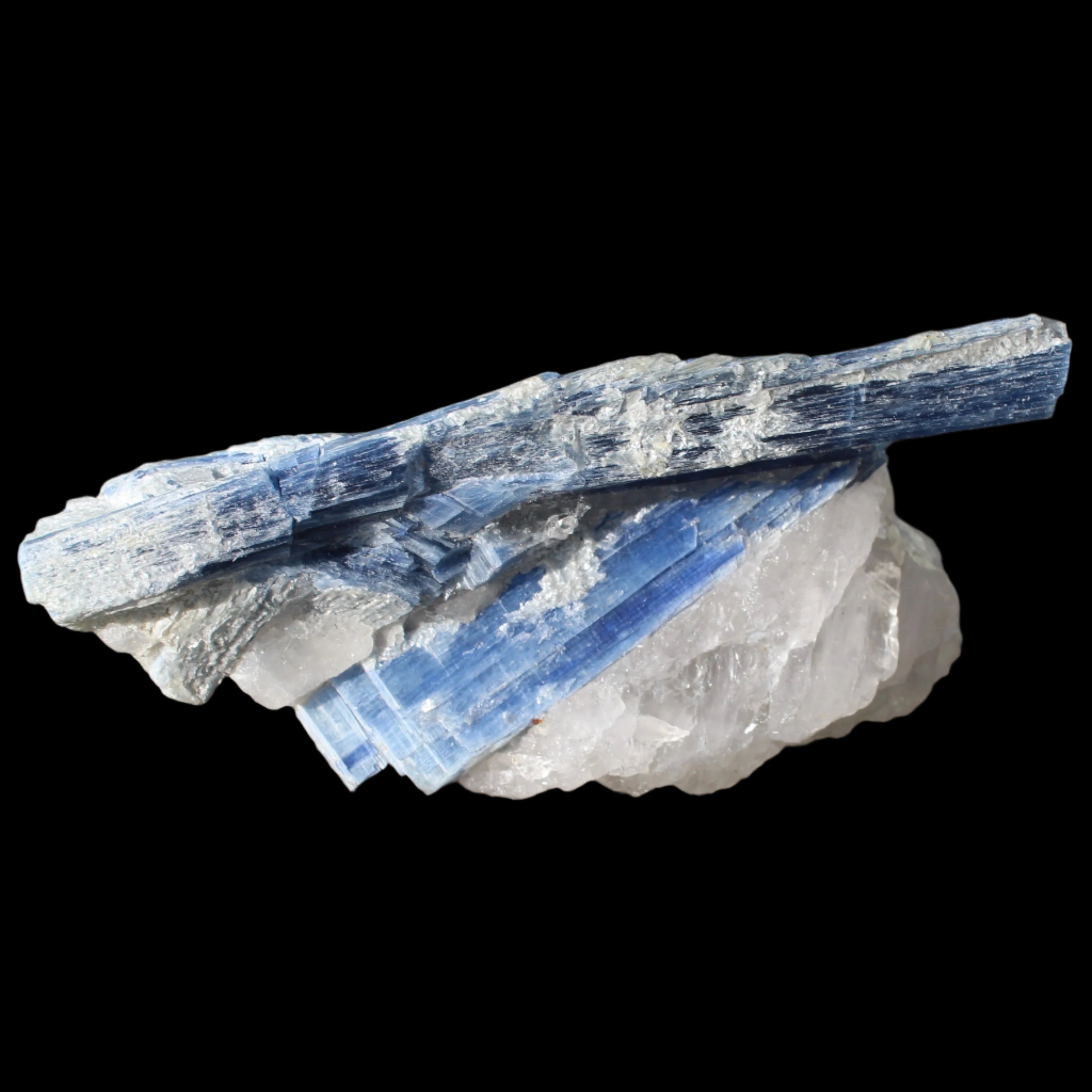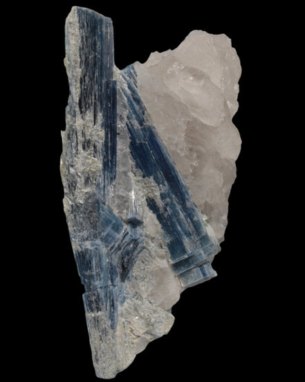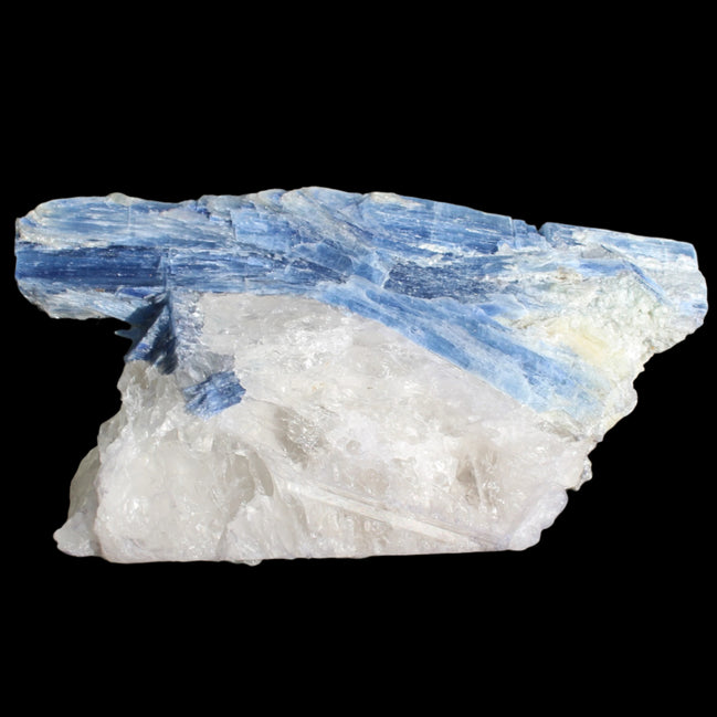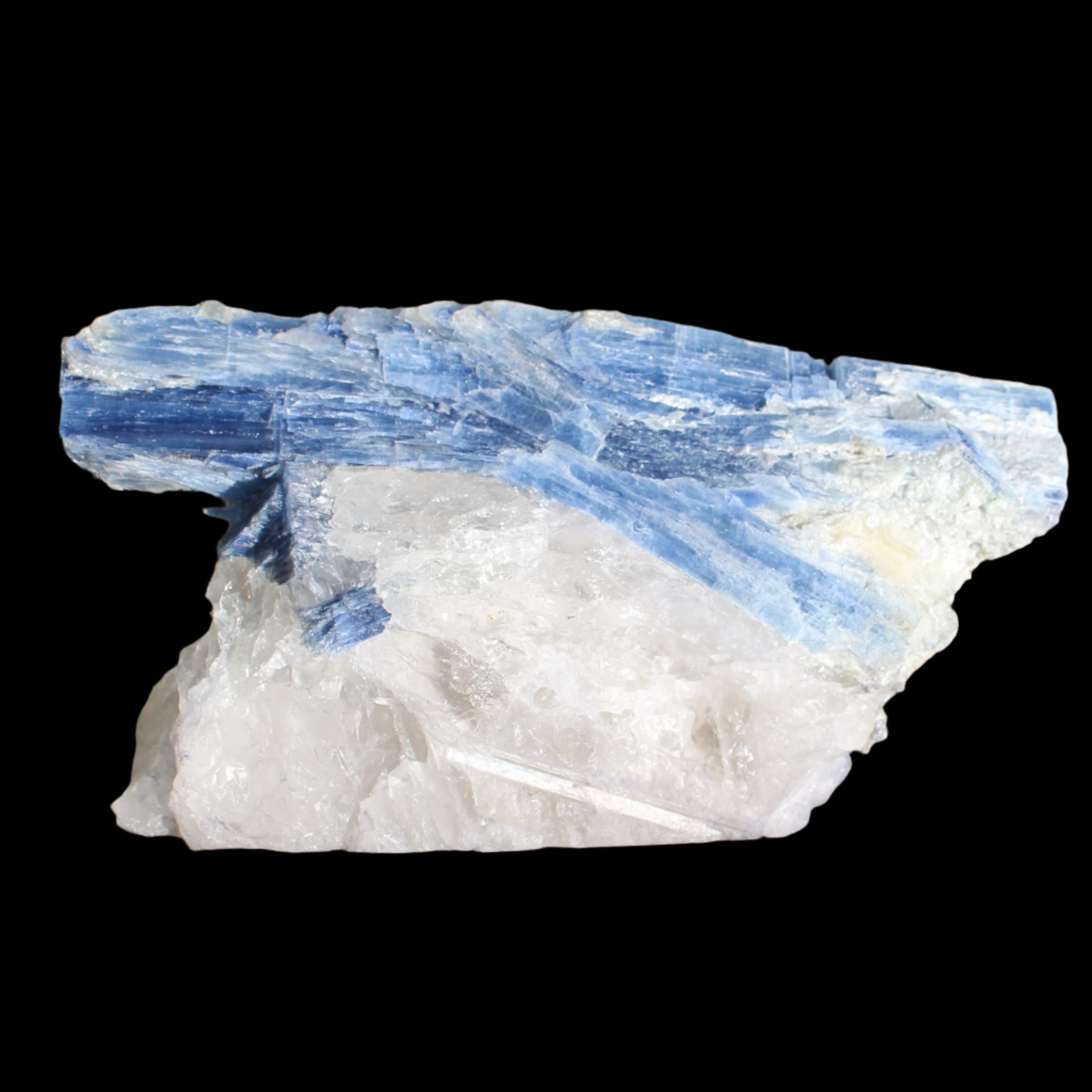 This Kyanite blade cluster on clear Quartz weighs 315g. Kyanite consists of multiple layers of thin flat blades. It has two distinct hardness ratings for its parallel and perpendicular axis. Kyanite is most commonly blue, but it may also be black, grey, green or orange.