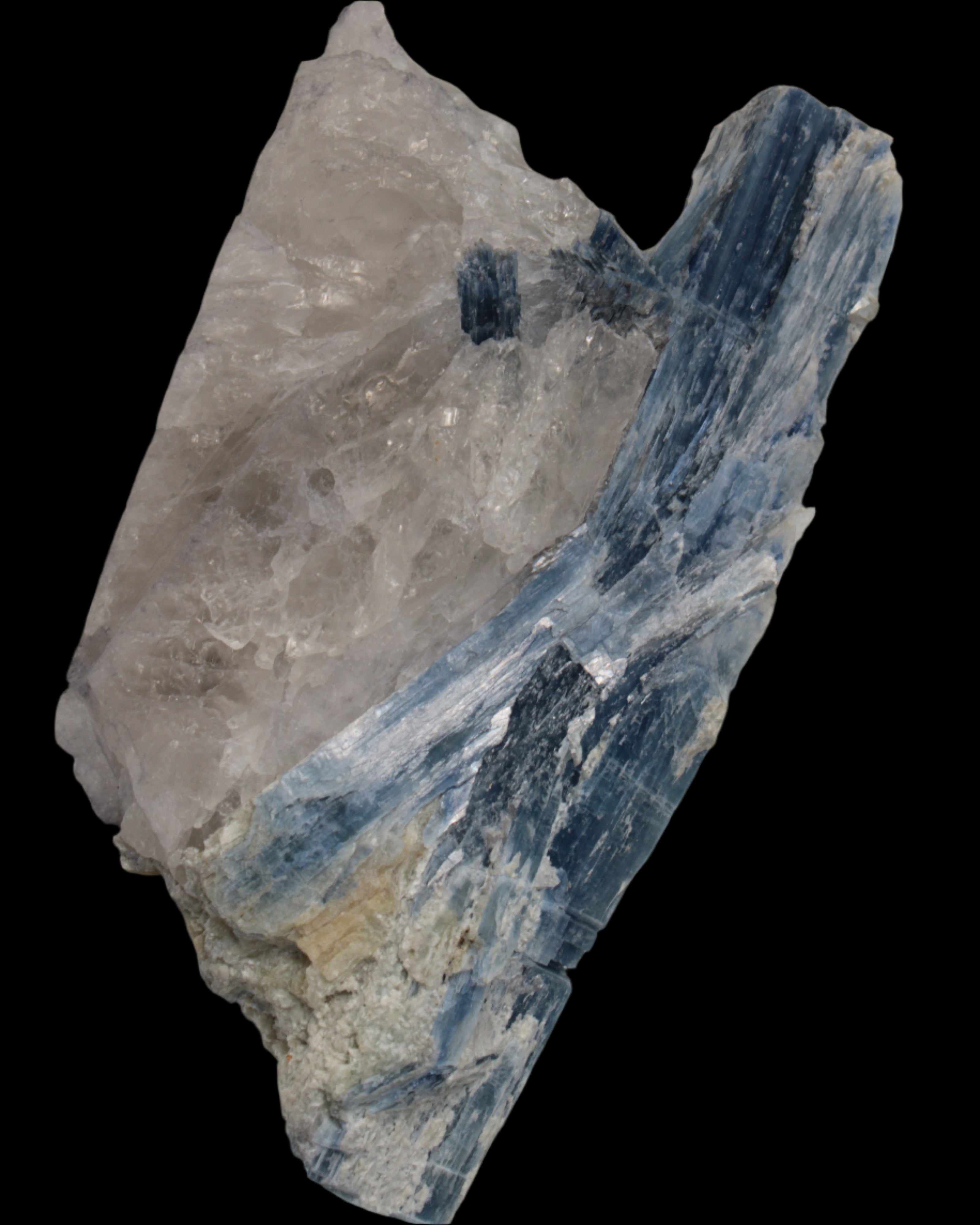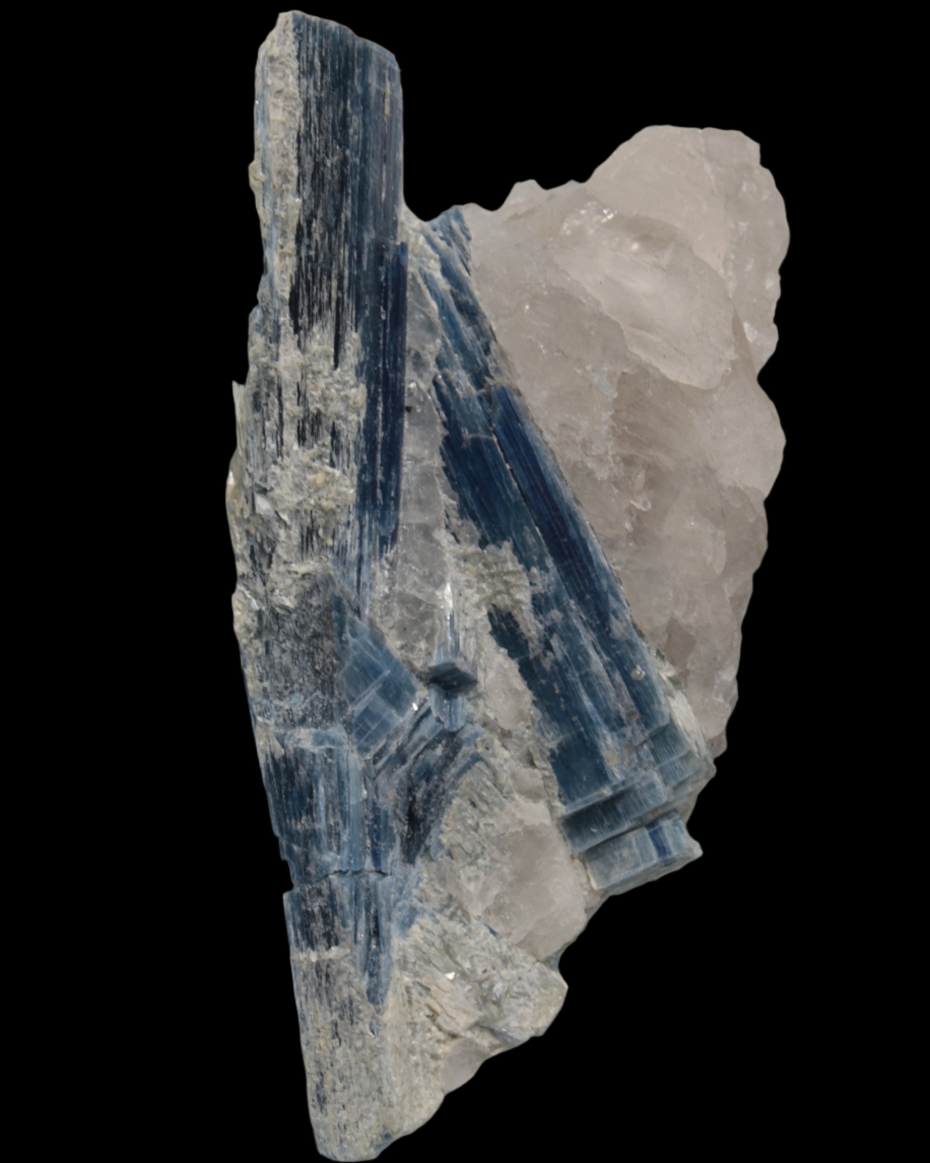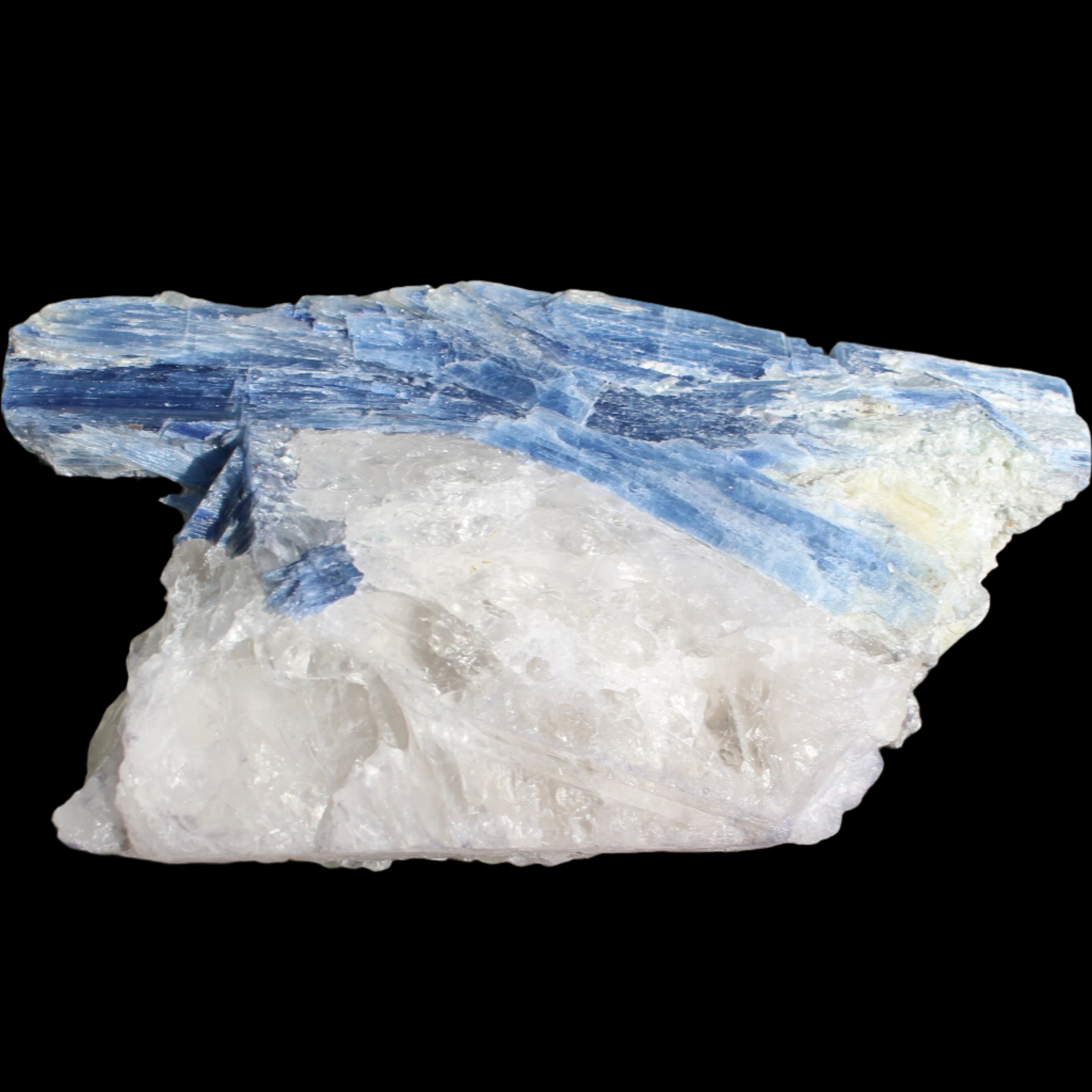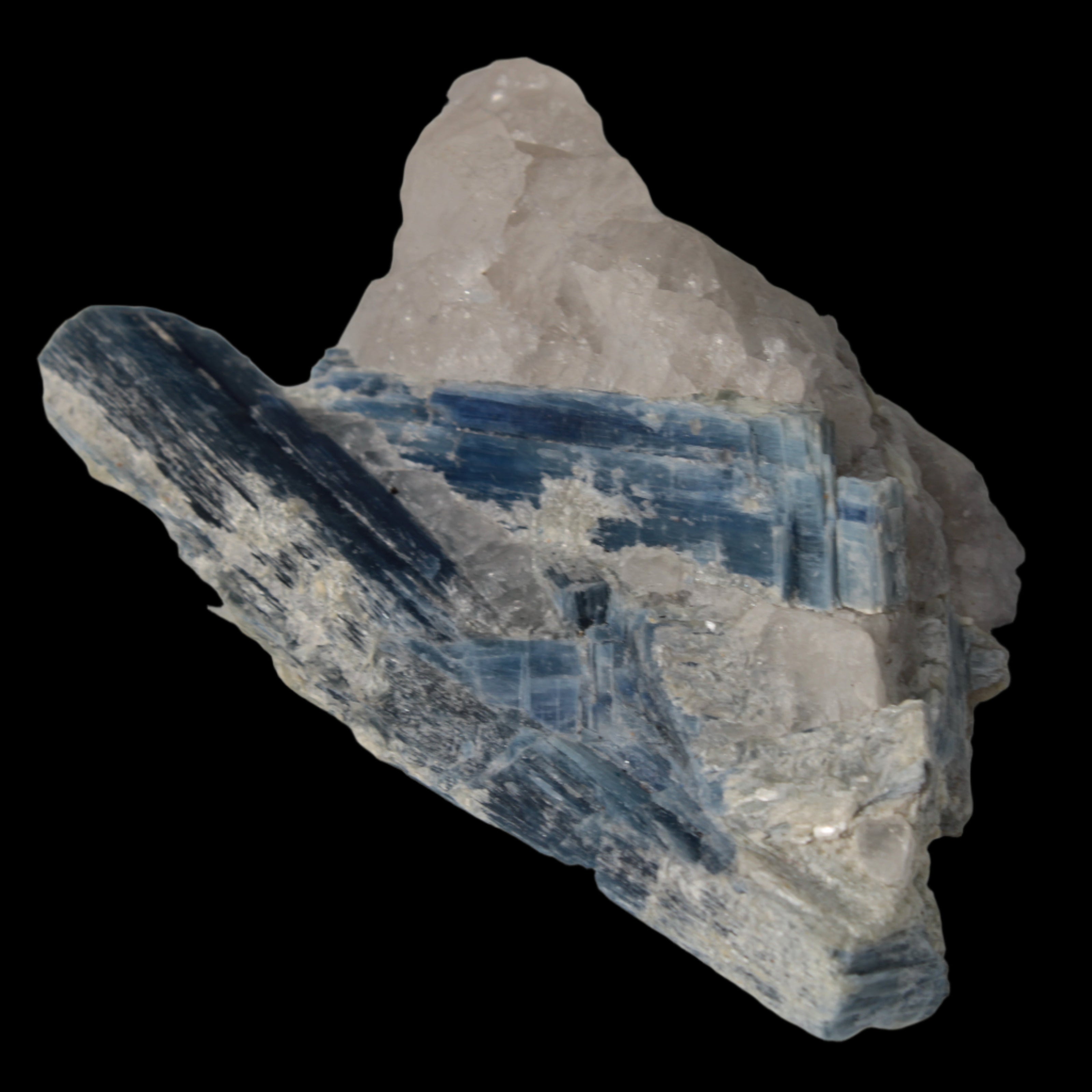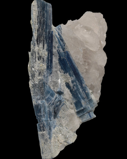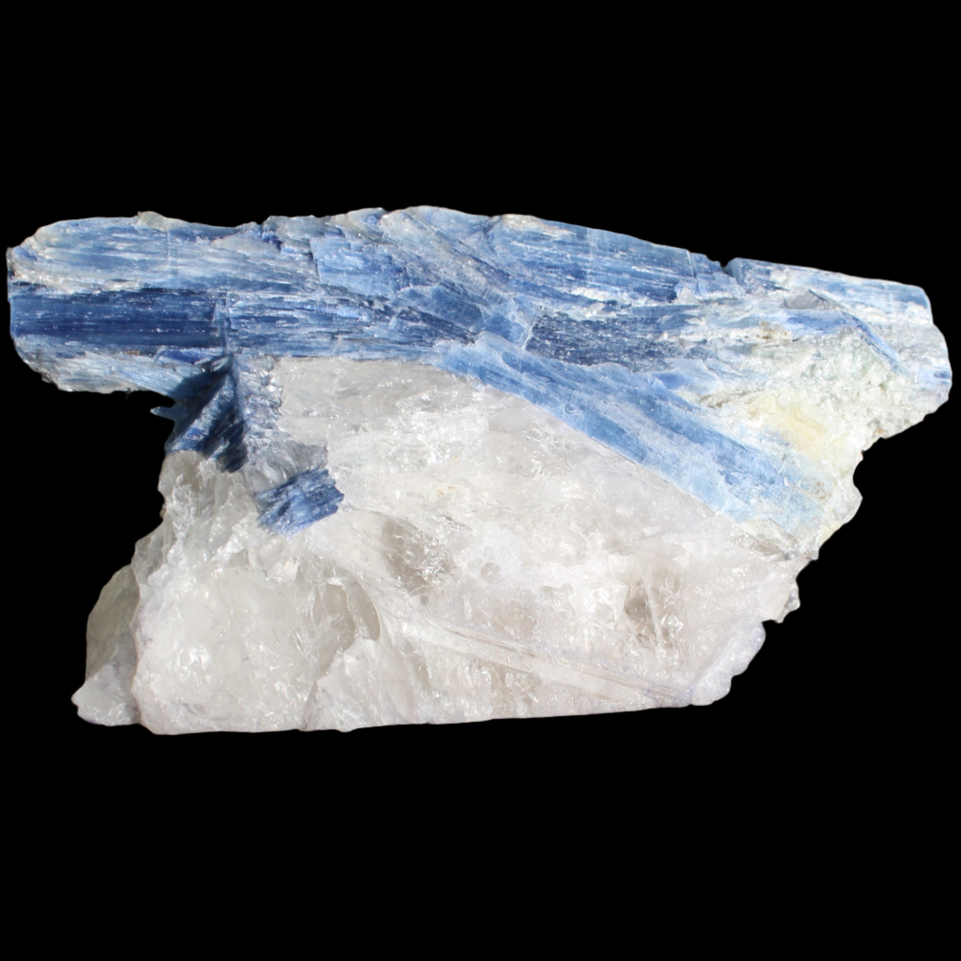 This Kyanite blade cluster on clear Quartz weighs 315g. Kyanite consists of multiple layers of thin flat blades. It has two distinct hardness ratings for its parallel and perpendicular axis. Kyanite is most commonly blue, but it may also be black, grey, green or orange.
