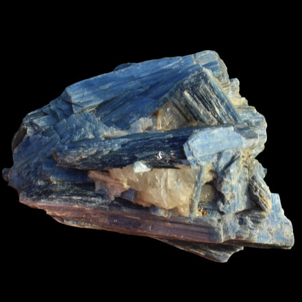 This large Kyanite cluster (with stand) weighs 573g. Kyanite consists of multiple layers of thin flat blades. It has two distinct hardness ratings for its parallel and perpendicular axis. Kyanite is most commonly blue, but it may also be black, grey, green or orange.