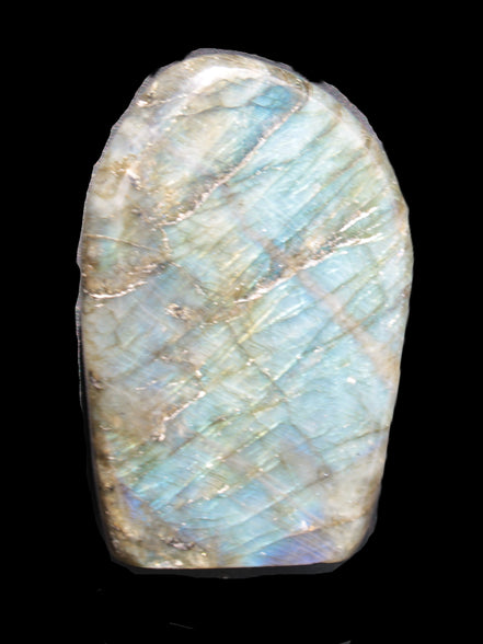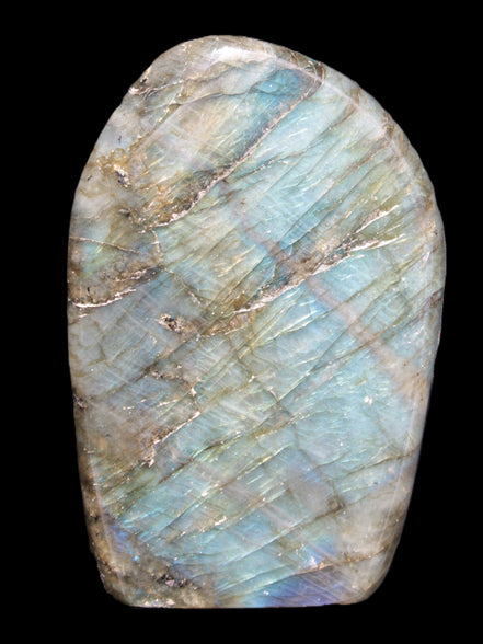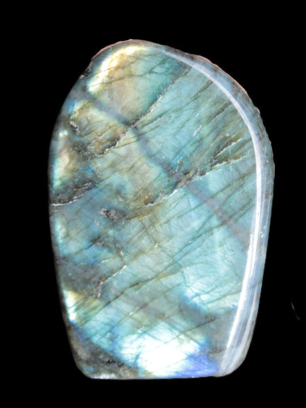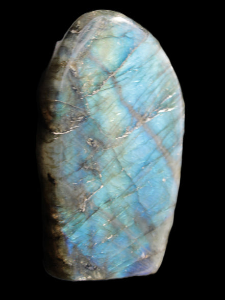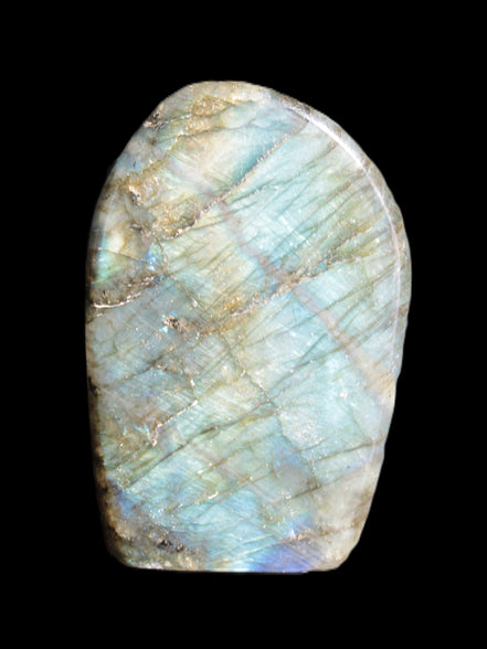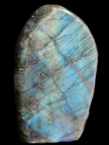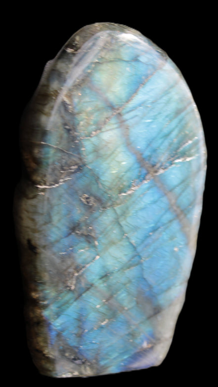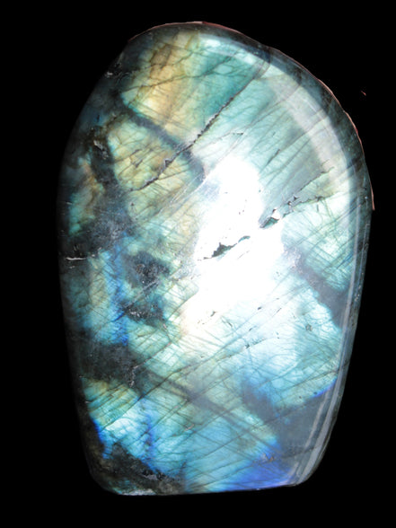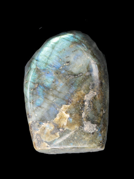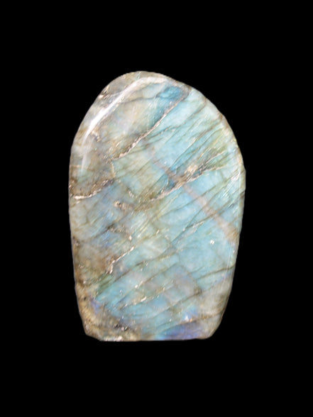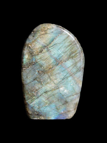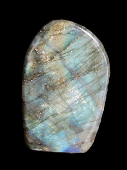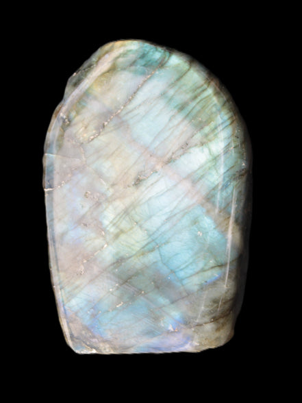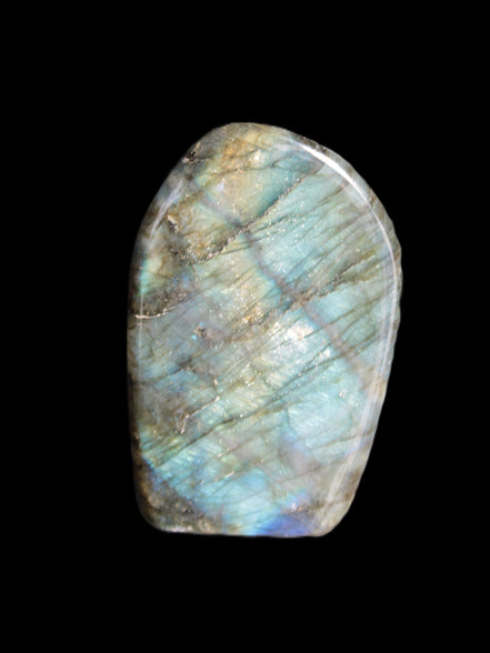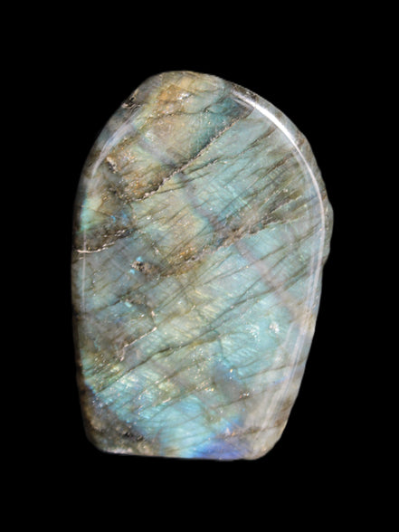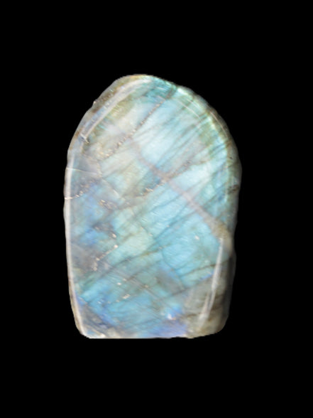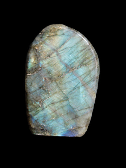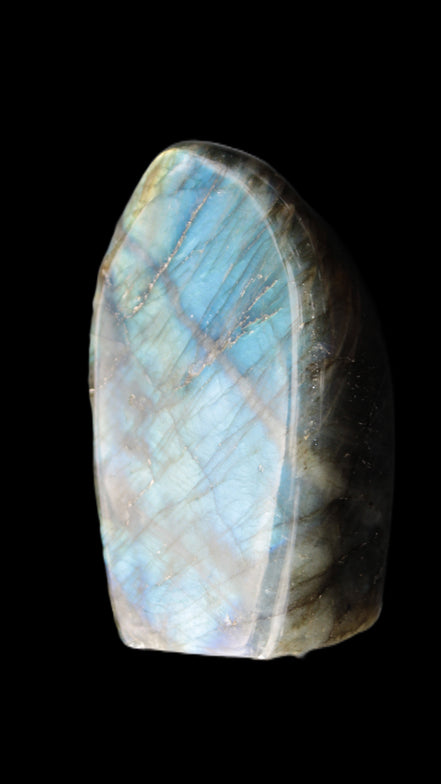 This Labradorite 26*50*95mm weighs 325g. It is an upright freeform that stands on its base. When polished, dark grey Labradorite flashes with colours deep within, including blue, green, gold and violet. This piece has mainly blue and violet flash. Labradorite is a stone of transformation and change. It provides clarity and insight into your destiny.