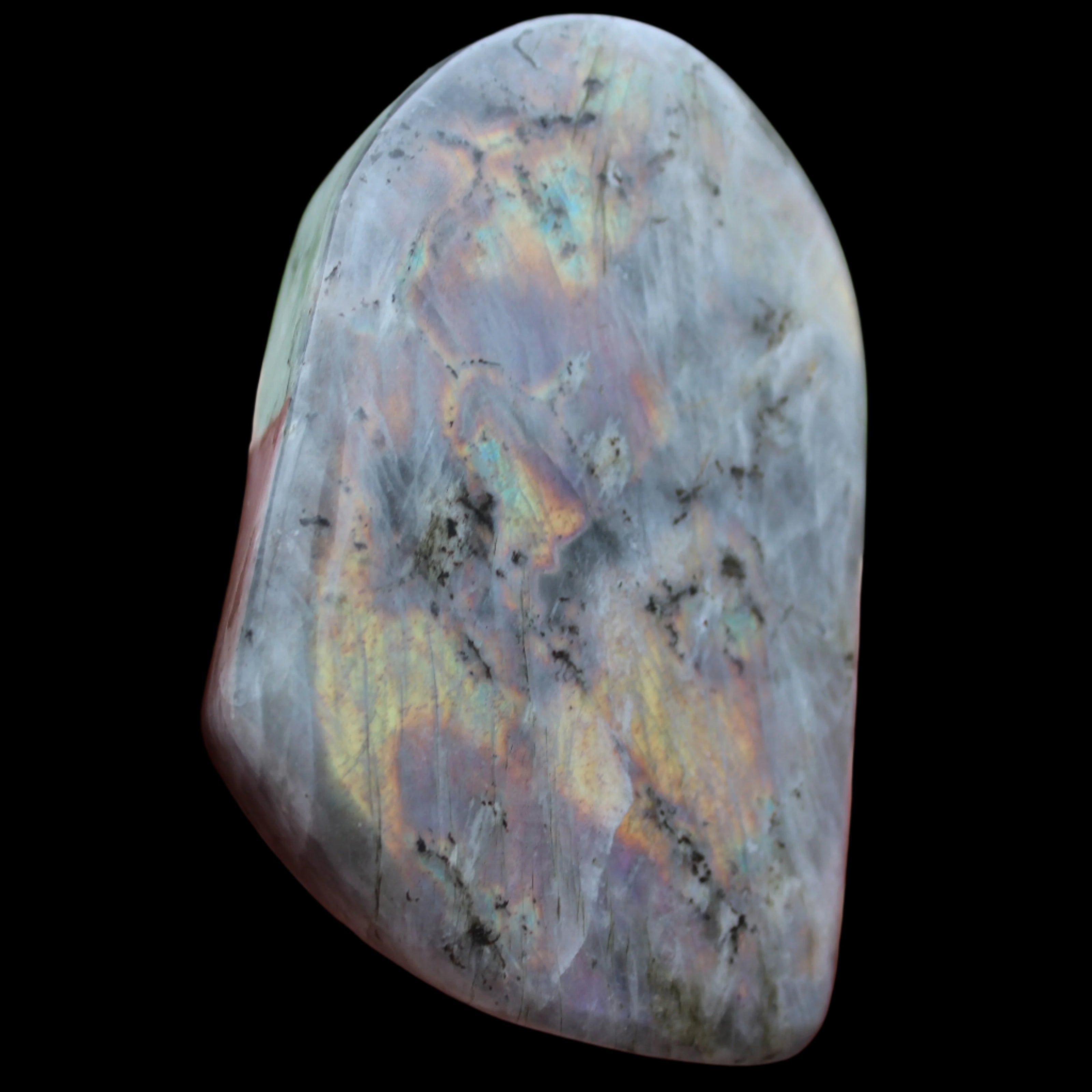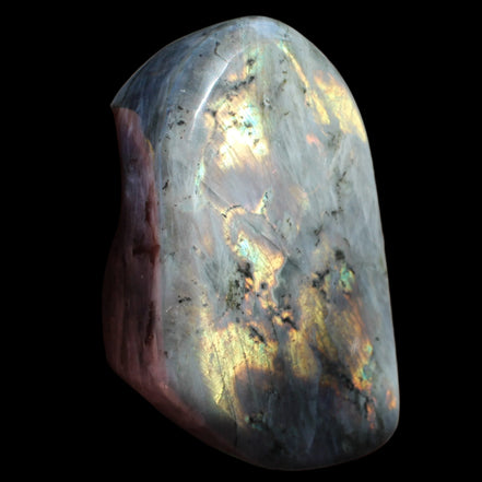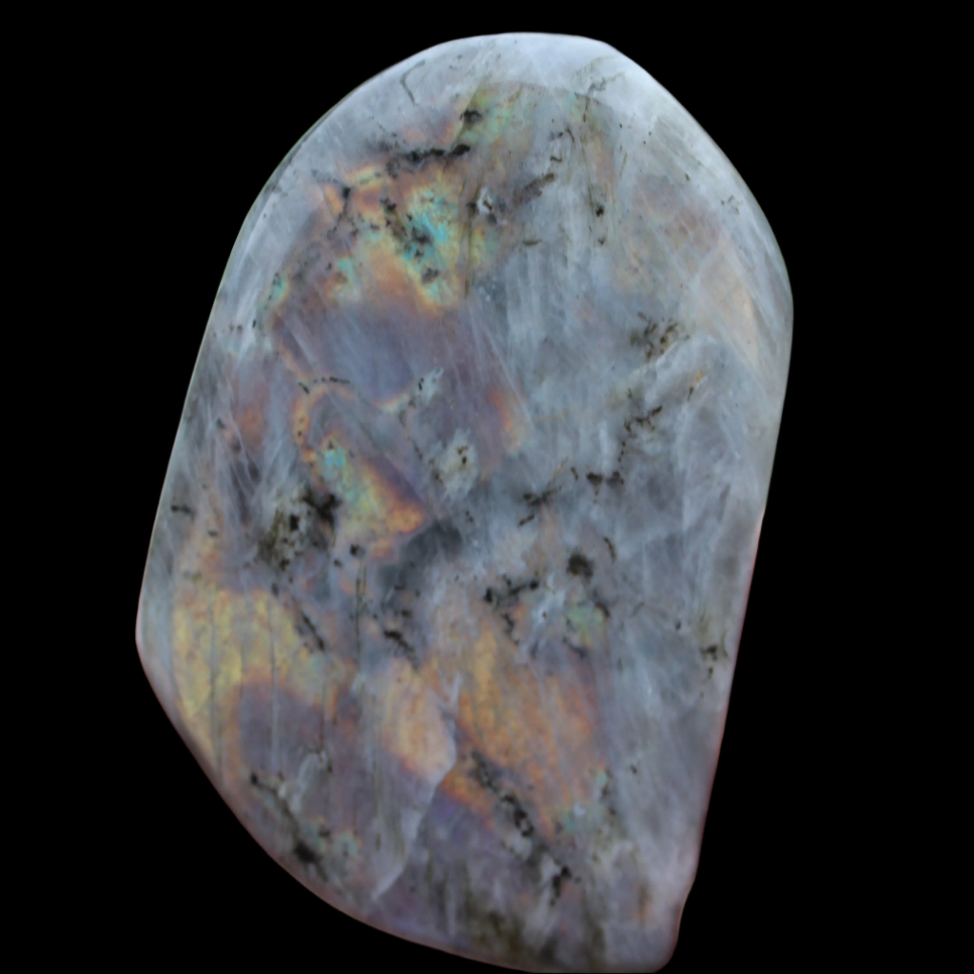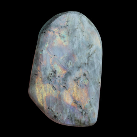 This Labradorite freeform weighs 358g. Labradorite is a crystalline form of Plagioclase Feldspar. It has a lamellar structure with a mixture of Albite and Anorthite in fine alternating layers. It was originally found at Ford Harbour, Paul Island, near Nain, off the east coast of Labrador, Newfoundland.